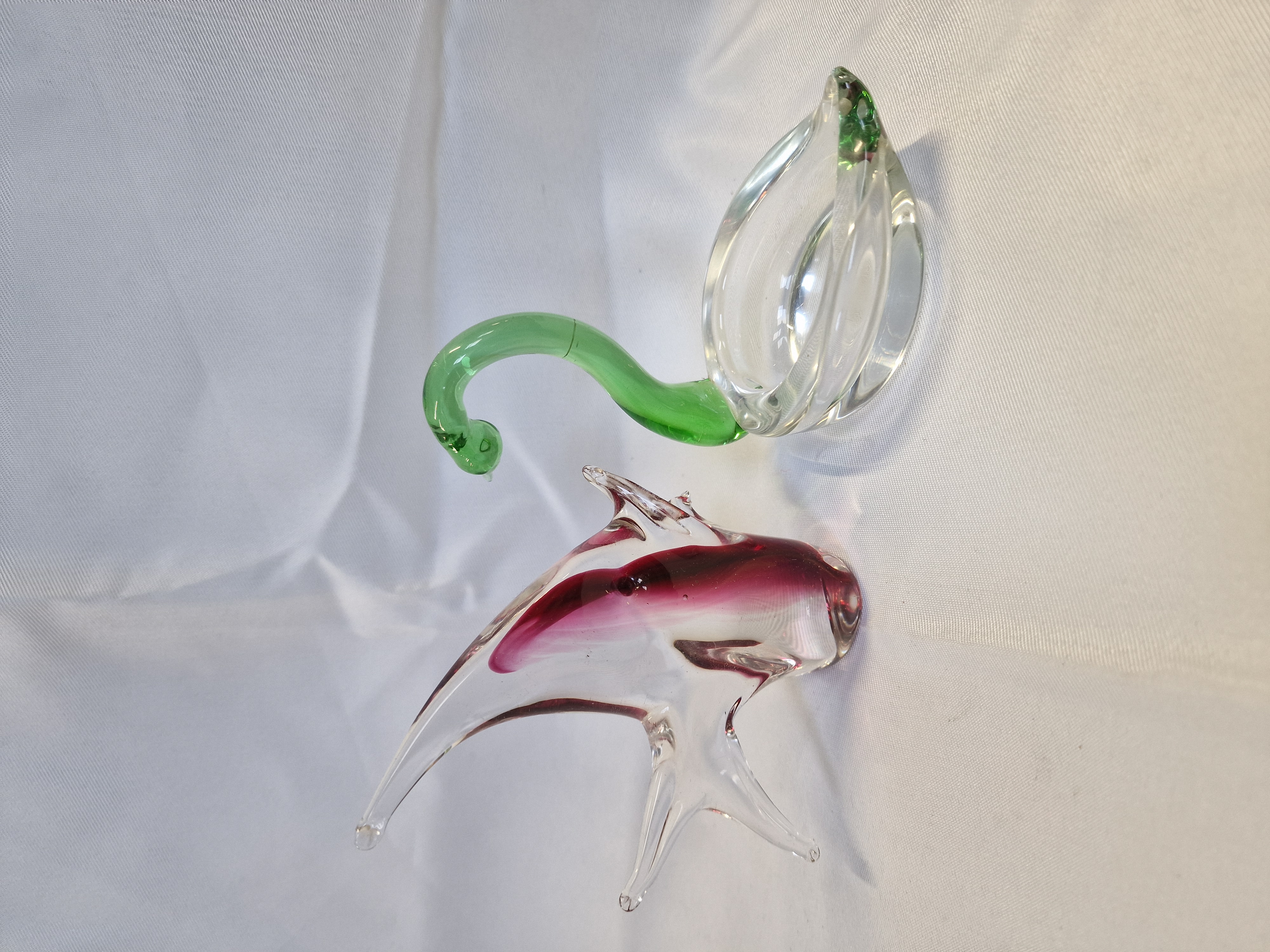 Two hand-blown art glass figurines in the Murano style, mid-20th century. The lot comprises a stylized swan-form dish with a clear glass body and green glass neck, and an aquatic figurine with an internal cranberry-coloured ribbon swirl. Both pieces are executed using free-blown and pulled glass techniques with applied details. No maker’s marks or factory labels are visible.