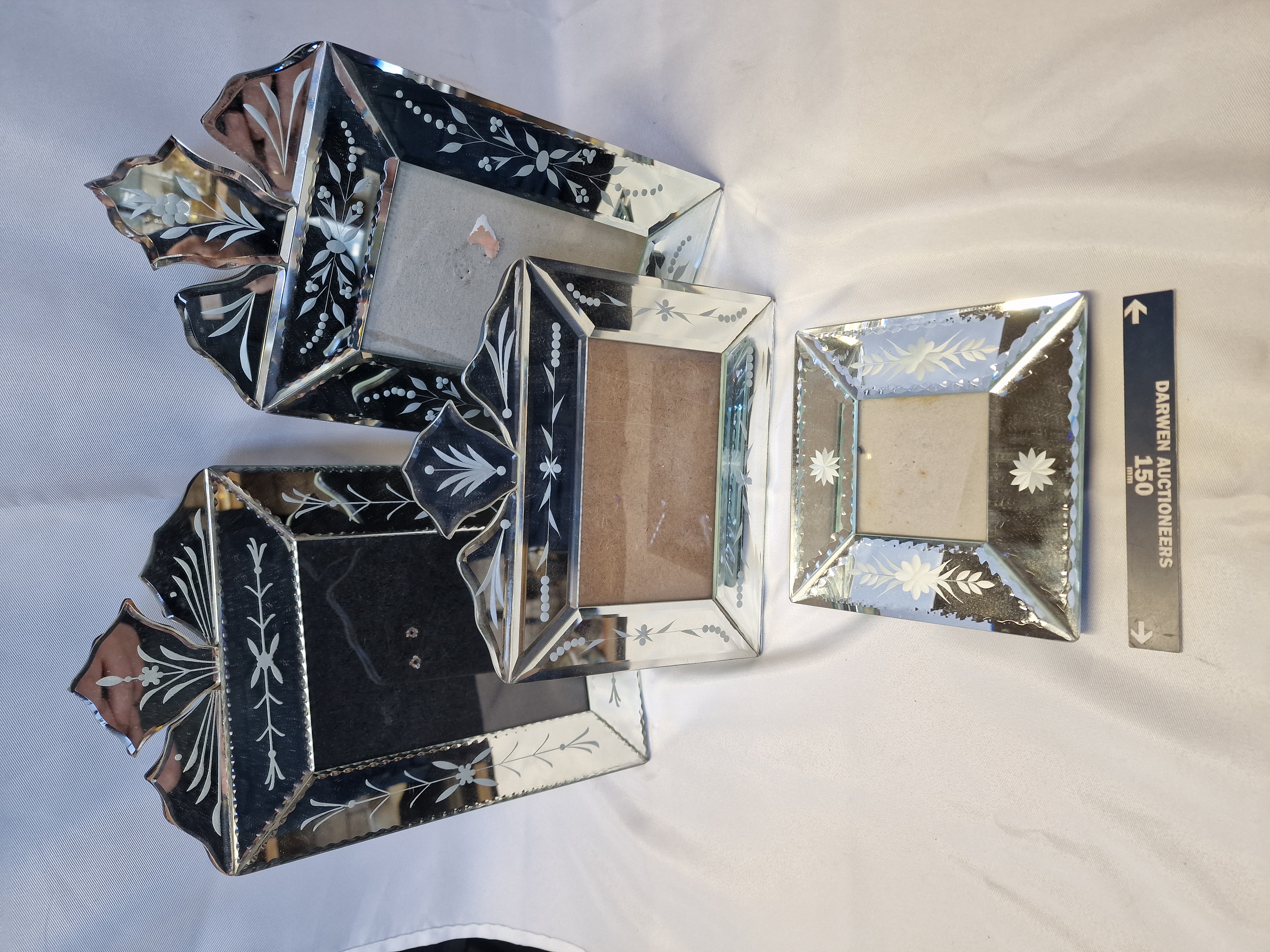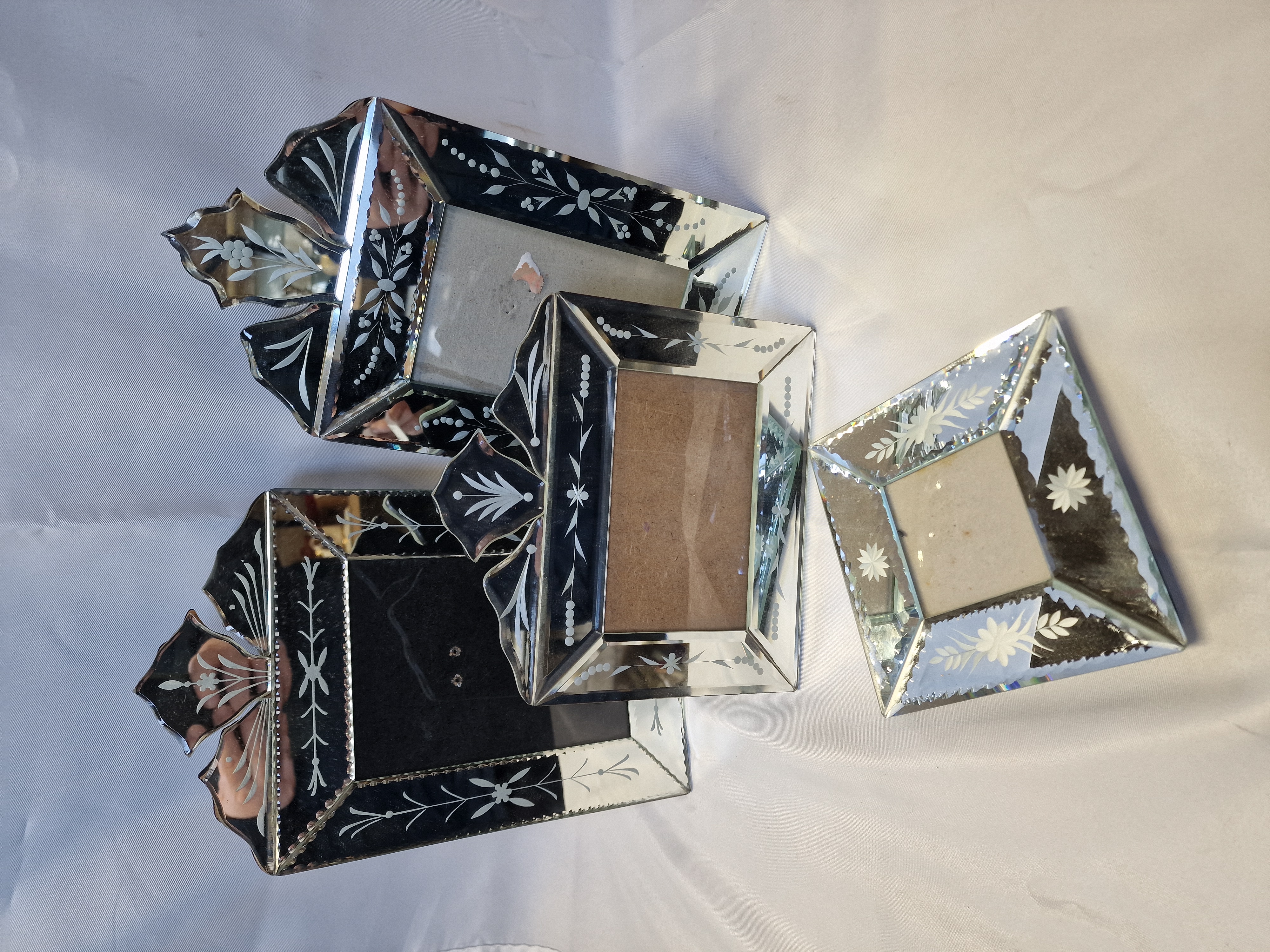 A group of mirrored glass photo frames in the Venetian style, mid-20th century. The collection comprises three rectangular frames with decorative arched crests and one square frame, all featuring bevelled glass panels. Each piece is decorated with etched floral and foliate motifs and dotted border accents.