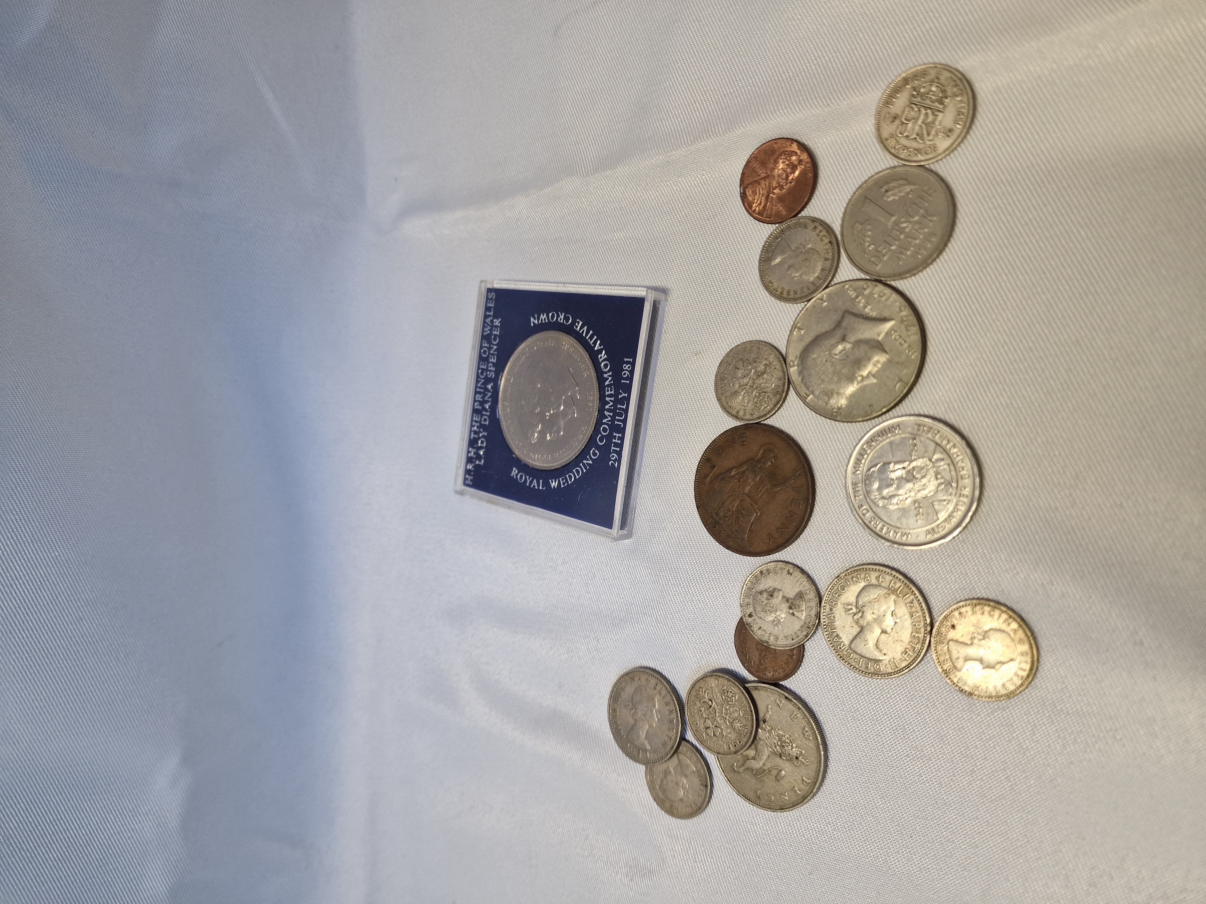 A Collection of UK, US, and DE Coins including 1981 Royal Wedding Crown