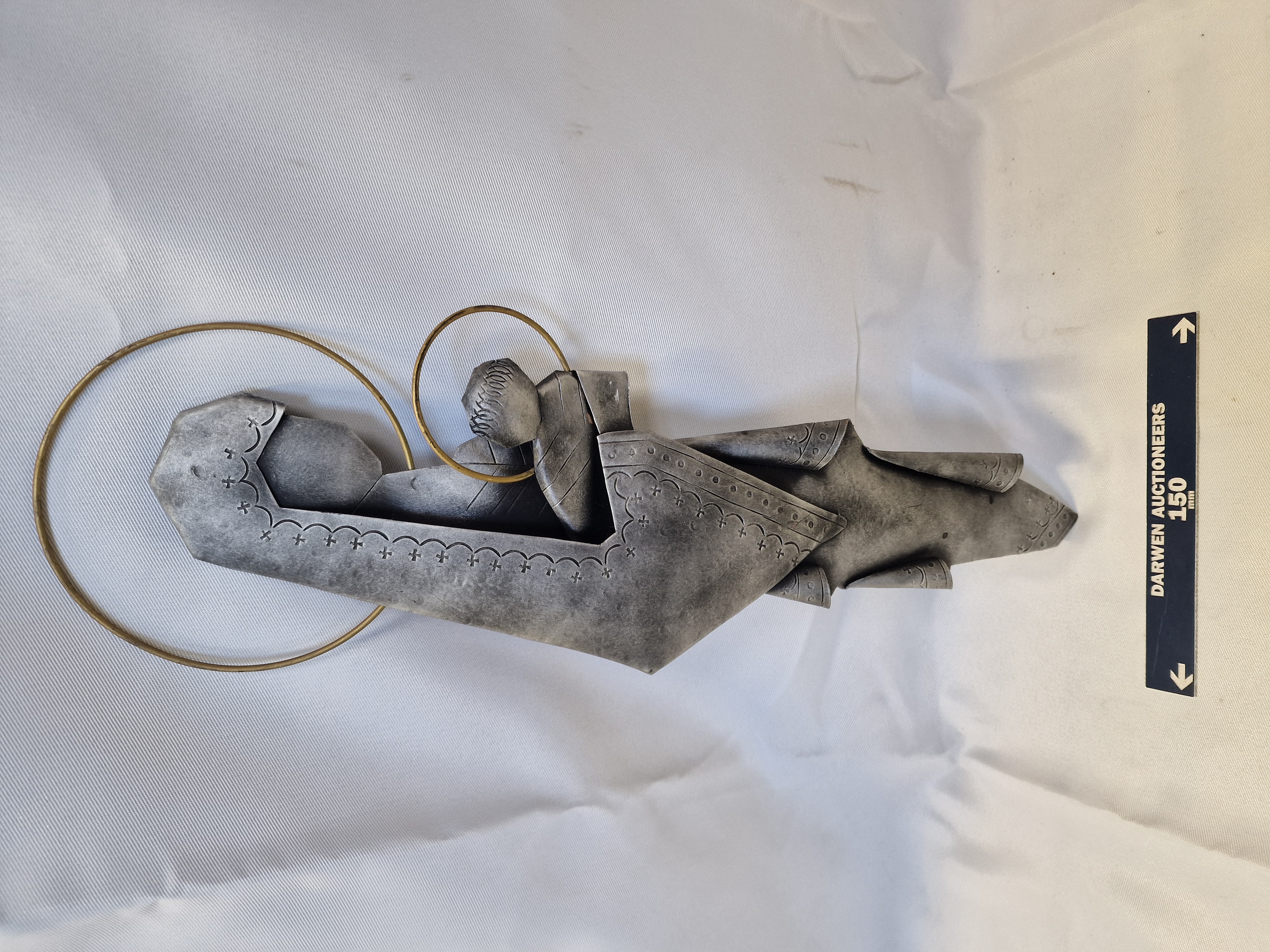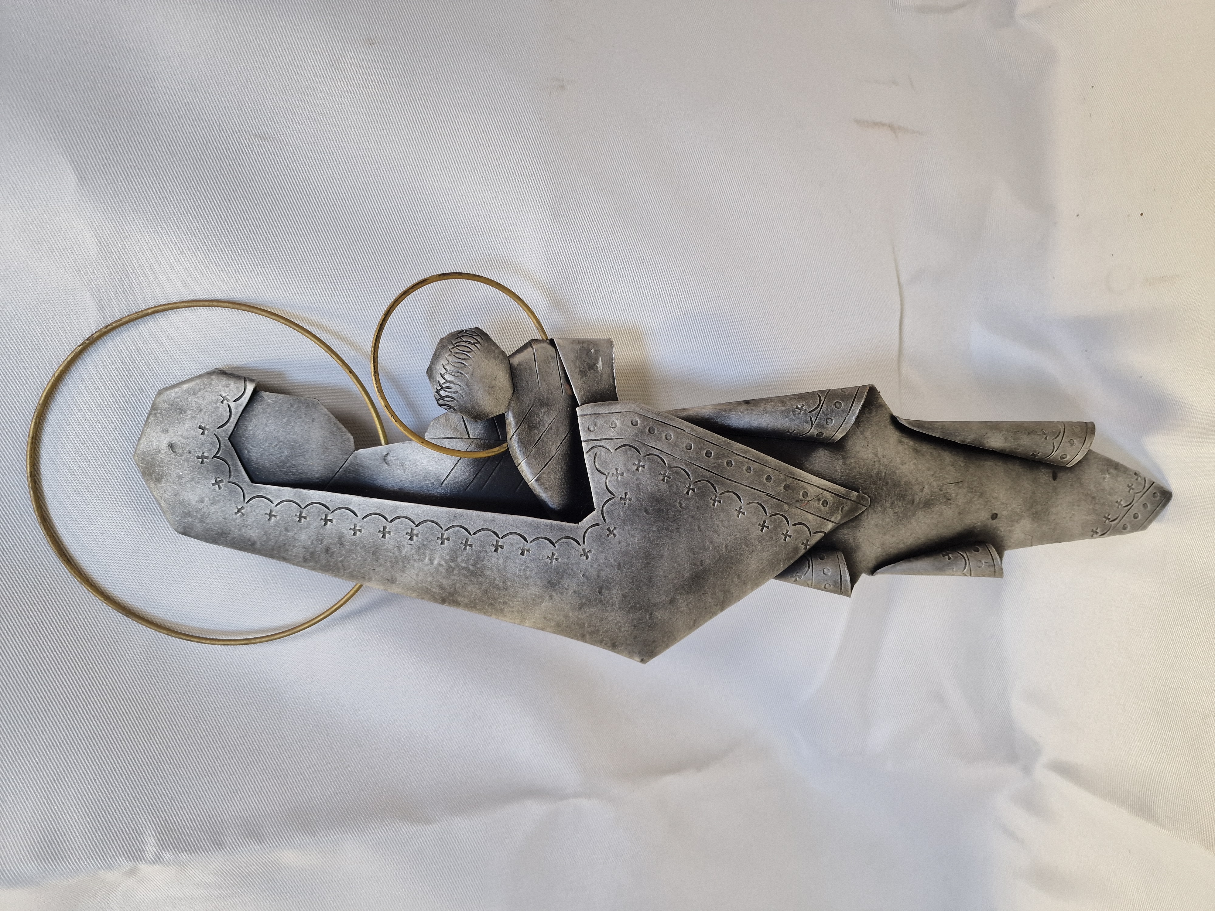 Mid-century modern style metal relief sculpture depicting the Nativity, late 20th century. The work is composed of stylised, angular folded forms in a cast grey metal alloy, possibly pewter, representing the Virgin Mary and the Christ child. It features a matte patina with darker shading in recessed areas, incised scalloped borders, and two brass-toned wire halos.