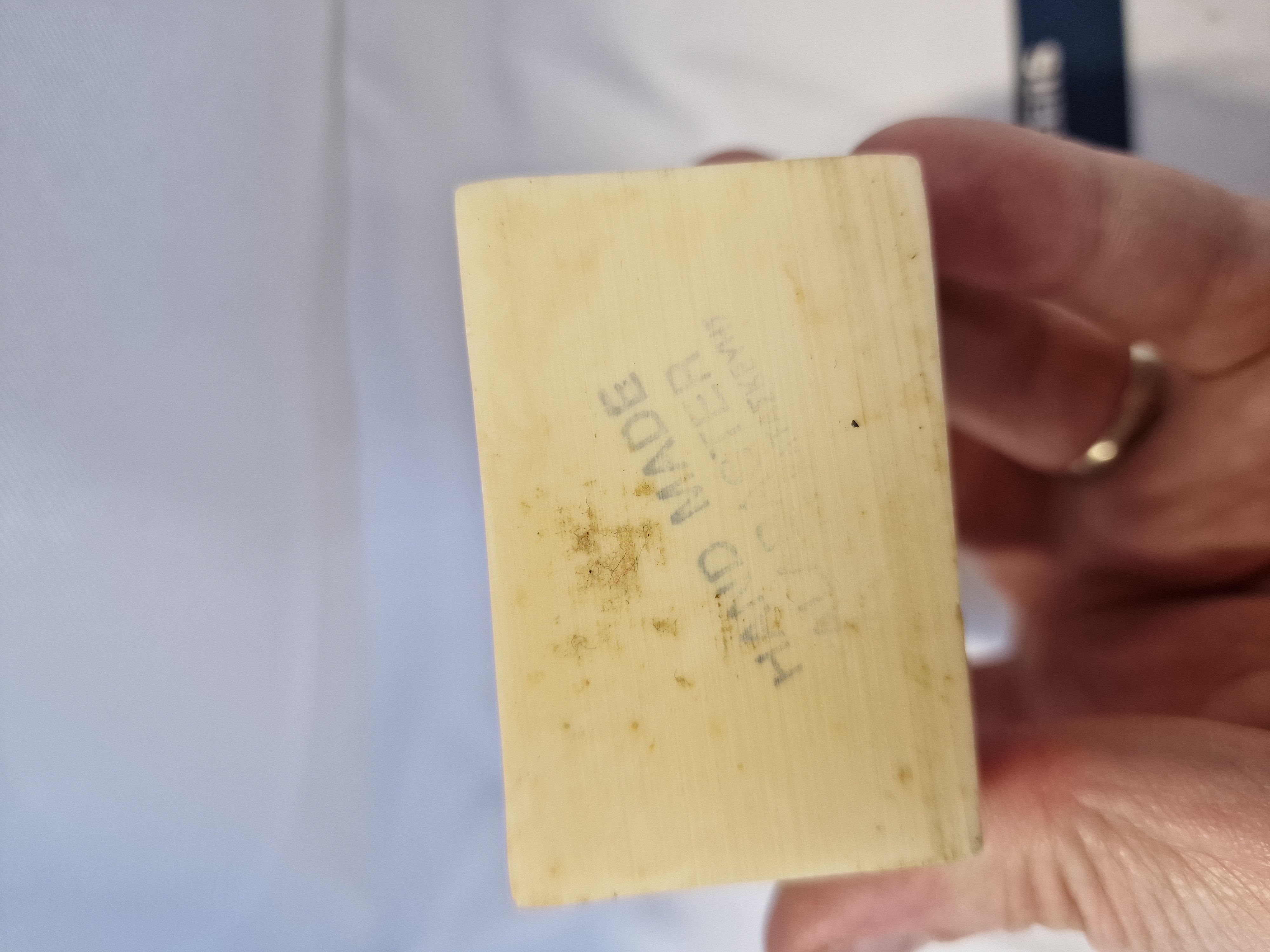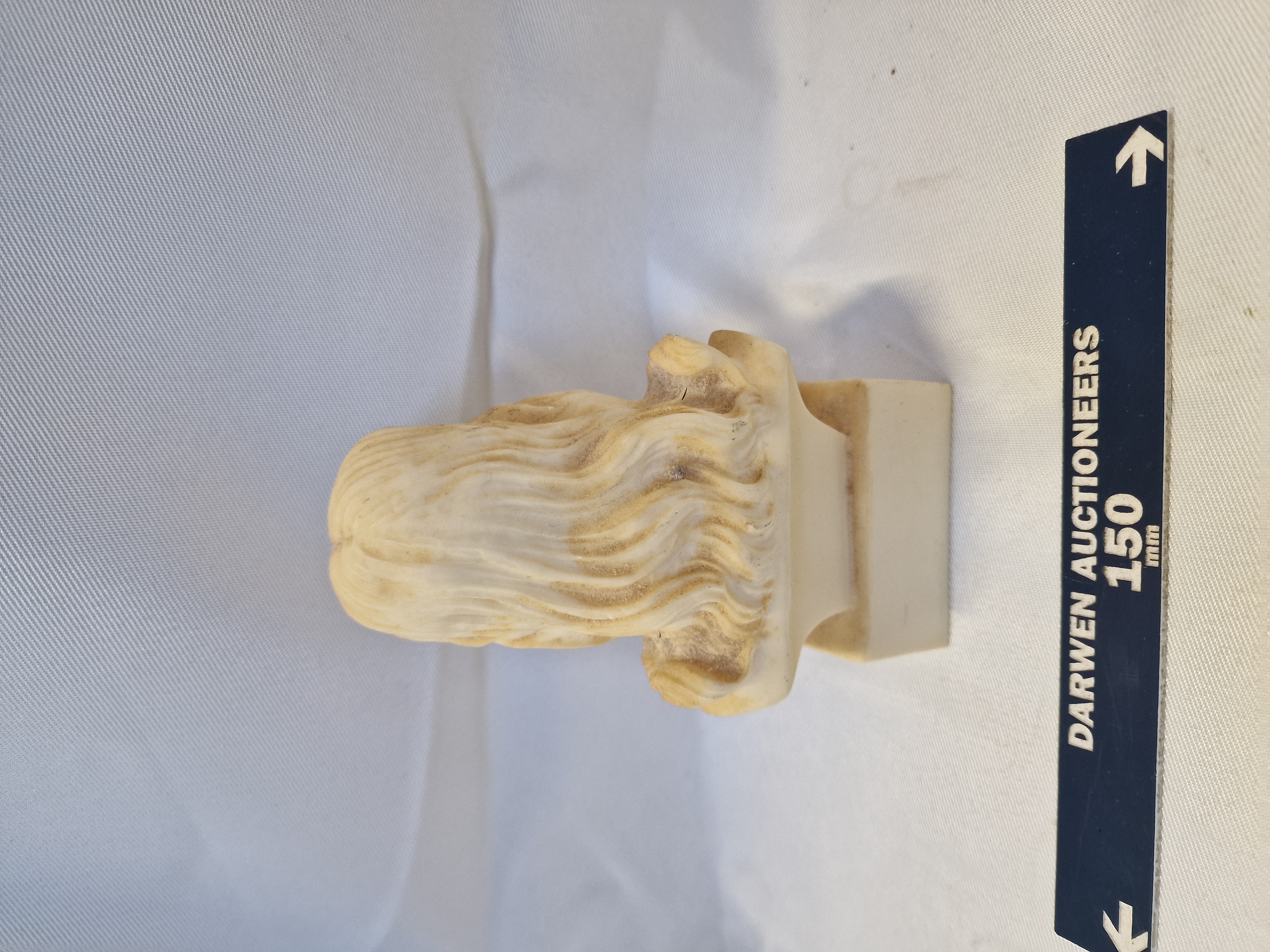 A Greek hand-carved alabaster bust of Christ, late 20th century. The figure is depicted with a serene expression, downcast eyes, and long wavy hair, mounted upon an integral rectangular plinth. The underside of the base features a blue printed stamp reading HAND MADE ALABASTER GREECE.