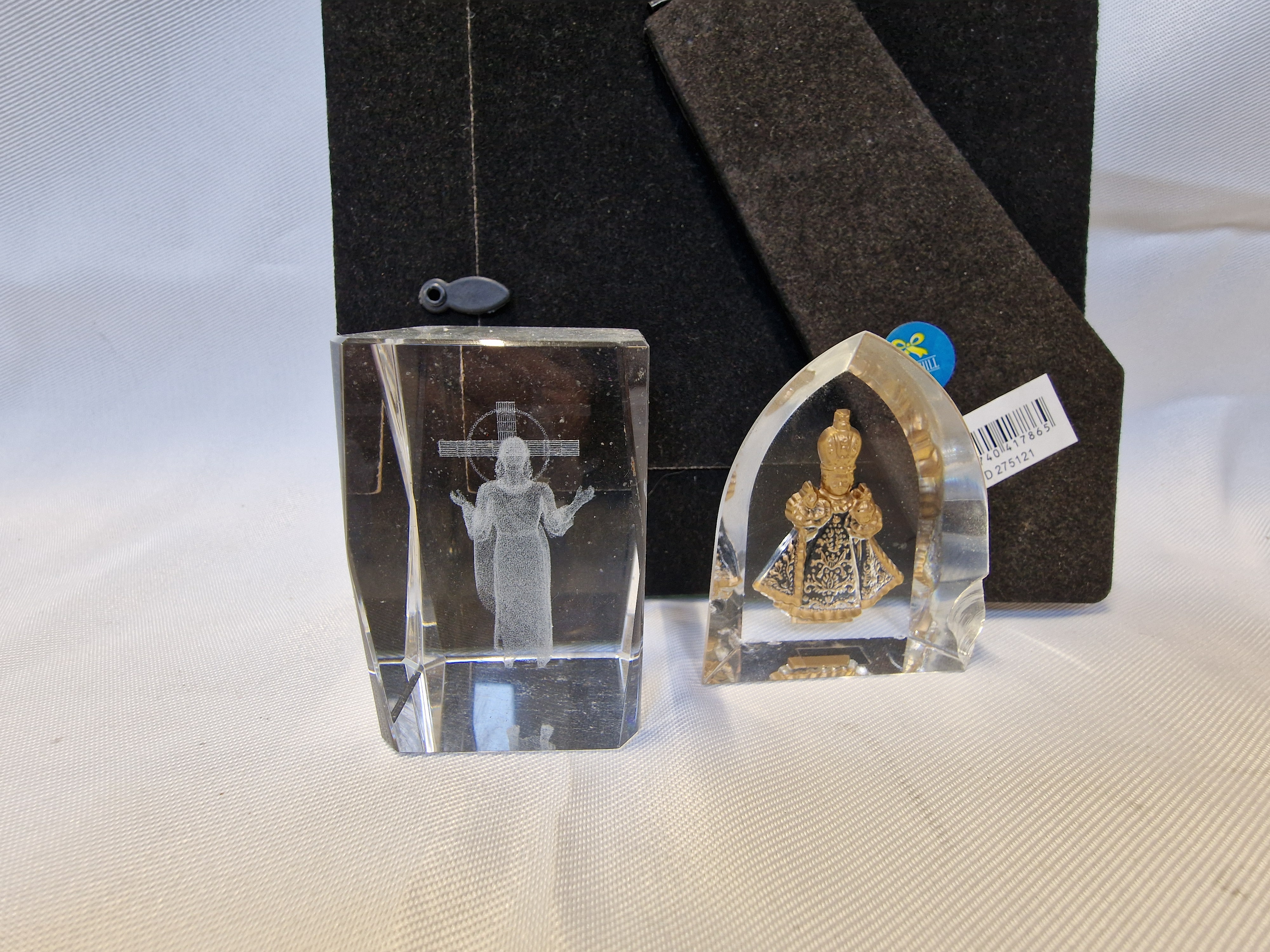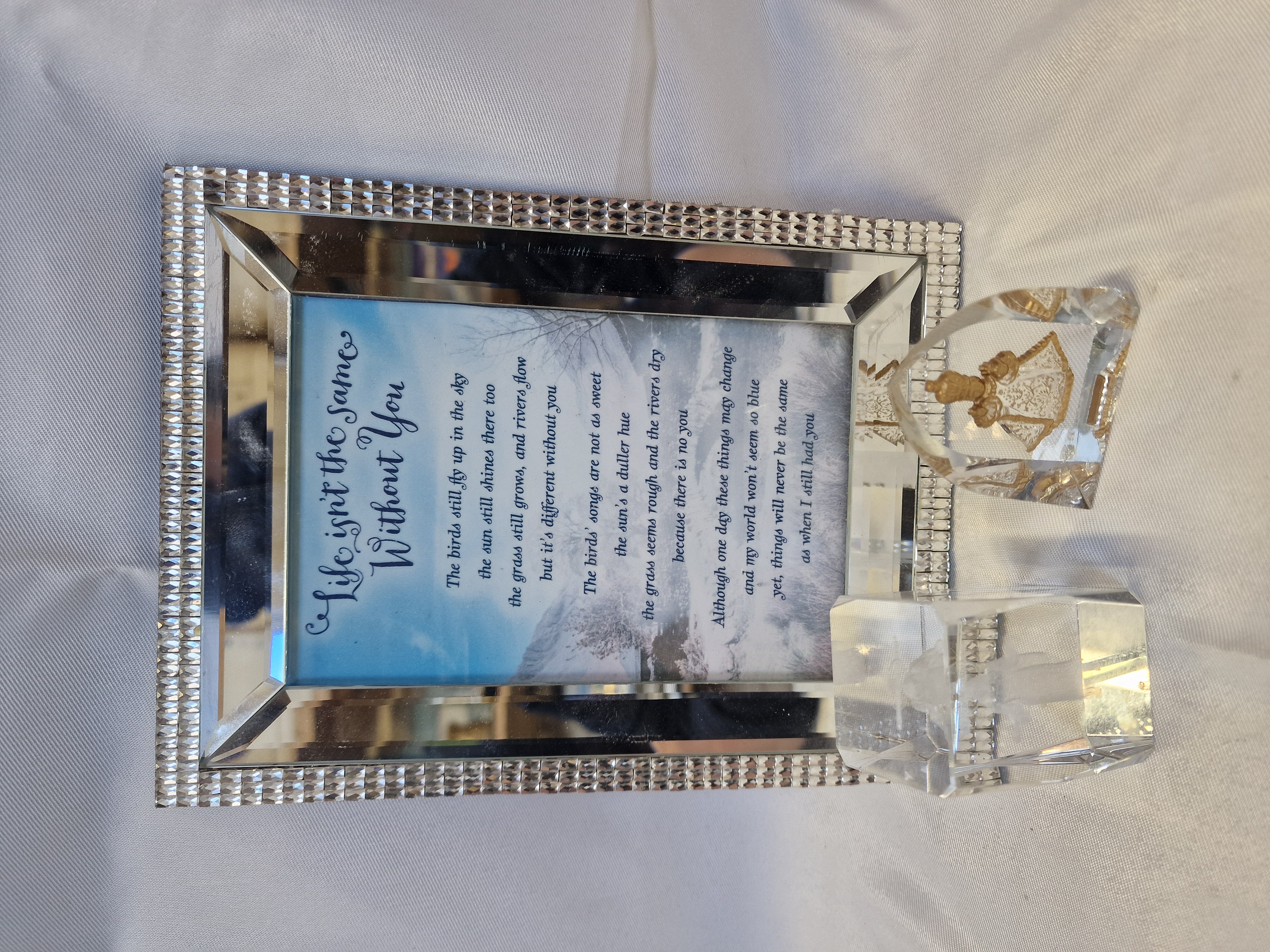 A trio of contemporary decorative items comprising a mirrored picture frame and two religious keepsakes. The rectangular frame features a bevelled mirror border with diamante-style synthetic stone embellishments and contains a printed memorial poem. Accompanying items include a laser-etched glass block depicting Jesus Christ and an arch-topped crystal plaque containing a gold-tone figure of the Infant Jesus of Prague. The reverse of the plaque bears a retail barcode sticker and a small circular blue label.