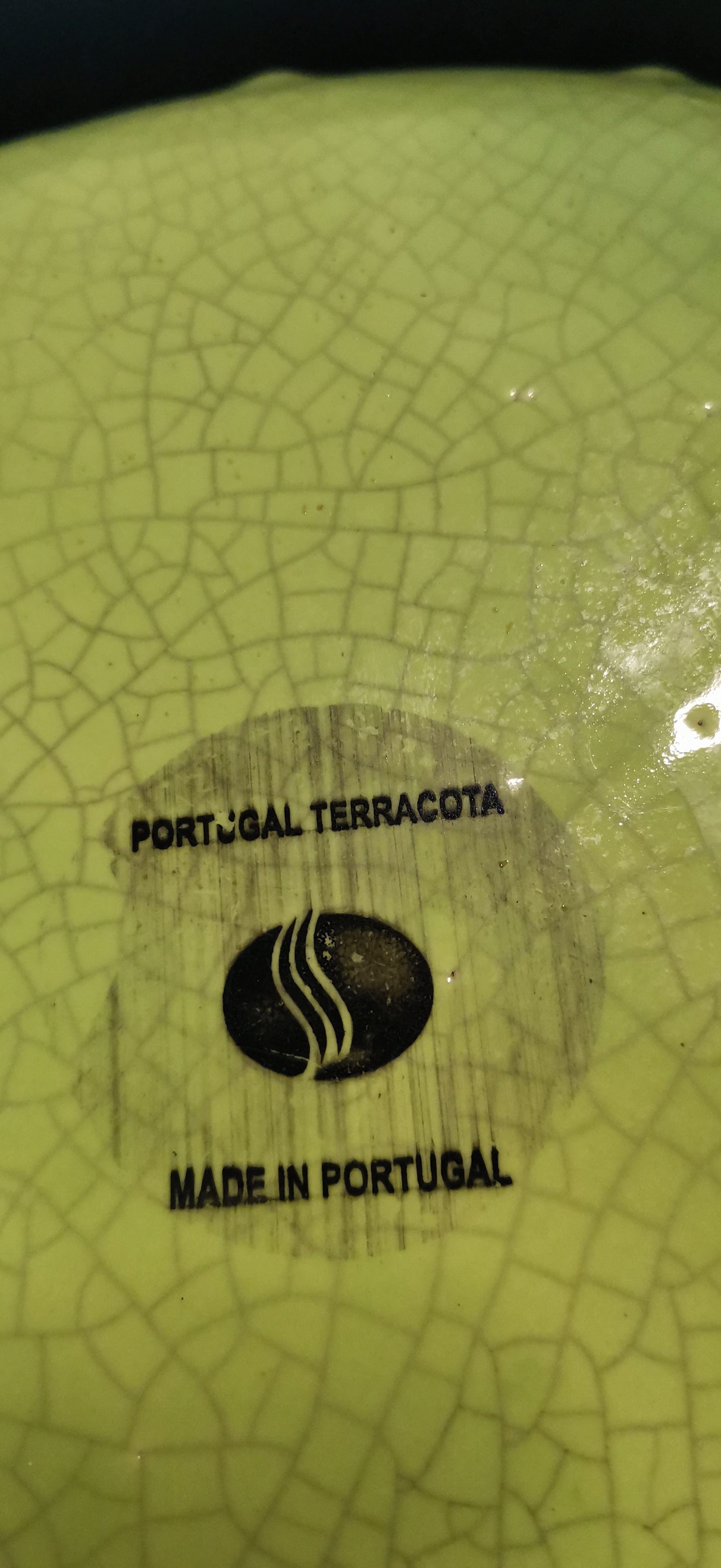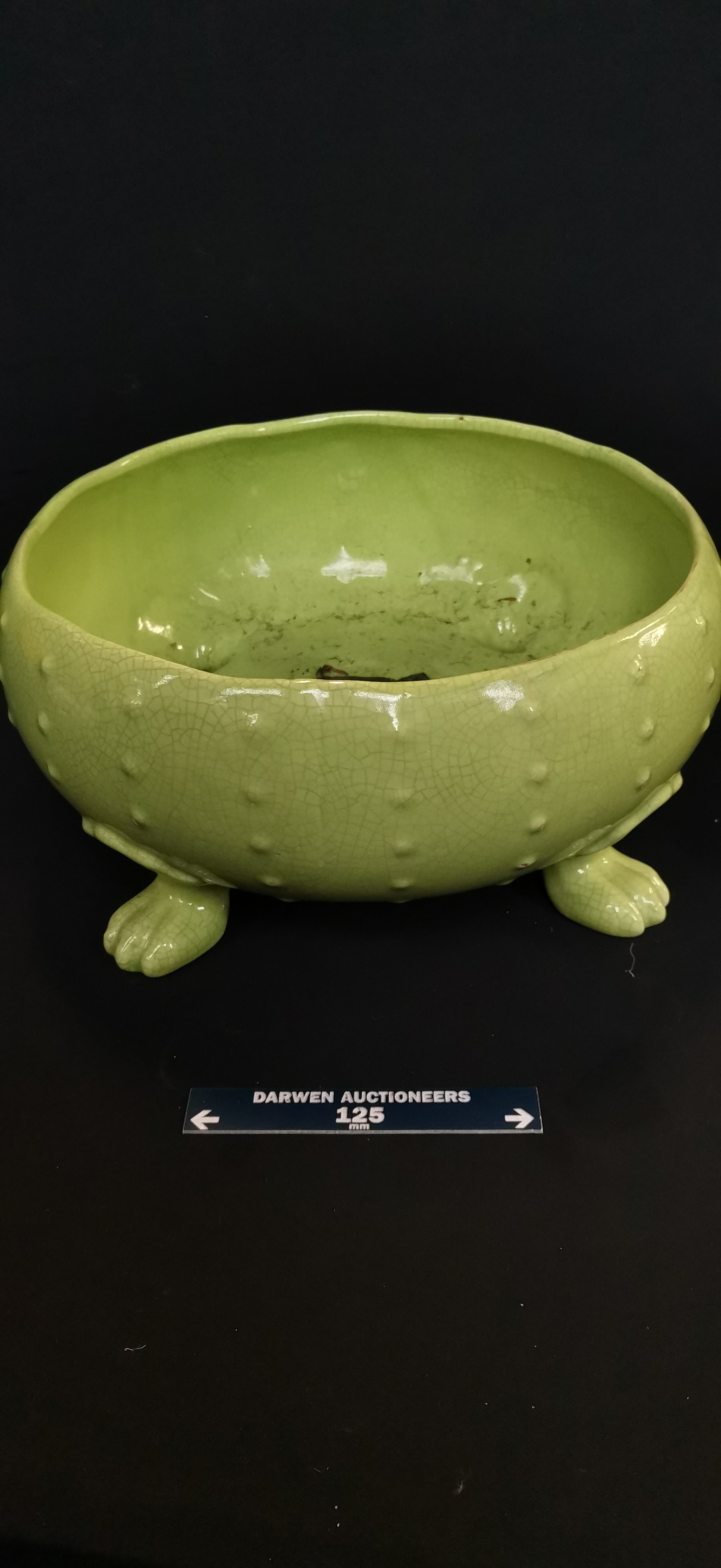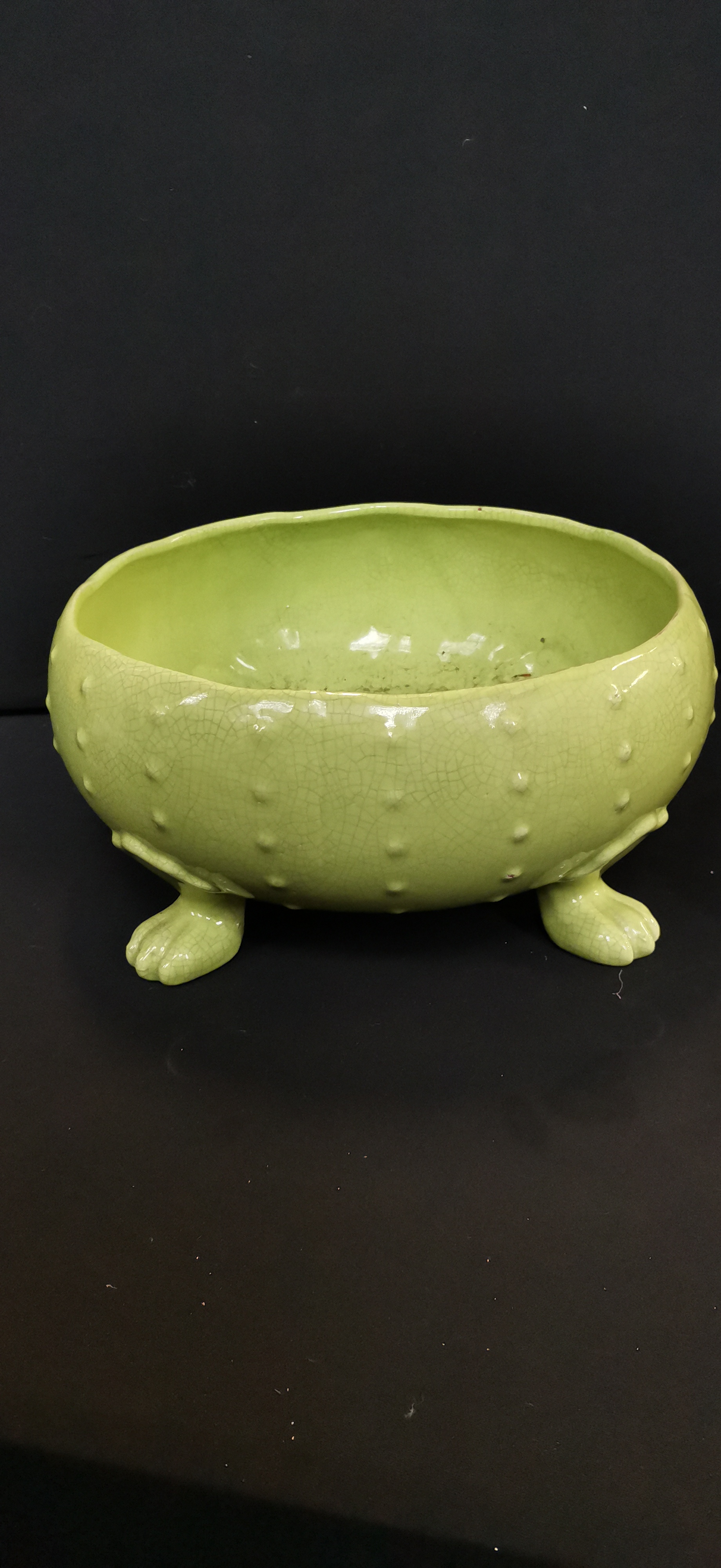 A light green ceramic bowl featuring a crackle glaze, studded exterior, and tripod feet, measuring approximately 250mm in diameter and marked Portugal Terracota.