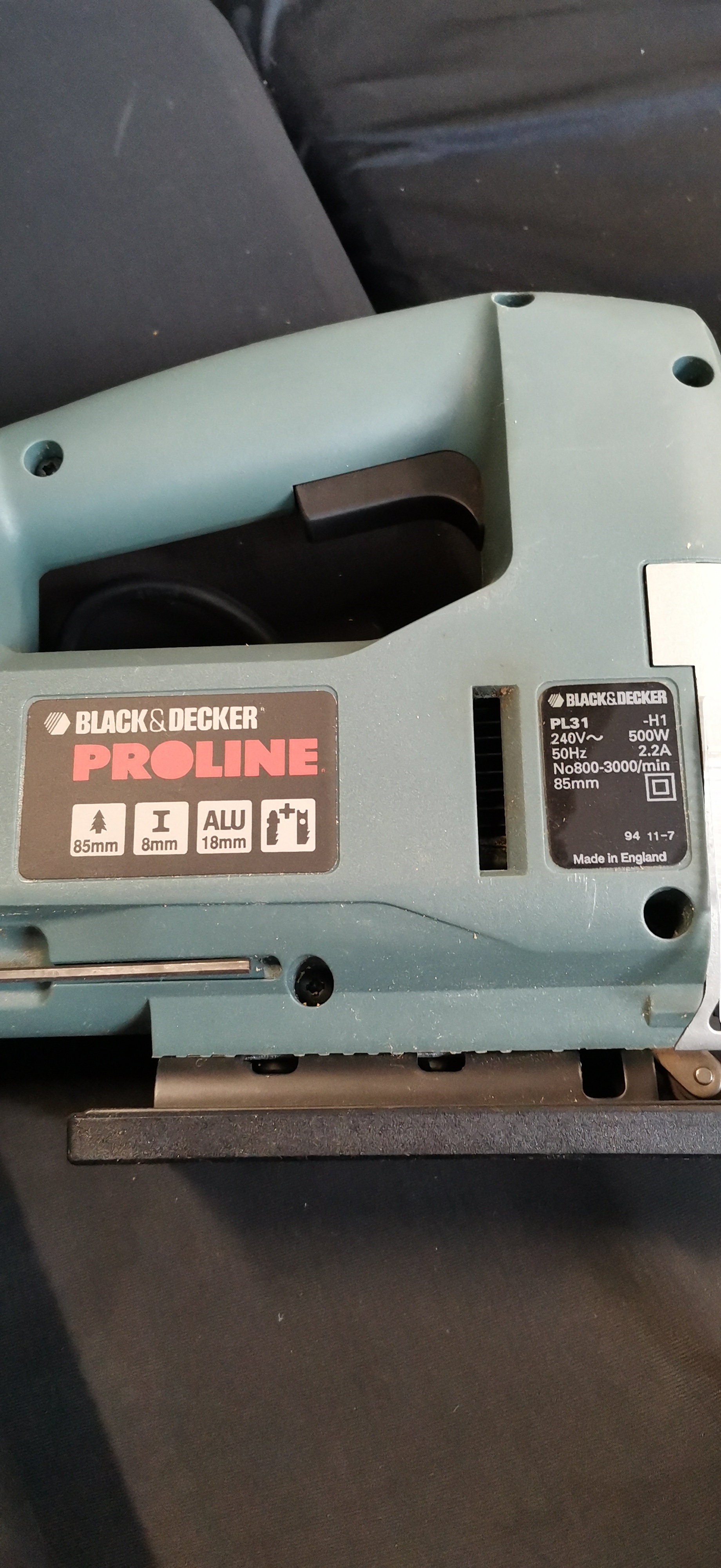 A teal Black and Decker Proline PL31 500W 85mm jigsaw made in England, housed in a black plastic case with its original instruction manual.