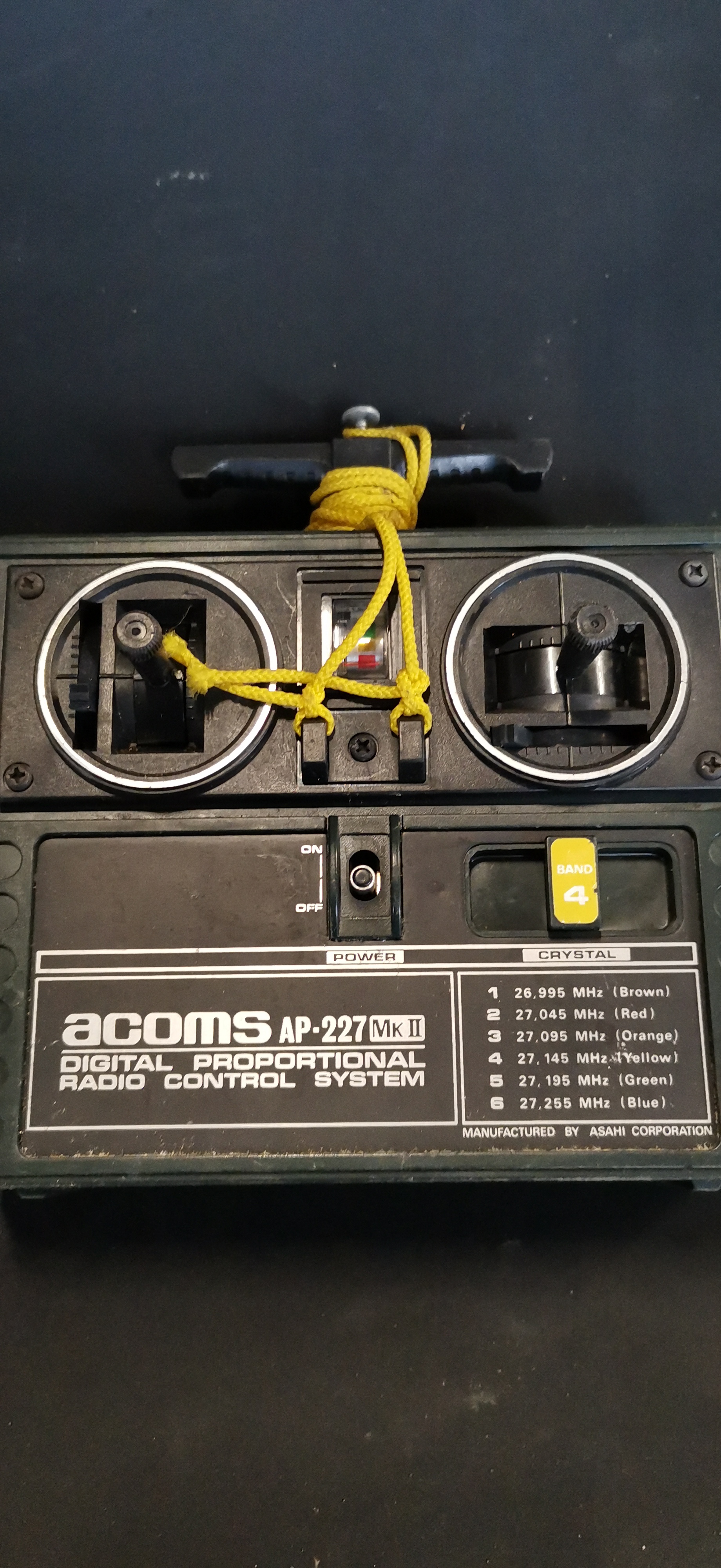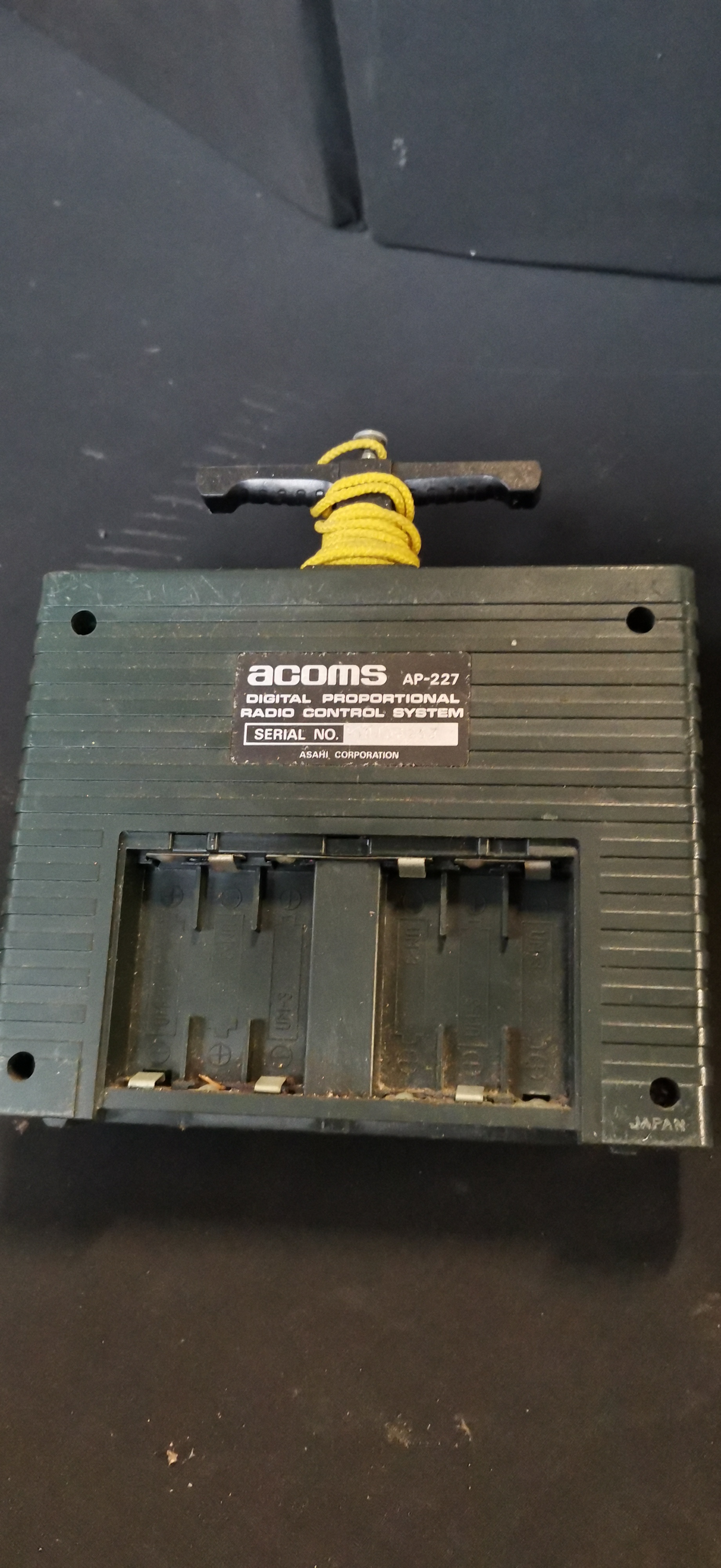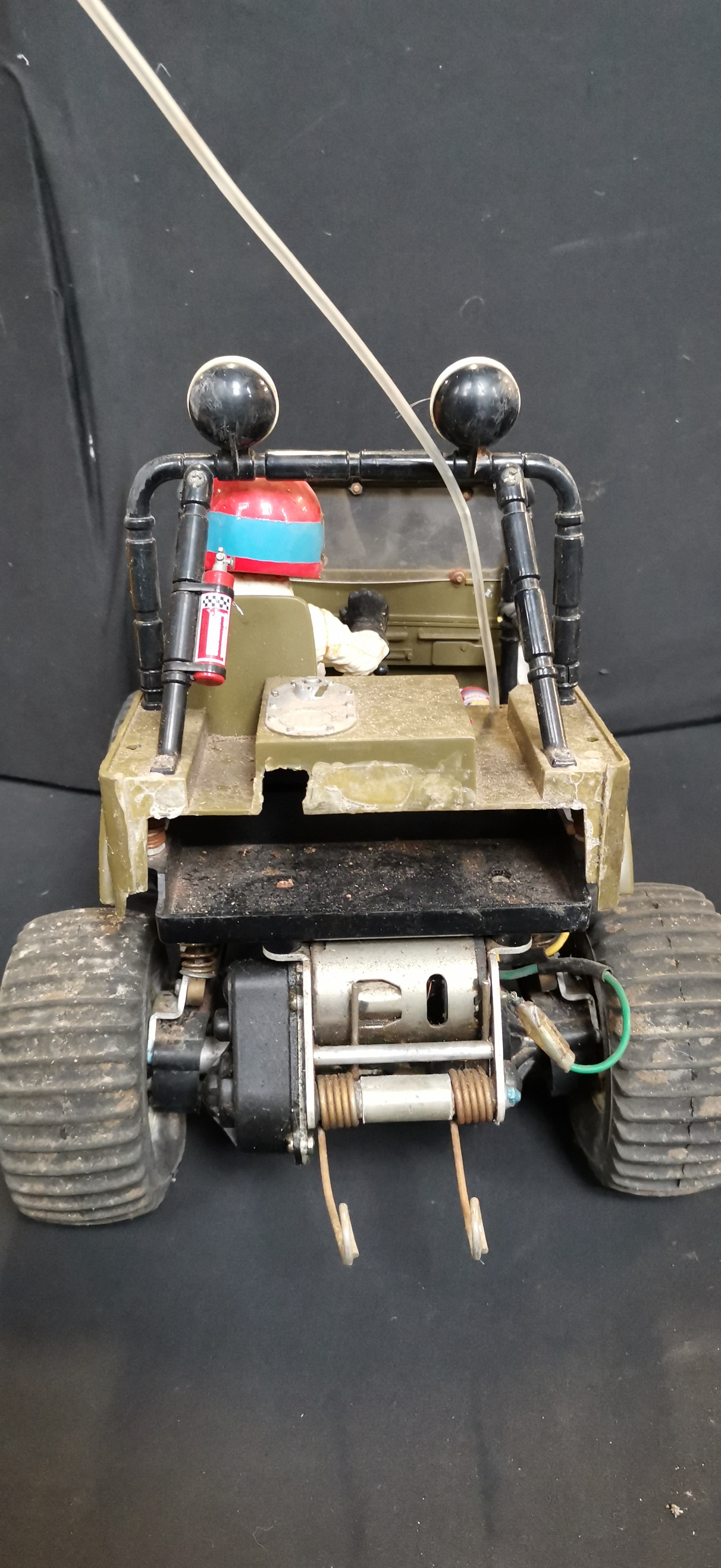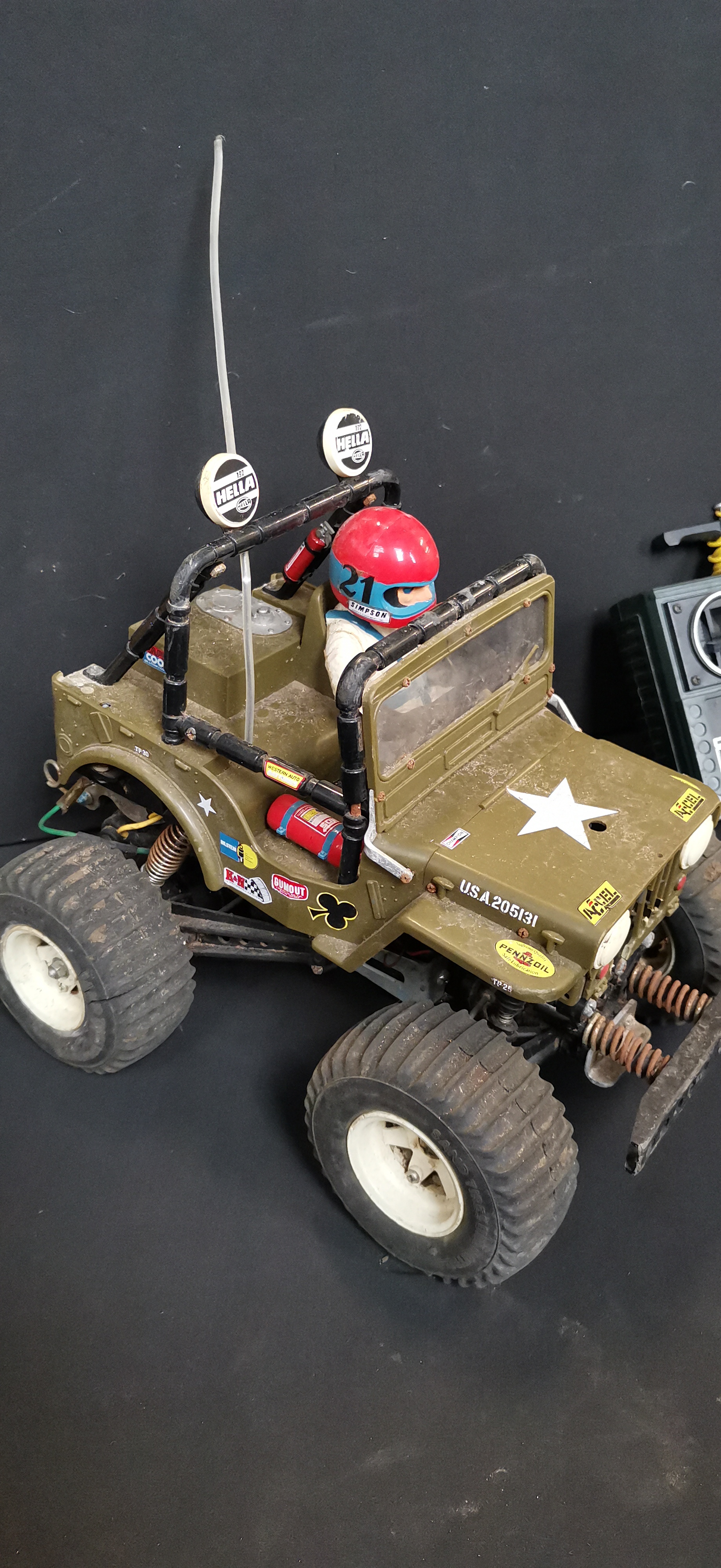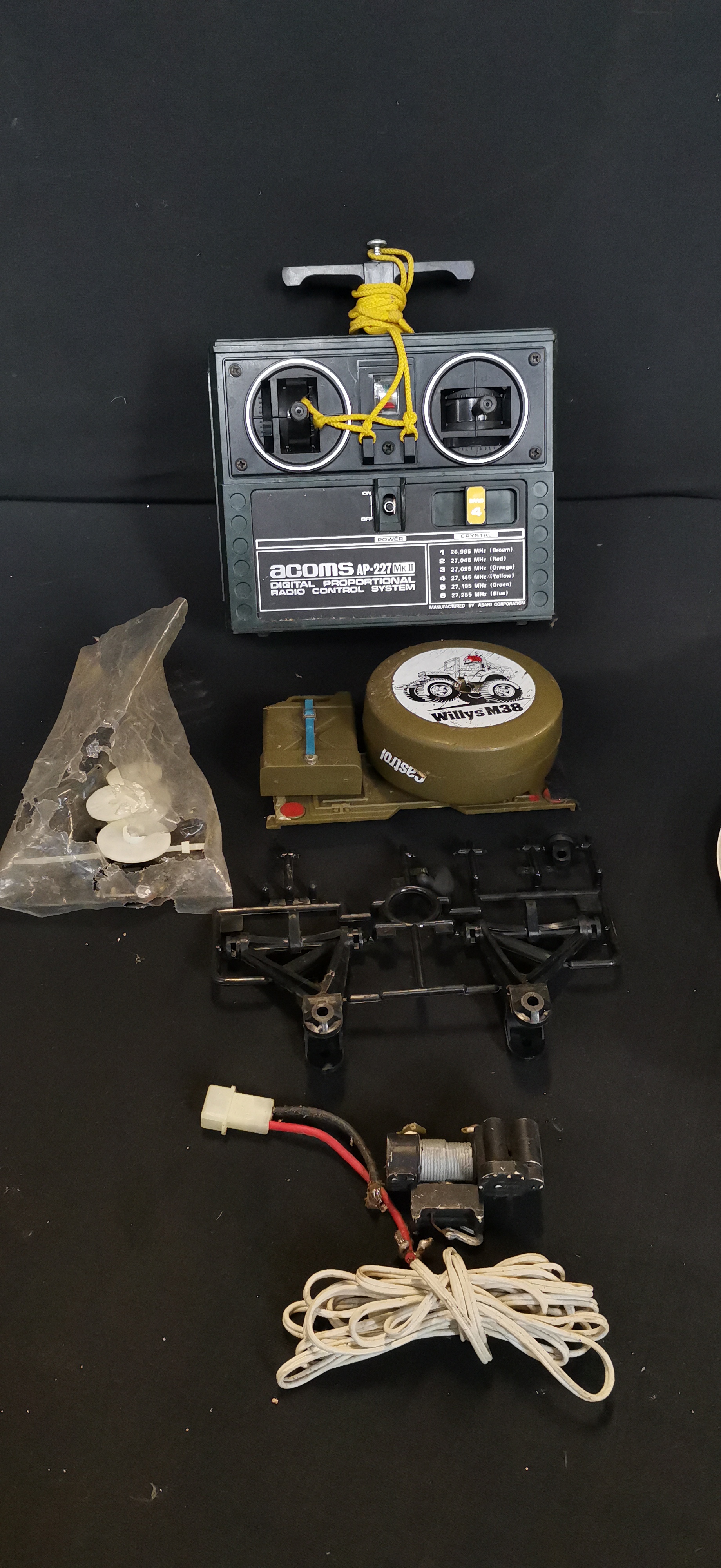 An olive drab green Willys M38 radio-controlled jeep with driver figure, accompanied by an Acoms AP-227 MK II transmitter, a Beatties carry bag, and various spare parts.