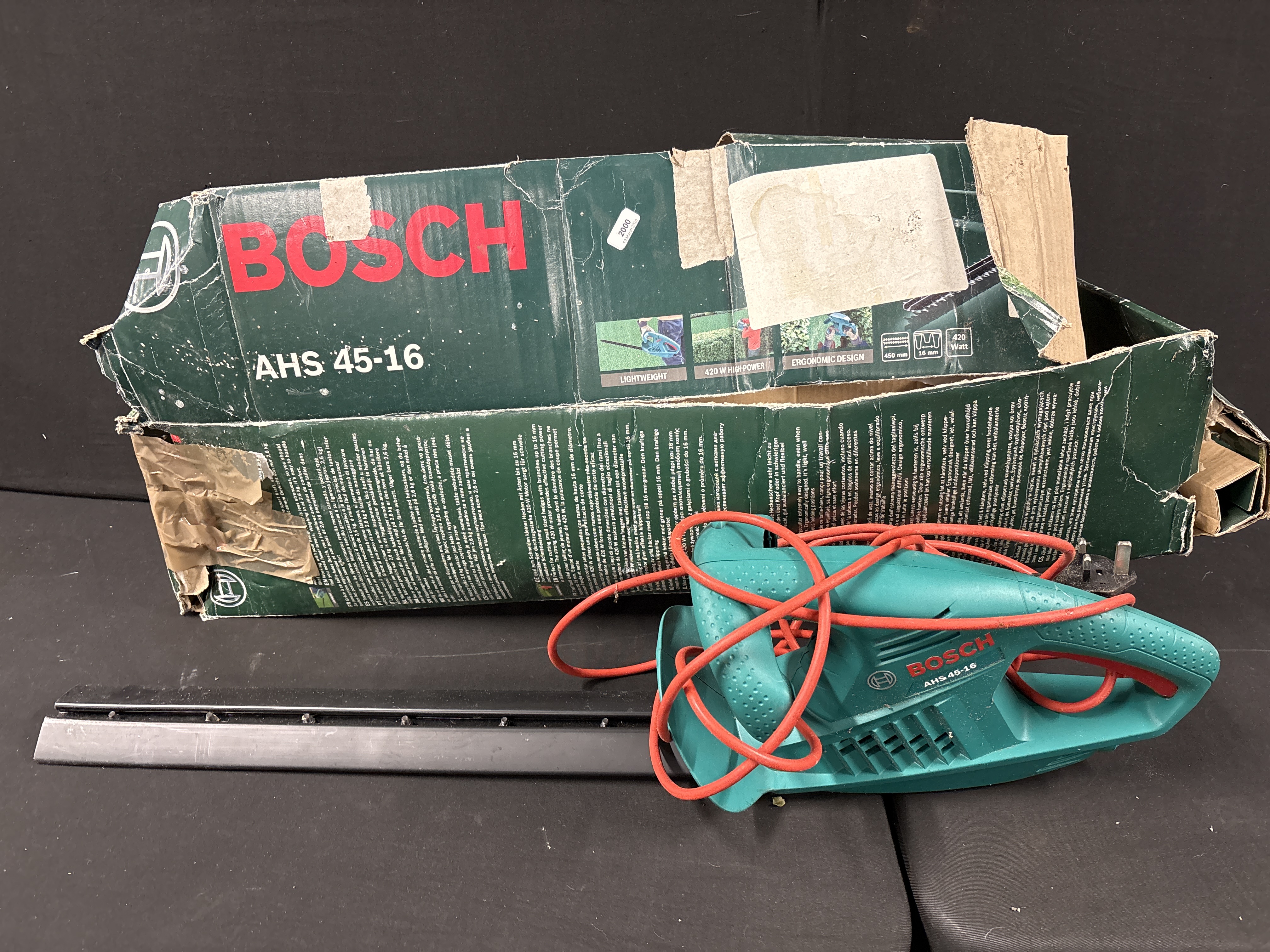 A Bosch AHS 45-16 corded electric hedge trimmer featuring a green plastic housing and metal blades. The unit is equipped with an integrated red power cable terminating in a standard United Kingdom 3-pin plug. The tool body is marked with the Bosch brand name in red and the model number AHS 45-16 in white, alongside a circular logo. The item includes a black plastic blade guard and is presented with its original cardboard retail packaging which displays matching model information and technical specifications.