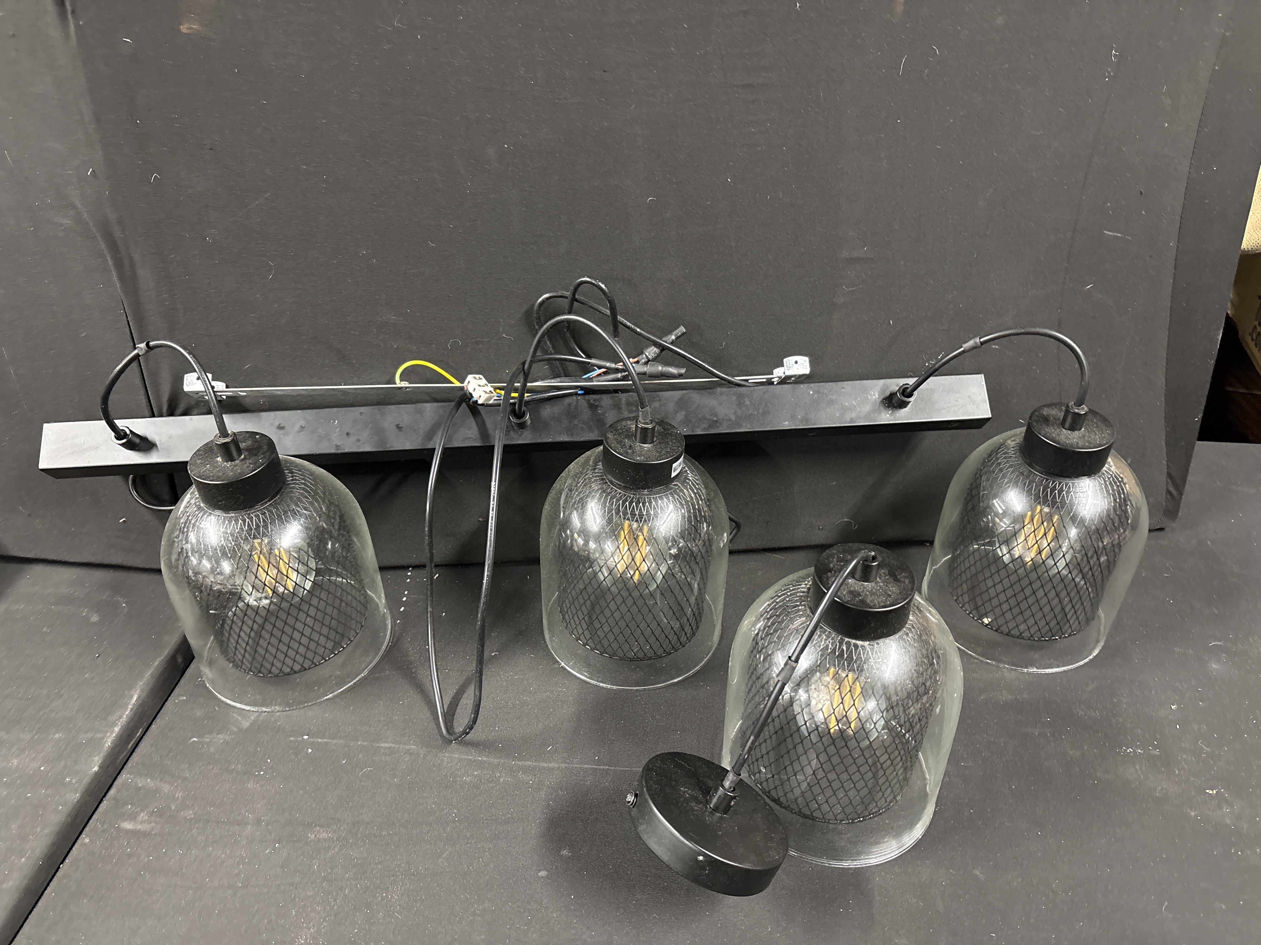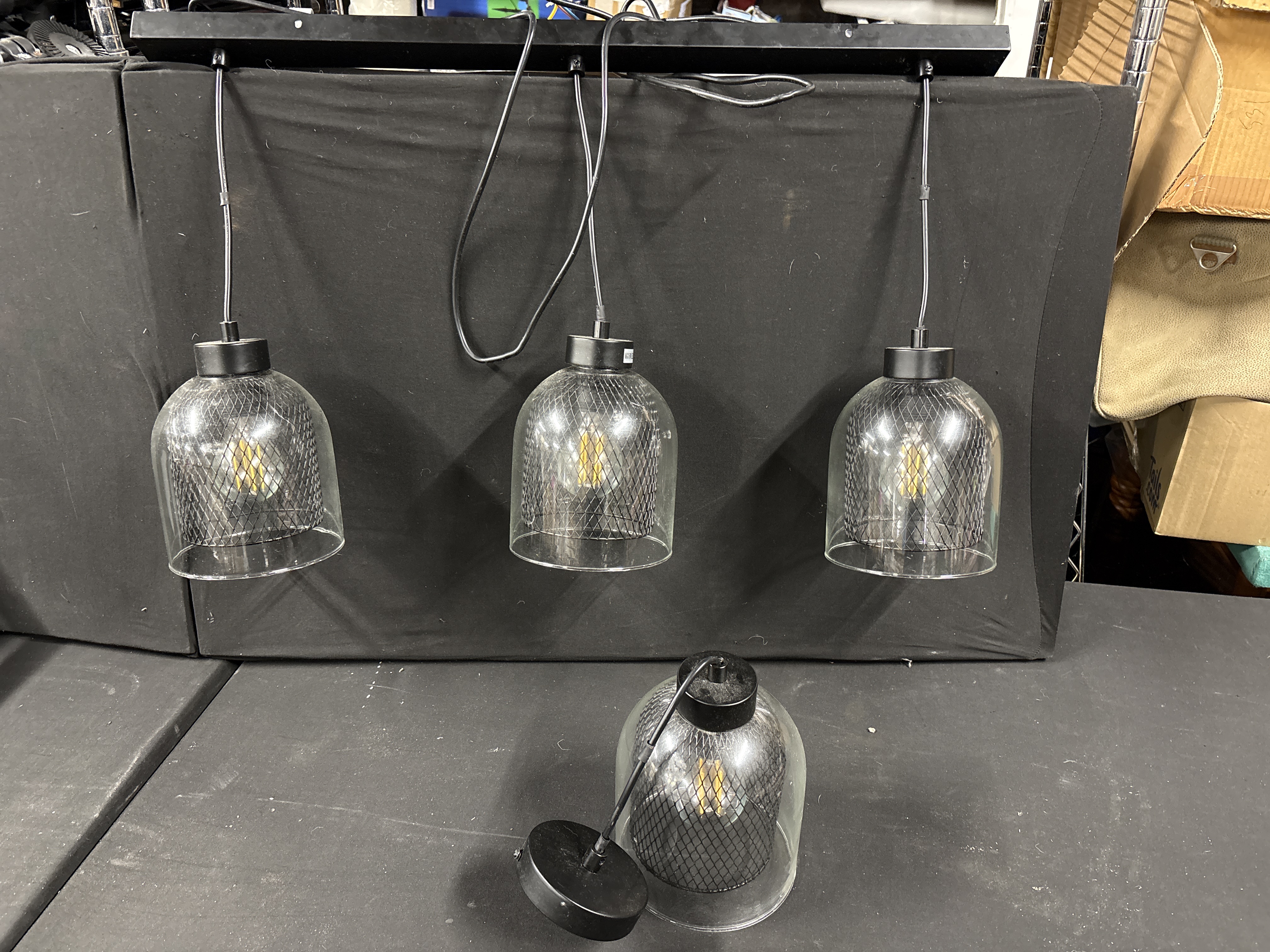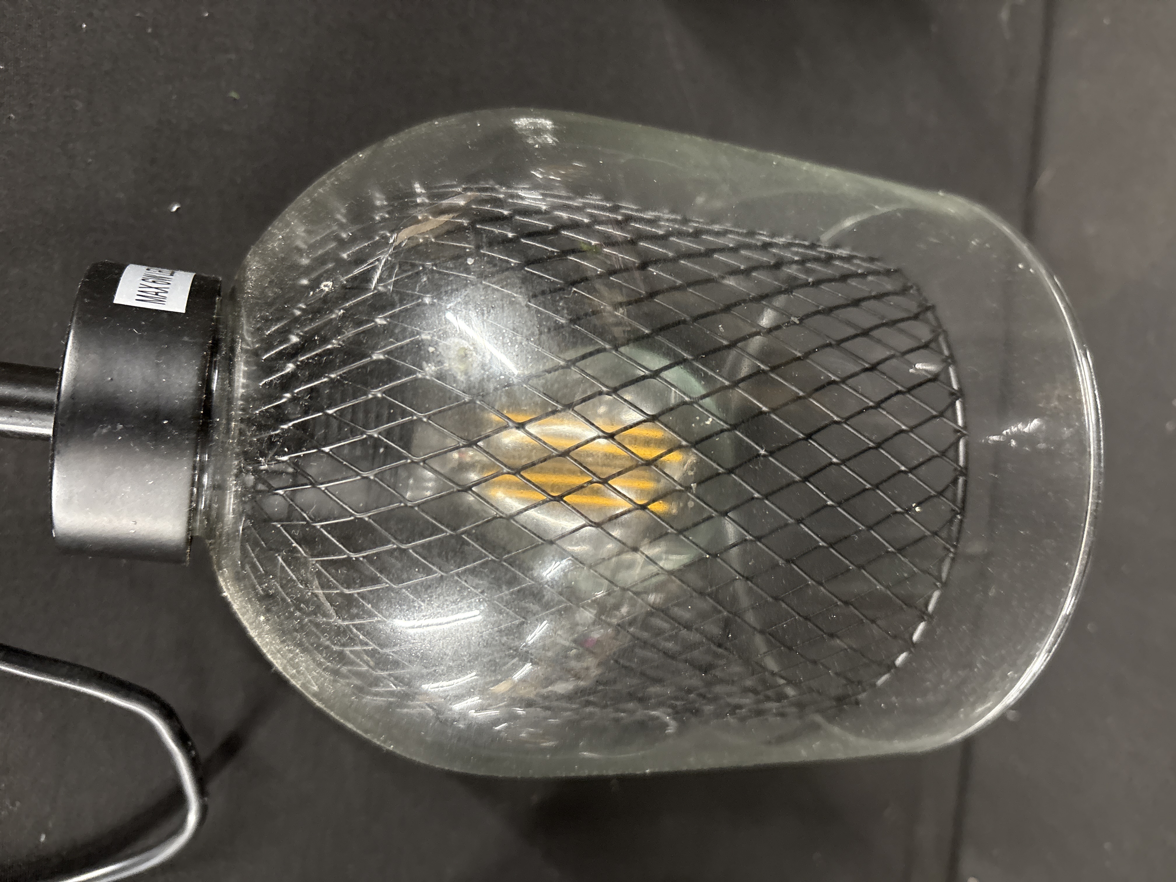 A collection of three industrial-style pendant lighting fixtures. Each fixture is designed with a clear bell-shaped glass outer shade and an internal cylindrical black wire mesh cage. The hardware is constructed from metal with a matte black finish. The collection includes a linear pendant arrangement and single pendant units with matching circular ceiling roses. These fixtures are compatible with halogen lighting and LED filament-style bulbs, with a collar label indicating a maximum wattage of 6W. The units are suspended by flexible black cords.