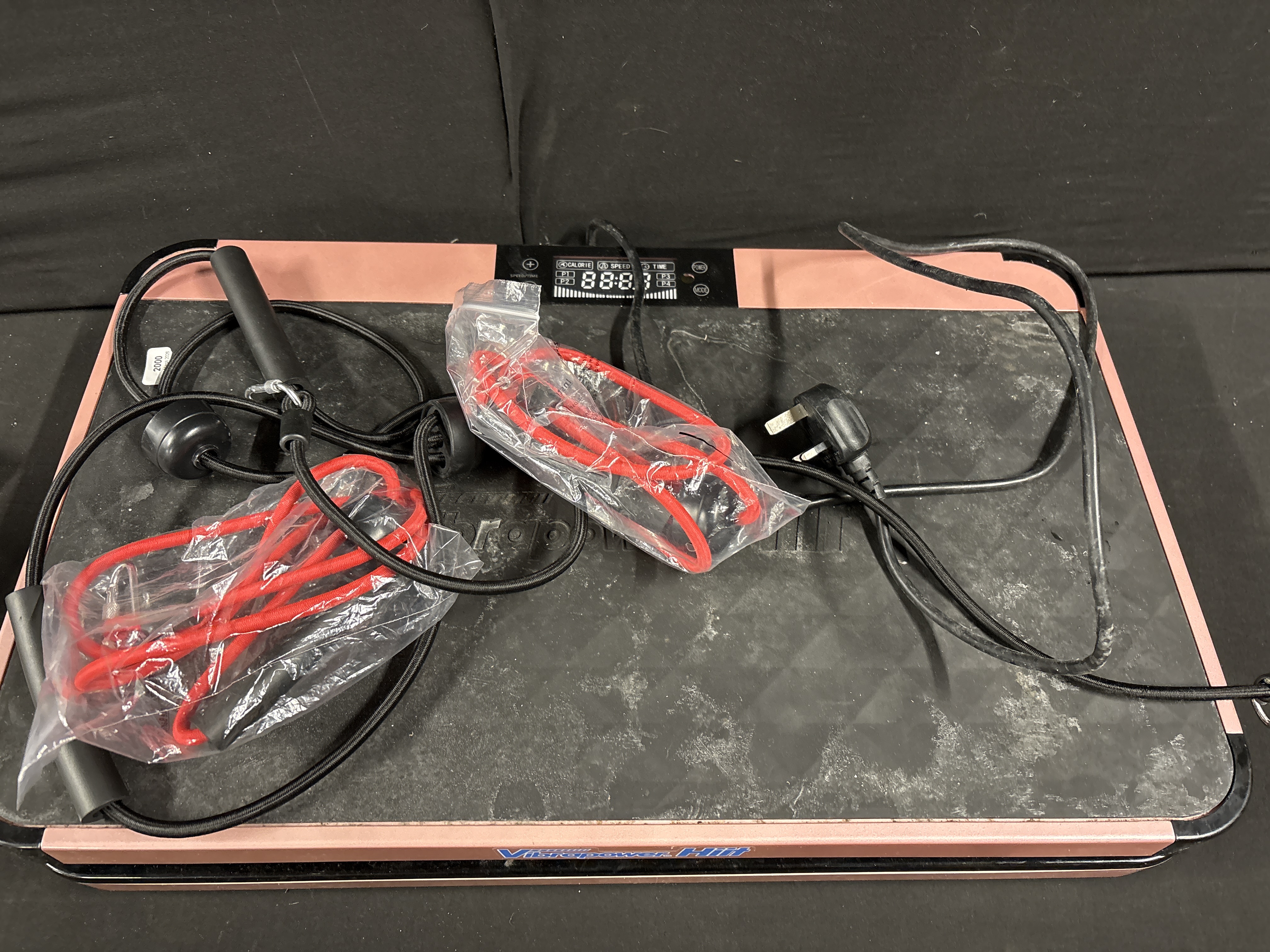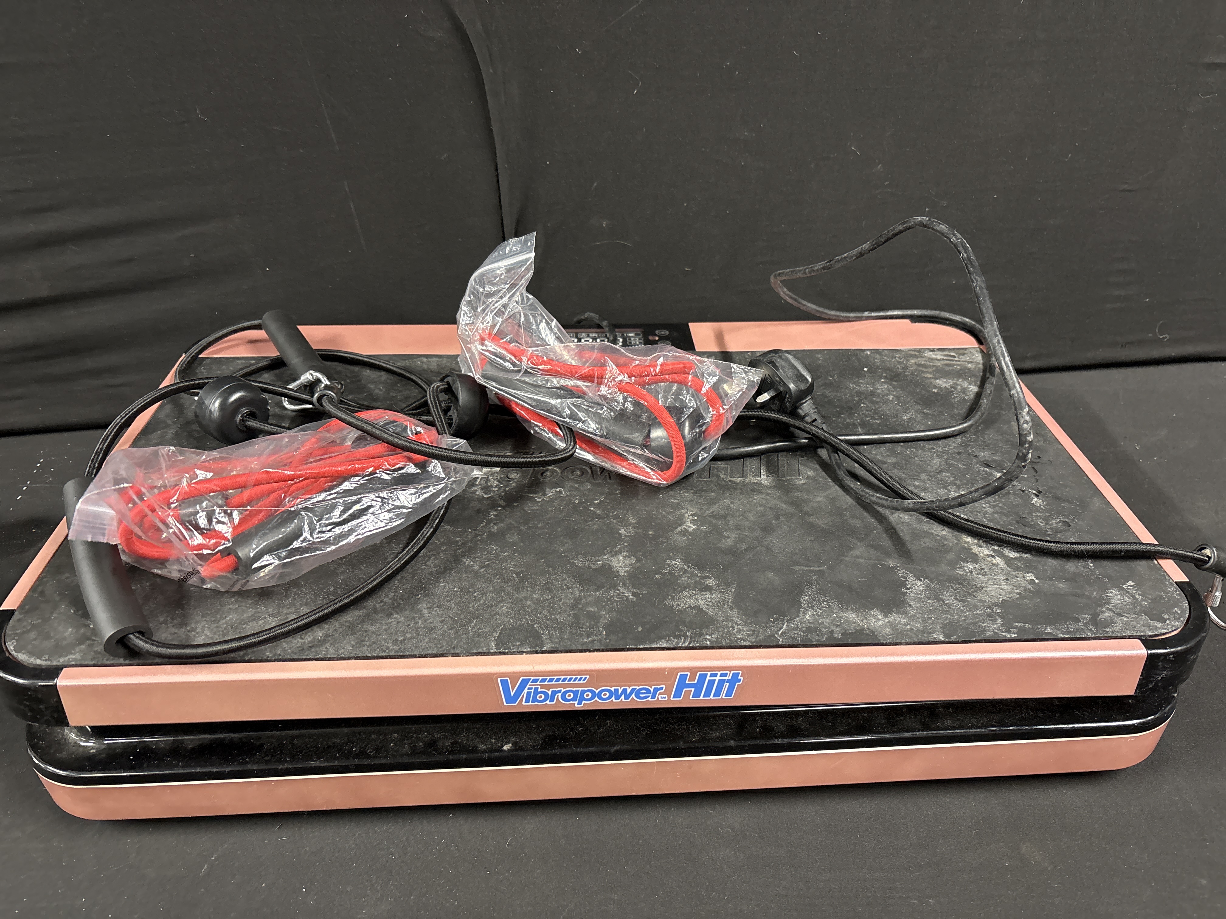 A Vibrapower Hiit vibration plate exercise machine, also referred to as a vibration unit. The item is constructed with a rose gold and black plastic housing and a black non-slip textured top surface. It features an integrated digital control panel with an LED display for monitoring calorie count, speed, and time. The unit is fitted with a standard UK 3-pin power plug. Included are two red resistance bands with handles, which remain in their original plastic packaging.