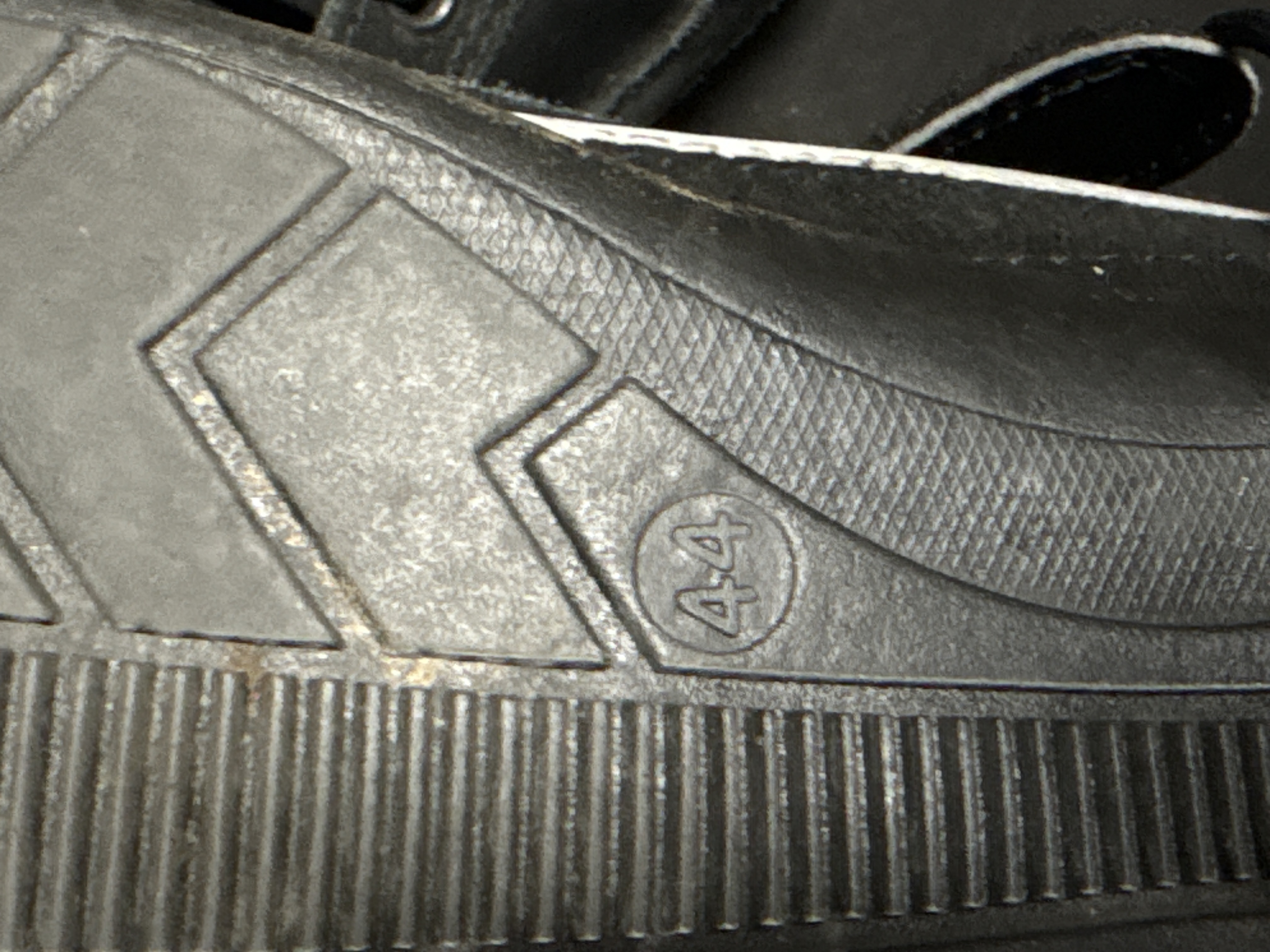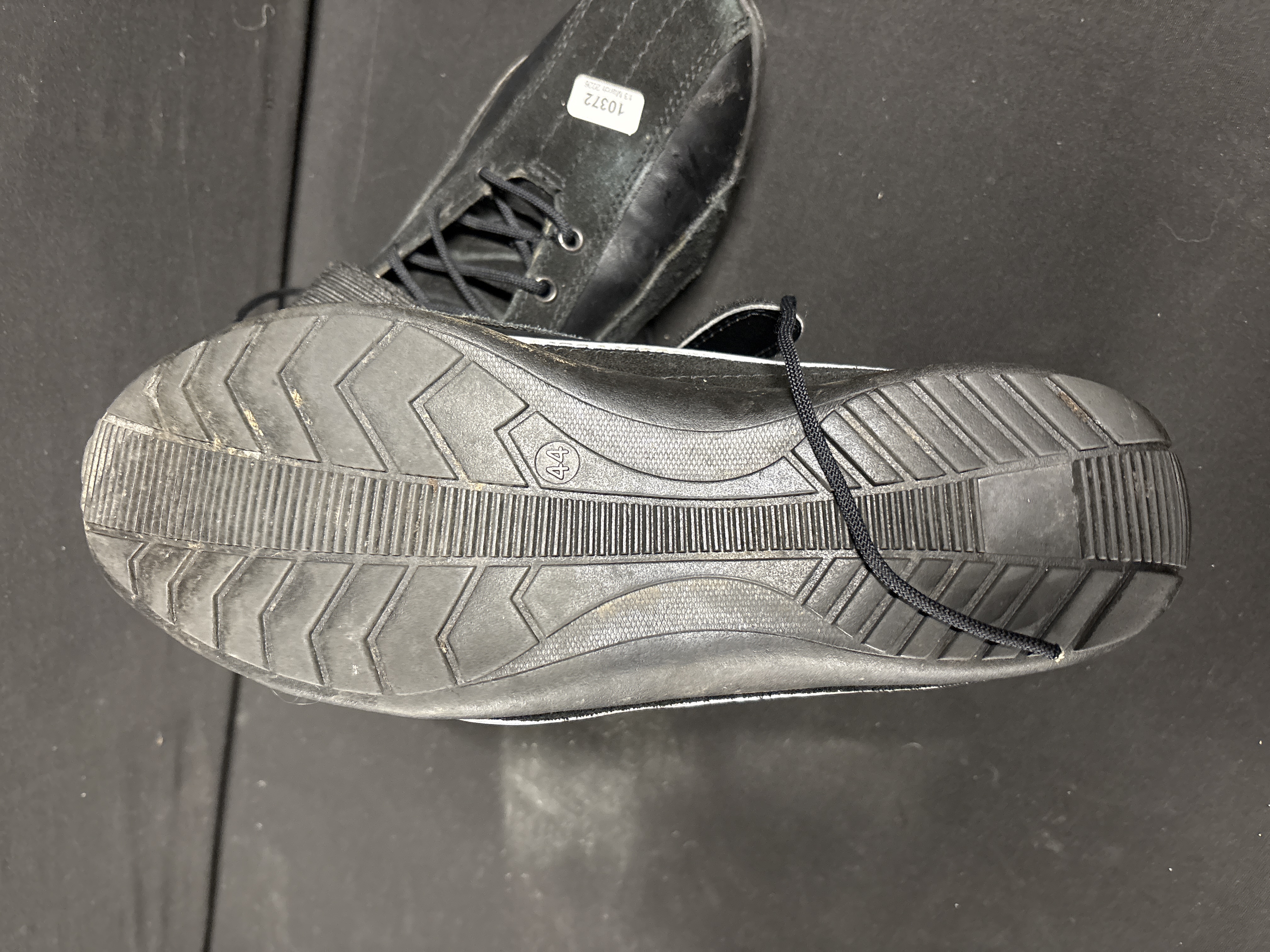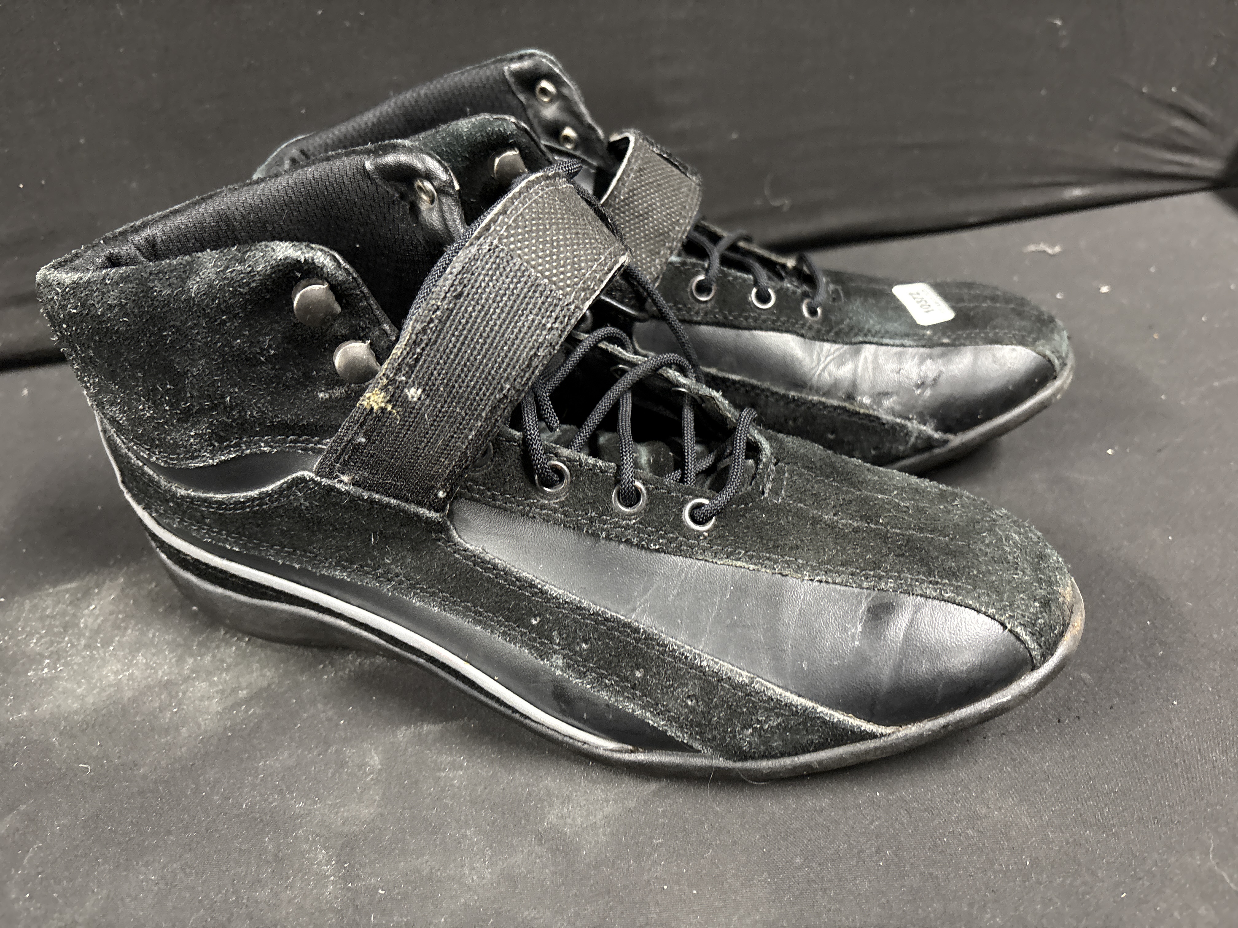 A pair of mid-top racing shoes constructed with a combination of smooth black leather and suede panels. The design features a lace-up front with black textile laces through metal eyelets, further secured by a wide, adjustable Velcro strap across the ankle and finished with decorative metal studs at the collar. The shoes are built upon textured black rubber outsoles. While the design resembles professional karting footwear by manufacturers such as Crow or Zamp, no maker marks are present on the uppers. The base of the outsole features an embossed circular mark containing the digits 44.