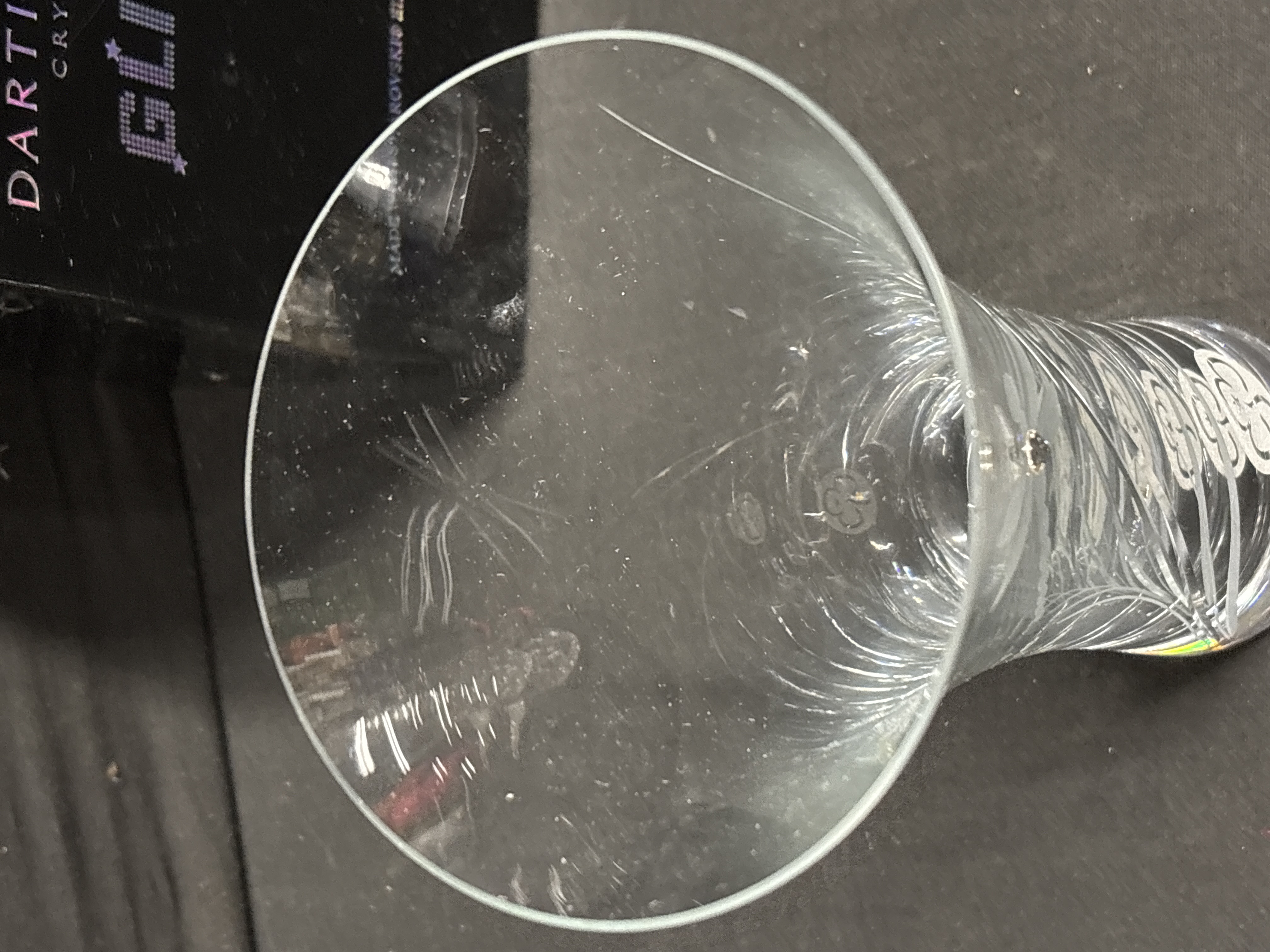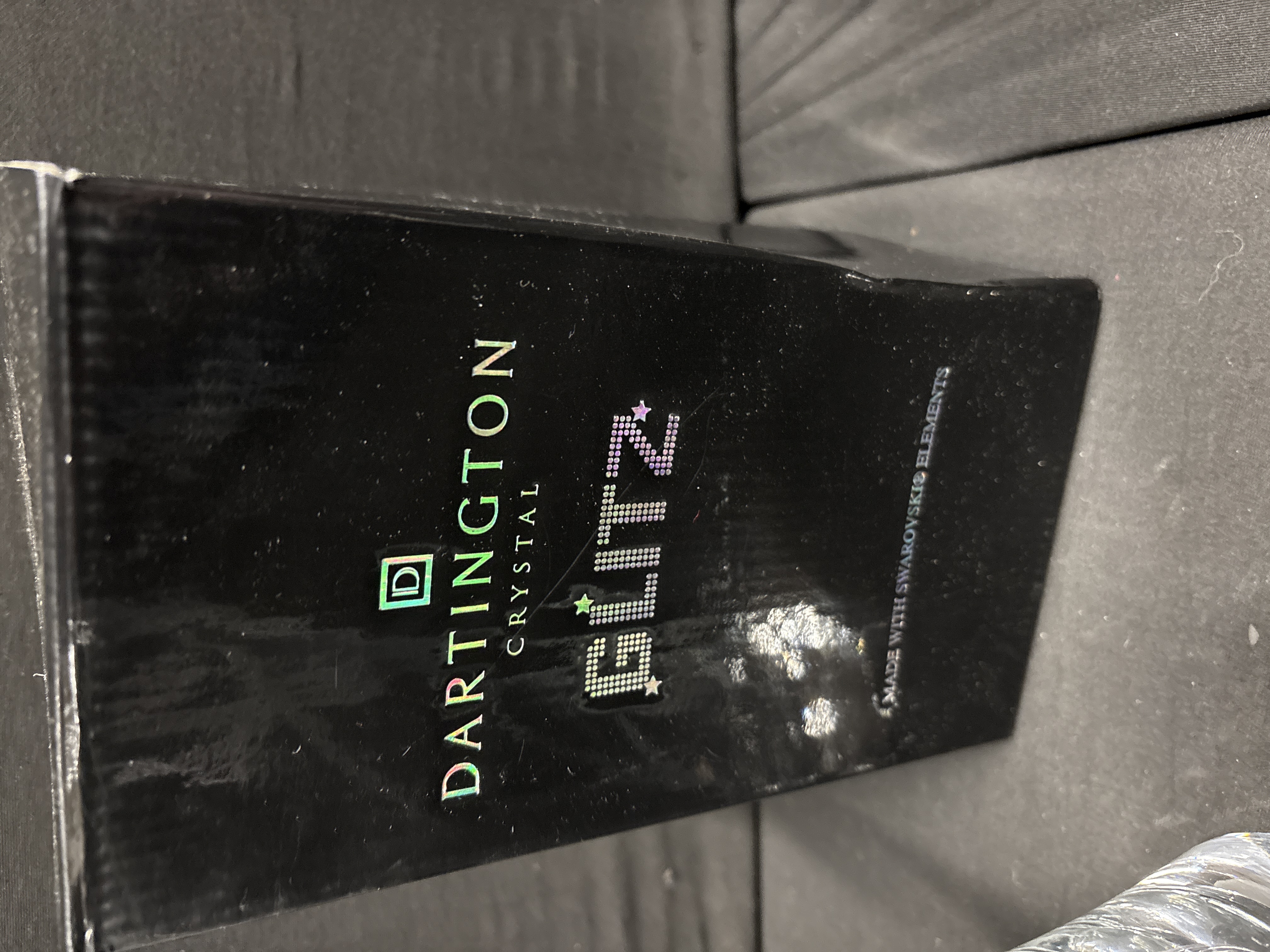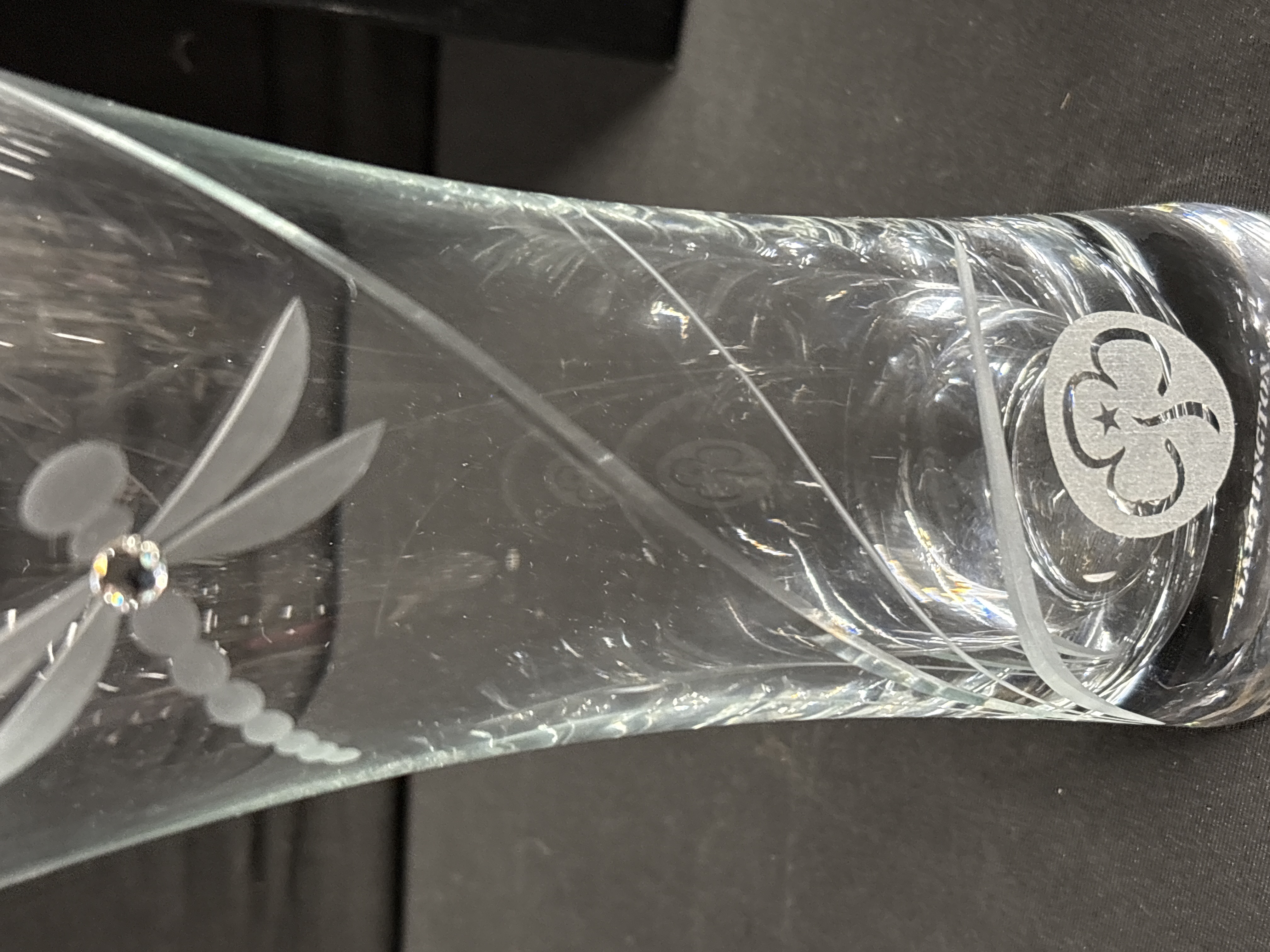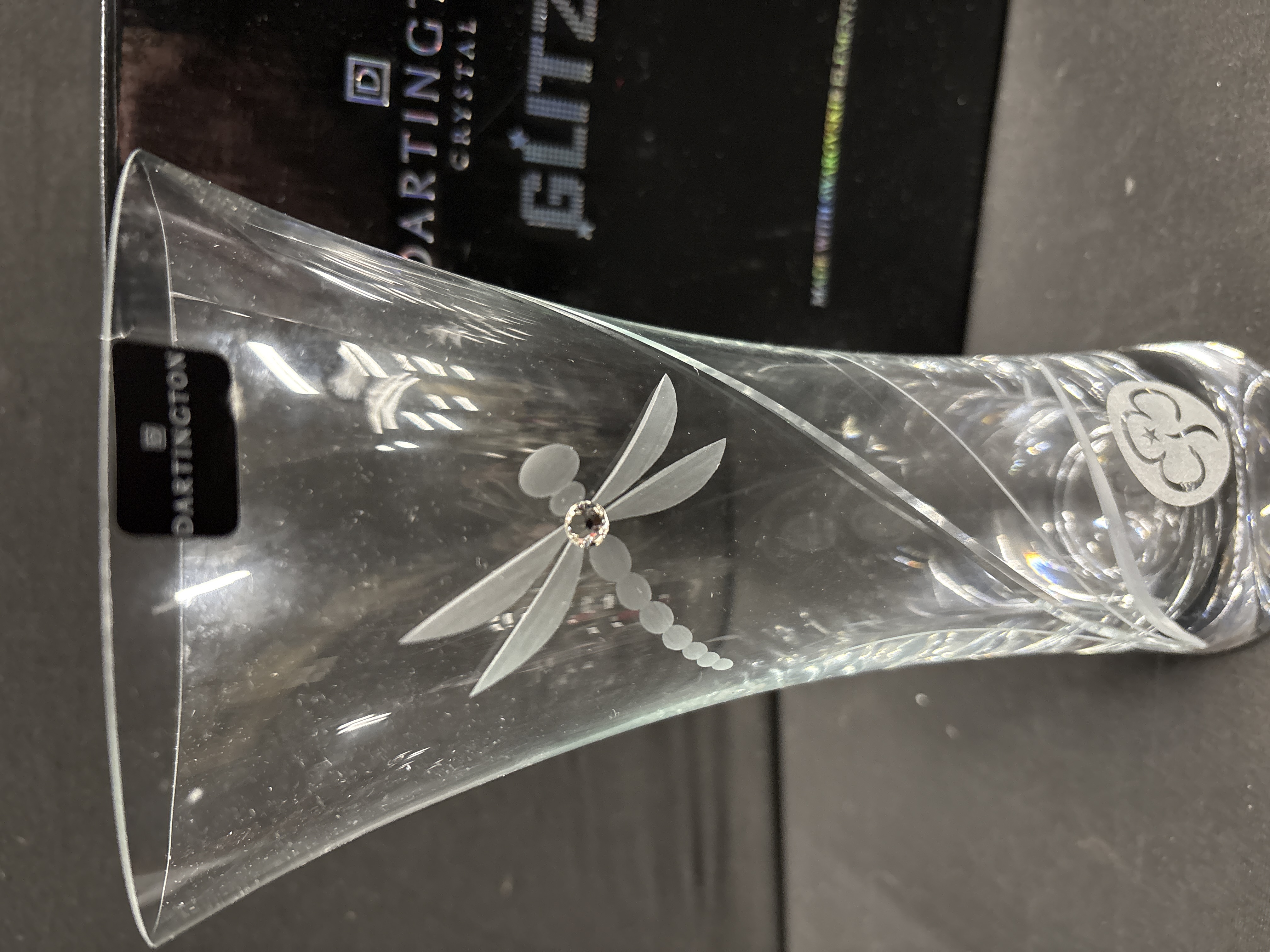 A Dartington Crystal flared vase from the Glitz range, crafted from clear lead crystal. The body features a frosted etched dragonfly motif to the front, accented with a single faceted Swarovski crystal element set into the thorax. The exterior is further decorated with etched swirling linear details. To the lower section is an etched trefoil emblem with a central star, the official insignia of the World Association of Girl Guides and Girl Scouts. The base is etched with the DARTINGTON mark. The vase retains its original black adhesive manufacturer label. Accompanied by the original black presentation box printed with Dartington Crystal Glitz and Swarovski branding.