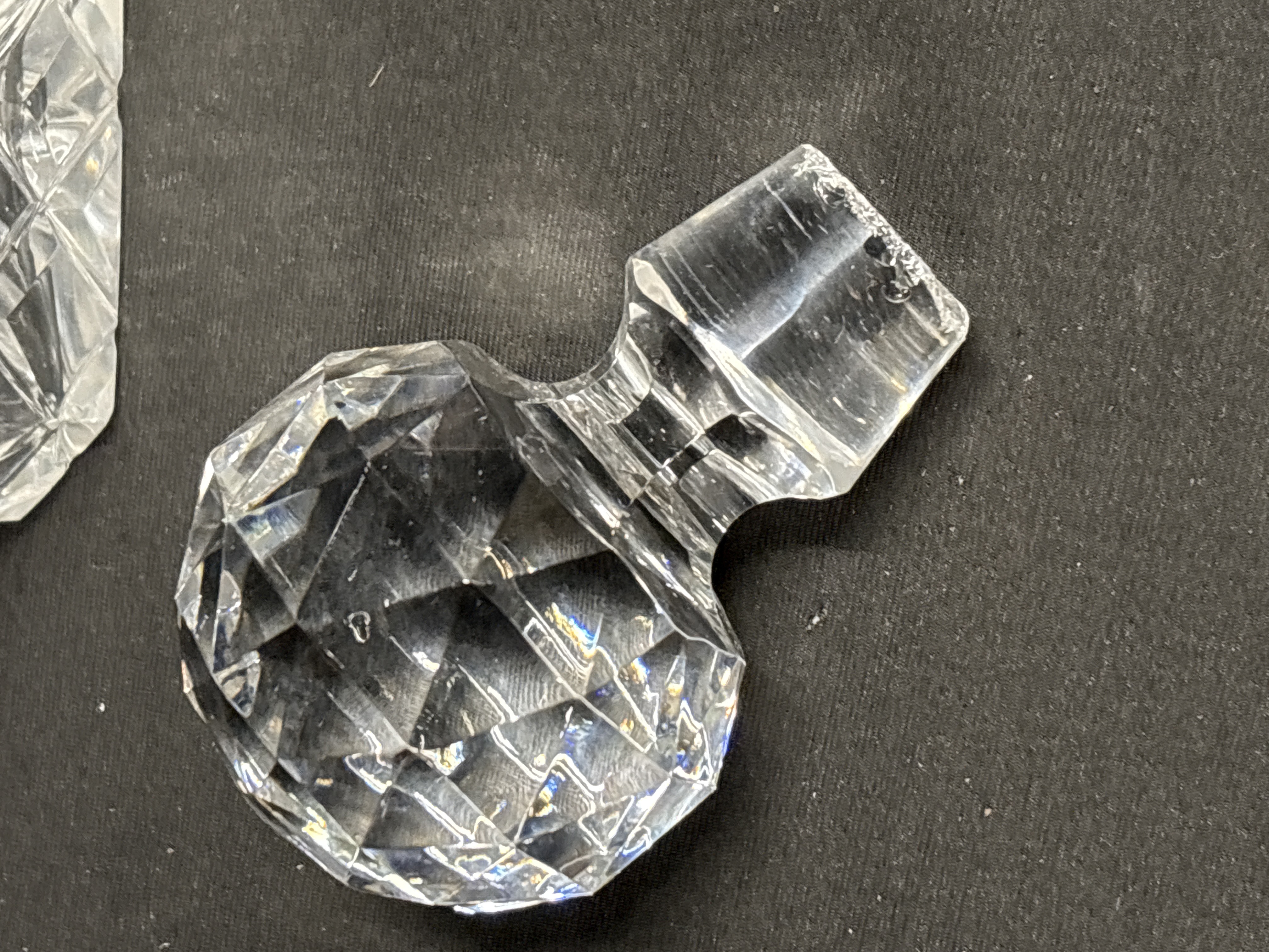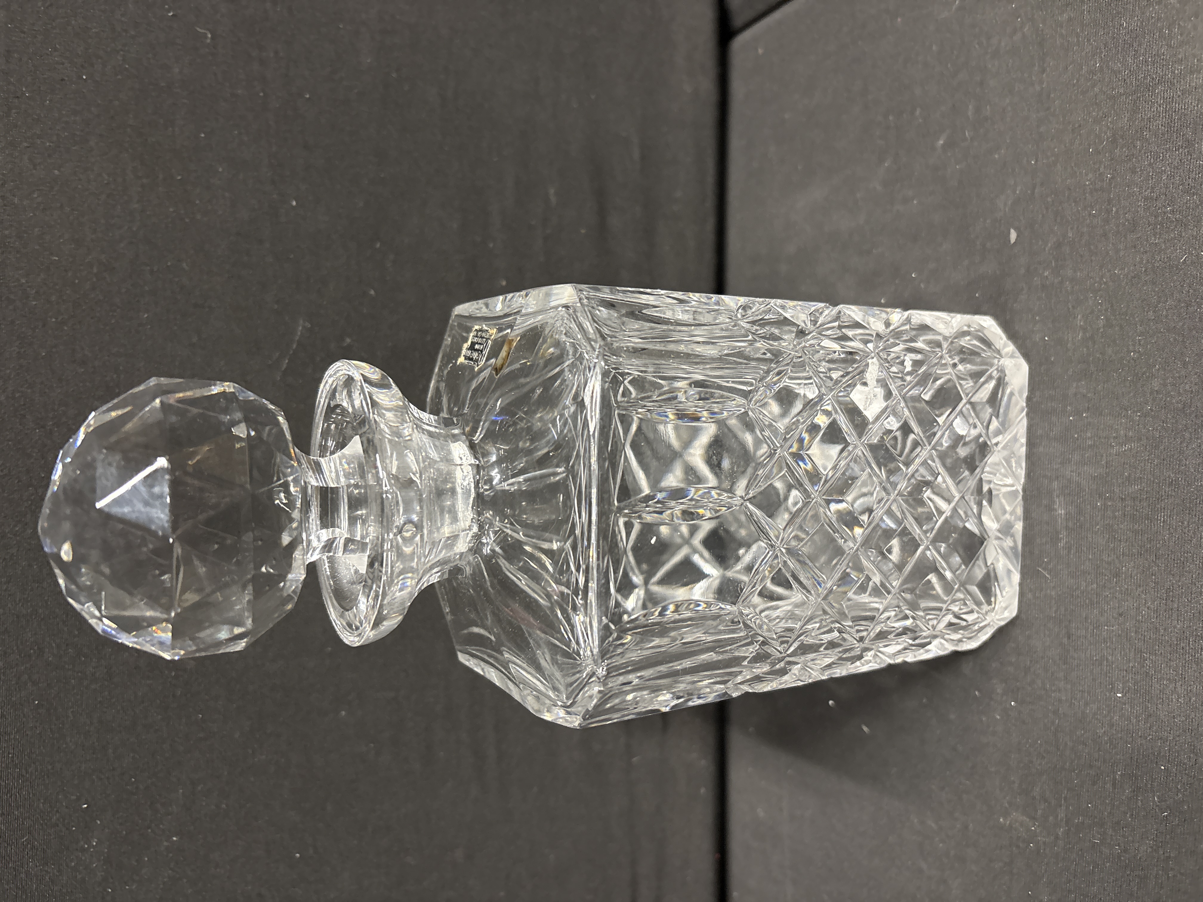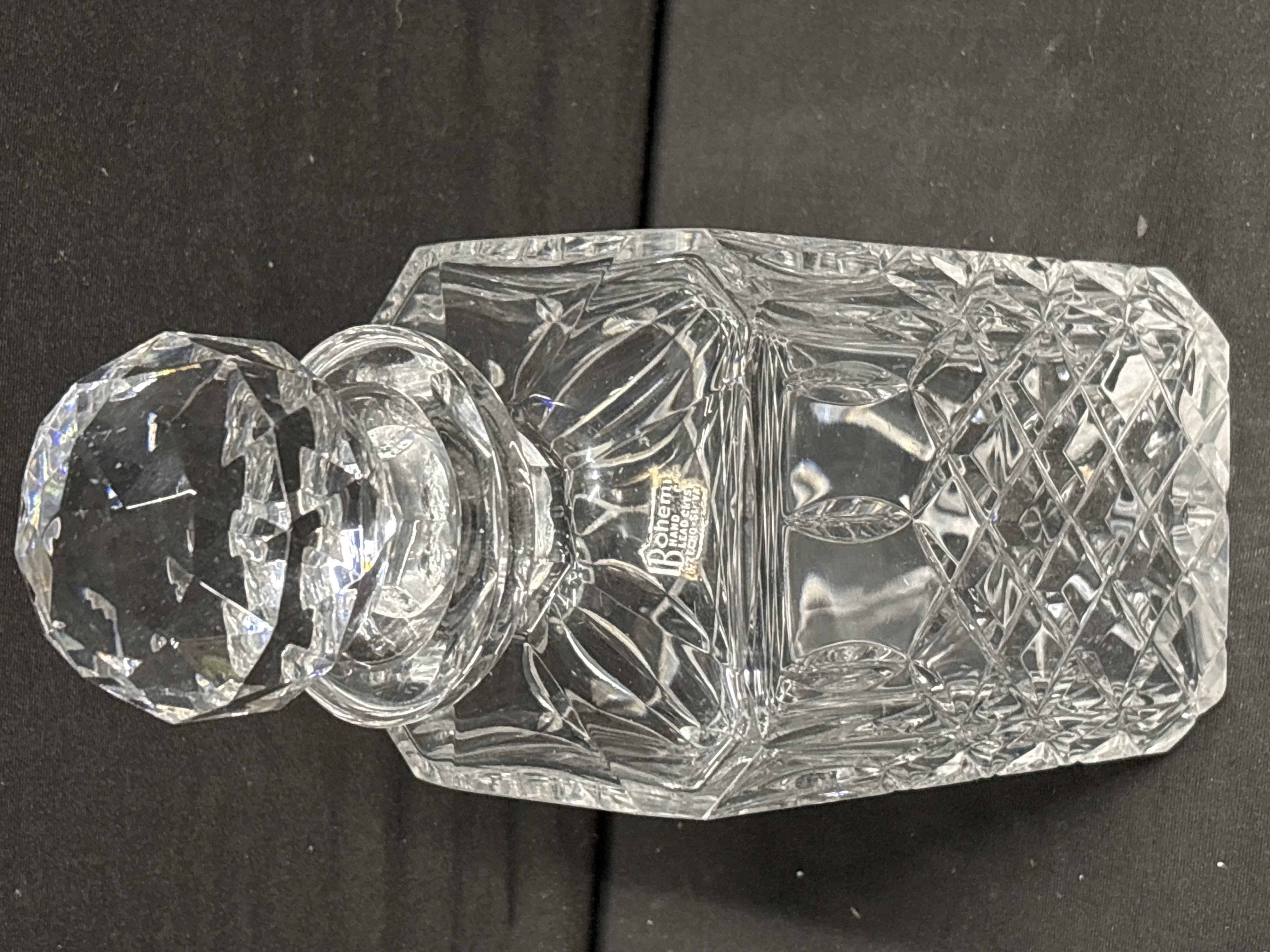 A Bohemian crystal decanter of square form, manufactured by Bohemia Crystal. The item is accompanied by a matching multifaceted ball stopper. The body features a diamond criss-cross cutting pattern across the lower two-thirds, transitioning to vertical mitre-cut flutes on the shoulders. The stopper is decorated with triangular and diamond-shaped facets to a globose top. The shoulder of the decanter retains an original gold and black foil label with a stylised capital letter B followed by the text ohemia, and the phrases Hand Cut, Lead Crystal, and Made in Czechoslovakia. This mark indicates production in the former Czechoslovakia prior to 1993. The glass exhibits clarity and refractive properties characteristic of lead crystal.