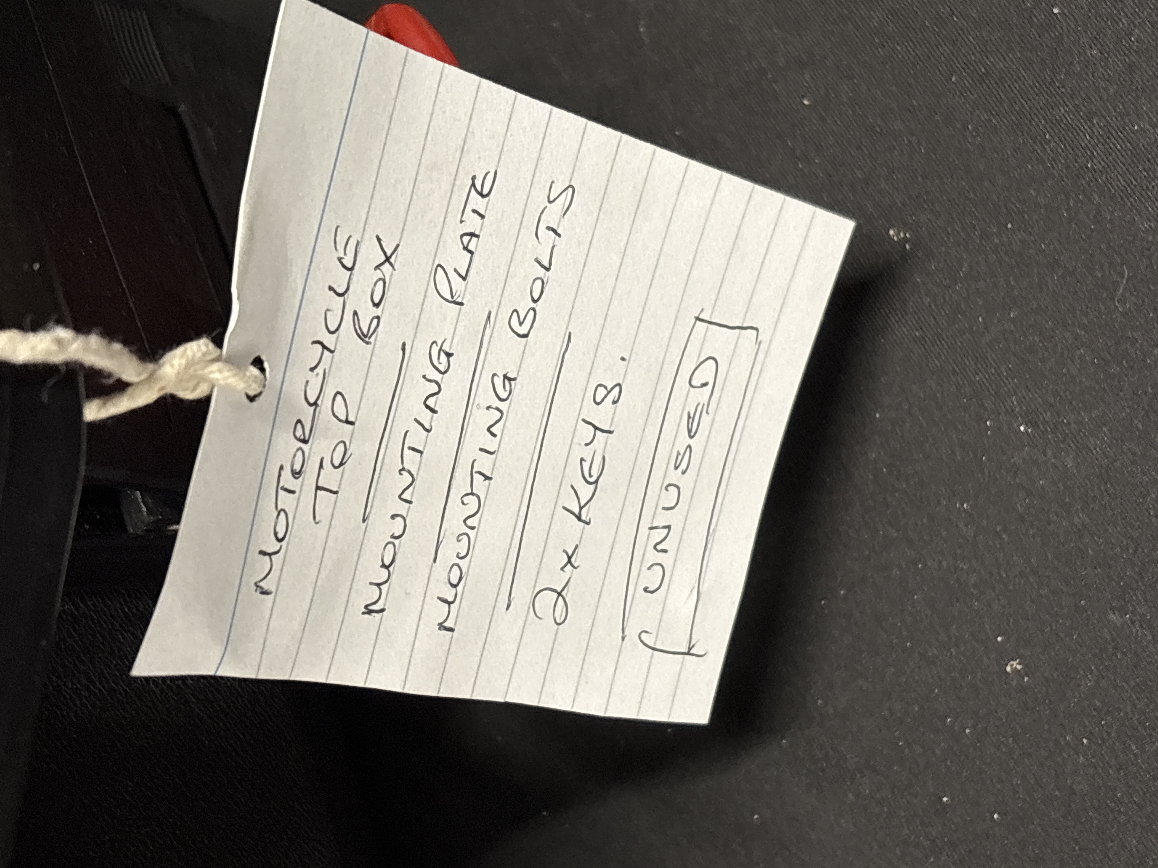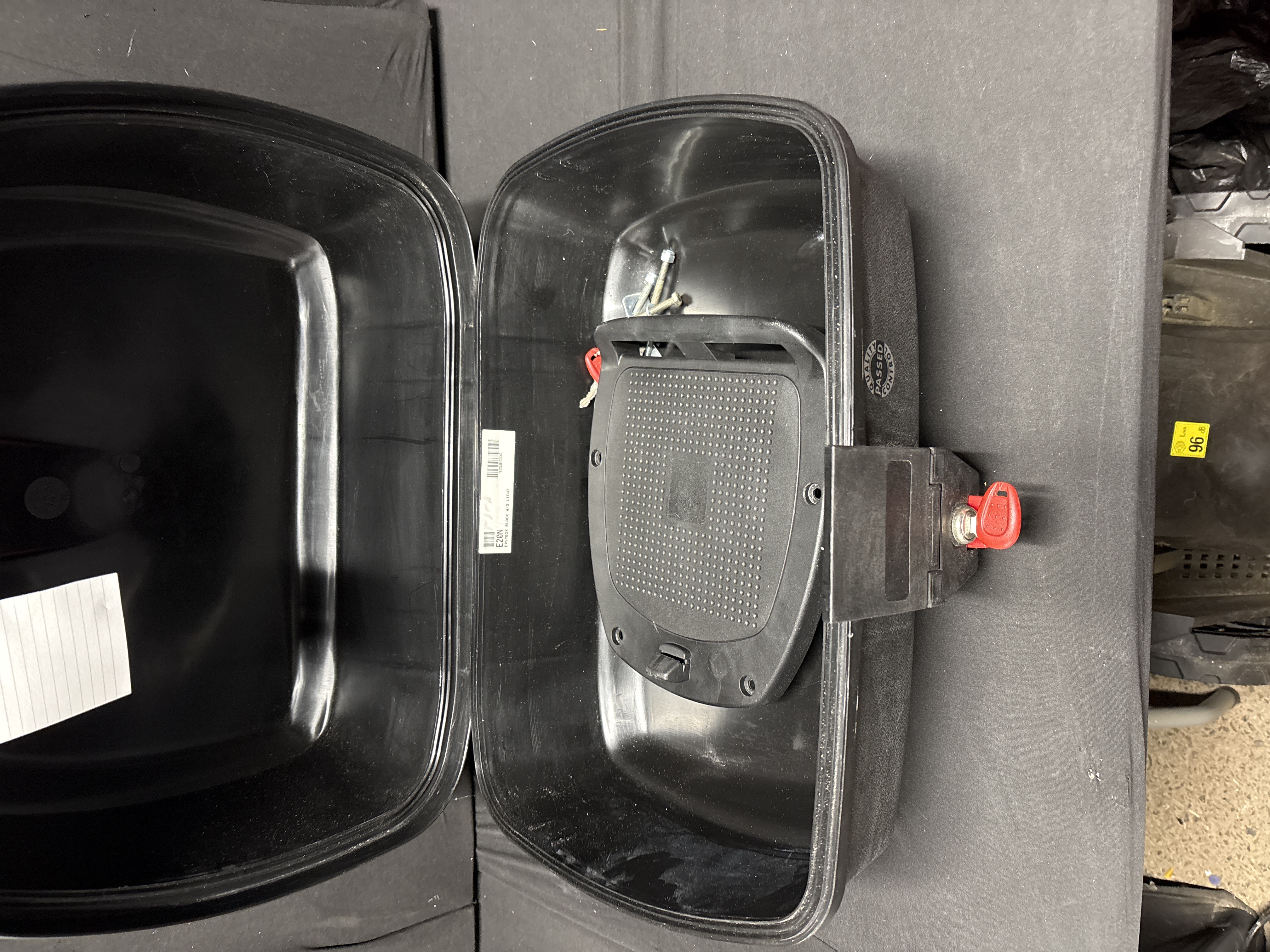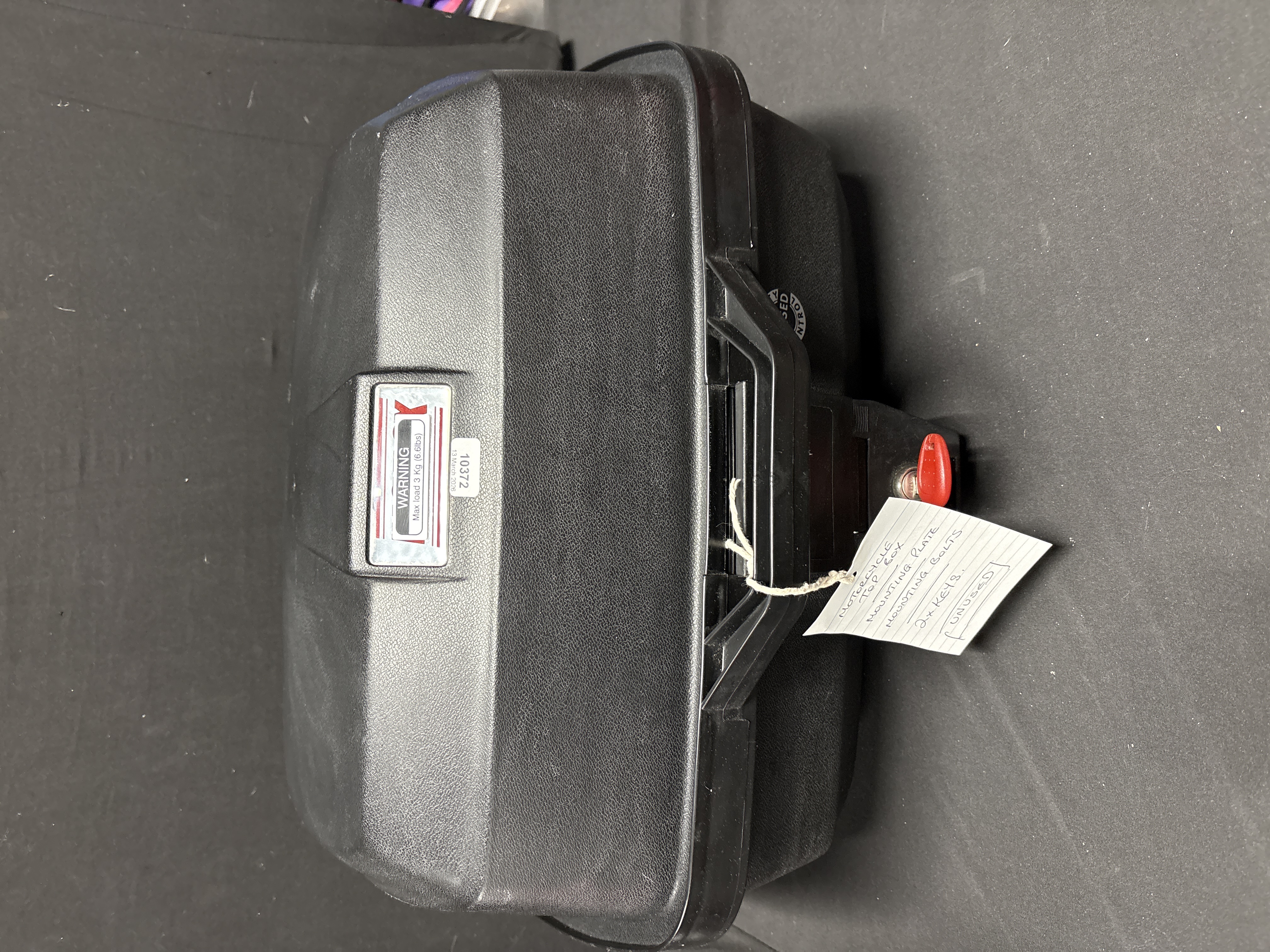 A motorcycle top box of black textured plastic construction, identified by an internal label as an E20N Easybox. The unit is equipped with a locking lid and includes two red-handled keys. The lot is complete with its original black plastic mounting plate and a set of mounting bolts. An external warning label states a maximum load capacity of 3 kg (6.6 lbs). The interior features a quality control sticker and a model identification label.