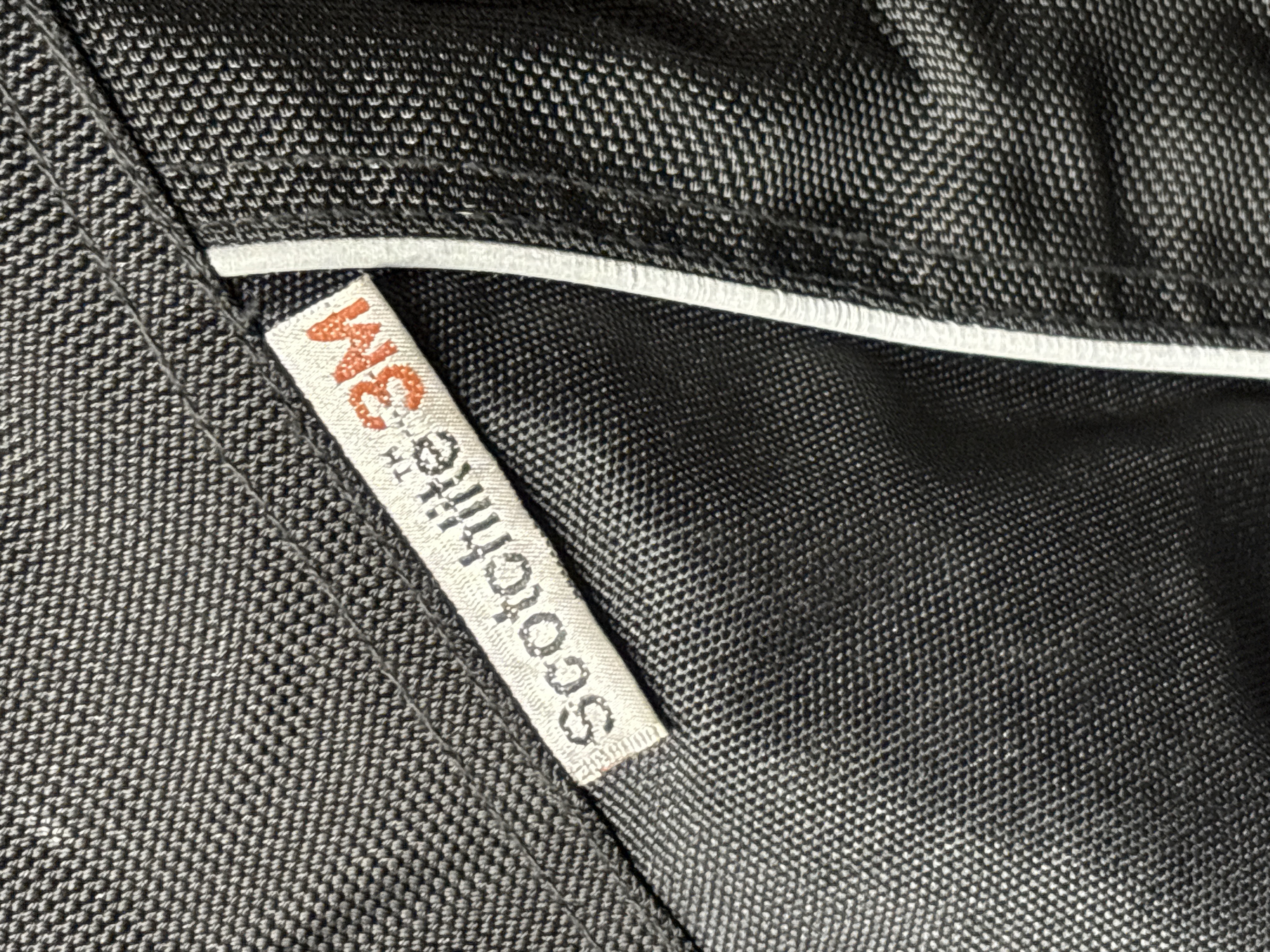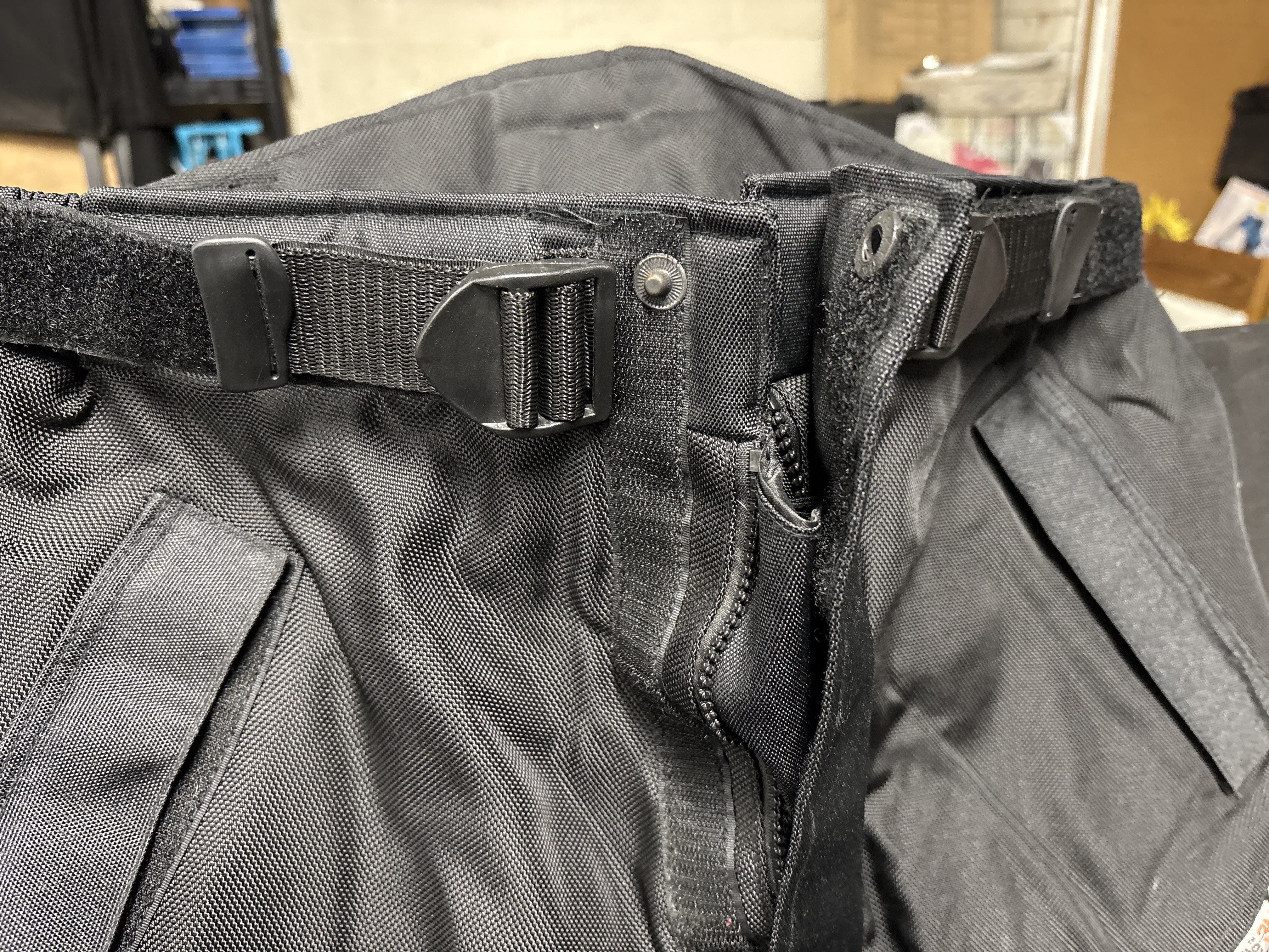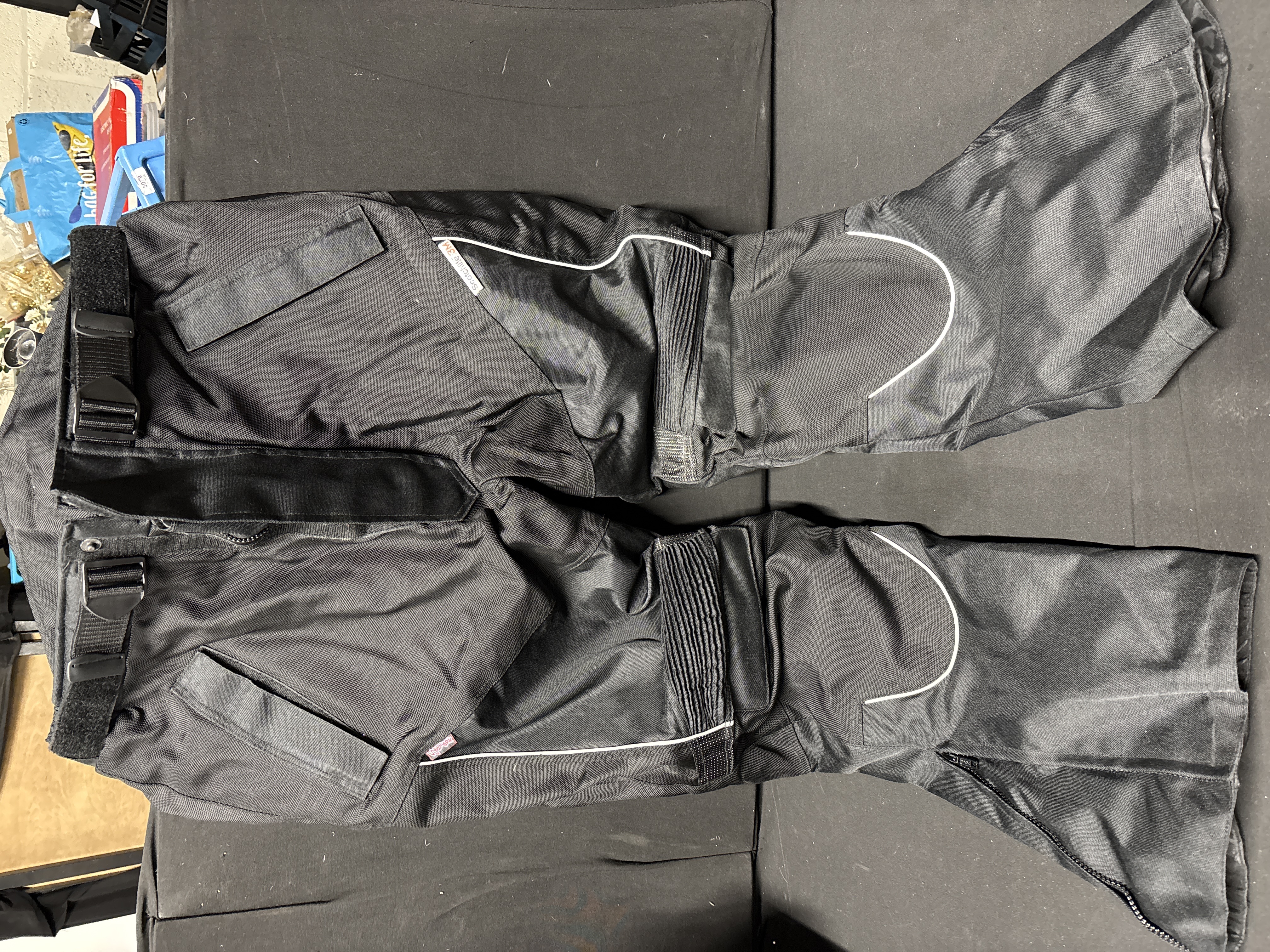 A pair of Akito motorcycle trousers constructed from black heavy-duty textile featuring 3M Scotchlite reflective piping. The design incorporates accordion stretch panels at the knees and reinforced sections for rider protection. The trousers feature a zip and press-stud fly, two front pockets with flap closures, and integrated adjustable waist straps with black plastic hardware and hook-and-loop fasteners. The garment is fully lined and includes an internal size tag indicating a size 36. Branding is present via an embroidered label with the letters Akito in white with a red border, and a smaller white tag bearing the name Scotchlite 3M.