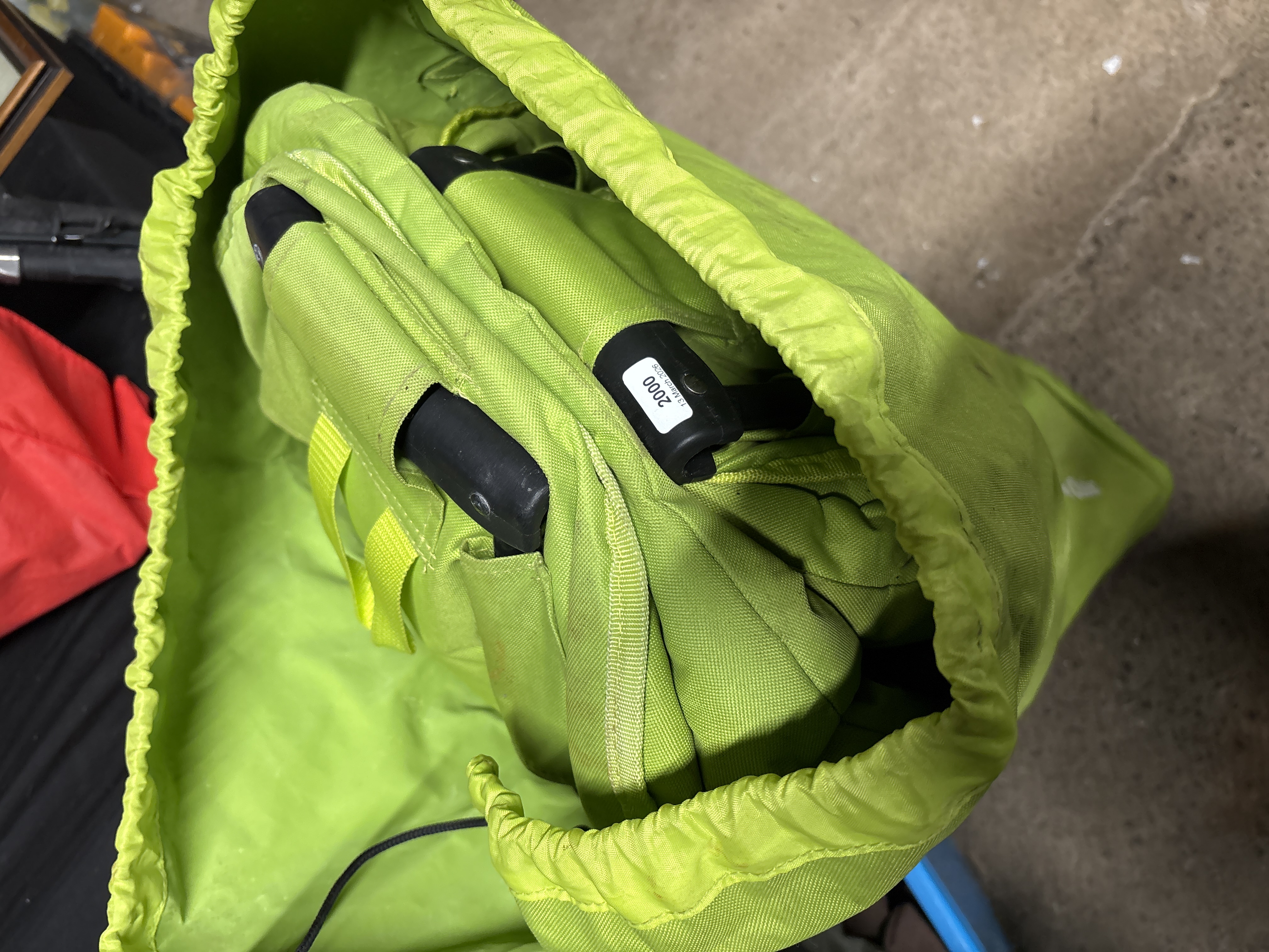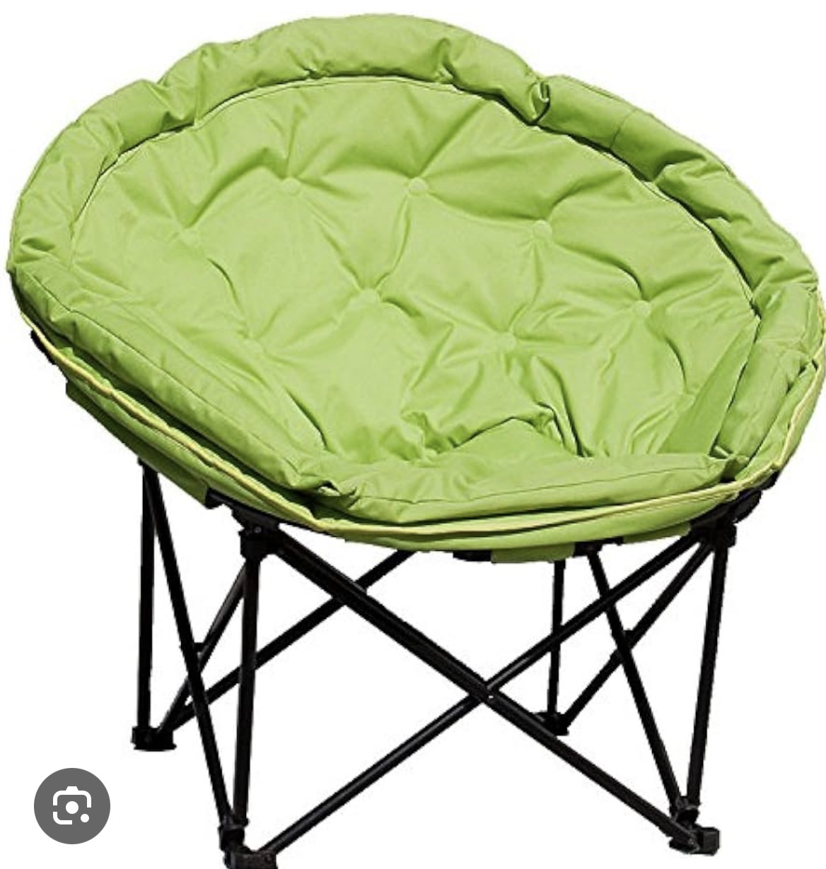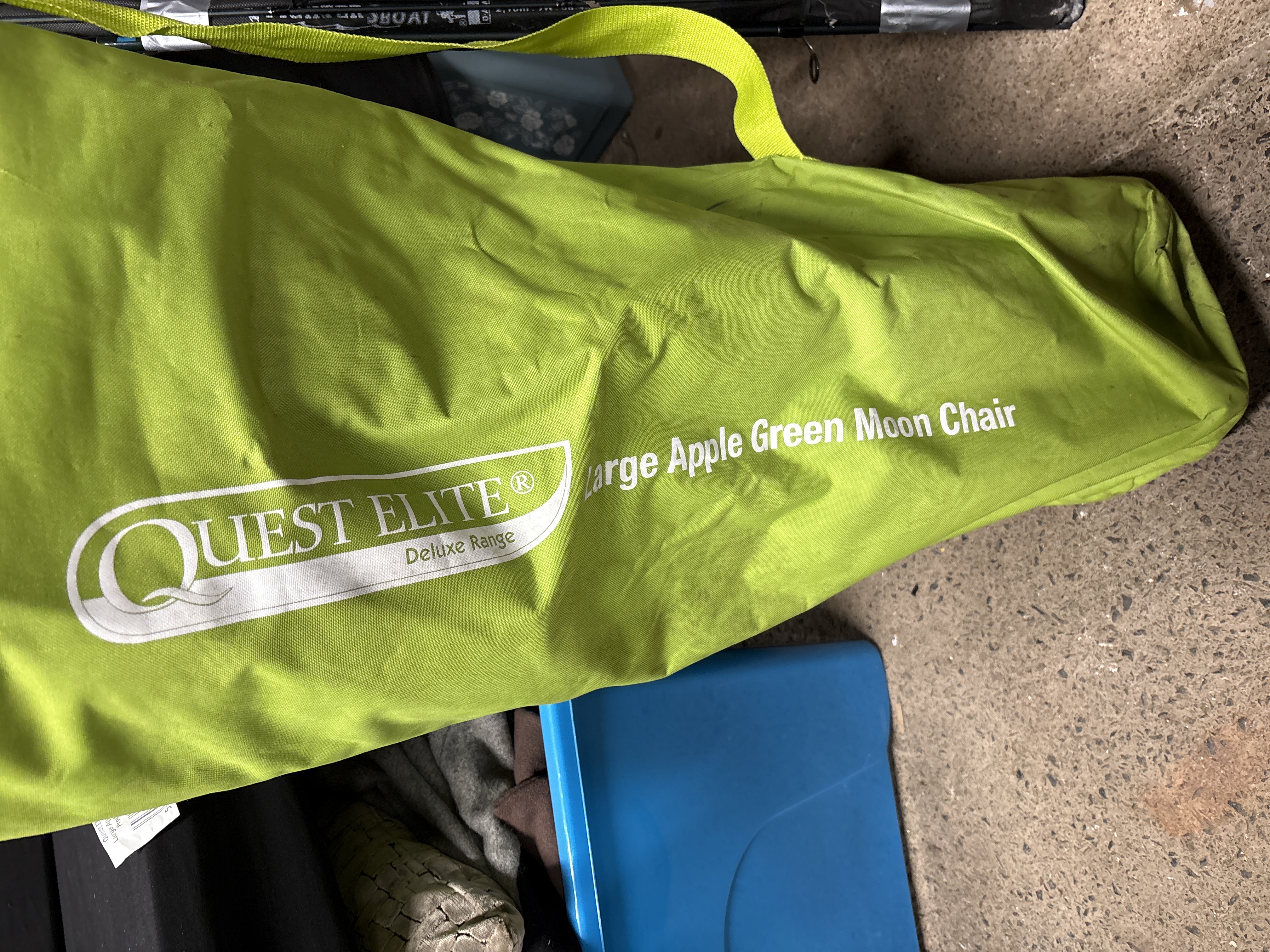 A Quest Elite Deluxe Range large apple green moon chair. This contemporary folding chair features a padded, button-tufted seat upholstered in an apple green synthetic fabric. The seat is mounted upon a black-finished tubular metal folding frame with black plastic joints. The chair is accompanied by its original lime-green drawstring carry bag with a shoulder strap. The bag is printed with the Quest Elite Deluxe Range logo and the text Large Apple Green Moon Chair. A small white sticker on one of the frame components is marked 2000 and 13 March 2026.