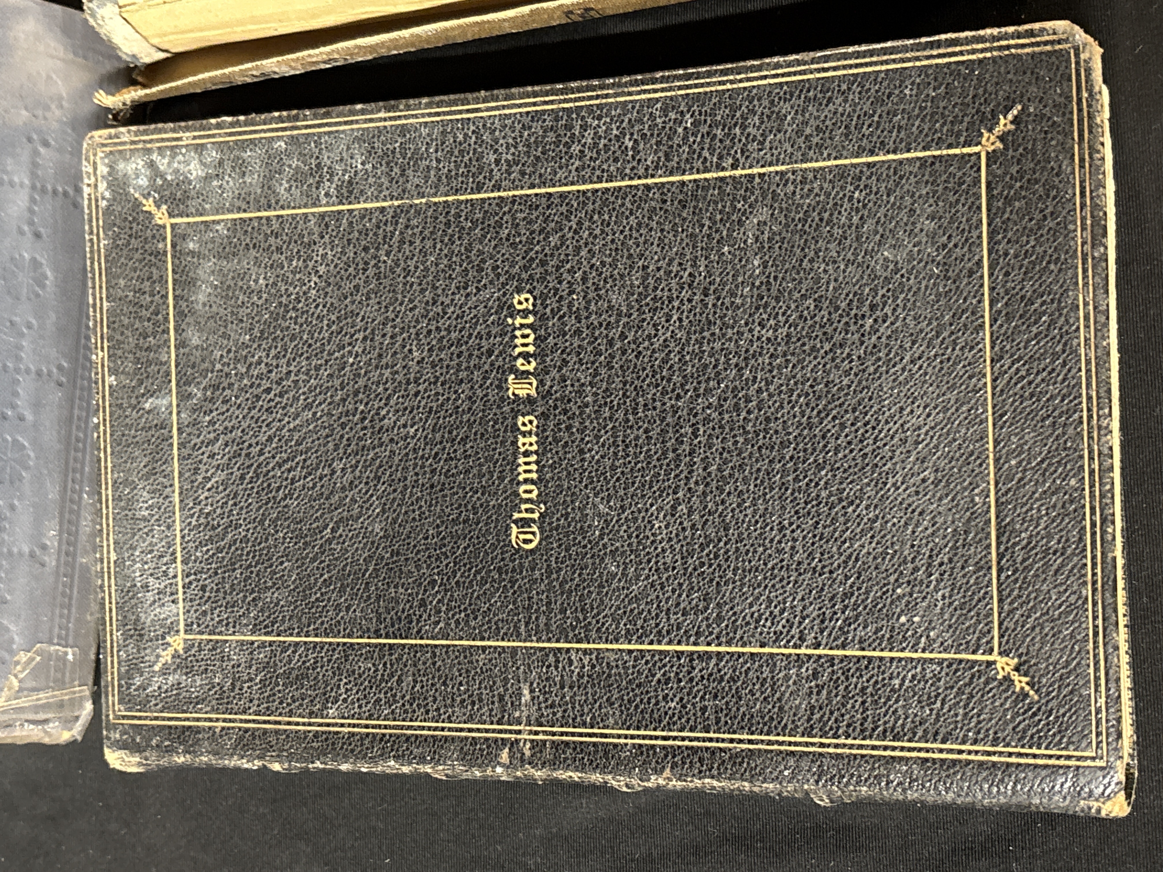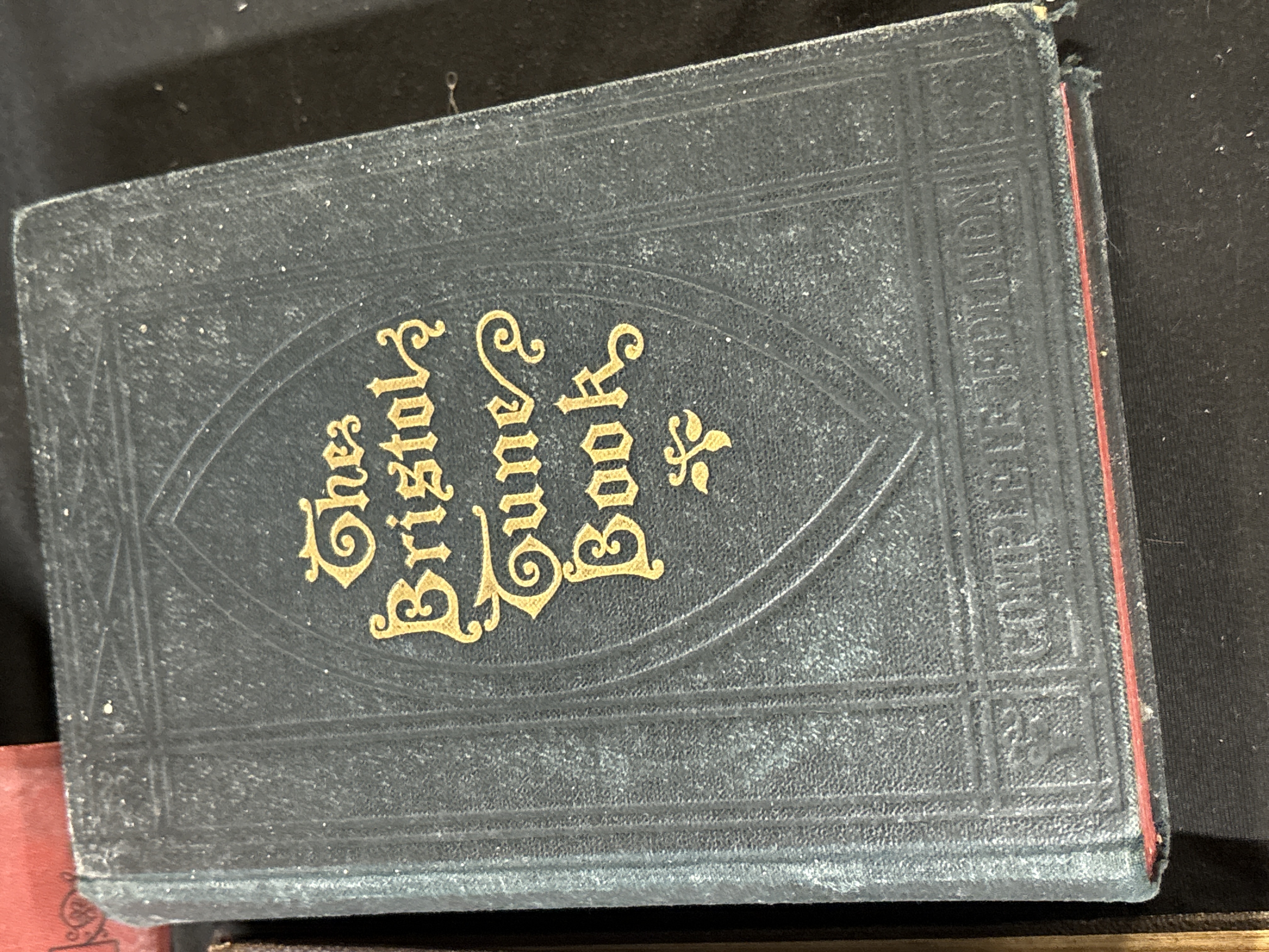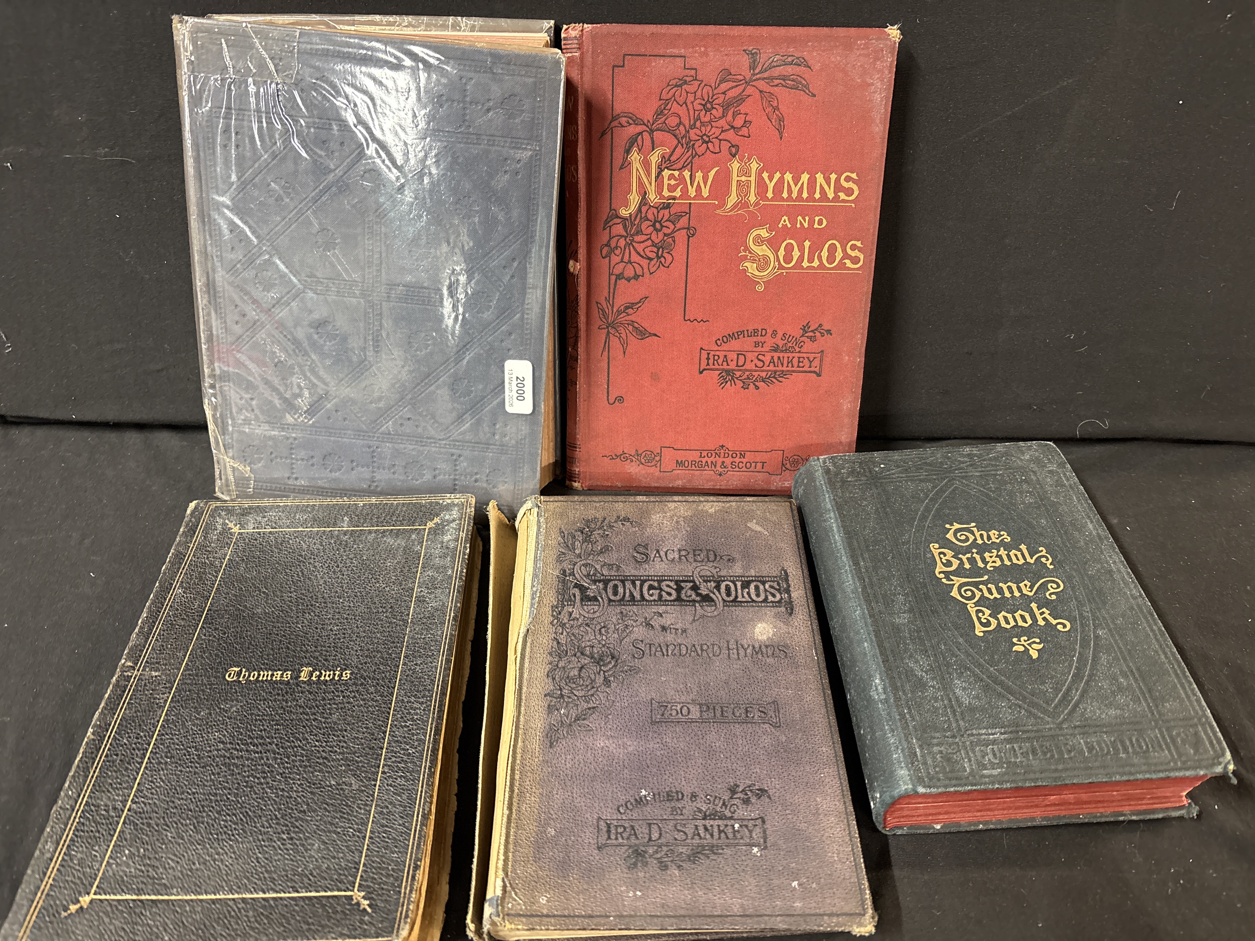 This selection of antique hymn books and church music volumes comprises five individual works primarily of British origin. The collection includes New Hymns and Solos, compiled and sung by Ira D. Sankey, published in London by Morgan & Scott, featuring a red publisher’s cloth binding with decorative black and gilt floral motifs. A second volume by Sankey, titled Sacred Songs & Solos with Standard Hymns (750 Pieces), is bound in purple-grey cloth with black stamped ornamentation. The Bristol Tune Book, Complete Edition, is present in a dark green cloth binding with gilt lettering and red-stained page edges. Also included is a volume bound in textured black leather with a gilt-ruled border and the name Thomas Lewis stamped in gilt on the front board. The final volume is The Church Anthem Book, bound in grey cloth with gilt spine lettering and housed in a protective plastic sleeve. The volumes are generally in octavo or small quarto format.