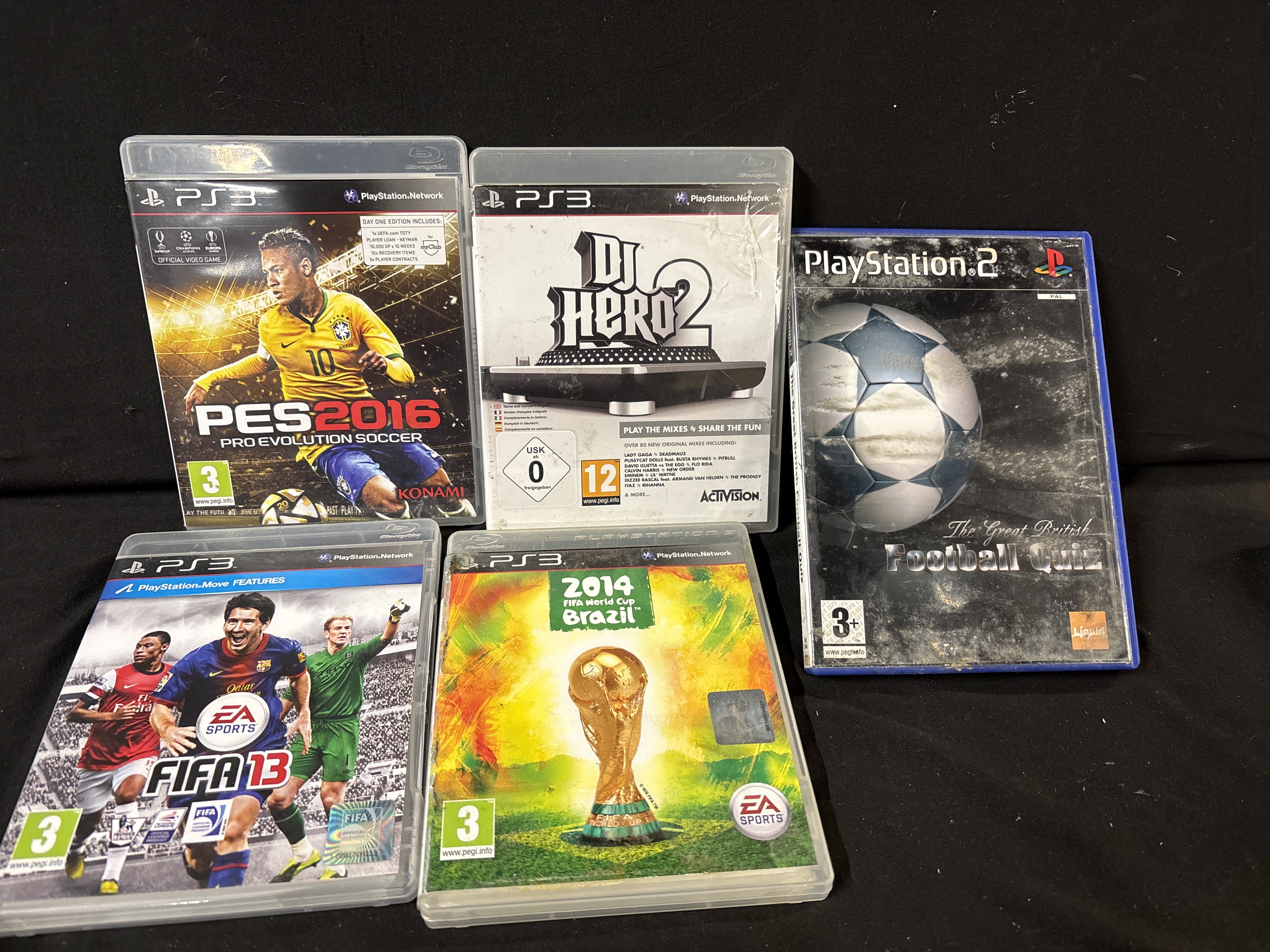 This collection consists of five video games for the Sony PlayStation 3 and PlayStation 2 consoles. The lot includes four titles for the PlayStation 3: PES 2016 Pro Evolution Soccer Day One Edition published by Konami, DJ Hero 2 published by Activision, FIFA 13 published by EA Sports, and 2014 FIFA World Cup Brazil published by EA Sports. The fifth title is The Great British Football Quiz for the PlayStation 2, published by Liquid Games. The games are housed in their original plastic cases with printed cover art. PES 2016 includes Day One Edition branding. FIFA 13 notes PlayStation Move functionality. 2014 FIFA World Cup Brazil features an official FIFA hologram on the front. The PlayStation 2 title is a PAL region release in a standard blue case.