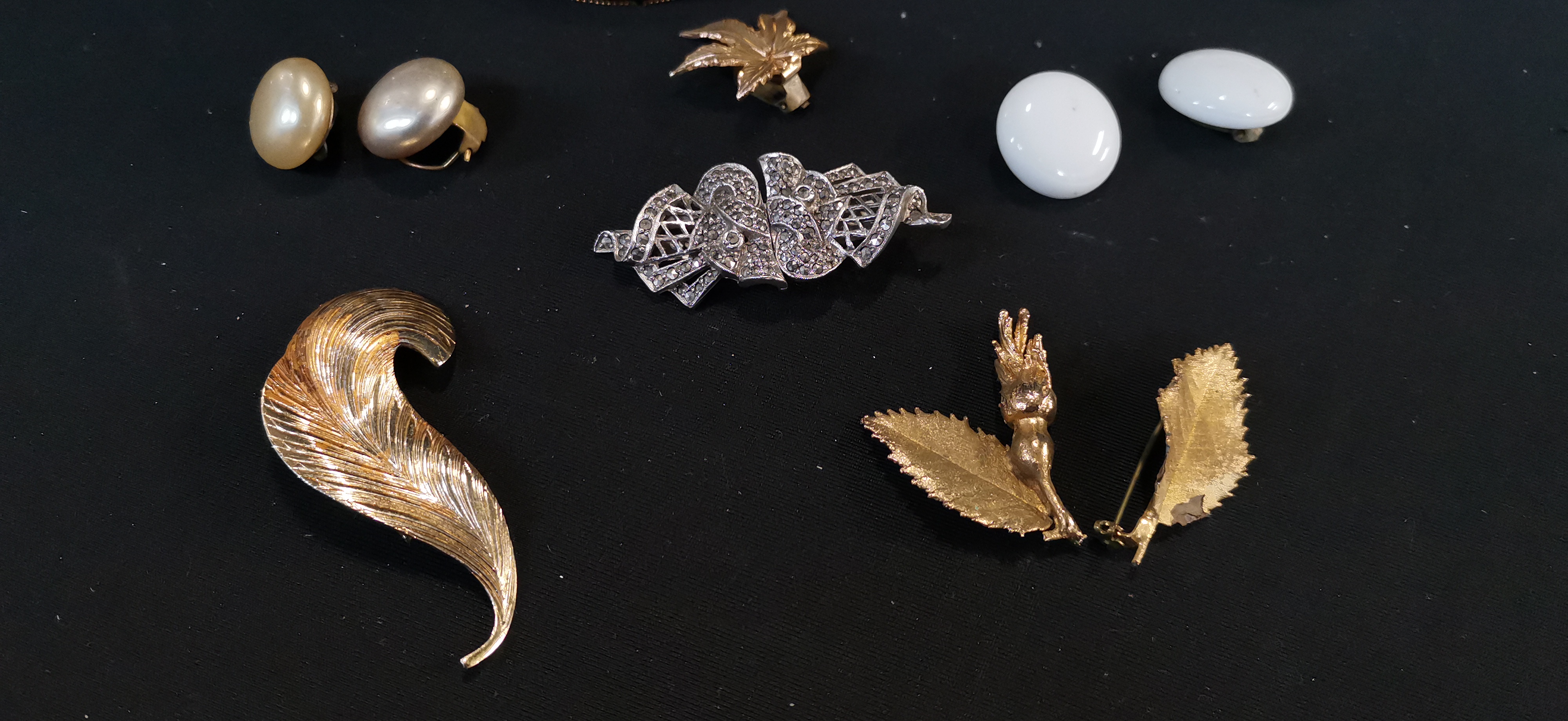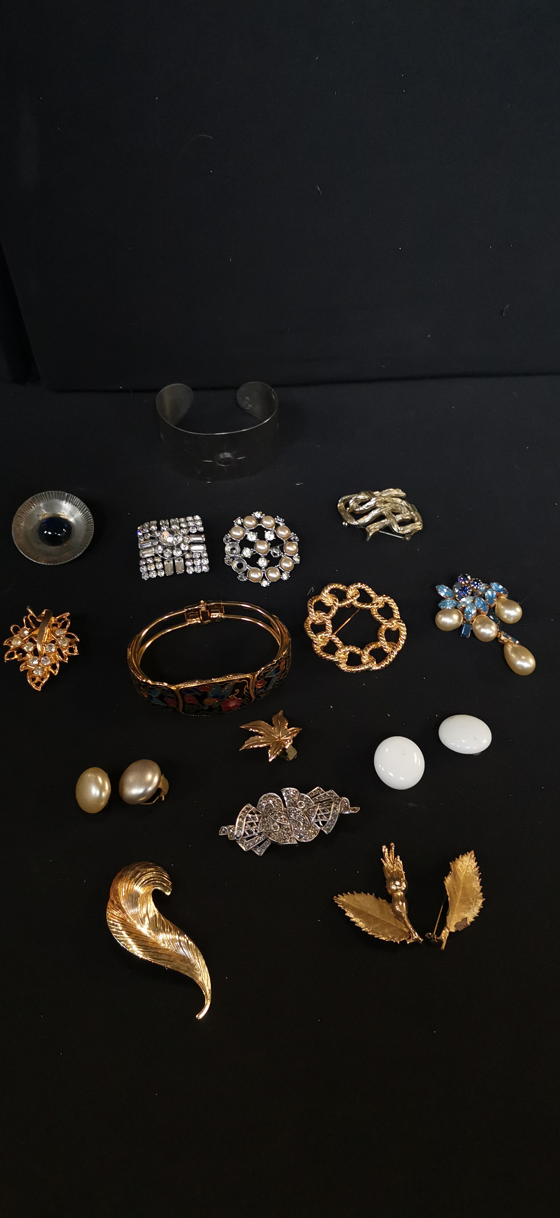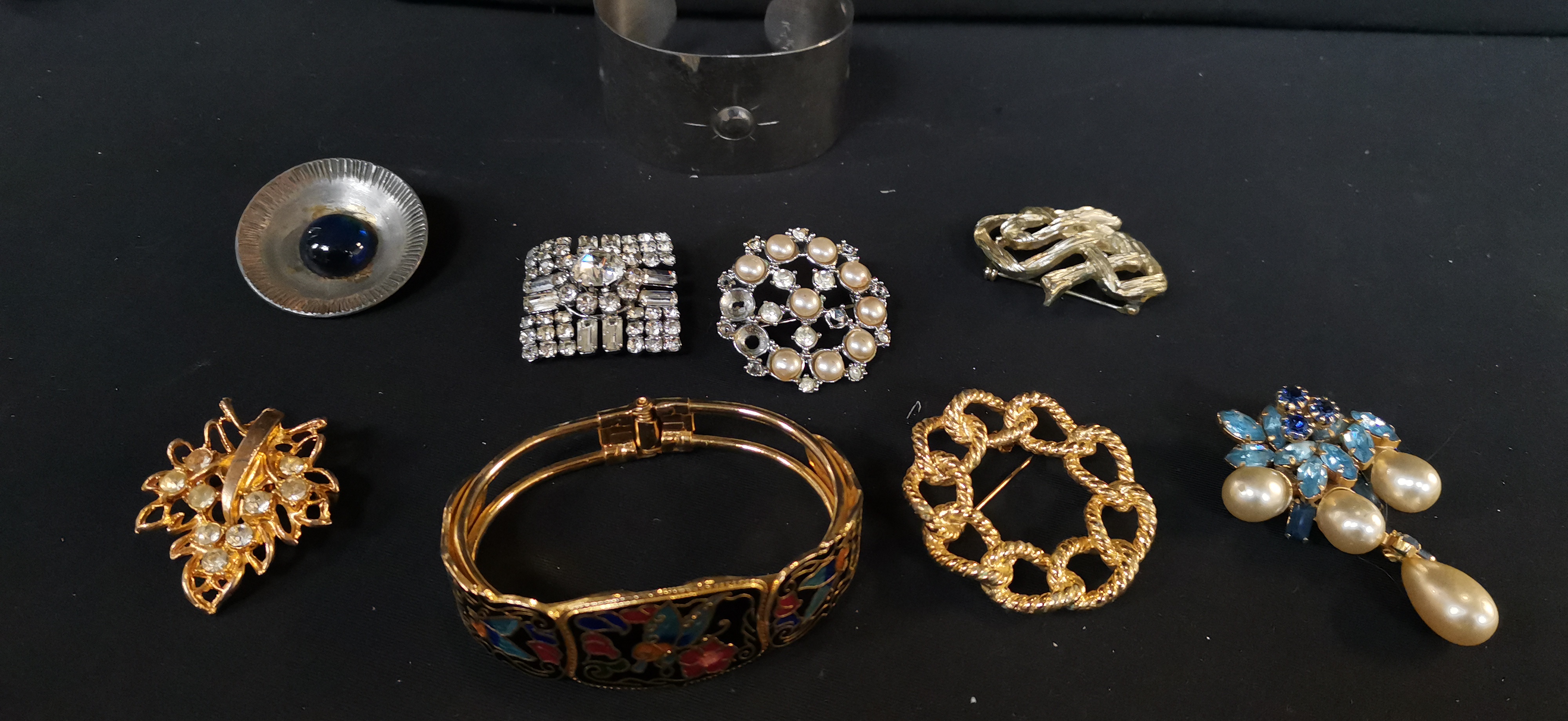 A collection of gold-tone and silver-tone costume jewellery featuring several brooches, two bangles including one with colourful floral enamel, and two pairs of clip-on earrings with faux pearls and rhinestones.