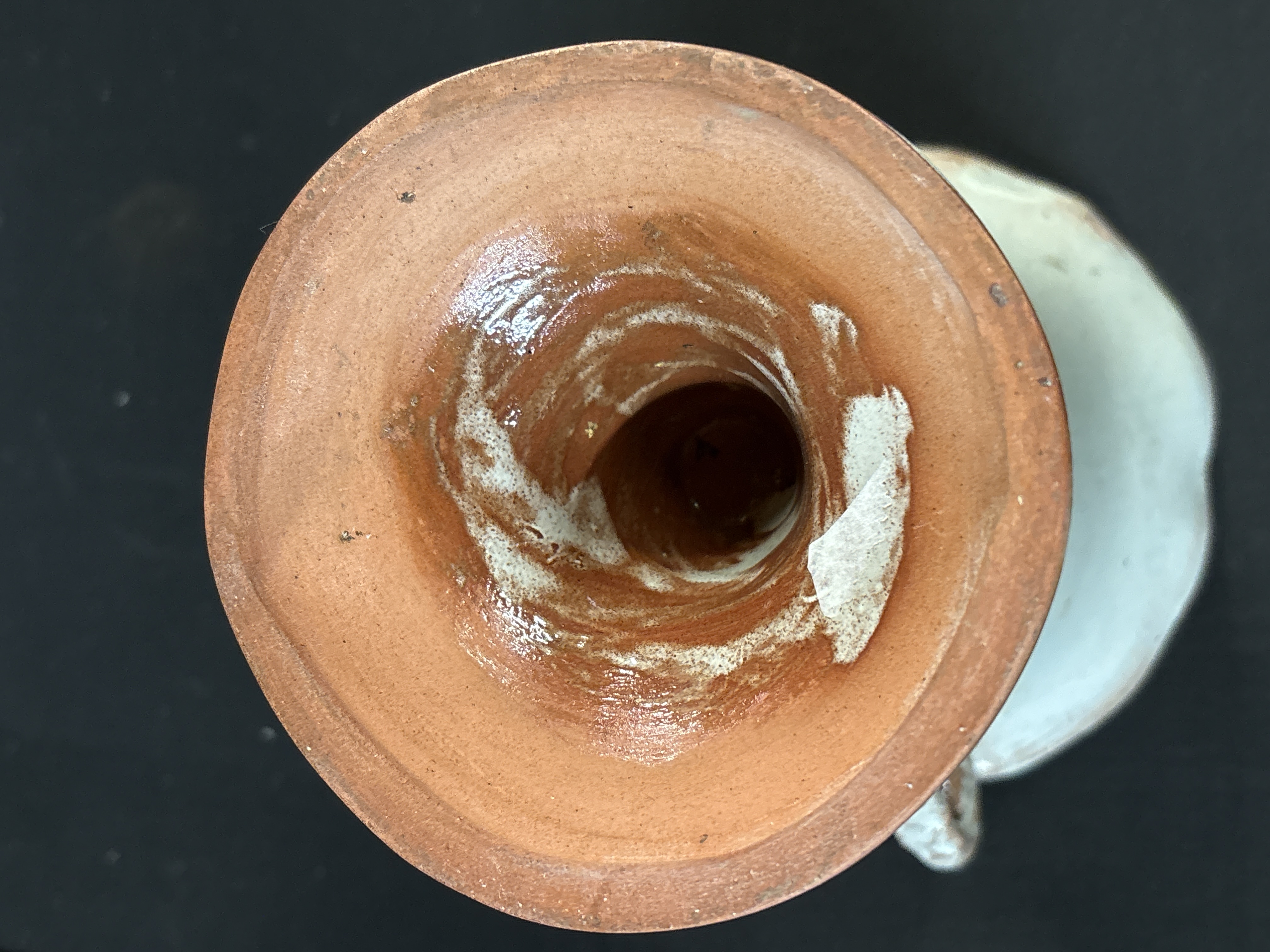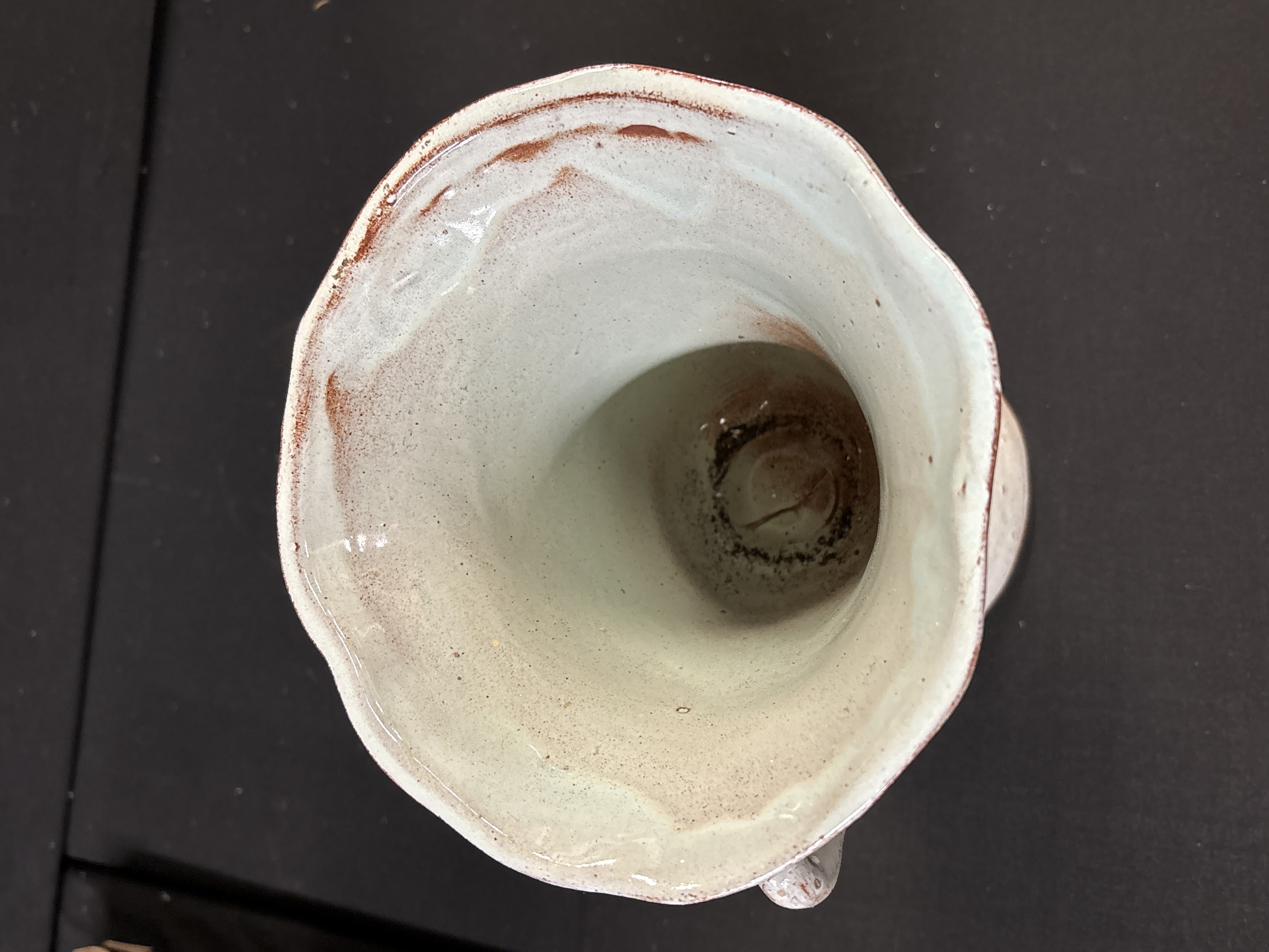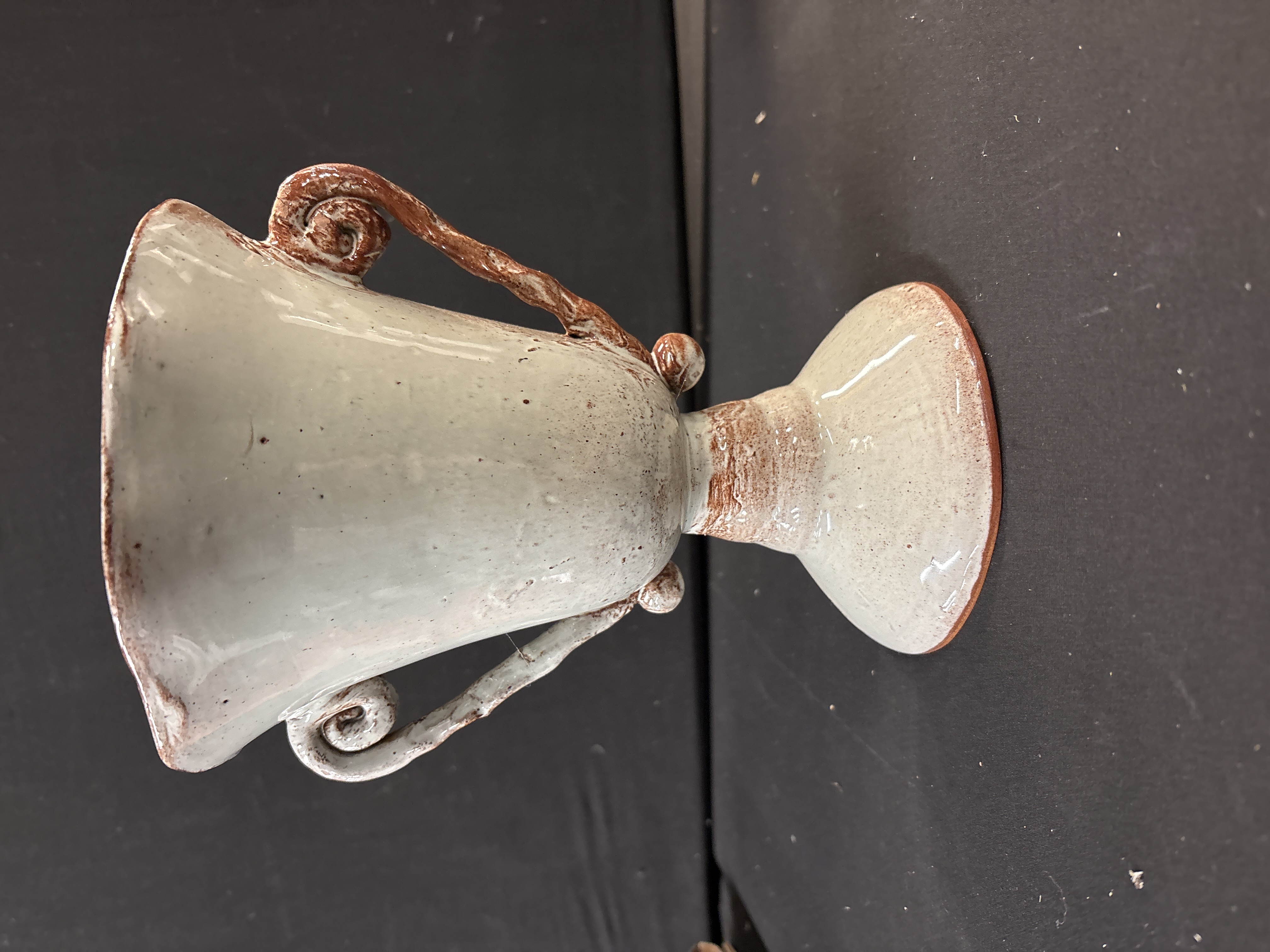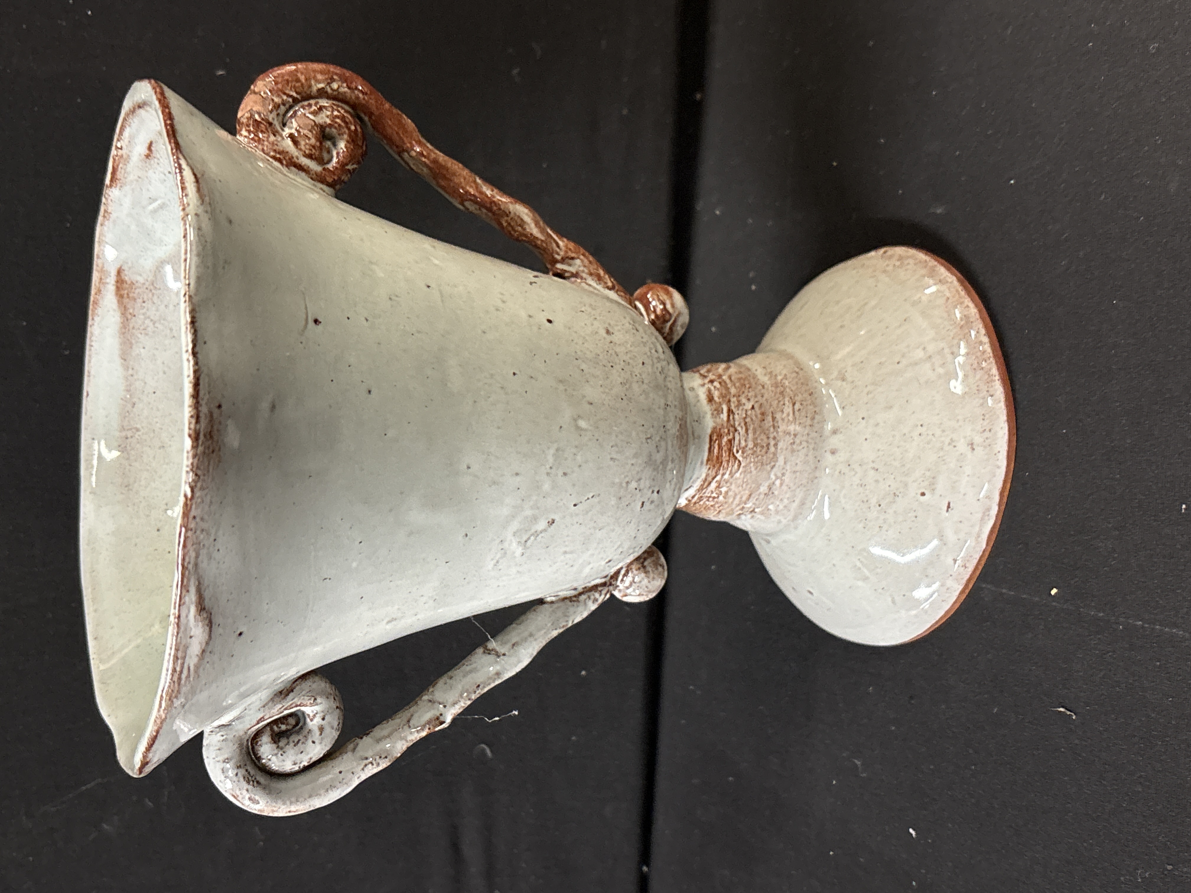 This vintage terracotta vase is attributed to Turkish production, featuring a rustic chalice-like form with a wide, irregular flared rim and a tapering body set upon a spreading pedestal foot. The piece is hand-formed from a reddish-brown earthenware clay, which remains visible on the unglazed base and where the glaze has been applied thinly. The exterior is finished in a thick, speckled off-white or pale grey glaze, applied with an intentional distressed aesthetic that reveals the clay body at the rim, handles, and stem. The vessel is flanked by two scrolling, textured handles. Web research indicates this form and finish are characteristic of vintage Turkish terracotta pottery, often used in rustic or farmhouse interior decor. The surface exhibits characteristic glaze crawling and pitting from the firing process. No maker marks or factory stamps are present on the underside.