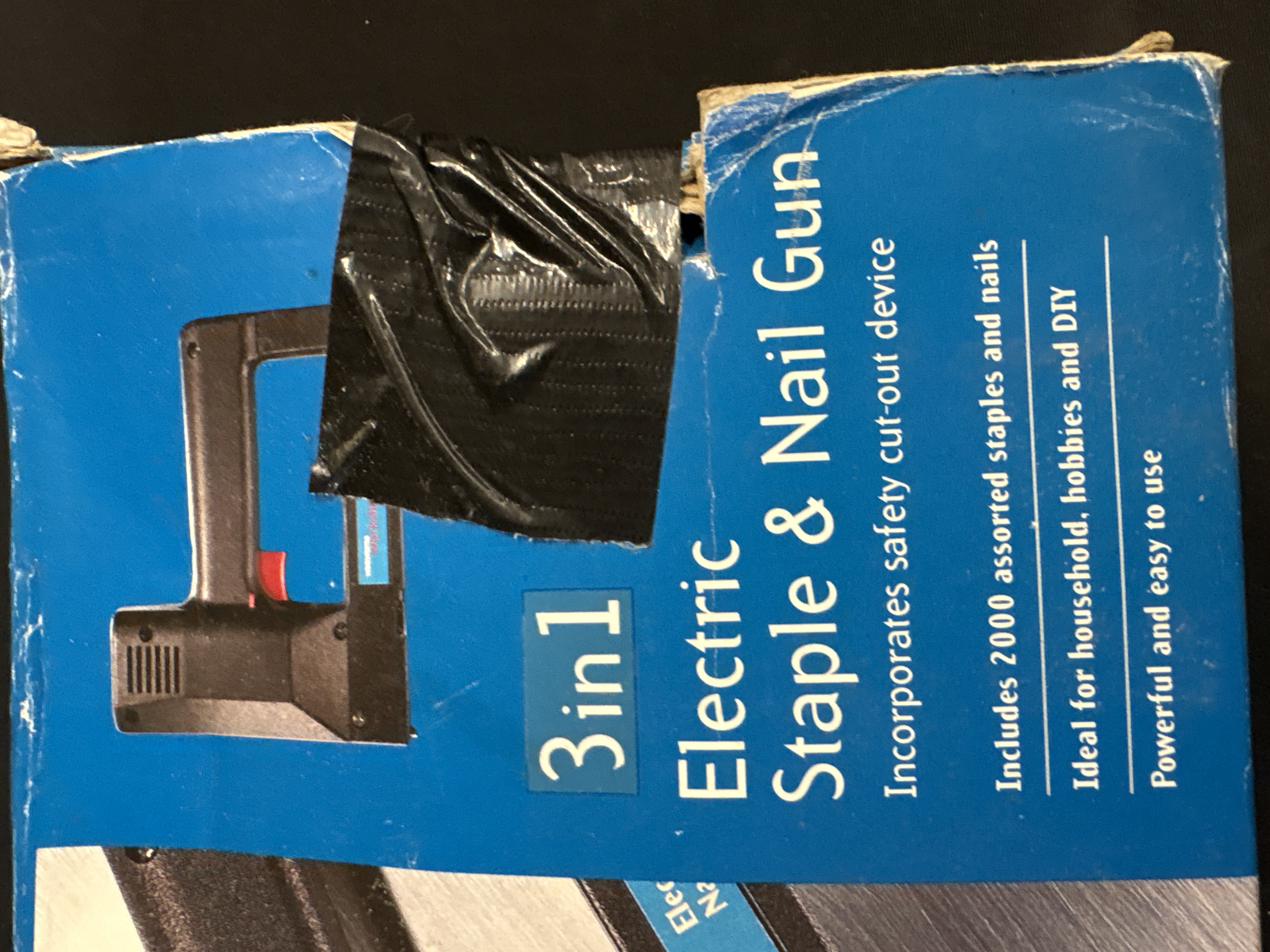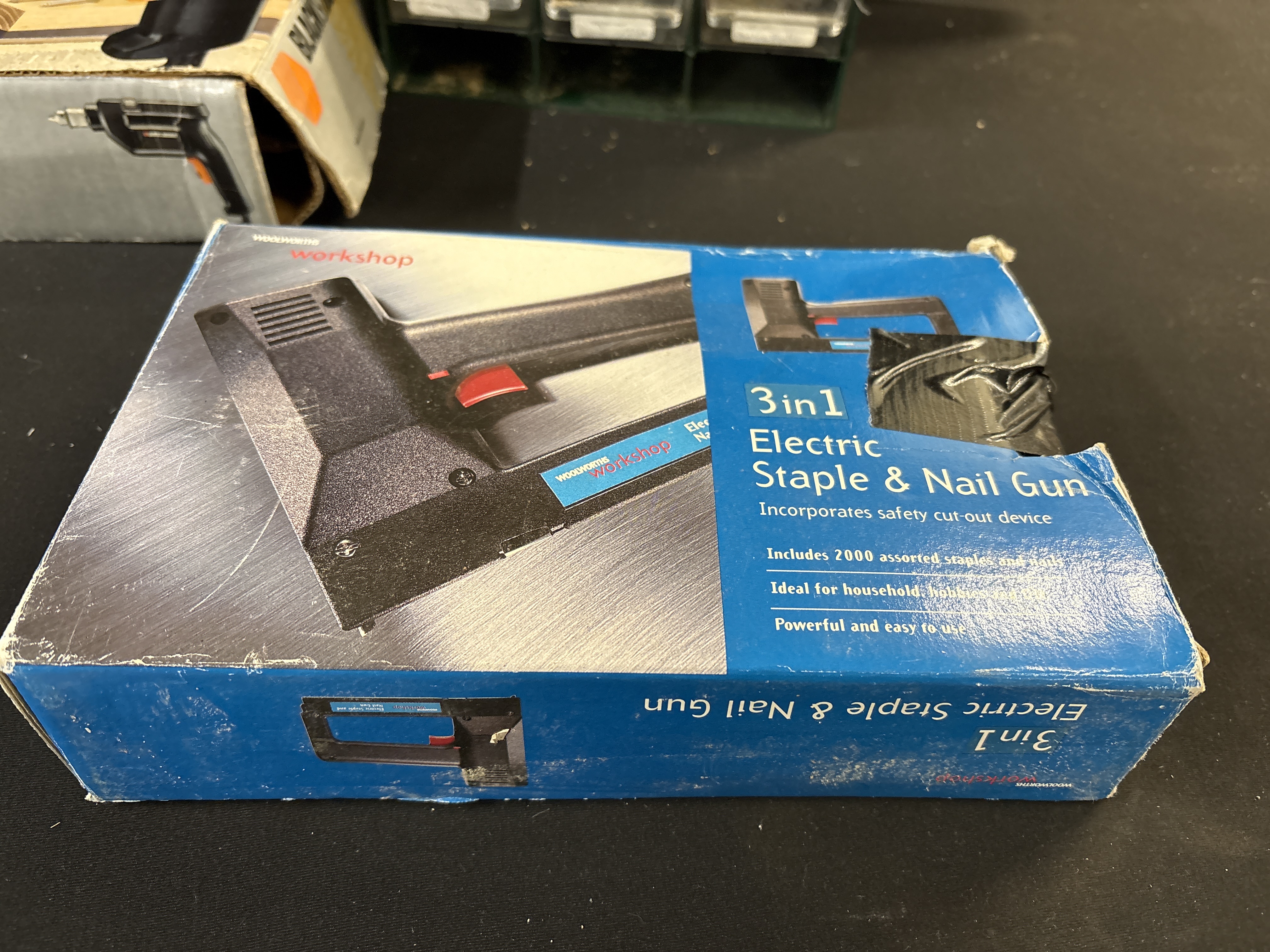A corded 3-in-1 electric staple and nail gun produced for the British retailer Woolworths under the Workshop own-brand label. The tool is constructed from moulded black plastic with a red trigger and safety mechanism. This electronic stapler design is visually similar to the Stanley TRE300 series. The unit features a safety cut-out device and was originally sold with an assortment of 2000 staples and nails as indicated on the packaging. The Woolworths Workshop branding is present on the box and the tool label.