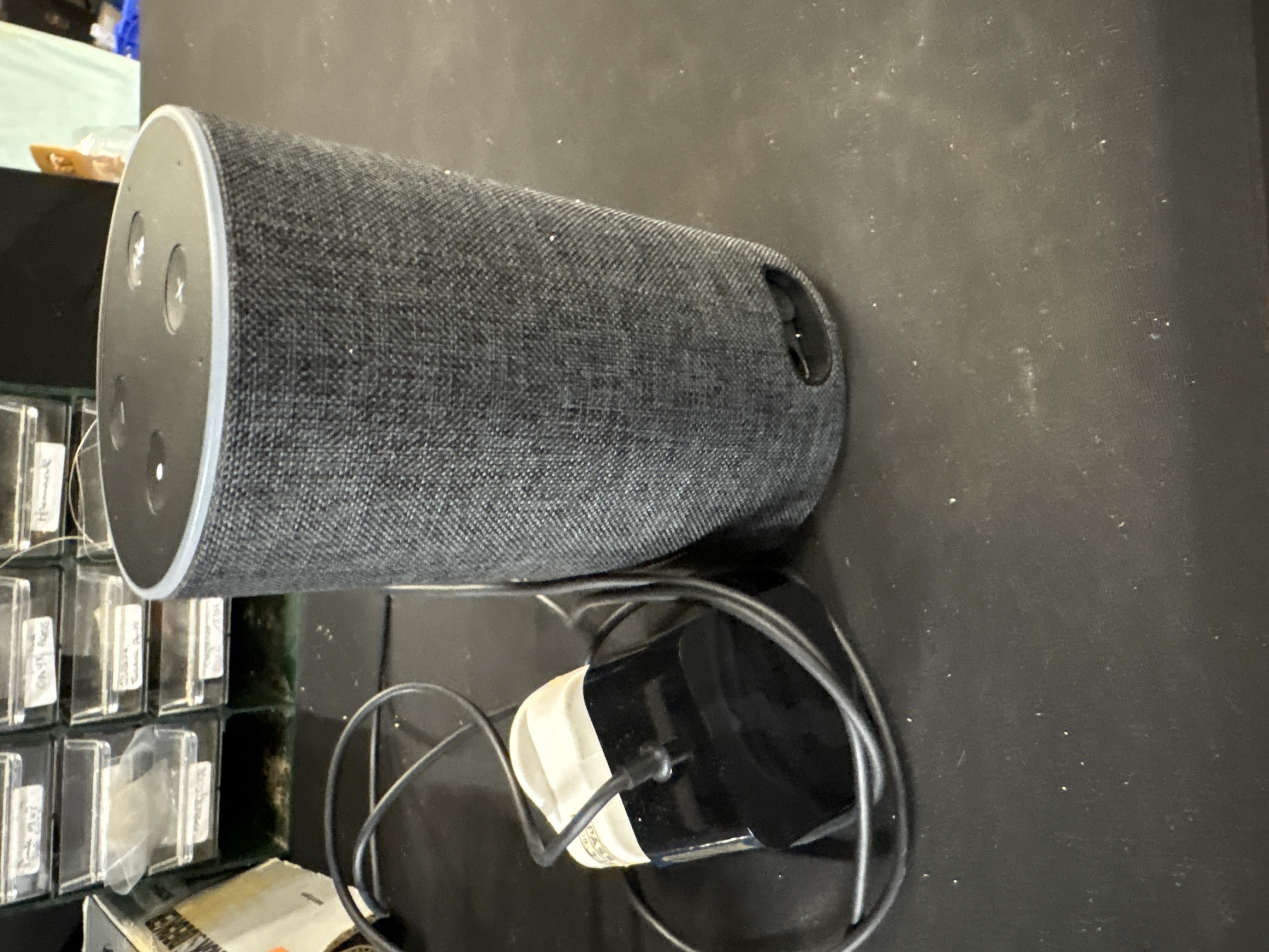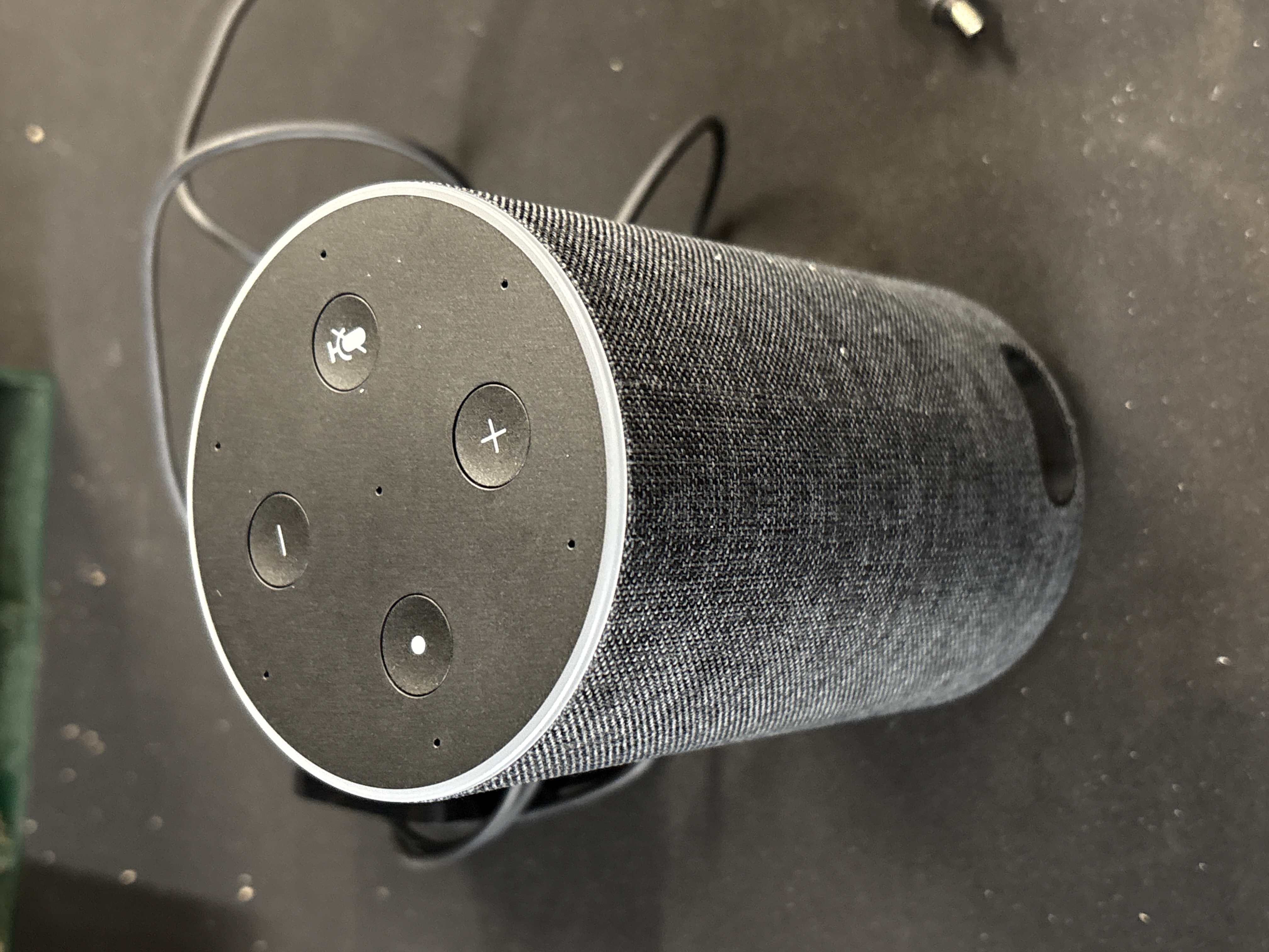 An Amazon Echo (2nd Generation) smart speaker, featuring the Alexa home speaker voice assistant. The device is cylindrical in form with a charcoal-coloured fabric wrap. The top control panel is constructed of black plastic and contains four circular buttons: a microphone mute button, volume up (+), volume down (-), and an action button. Several small apertures for the microphone array are visible on the top surface. The base includes a power input and a 3.5mm auxiliary output. Internal specifications for the processor, RAM, and storage are not specified on the exterior and are not visible. No serial number is visible on the casing. The speaker is accompanied by a black mains power adapter and cable. Data wiping status is unverified.