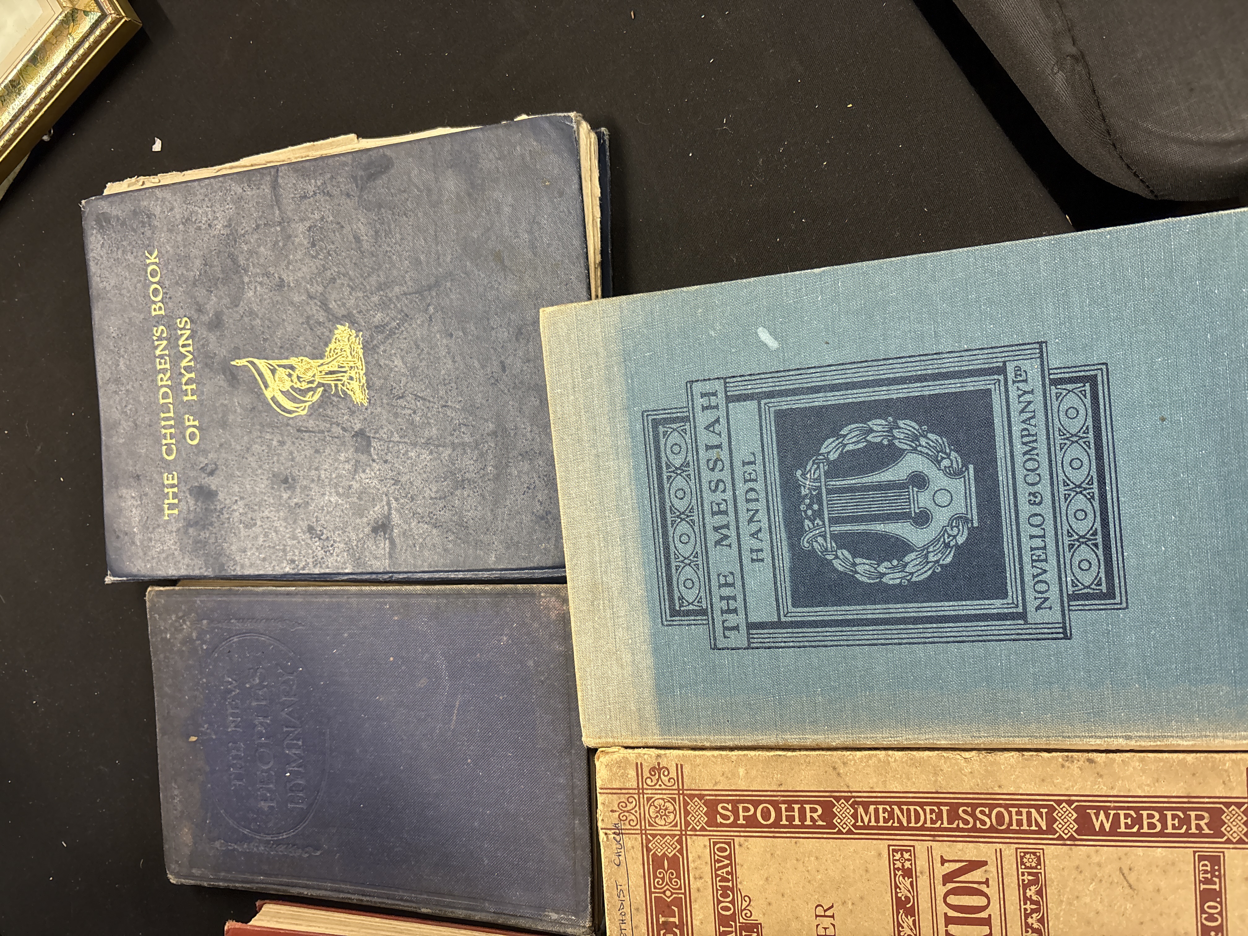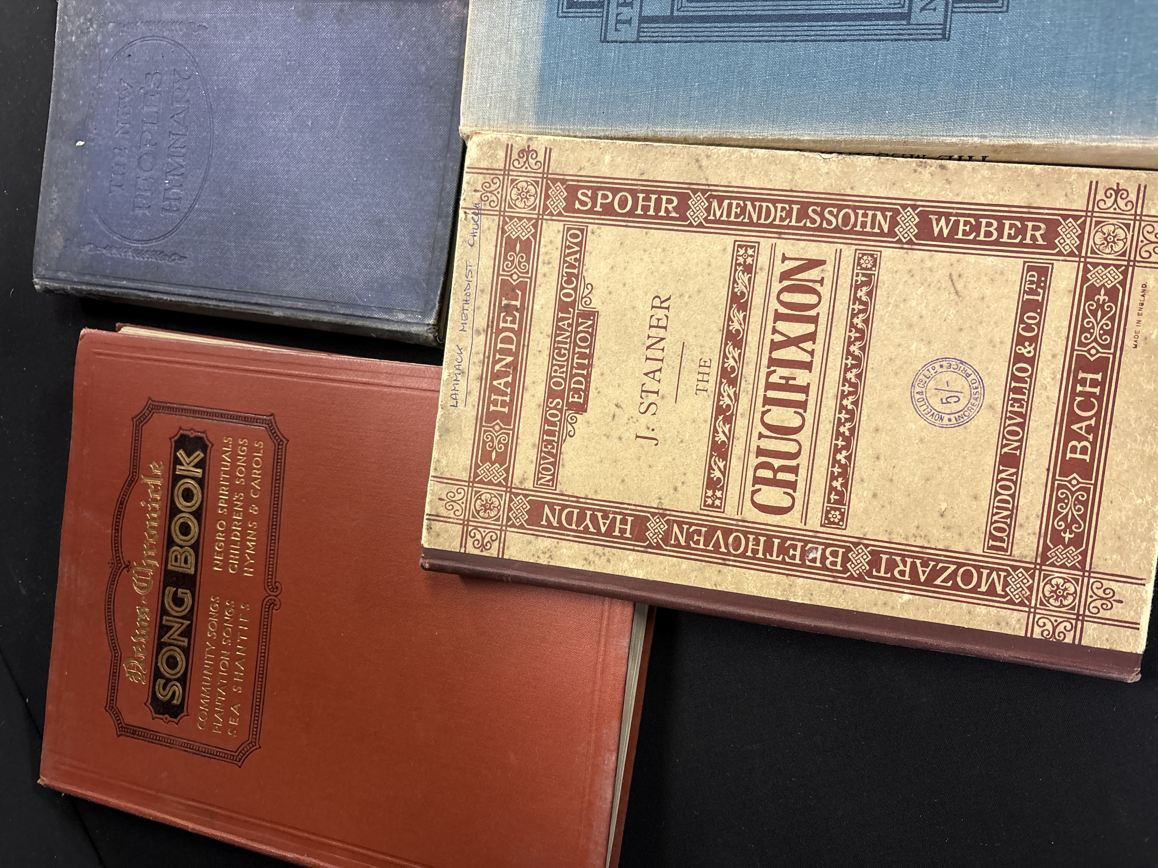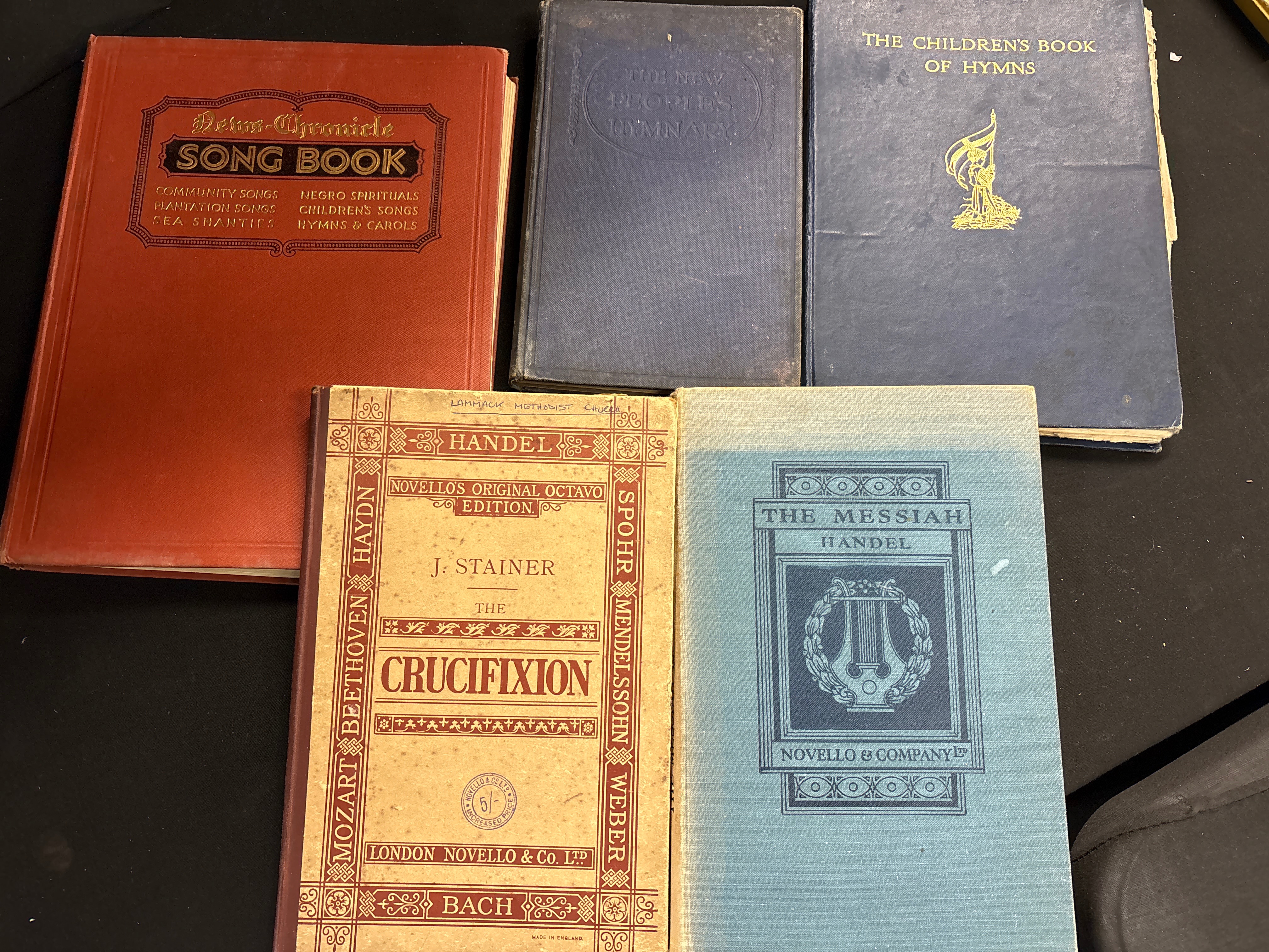A collection of 5 various religious books and music volumes, primarily of British origin. The group includes the News Chronicle Song Book, bound in red cloth and containing sections for community songs, plantation songs, negro spirituals, children’s songs, sea shanties, hymns, and carols. Also present is The New People’s Hymnary in navy blue cloth with embossed lettering, and The Children’s Book of Hymns in blue paper-covered boards featuring a gilt-stamped illustration of a figure with a flag. The collection is completed by two volumes from the Novello’s Original Octavo Edition series: J. Stainer’s The Crucifixion, in tan paper wrappers with a decorative border listing classical composers and bearing a circular Novello & Co Ltd 5/- increased price stamp; and Handel’s The Messiah, bound in light blue cloth-backed boards with a central lyre vignette. The Stainer volume features a handwritten ink inscription at the head of the upper cover reading Lammack Methodist Church. All volumes are in octavo format.