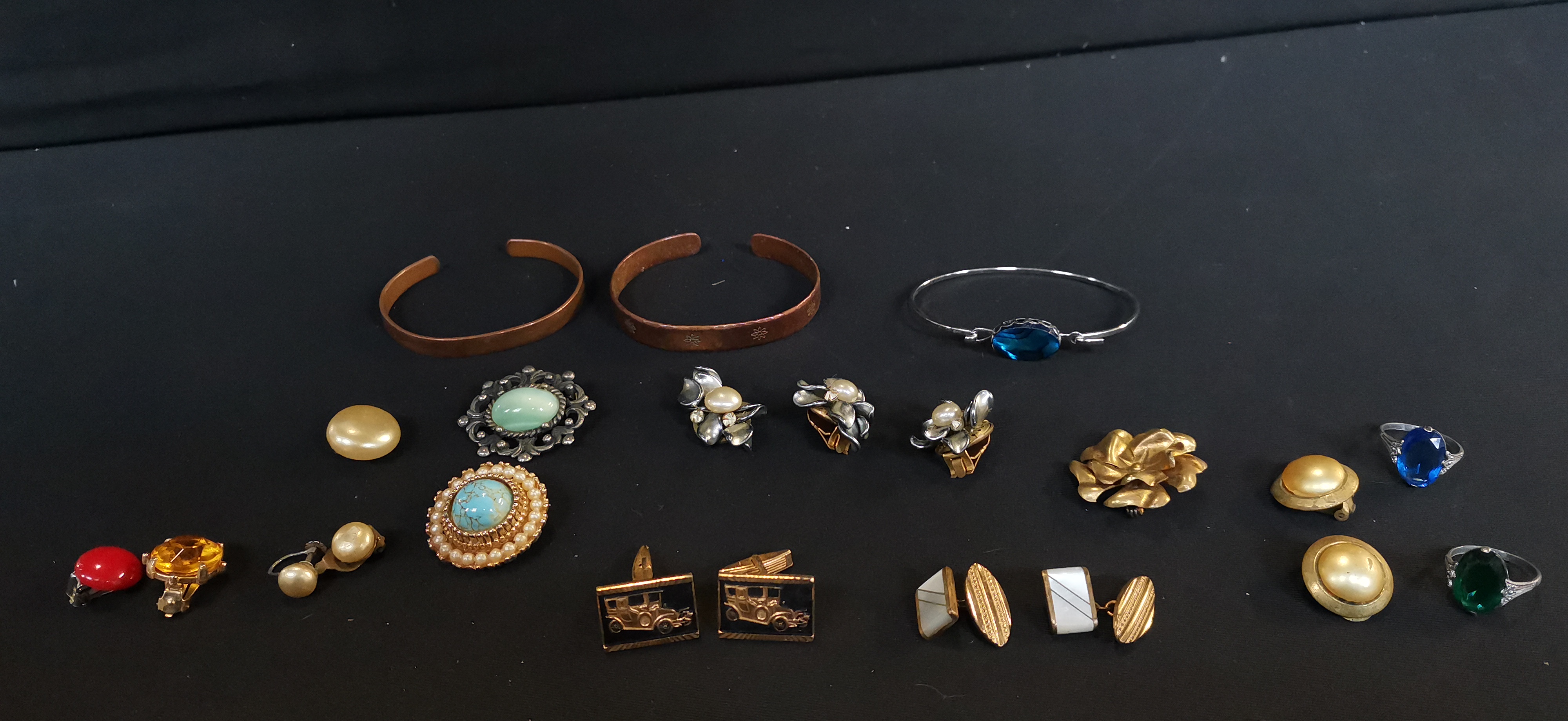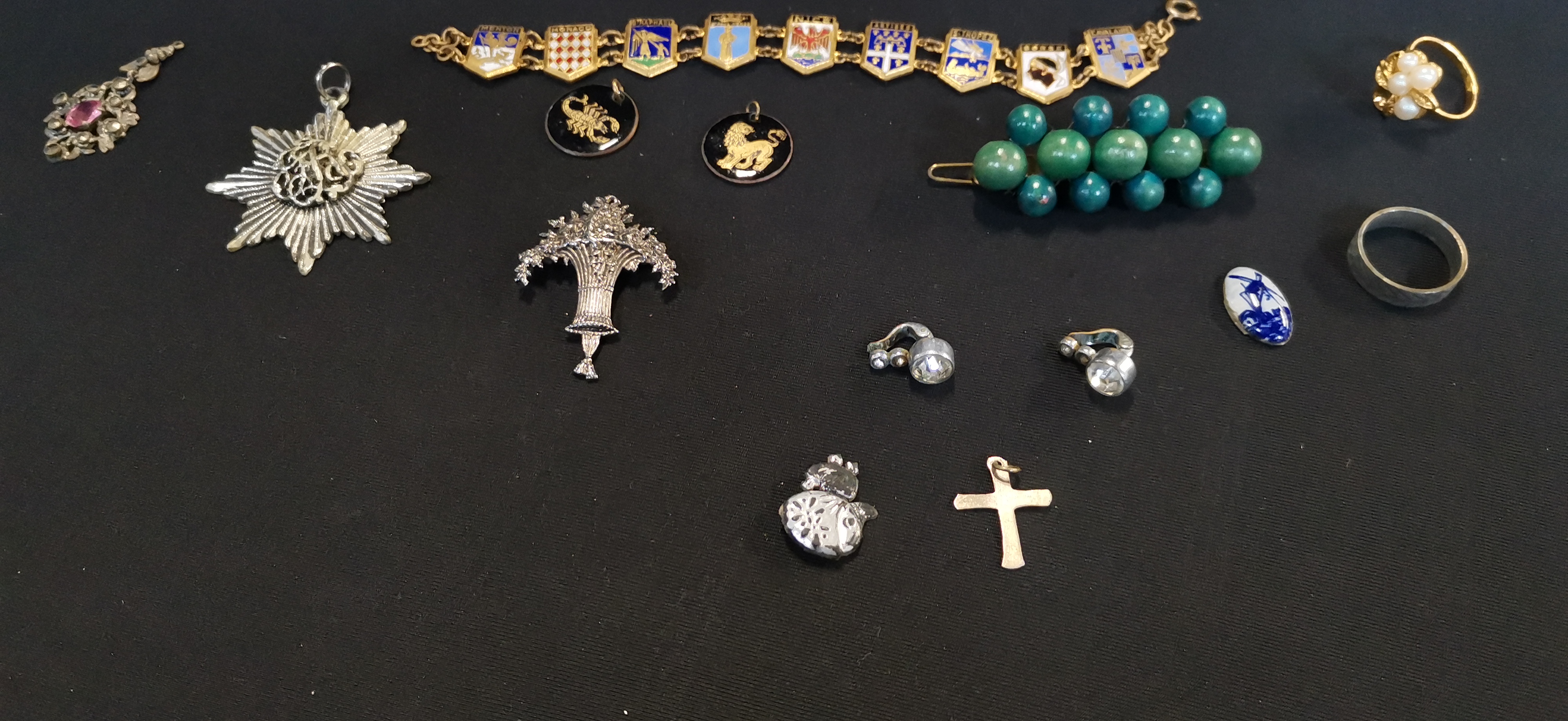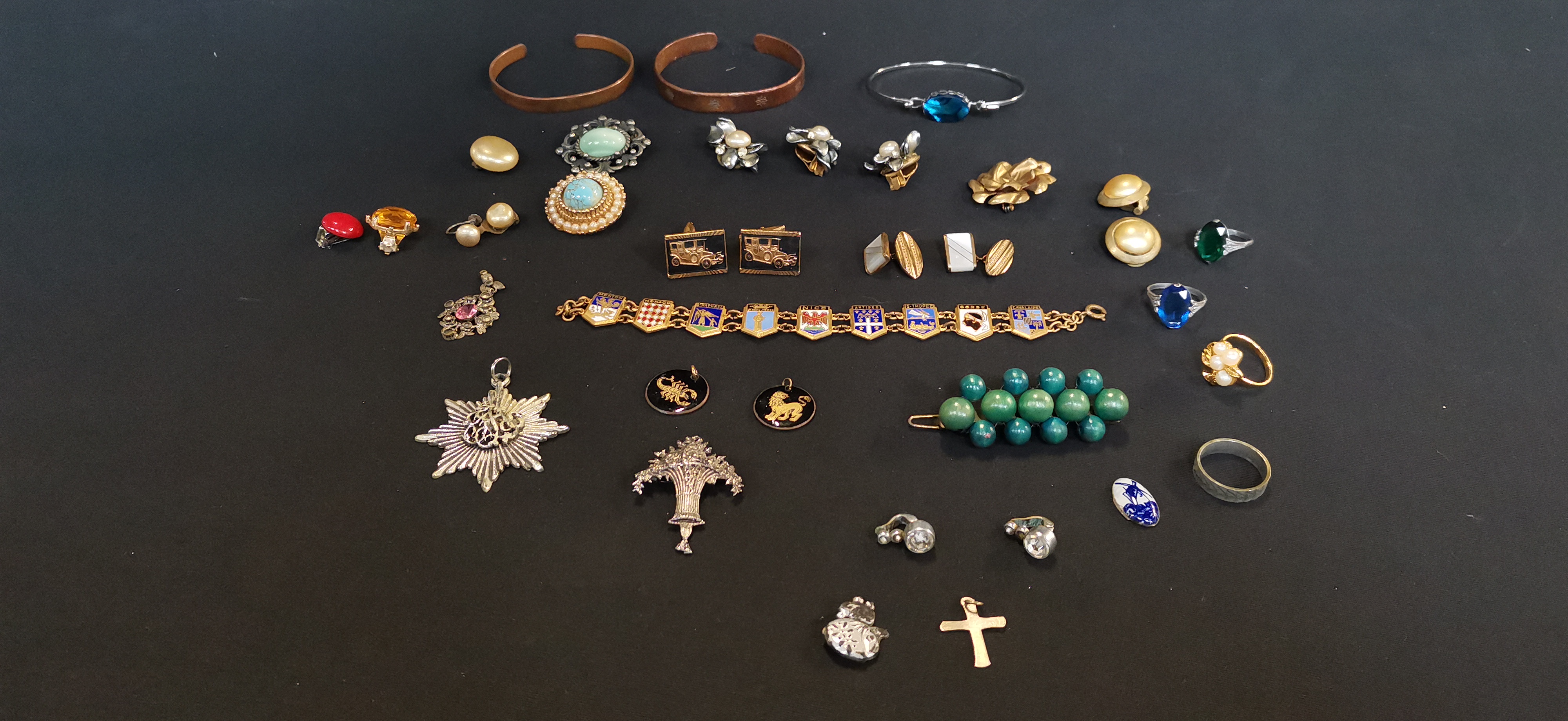 A collection of vintage costume jewellery featuring a gold-toned souvenir bracelet with enamelled shields of French Riviera locations, alongside various rings, clip-on earrings, cufflinks, and pendants in mixed metal finishes.