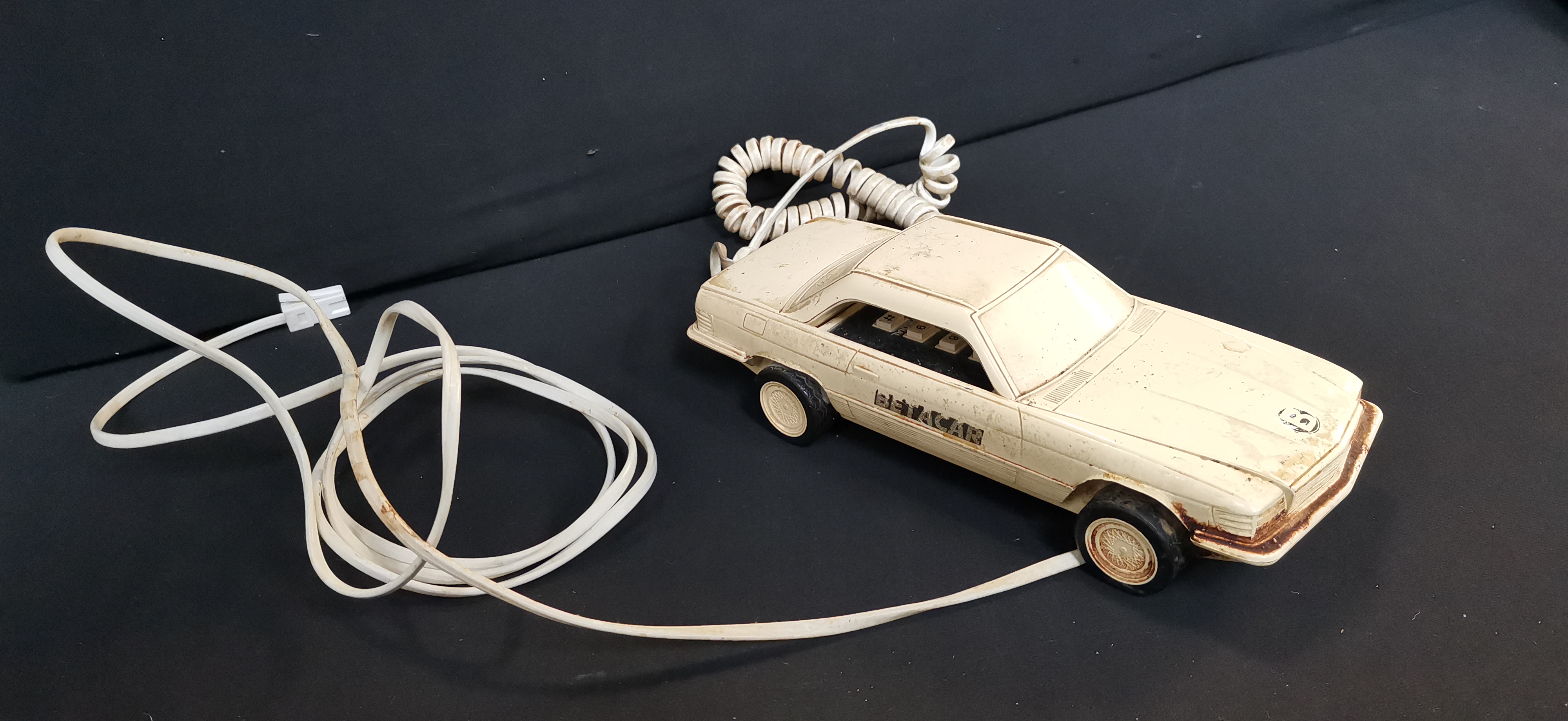 A cream-coloured novelty Betacom car-shaped telephone, model CP/1, featuring the Betacar brand name, push-button keypad, and an 11-87 quality control stamp.
