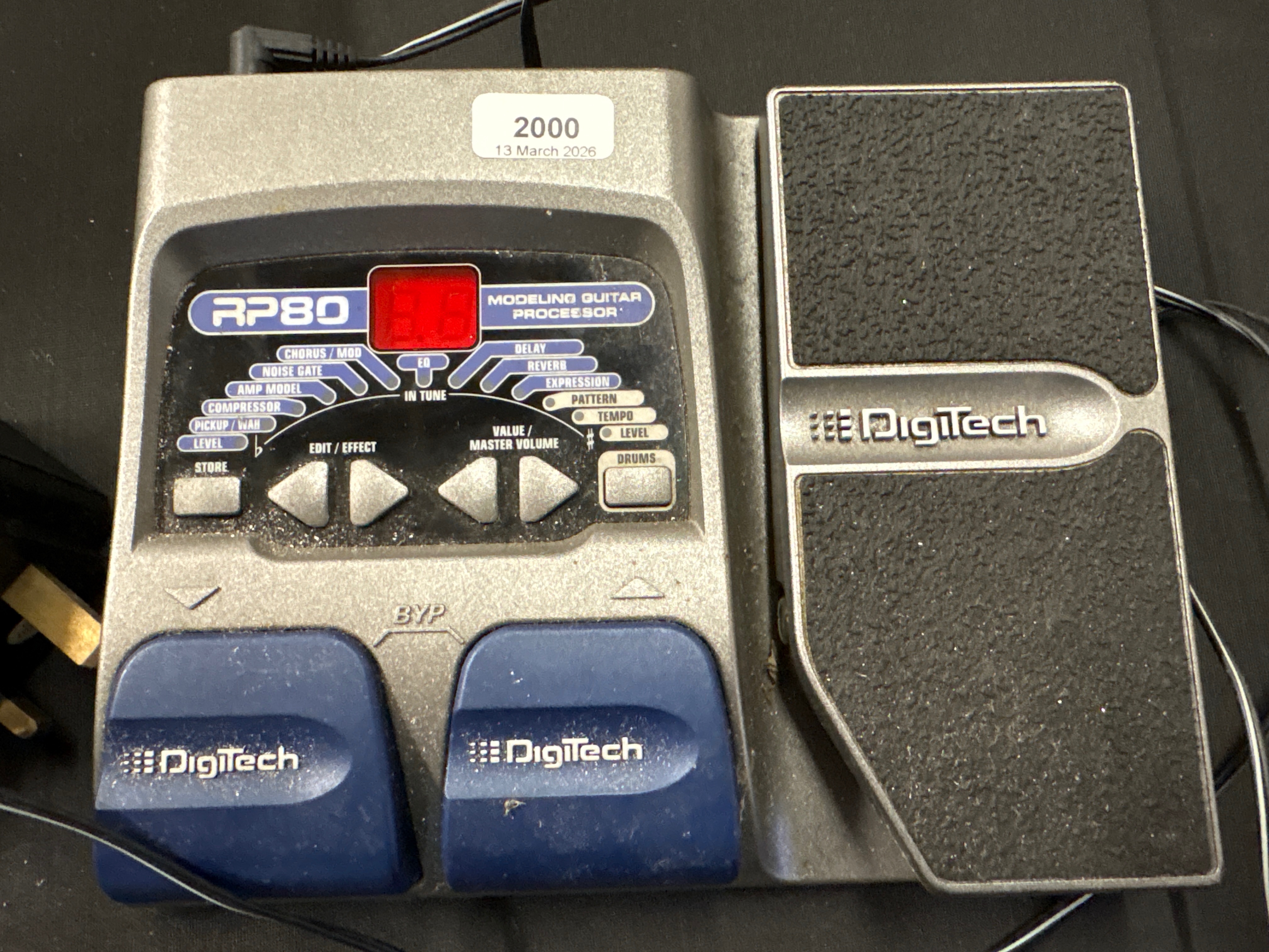 A Digitech RP80 modeling guitar processor and multi-effects pedal. The unit is constructed with a silver-tone moulded plastic housing featuring two blue plastic footswitches and an integrated expression pedal with a textured black rubberised grip surface. The control interface includes a red three-character LED display and four directional buttons for edit/effect and value/master volume, alongside dedicated buttons for store and drums. The processor features a variety of digital effects and functions including chorus/mod, noise gate, amp model, compressor, pickup/wah, level, EQ, delay, reverb, expression, pattern, and tempo. This item is accompanied by a power cable fitted with a standard United Kingdom three-pin plug.
