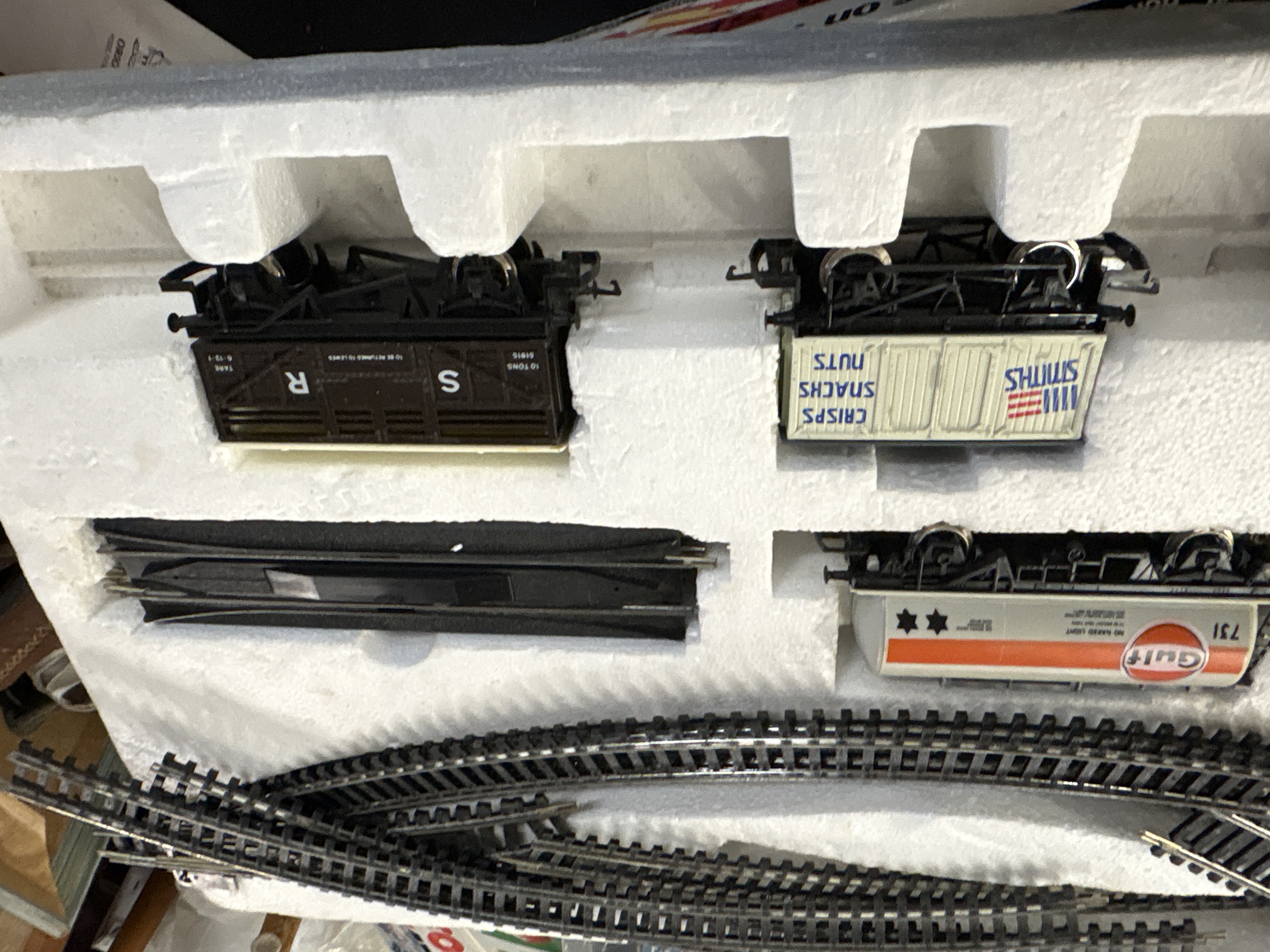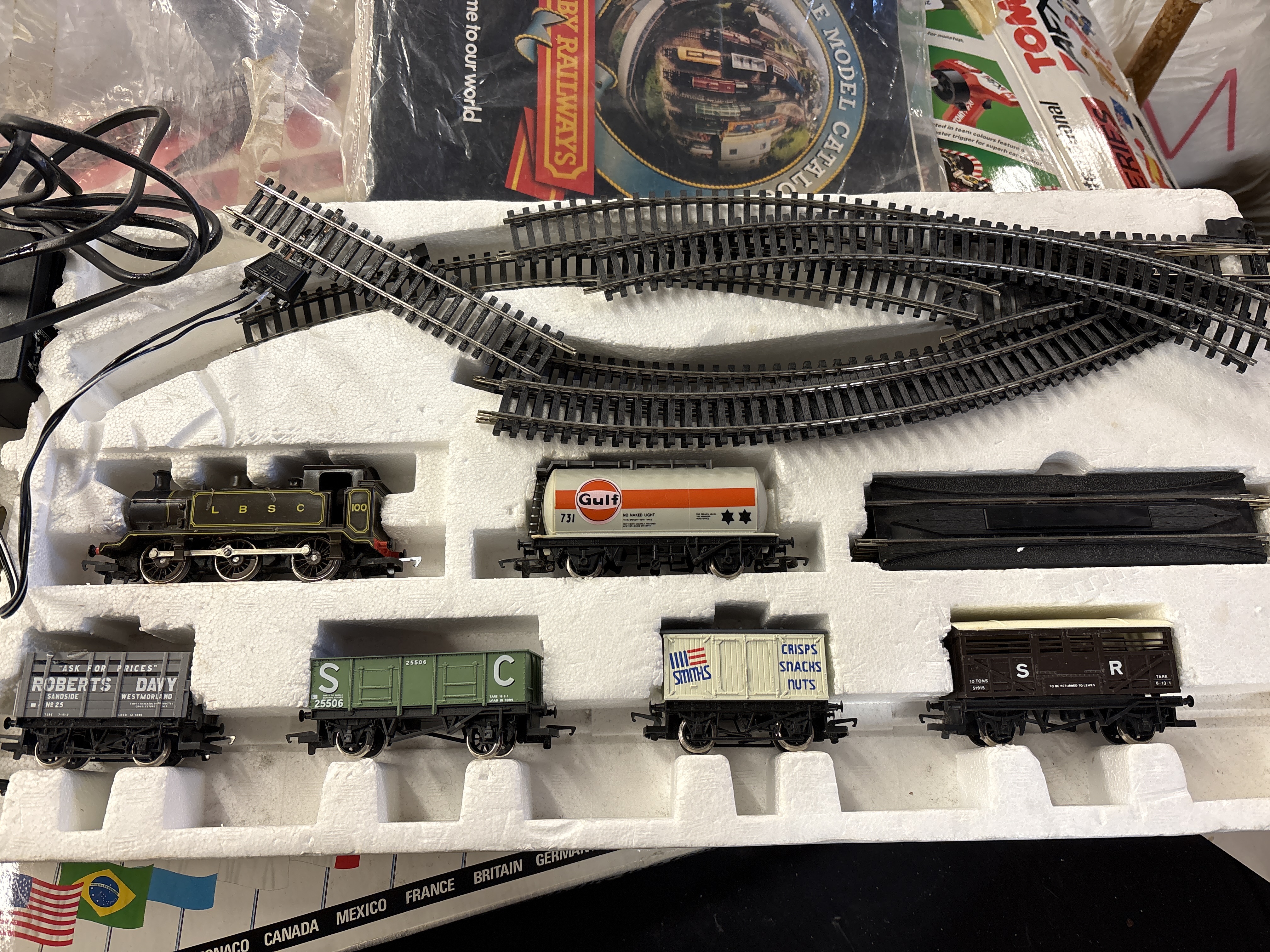 This Hornby Railways OO scale electric model train set features an 0-6-0 tank locomotive and a collection of rolling stock. The locomotive is finished in the brown livery of the London, Brighton and South Coast Railway (LBSC) and bears the running number 100. The set includes several wagons: a white Gulf Oil tanker with orange band and logo (numbered 731), a cream Smiths Crisps box van, a brown Southern Railway (SR) 10-ton goods van (numbered 51915), a green open wagon (numbered SC 25506), and a grey open wagon for Roberts Davy Sandside Westmorland (numbered 25). The components are constructed with plastic bodies, die-cast metal chassis elements, and metal wheels. Included accessories consist of a quantity of curved and straight track sections, one right-hand point, a black plastic re-railer ramp, a power connecting clip with wiring, and a Hornby Railways catalogue. The items are housed in a moulded white polystyrene inner packaging tray.