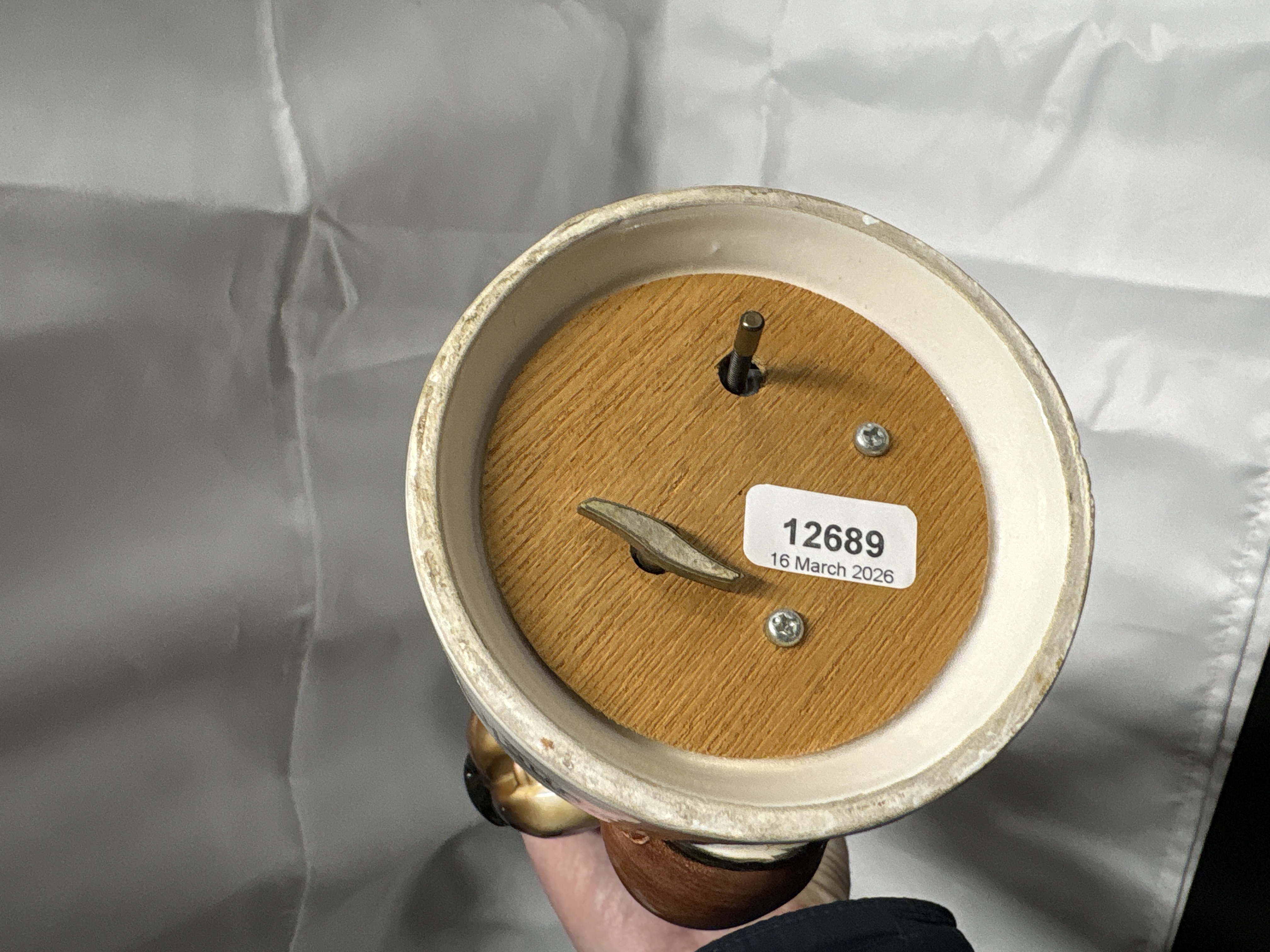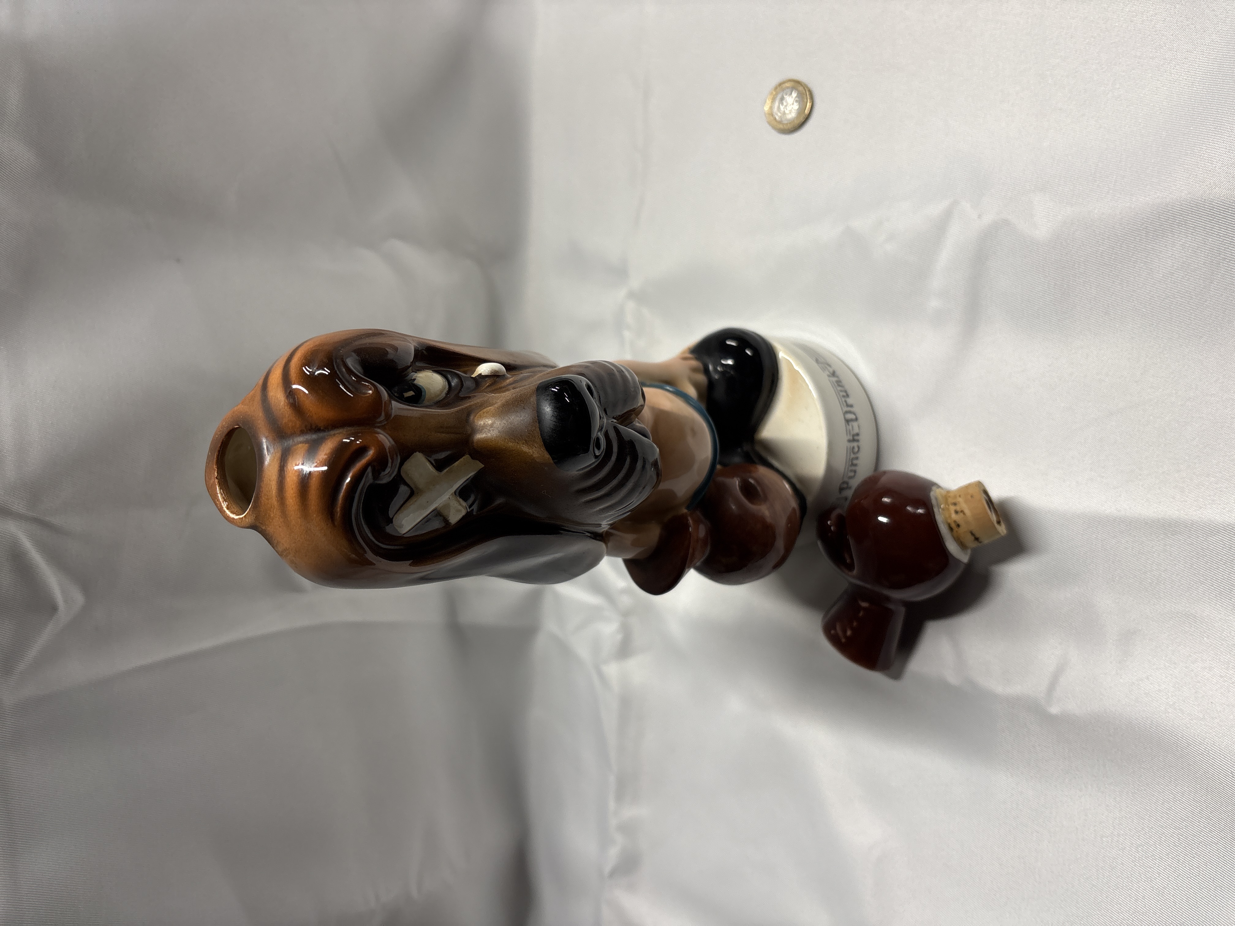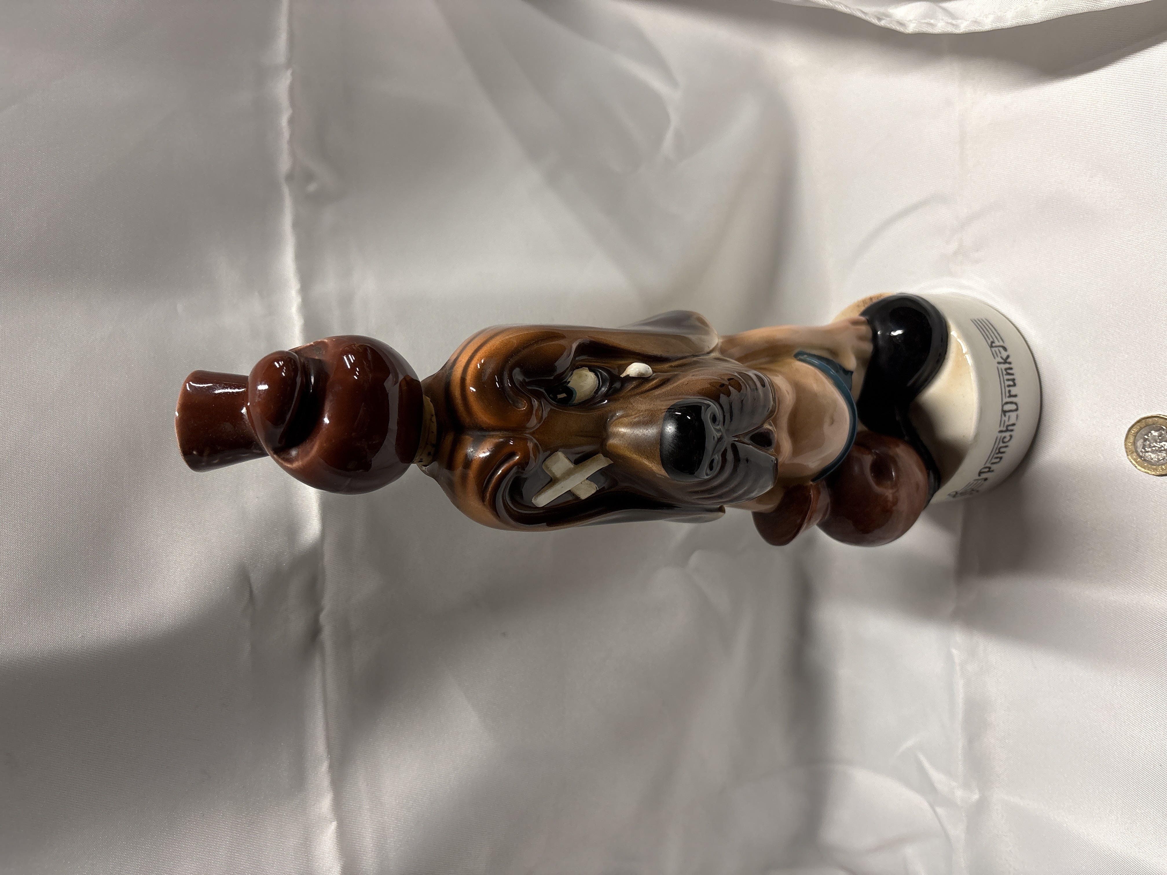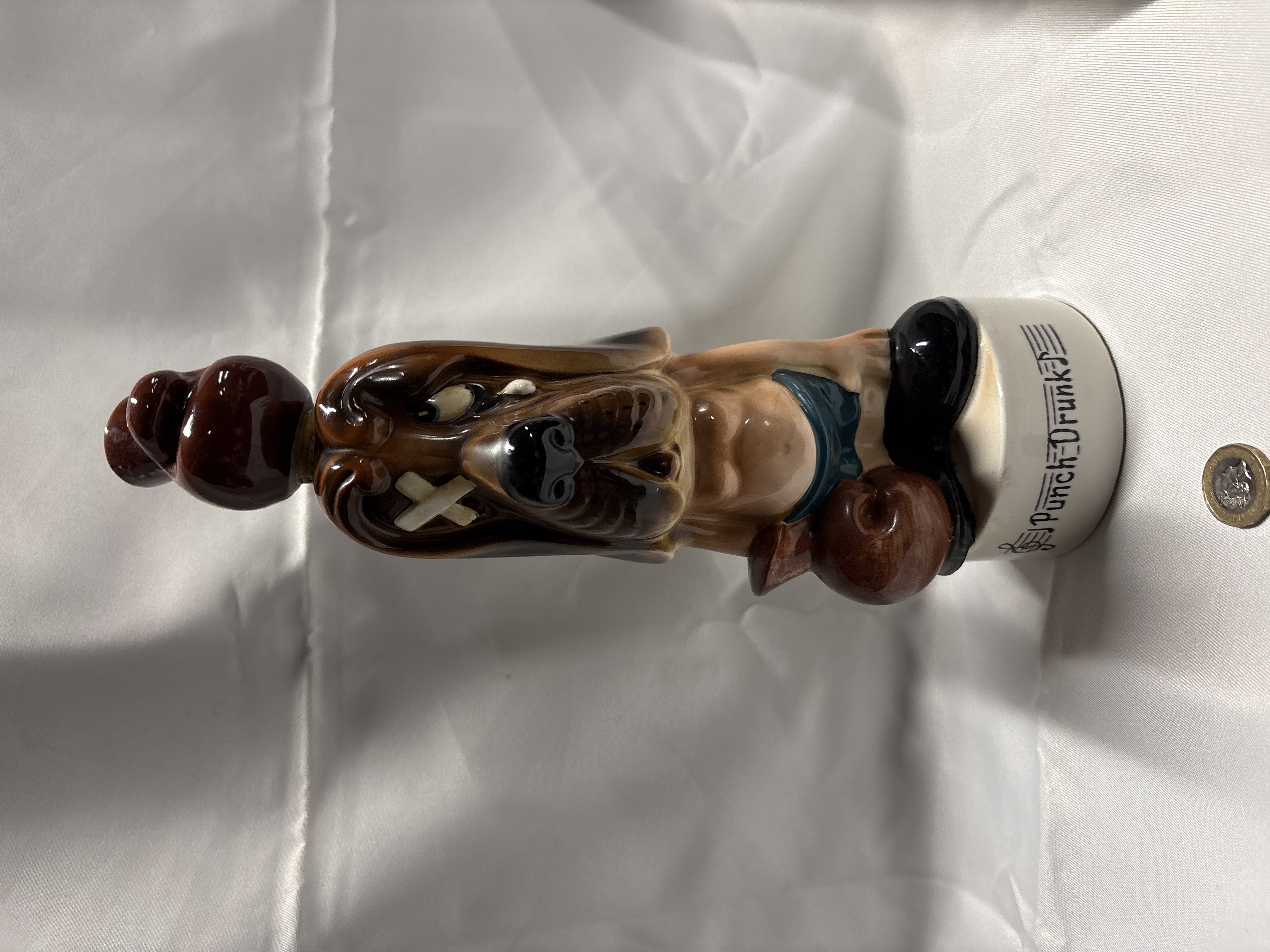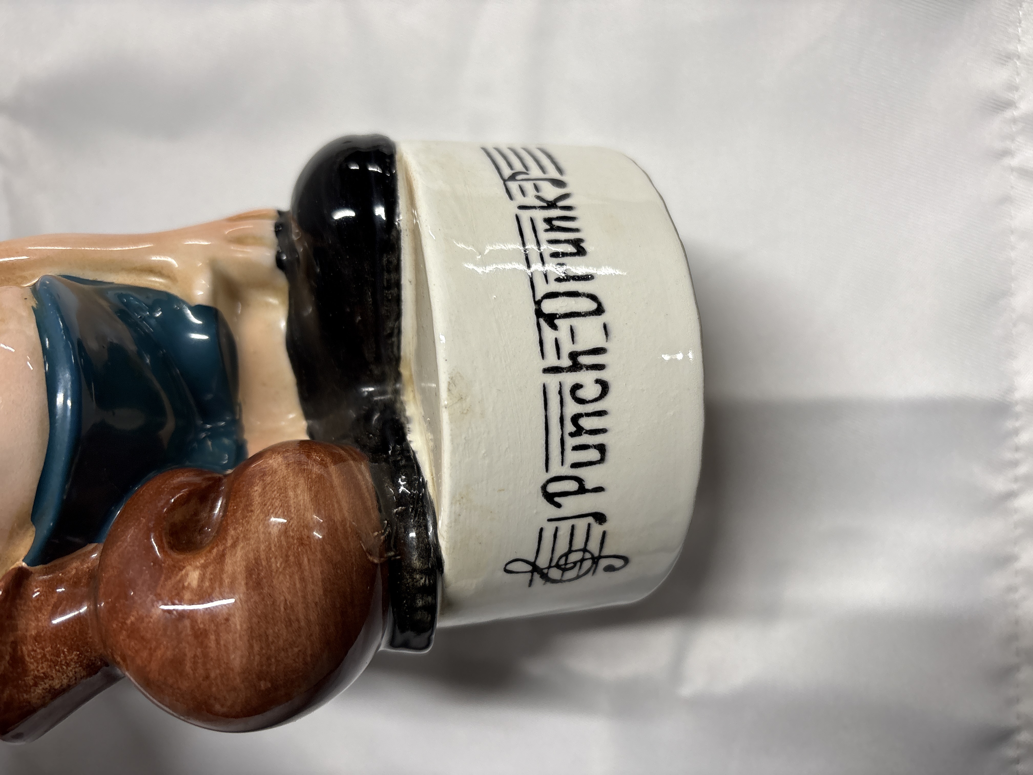 A mid-20th-century novelty musical ceramic decanter, attributed to the style of Bond Ware. The piece is modelled as a caricature of a punch-drunk hound dog boxer, featuring a swollen face and a white X patch over one eye. The figure is depicted wearing brown boxing gloves and teal trunks. The decanter is constructed from glazed ceramic in shades of brown, tan, and black. It includes a removable head stopper with a cork seal. The base contains a musical movement housed behind a wooden circular panel secured with two screws. The underside features a metal winding key and a metal pull-pin to operate the music. The side of the white circular base is decorated with a treble clef and the title Punch-Drunk on musical staff lines. A white rectangular auction label with the characters 12689 and 16 March 2026 is adhered to the wooden base.