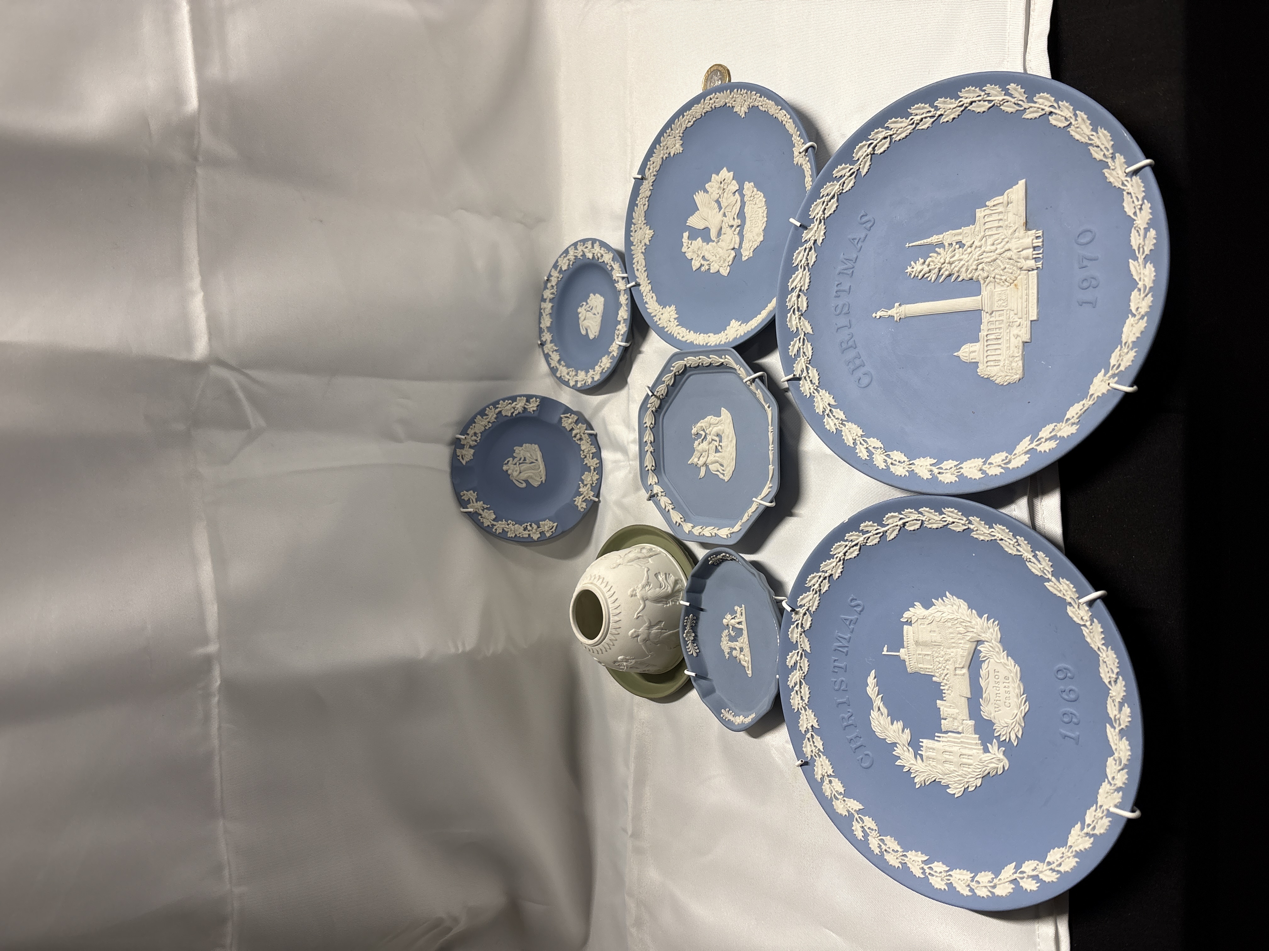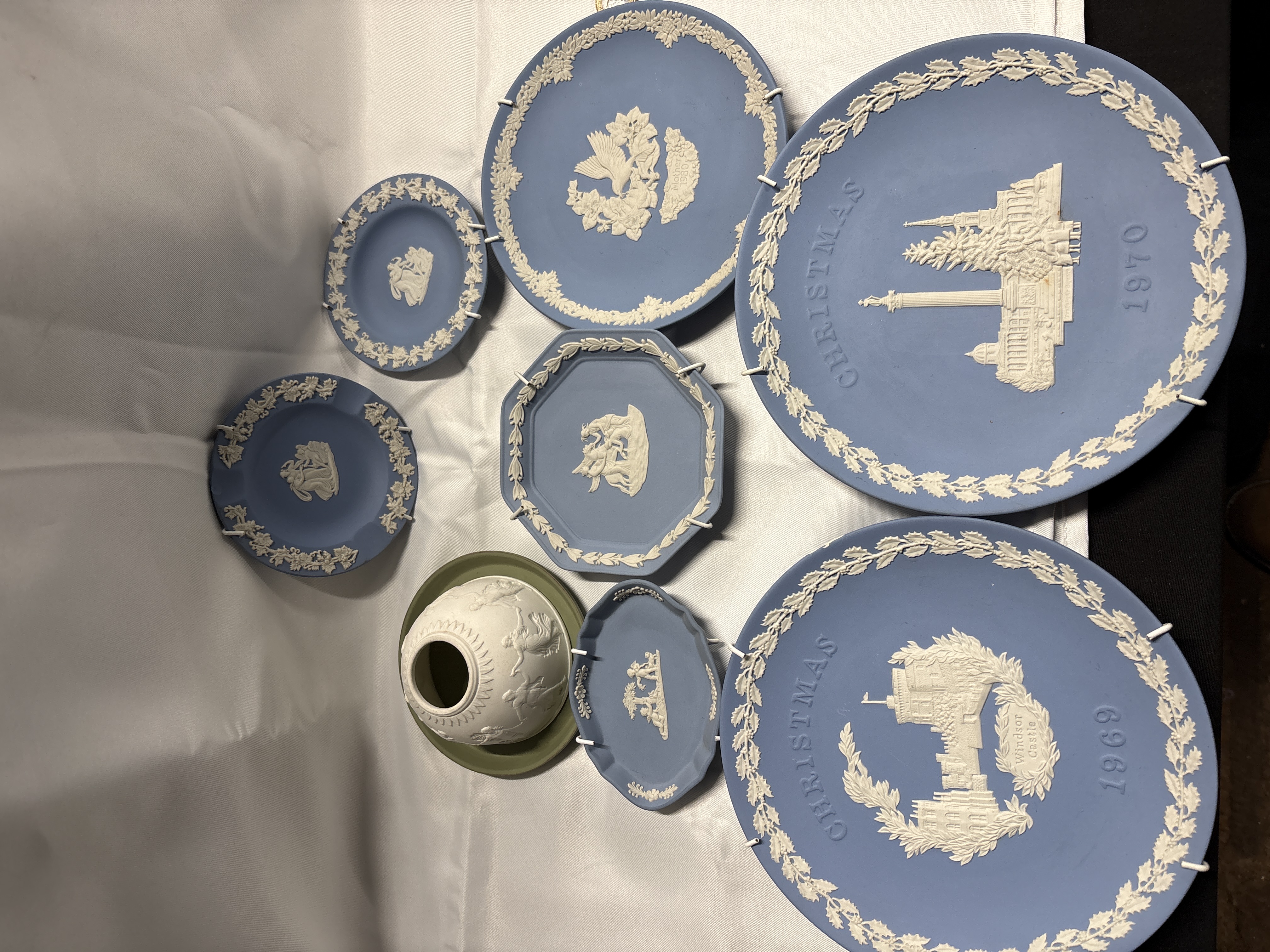 A collection of Wedgwood blue and white Jasperware ceramics, featuring unglazed stoneware bodies with applied white sprigged bas-relief decoration in the Neoclassical style. The group includes several commemorative plates, notably the 1969 Christmas plate depicting Windsor Castle, the 1970 Christmas plate featuring the Albert Memorial, and a 1980 Mother plate. The assortment further comprises various pin dishes in circular, octagonal, and oval forms with classical figural and floral motifs, alongside a small white pot on a green Jasperware base. The reverse of the items bears the incised mark WEDGWOOD MADE IN ENGLAND. Several plates are fitted with wire wall hangers.