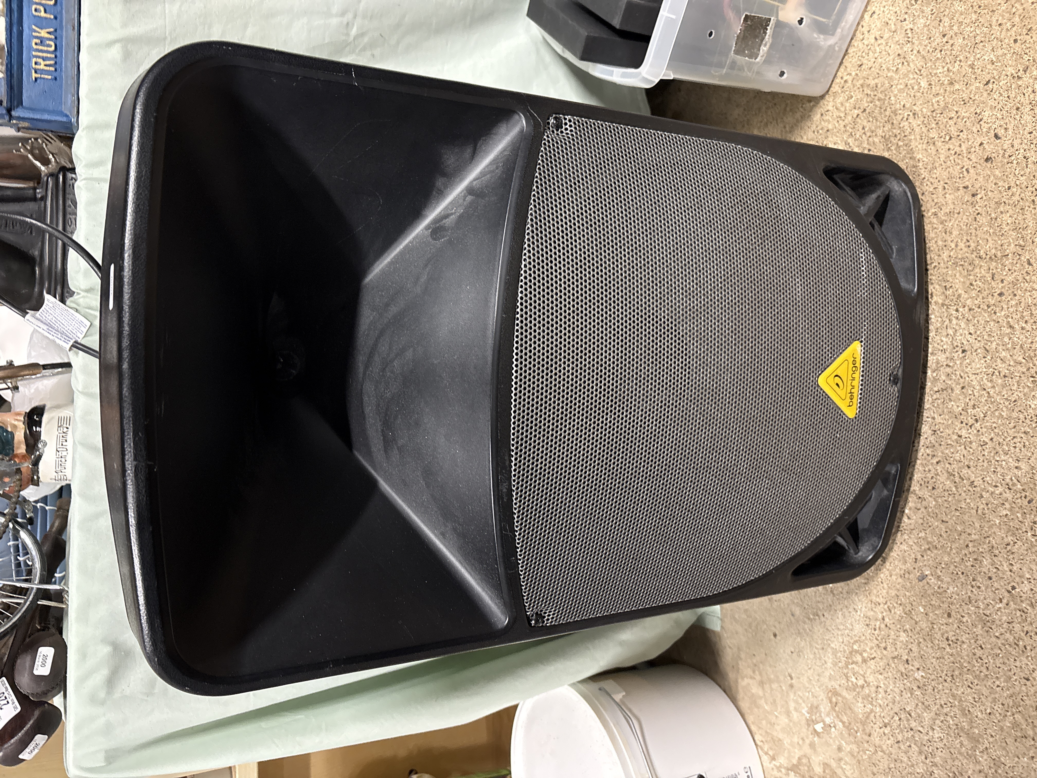 A Behringer Eurolive B115D active two-way PA speaker system. The unit features a moulded black composite cabinet designed for professional audio applications. It is equipped with a large integrated high-frequency horn positioned above a woofer, which is protected by a perforated metal grille. The cabinet includes an integrated carry handle on the side for transport. A power cable is included with the unit. The manufacturer name is displayed on a yellow triangular badge on the front grille.