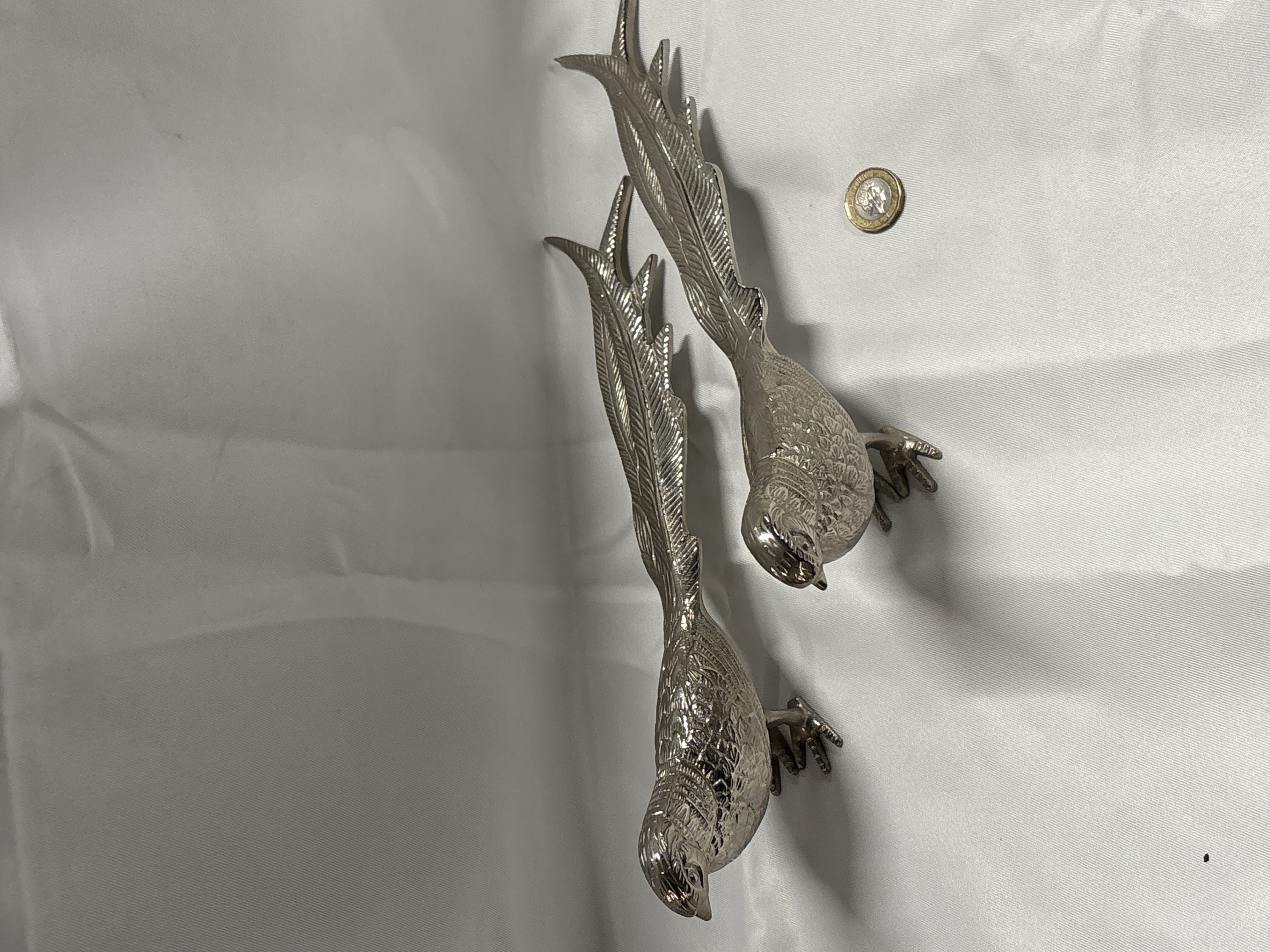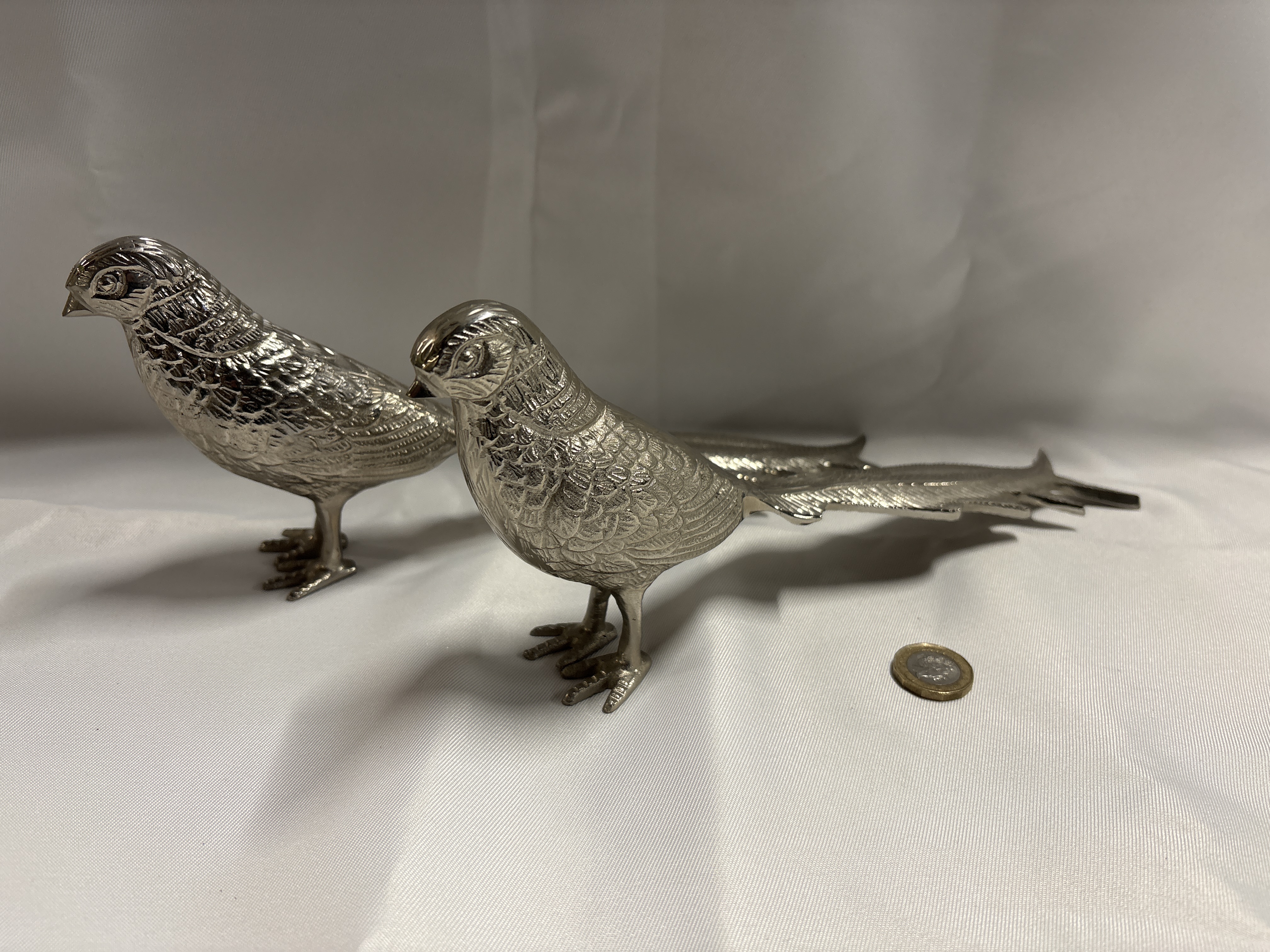 A pair of naturalistically cast bird figurines depicting pheasants, designed as decorative table ornaments. The figurines are made of cast white metal with a bright, polished silver-coloured finish, characteristic of silver plate. Each bird is depicted in a standing pose with long, tapering tail feathers and detailed, textured chasing across the bodies to represent plumage. One bird is posed with its head turned slightly to the left, while the other is turned to the right. The style is consistent with mid-20th-century European, specifically German, silver-plated table ornaments. No marks, characters, or symbols are visible on the figurines.