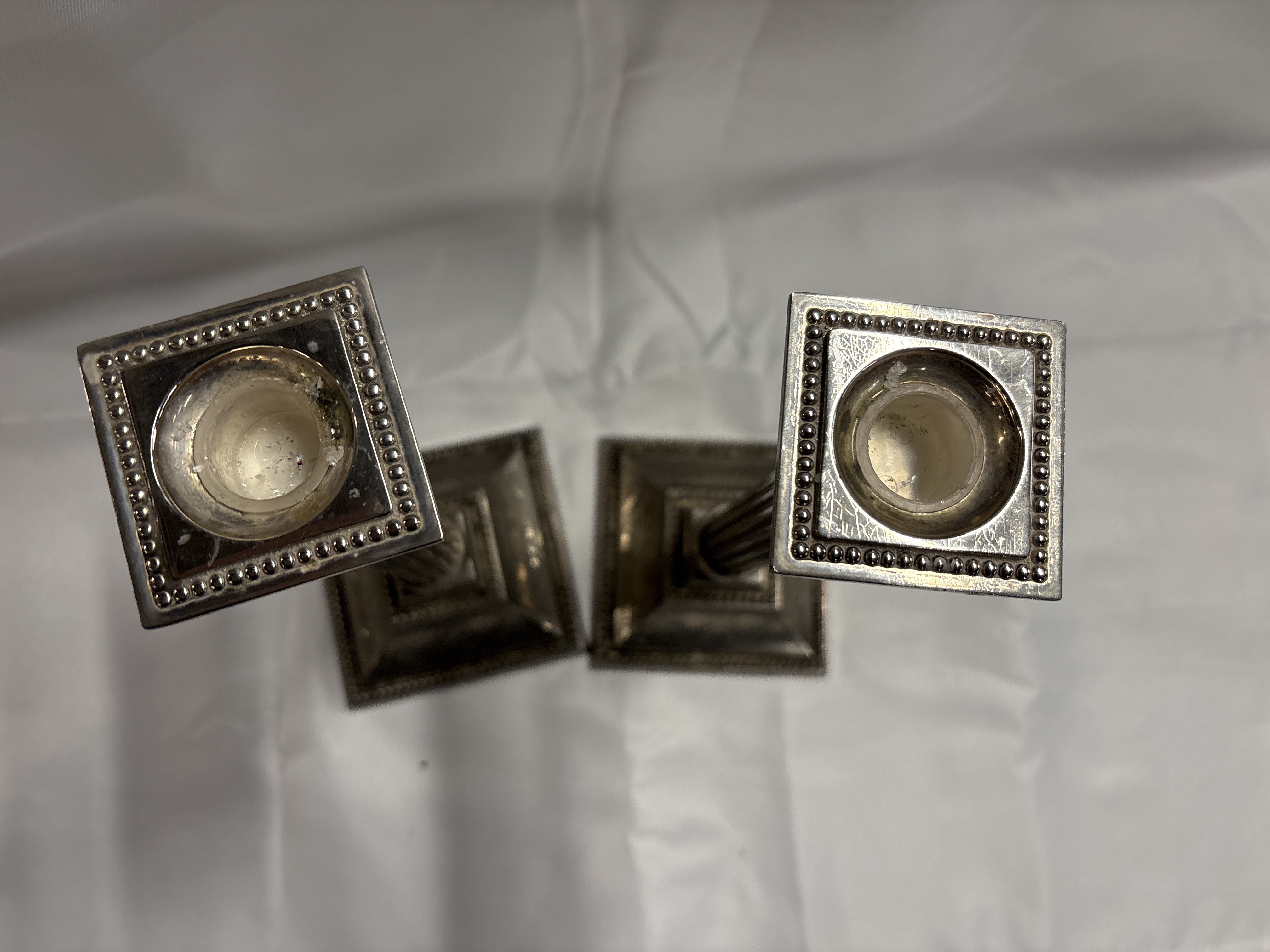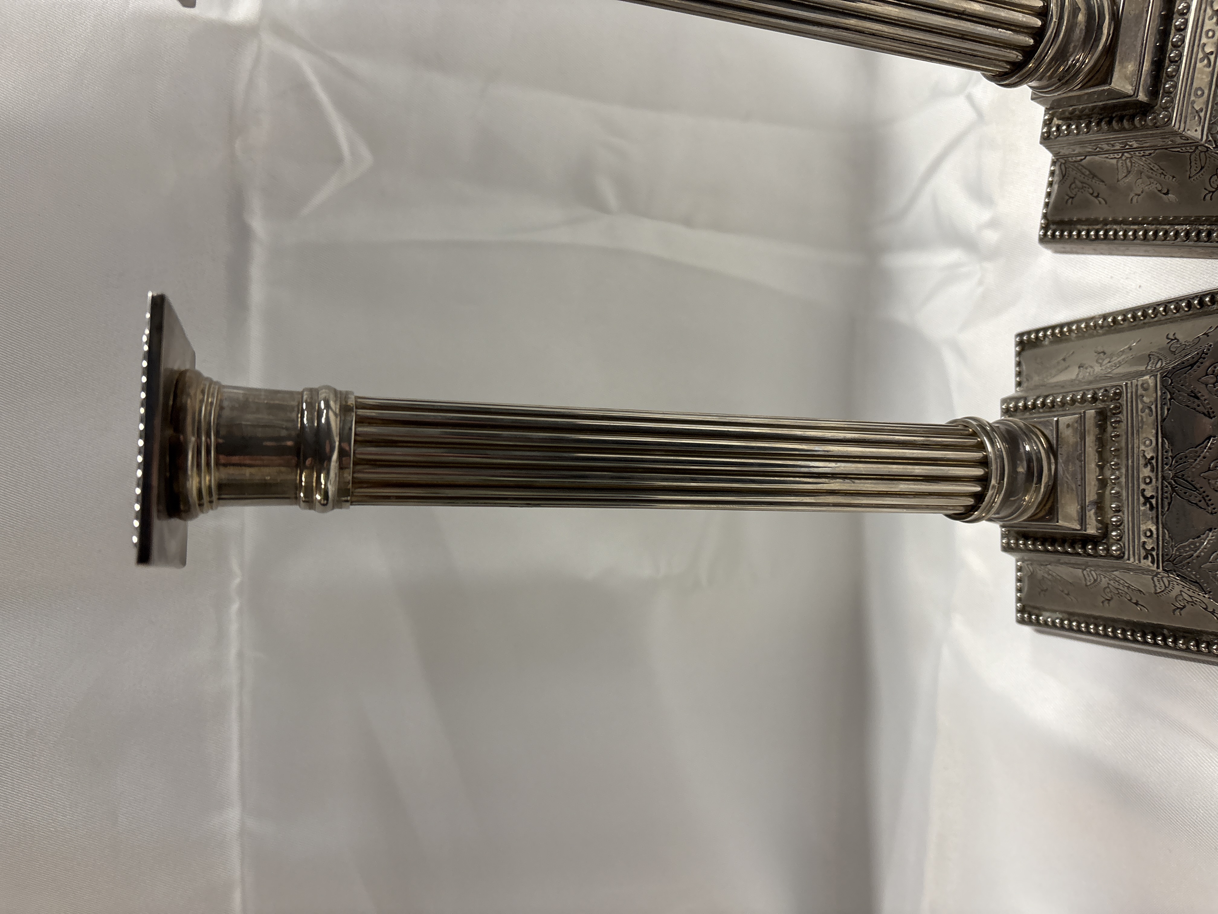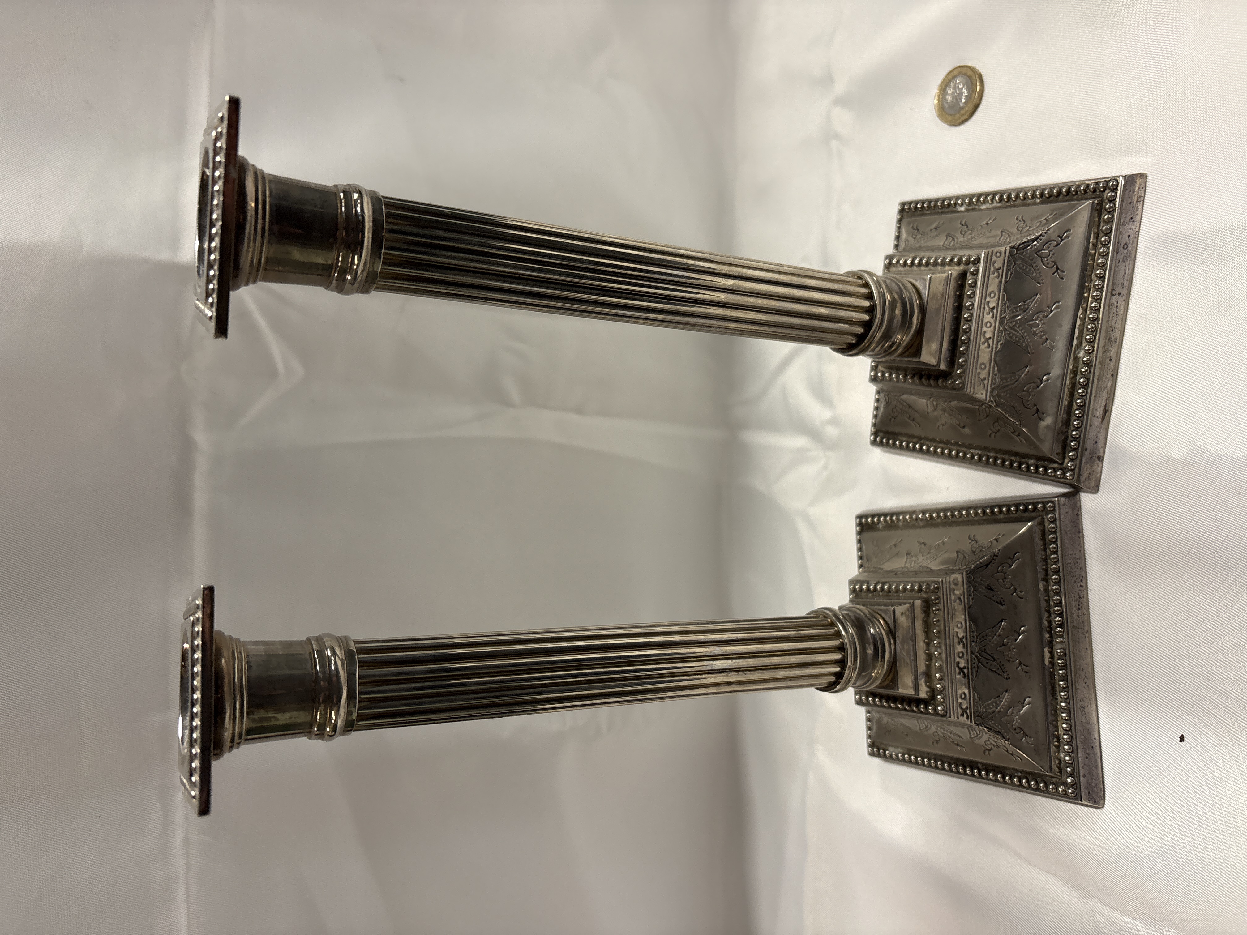 A pair of silver-plated candlesticks in the Neo-Classical style, each featuring a fluted column shaft in the Corinthian order. The shafts are supported by stepped square bases decorated with chased foliate and floral motifs and finished with beaded rims. Each candlestick is topped with a square drip pan featuring a matching beaded border. The underside of one base displays incised marks resembling the characters X and O, though other markings are present but not clearly legible.