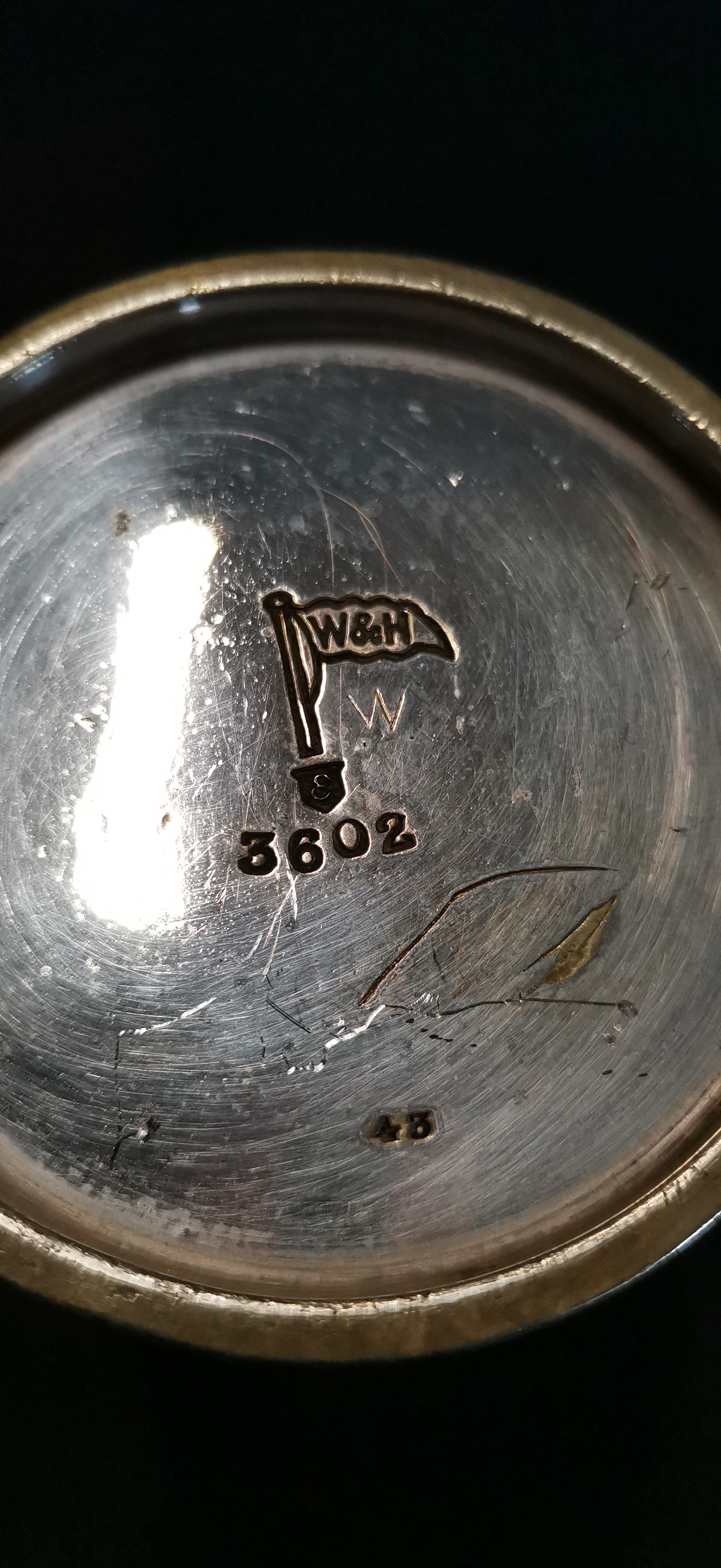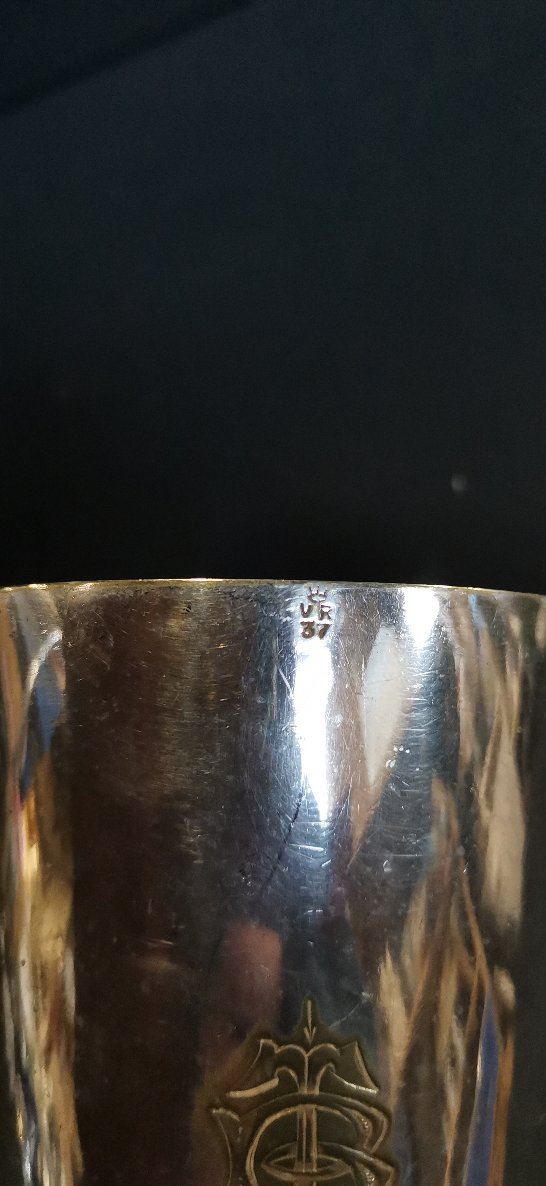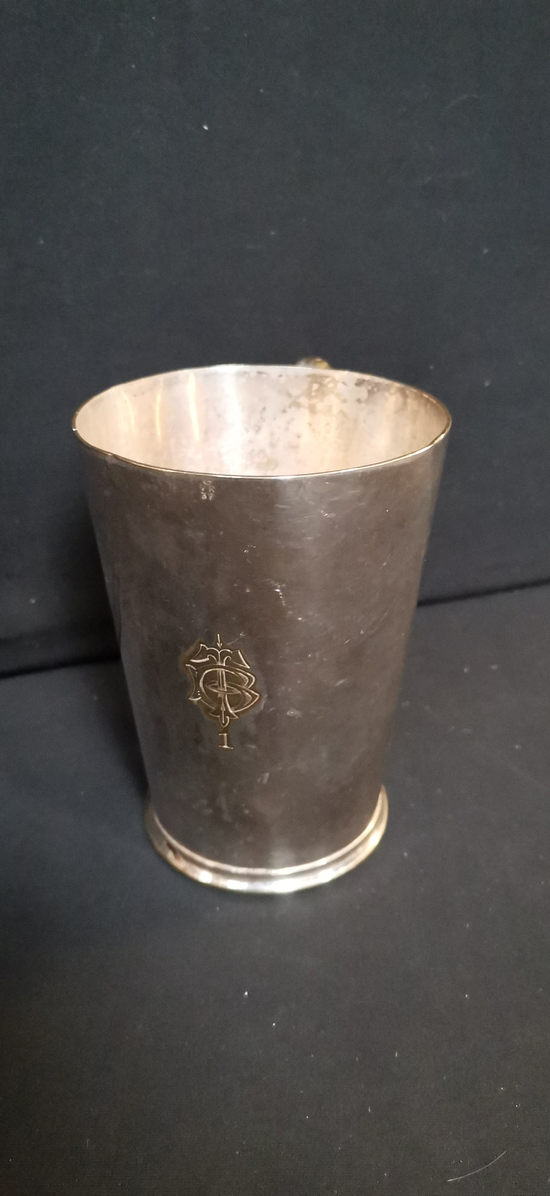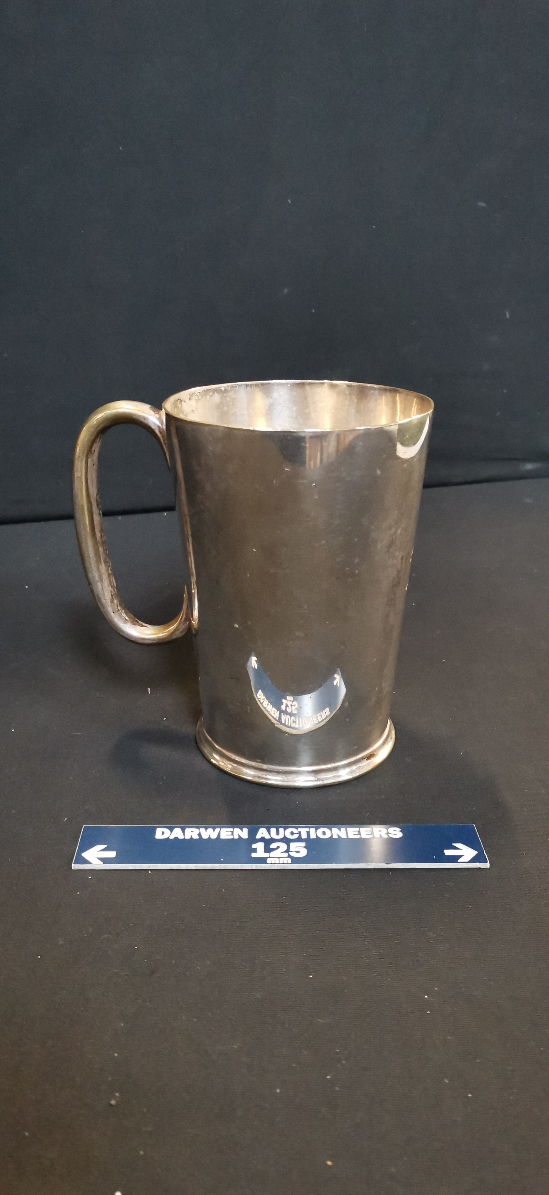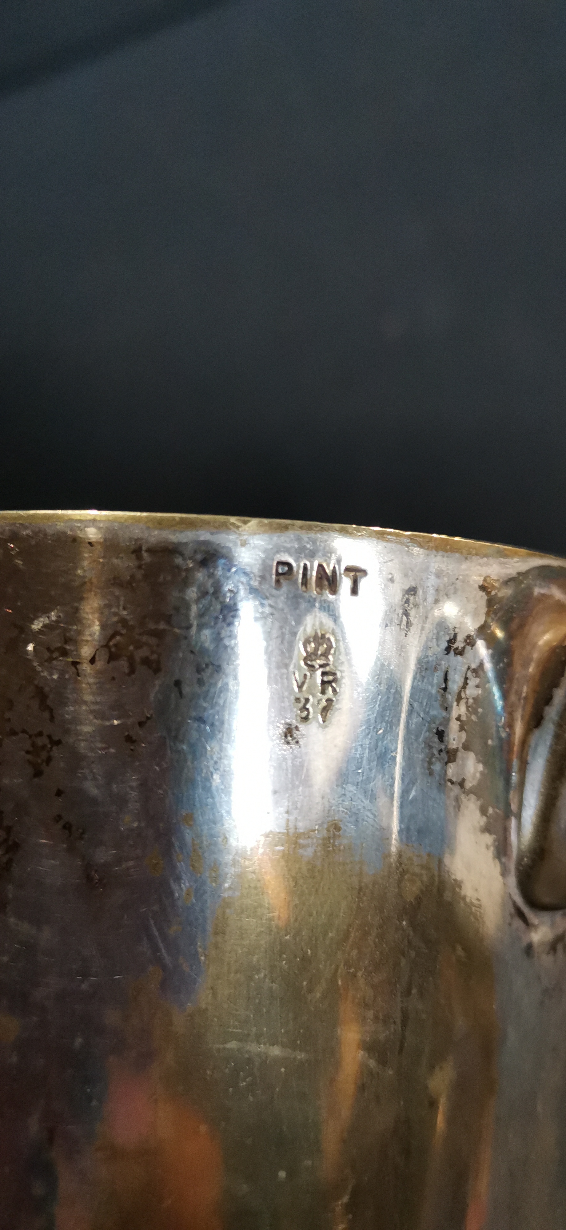 A Antique silver plated metal pint tankard by Walker & Hall featuring an engraved crest with the number 1 and a Victorian VR 37 verification mark, measuring approximately 125mm in height.
