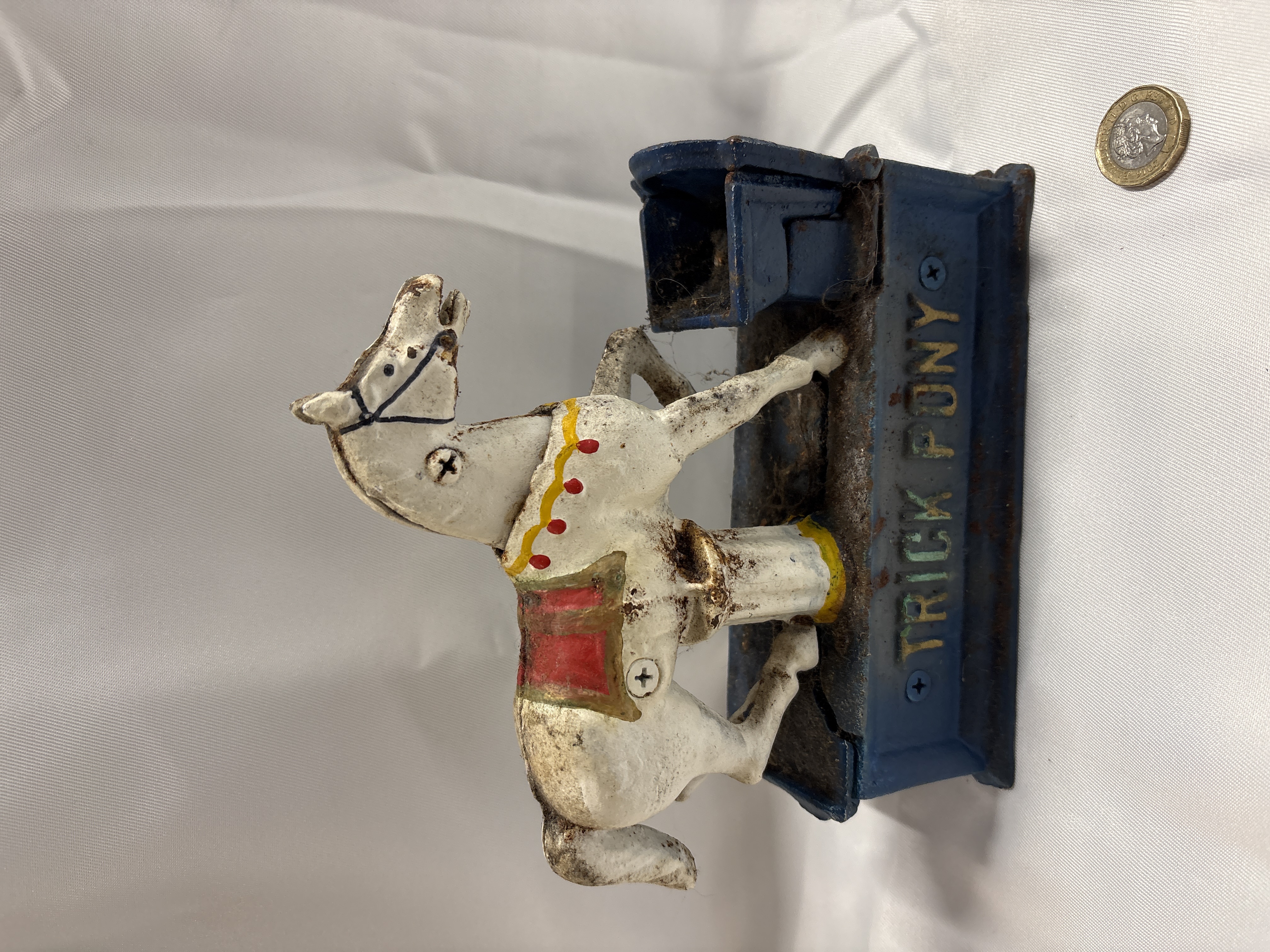 A lever-operated mechanical bank in the style of the Shepard Hardware Co. Trick Pony model. The item is constructed from cast iron and features a white-painted pony with a red and gold saddle mounted upon a rectangular blue base. The name TRICK PONY is cast in raised, gold-painted lettering on both sides of the base. The mechanism is designed so that placing a coin in the pony’s mouth and depressing the rear lever causes the head to lower and deposit the coin into the adjacent trough. The assembly utilises modern Phillips-head screws, which is consistent with 20th-century reproductions of the 1885 original.