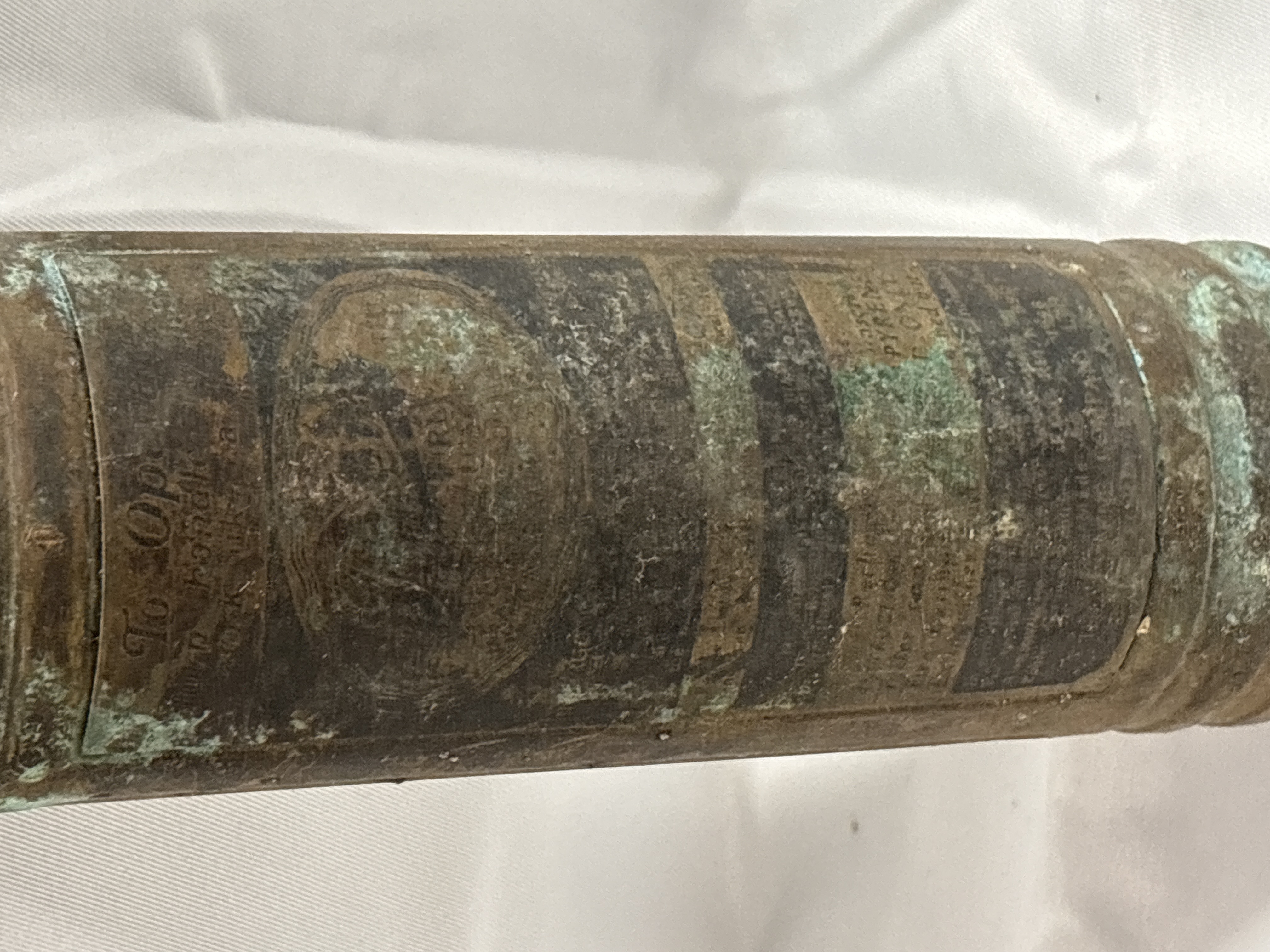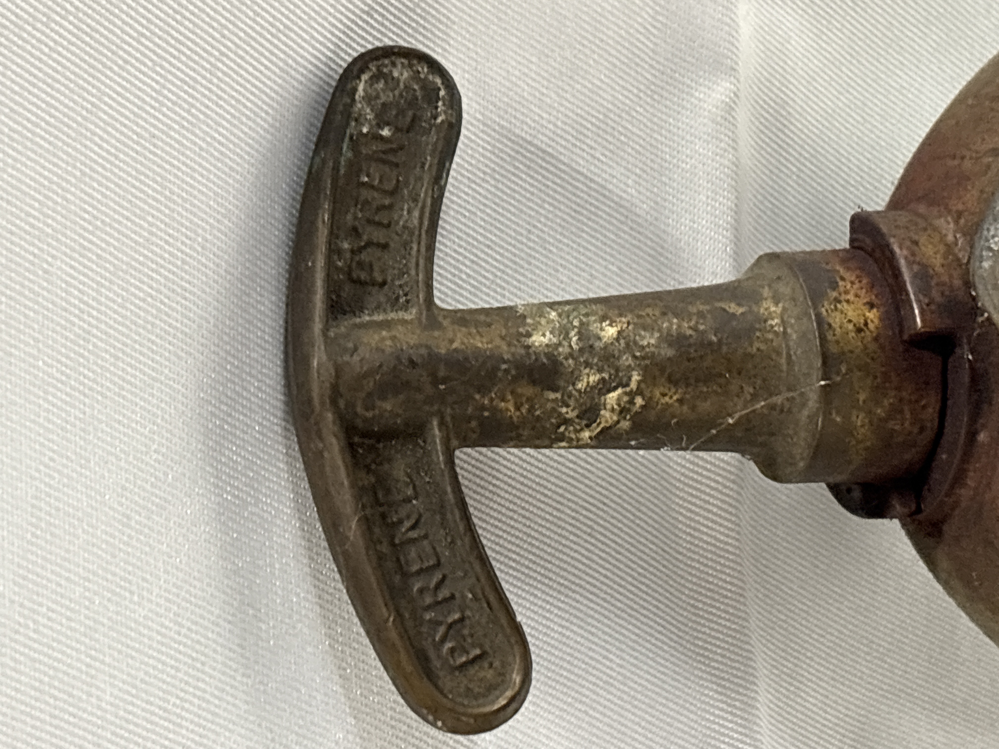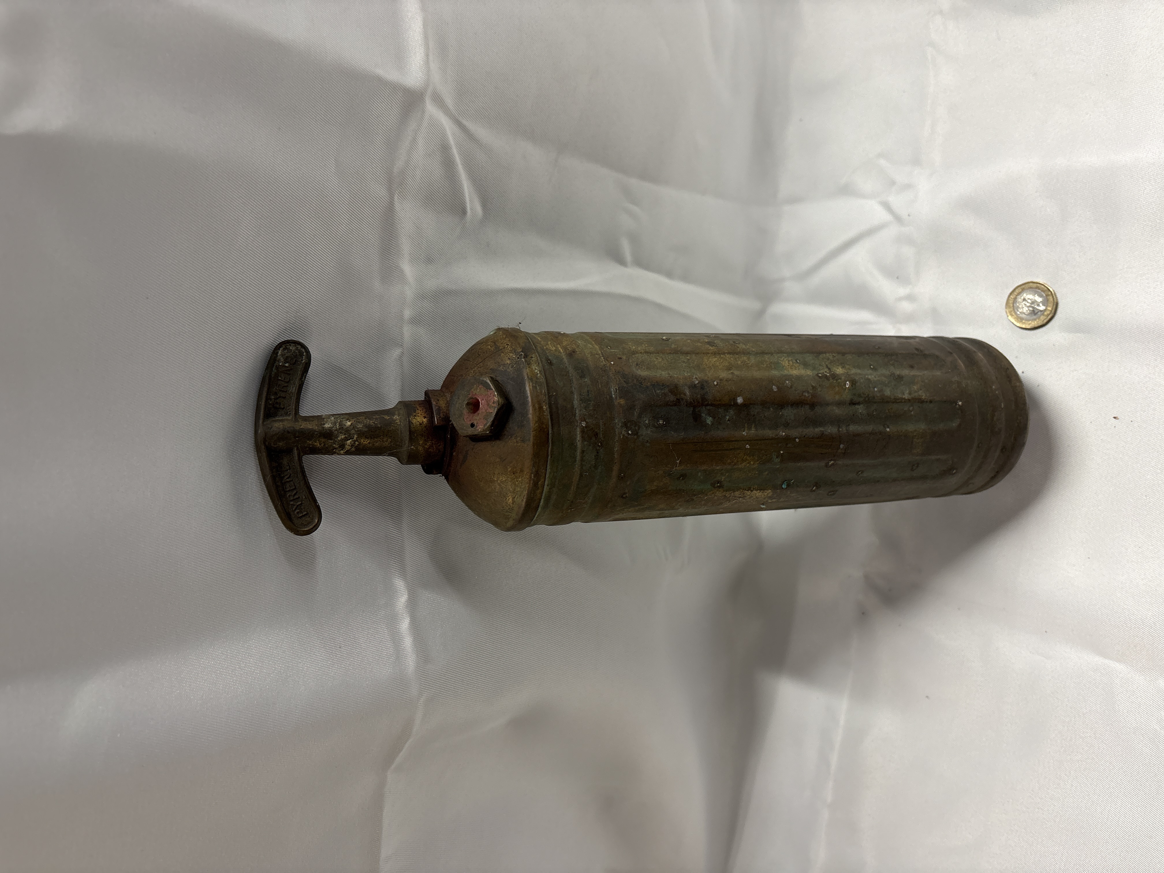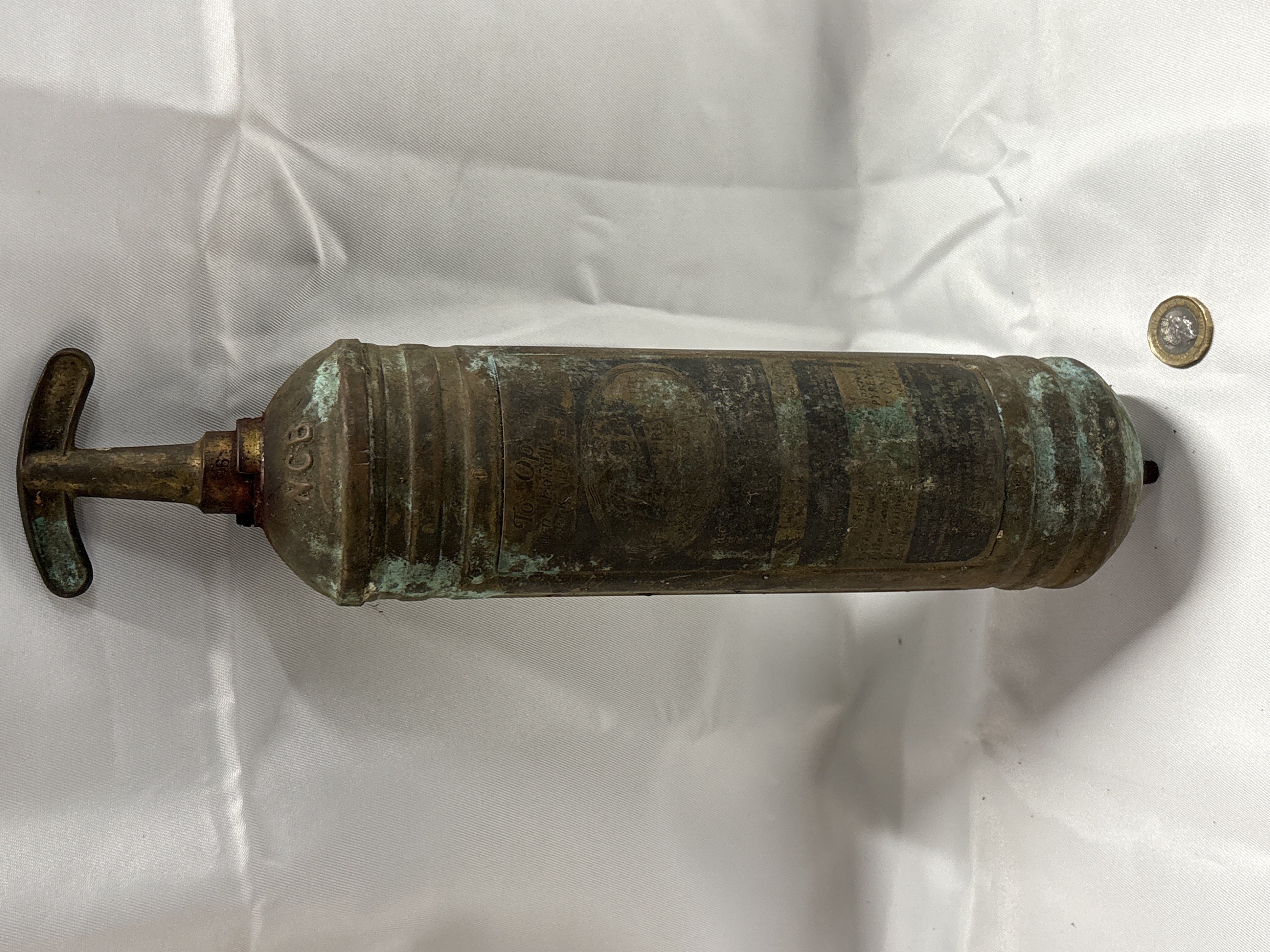 A vintage metalic pump-action fire extinguisher manufactured by Pyrene, also known as Pyrenee. The object consists of a cylindrical body and a T-shaped handle. The handle is embossed with the name PYRENE on both arms. The shoulder of the cylinder features the embossed initials NCB, signifying a connection to the National Coal Board. The central body contains a worn label with partial instructions such as To Op, turn handle, and work like a pump. The item is constructed from metalic materials.