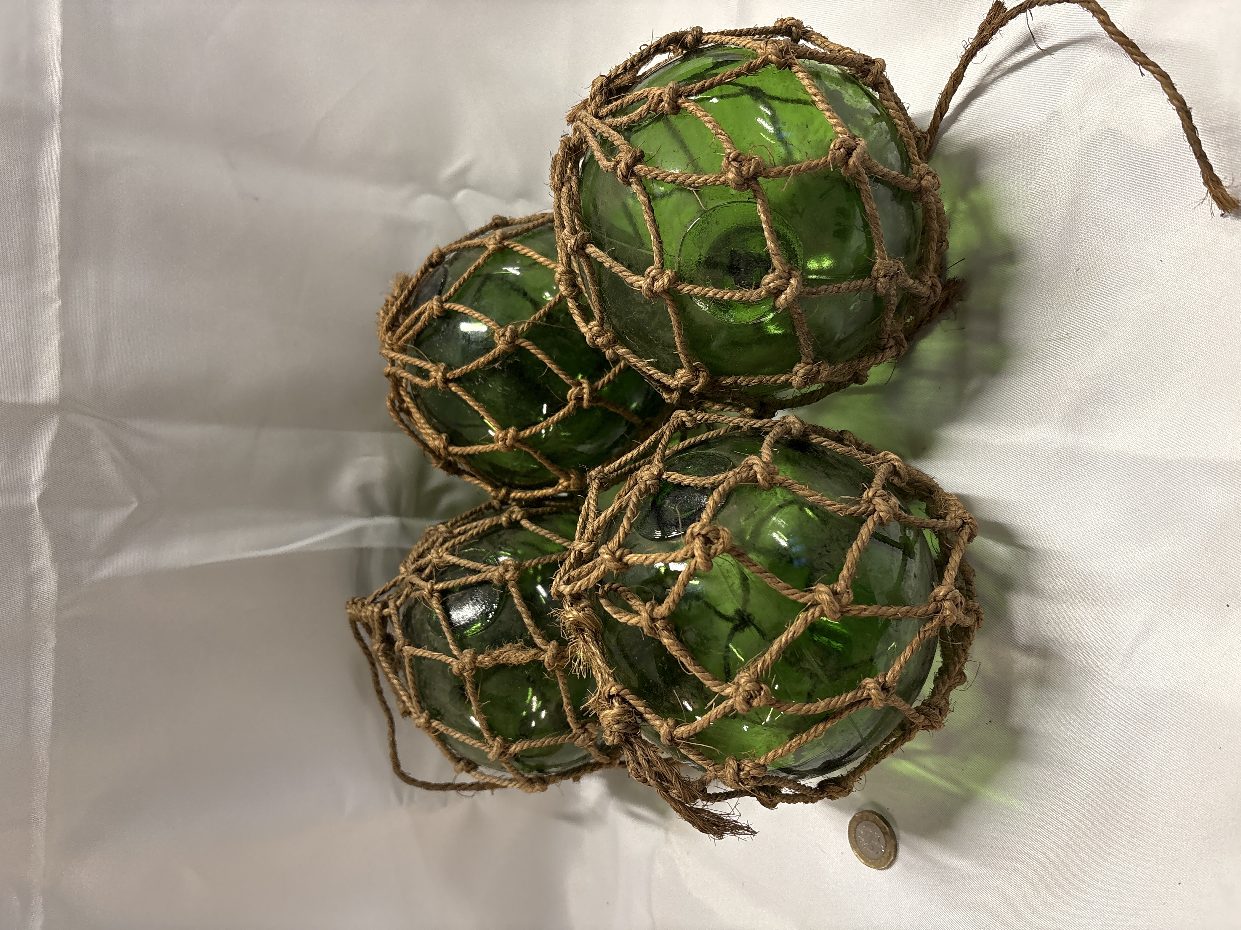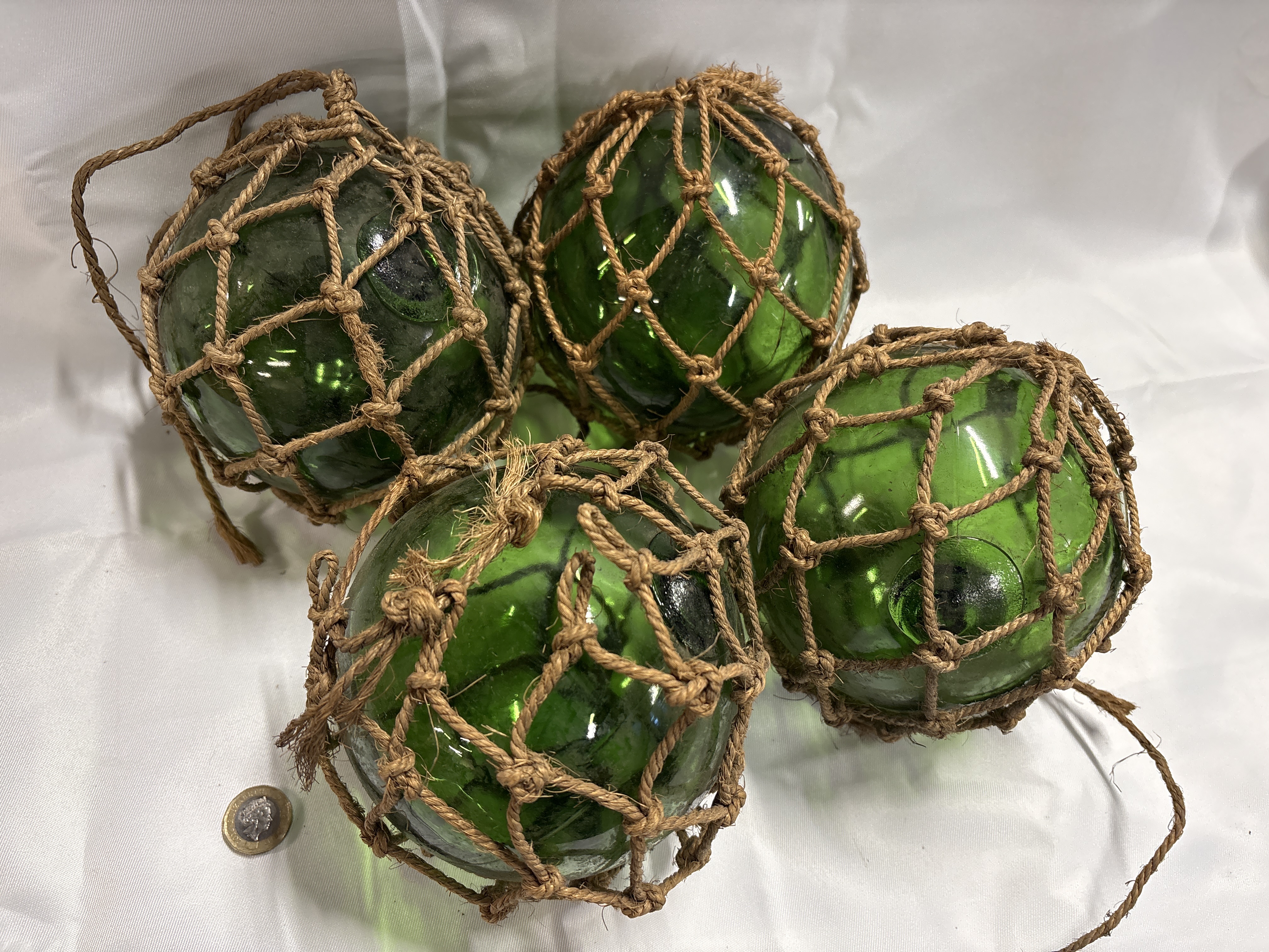 A Group of Four Vintage-Style Green Glass Fishing Floats in Rope Netting