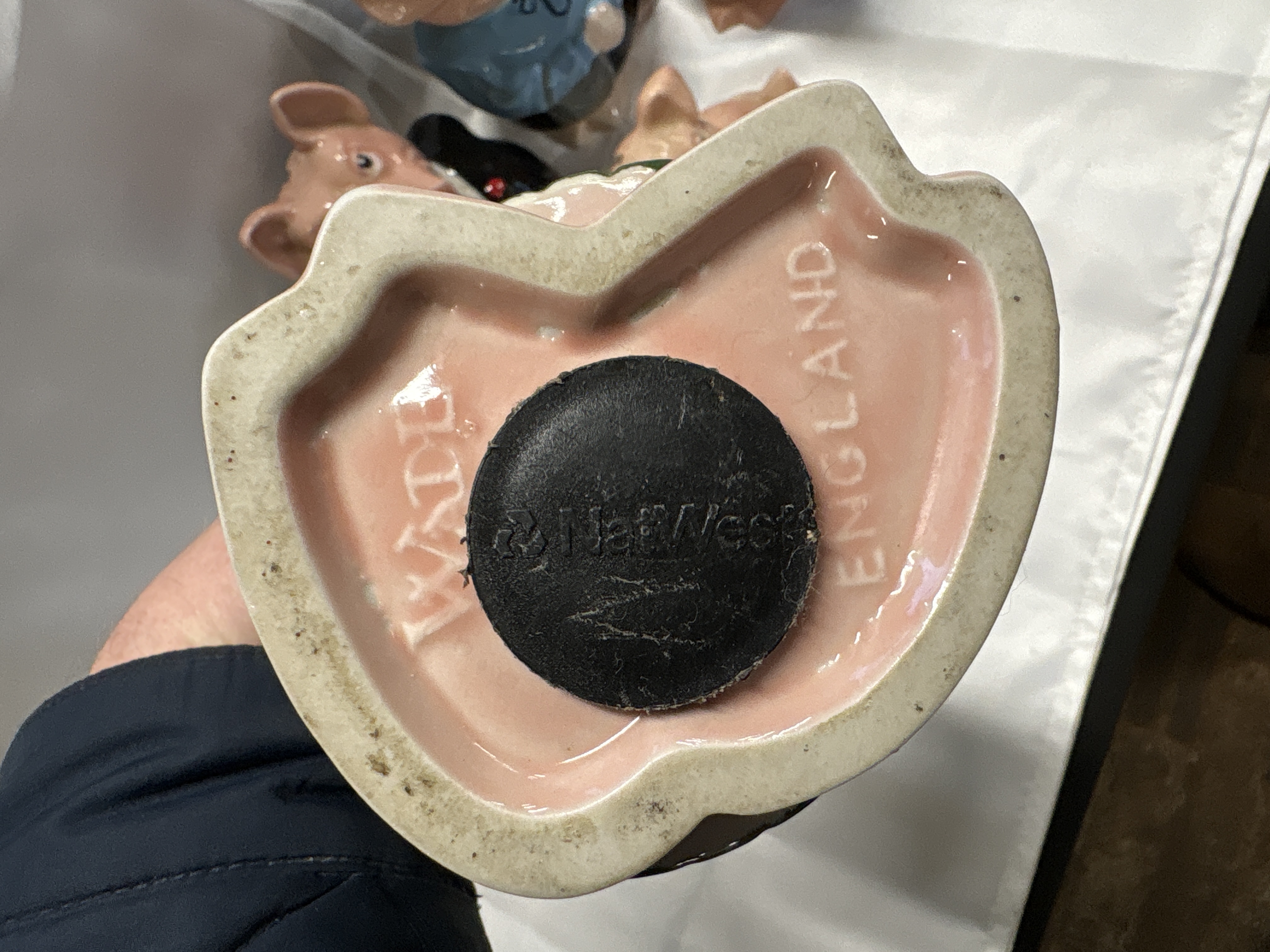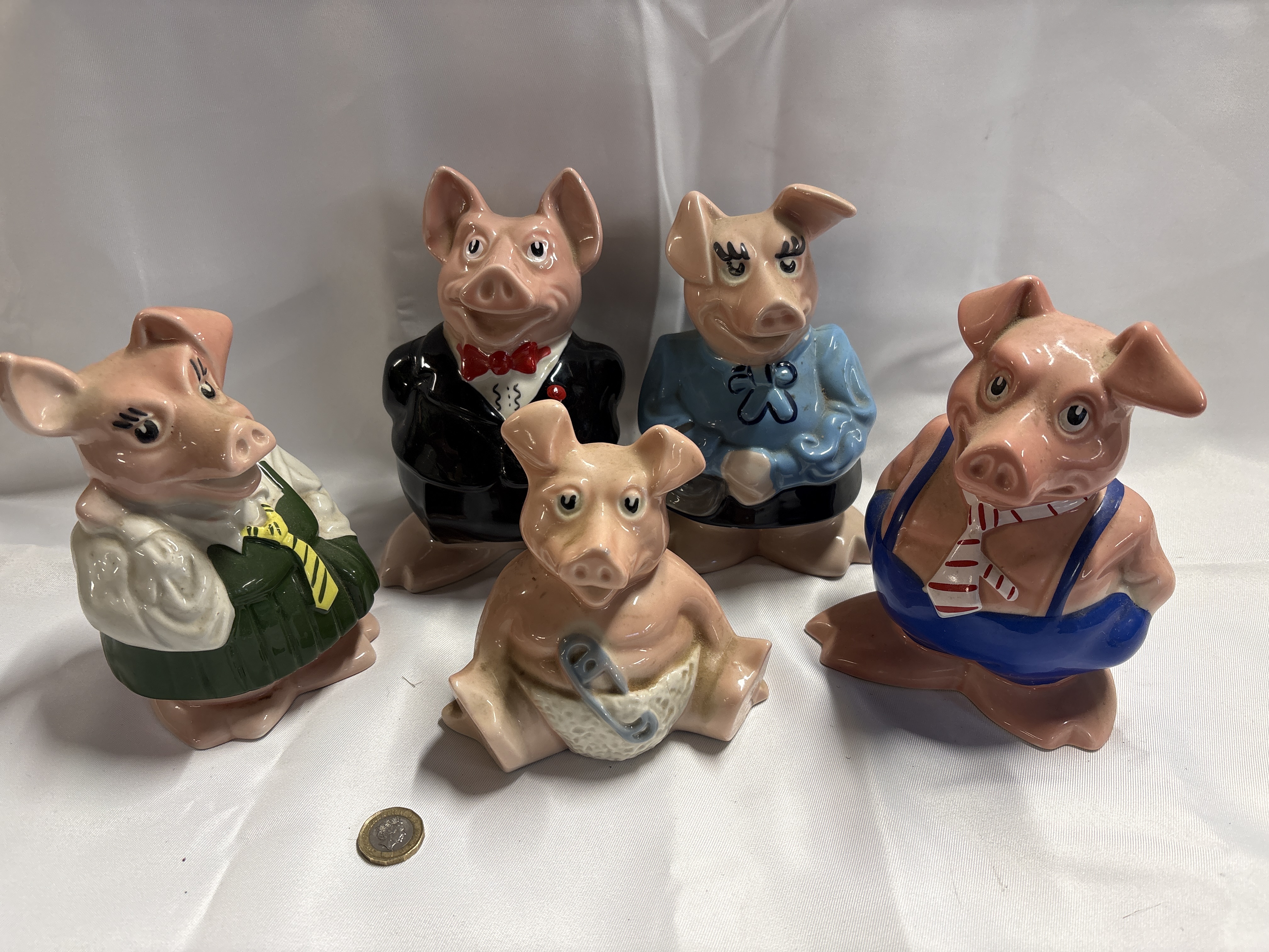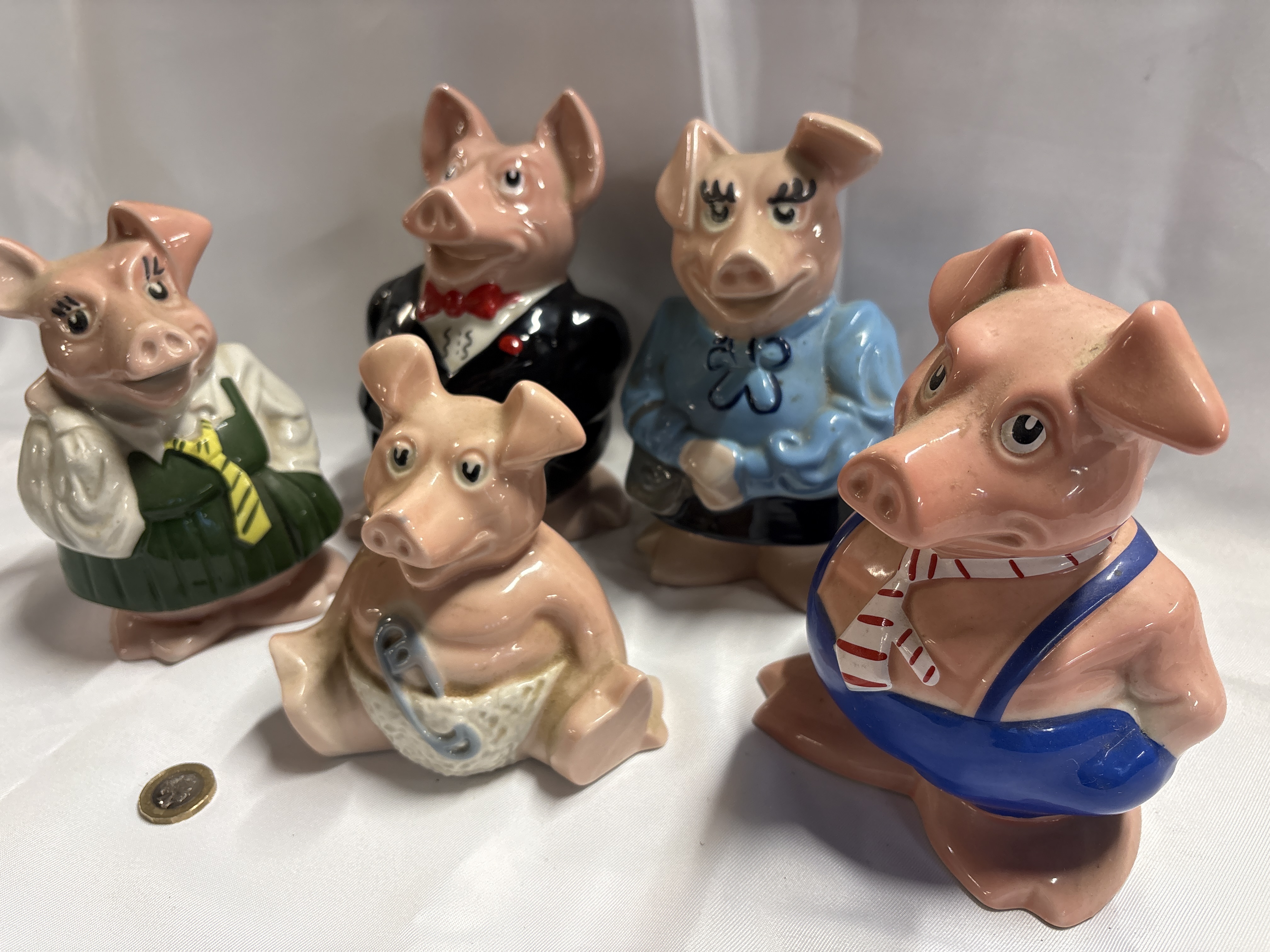 This collection consists of a set of five porcelain anthropomorphic pig money boxes, commissioned by NatWest and manufactured by Wade, England. The set features a graduated family of figures including an infant seated in a nappy with a blue safety pin, a girl in a green pleated dress and striped tie, a boy in blue dungarees and striped tie, a father in a black evening suit with a red bow tie, and a mother in a blue blouse and black skirt. Each figure is finished in a polychrome glaze. The base of the figures features the embossed marks WADE and ENGLAND. All figures are fitted with their original black plastic stoppers bearing the NatWest chevron logo and name. A UK one pound coin is present in the images for scale purposes.