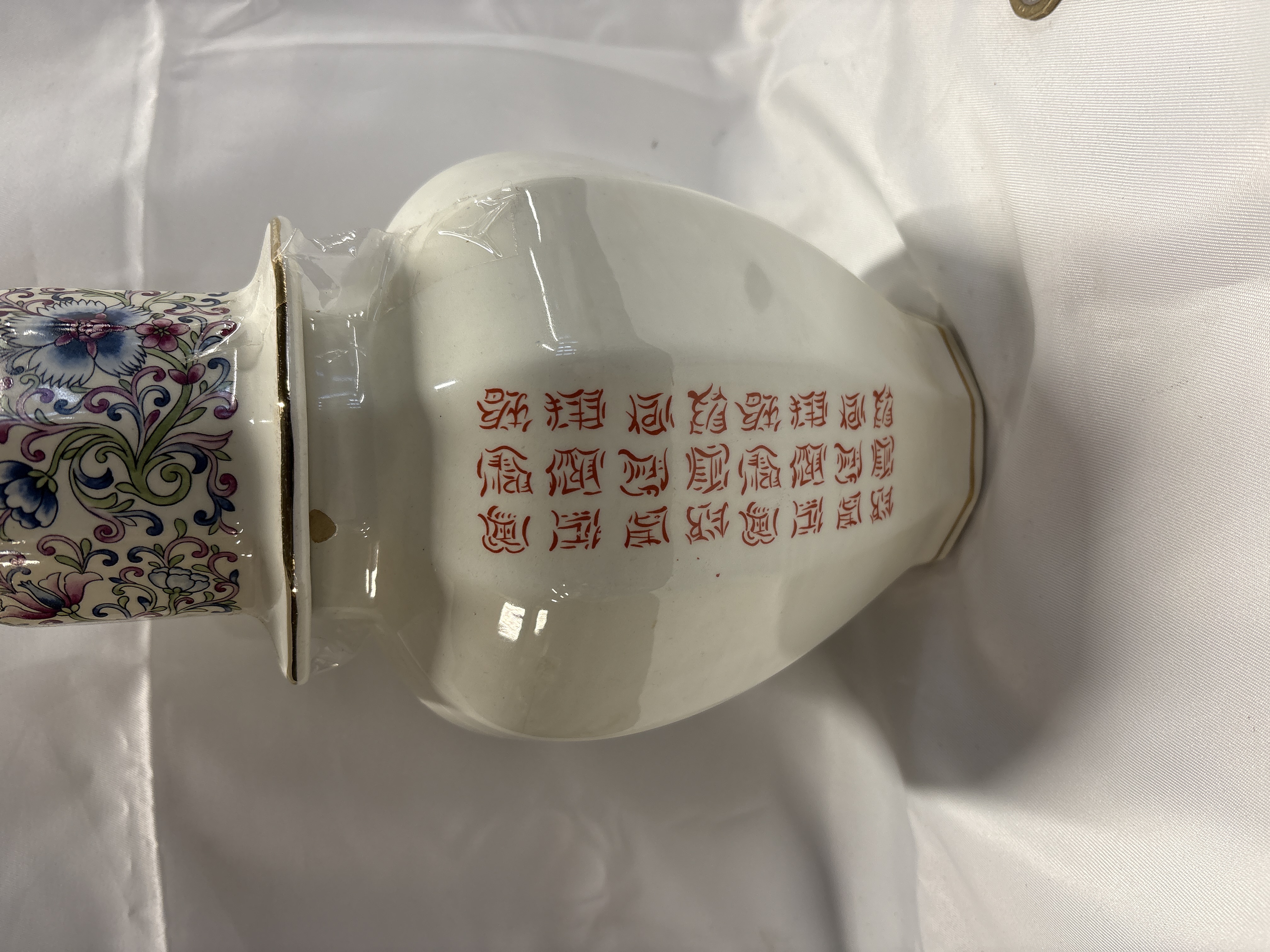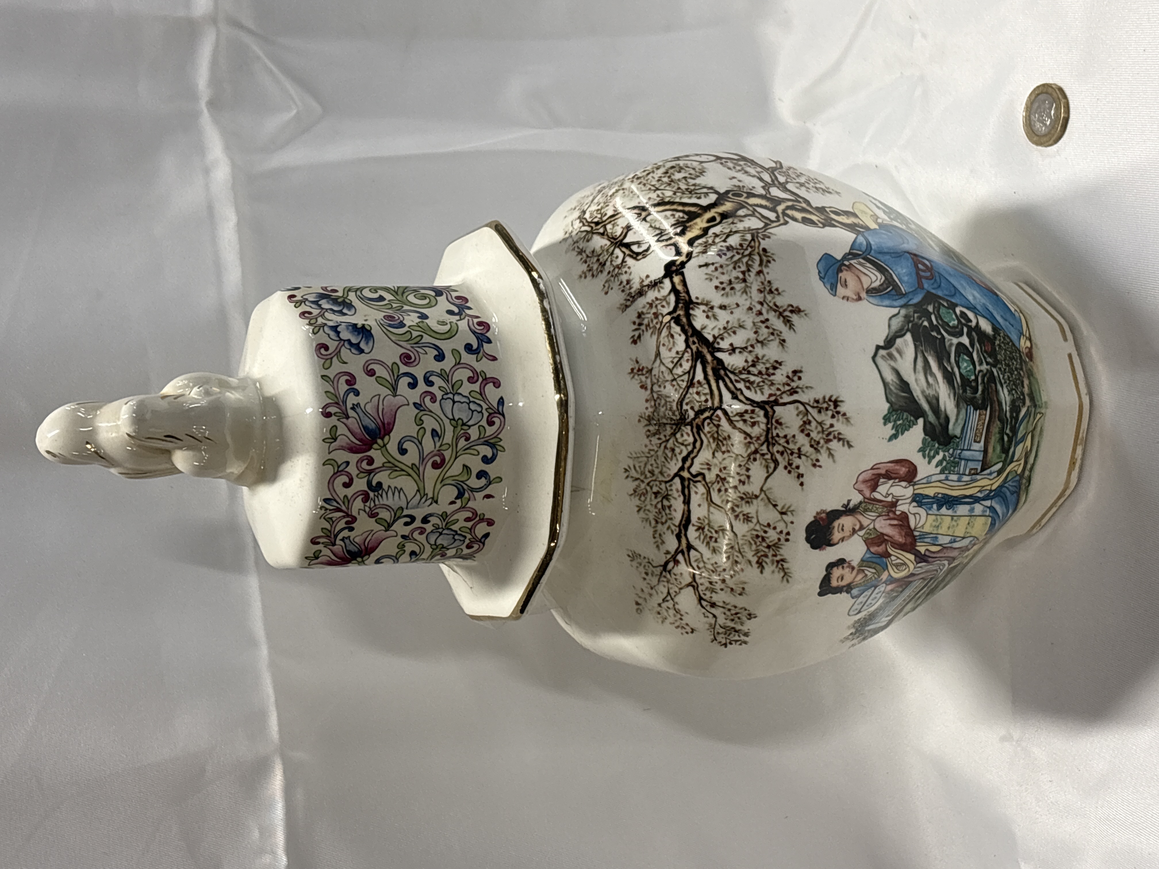 A 20th-century Chinese porcelain lidded vase of hexagonal baluster form, attributed to production in Jingdezhen, China. The body features six flat facets, with one face decorated in polychrome enamels depicting a narrative scene of three figures in traditional attire within a landscape of pine trees and rockwork. The reverse face displays a red seal script inscription consisting of twenty-one characters arranged in three vertical columns. The shoulders, neck, and lid are embellished with dense scrolling floral and foliate patterns in the famille rose palette. The lid is surmounted by a moulded finial in the form of a seated Buddhist lion with gilt highlights. Gold-tone detailing is applied to the rims and the vertical edges of the facets. The underside of the base bears a four-character apocryphal reign mark in red enamel.