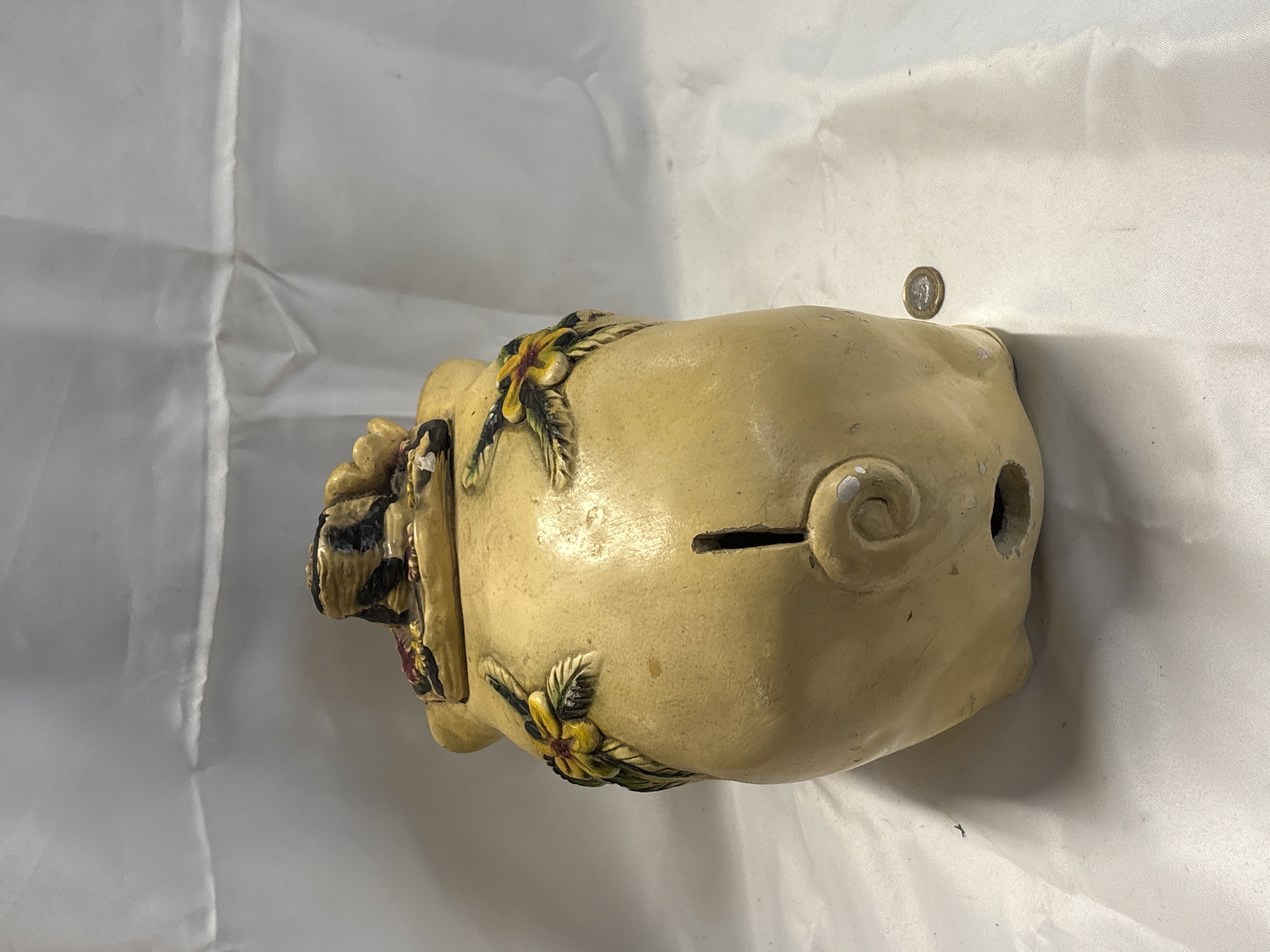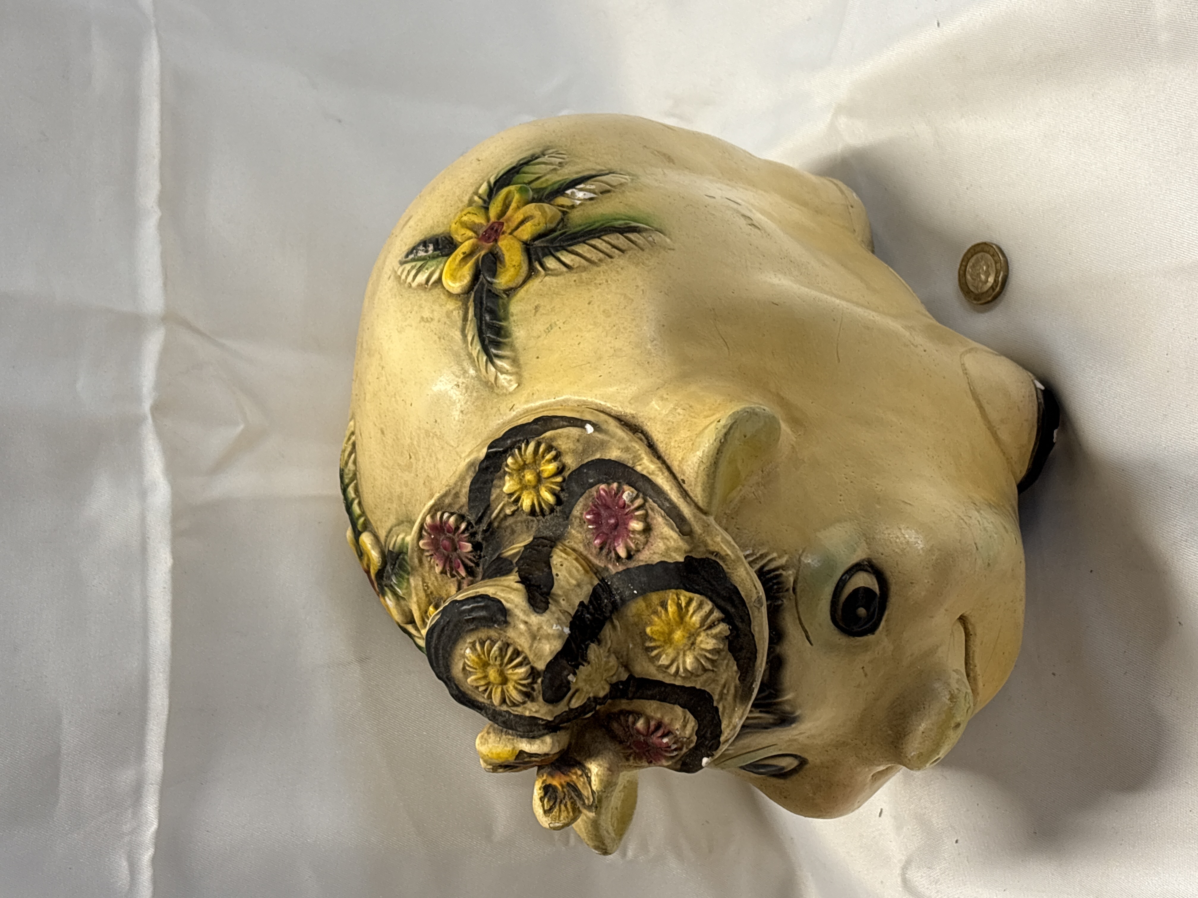 Vintage Chalkware Piggy Bank with Raised Floral Decoration