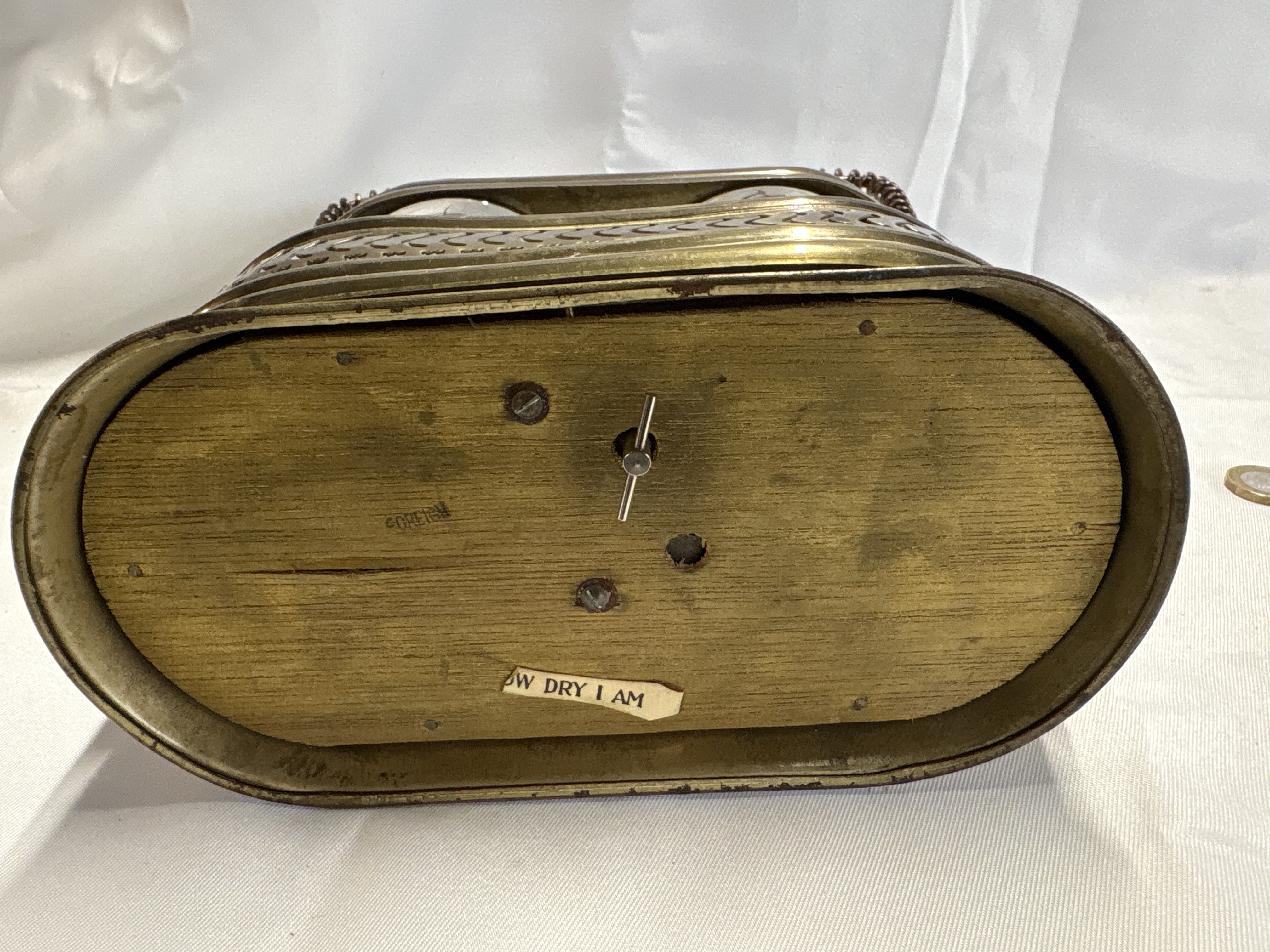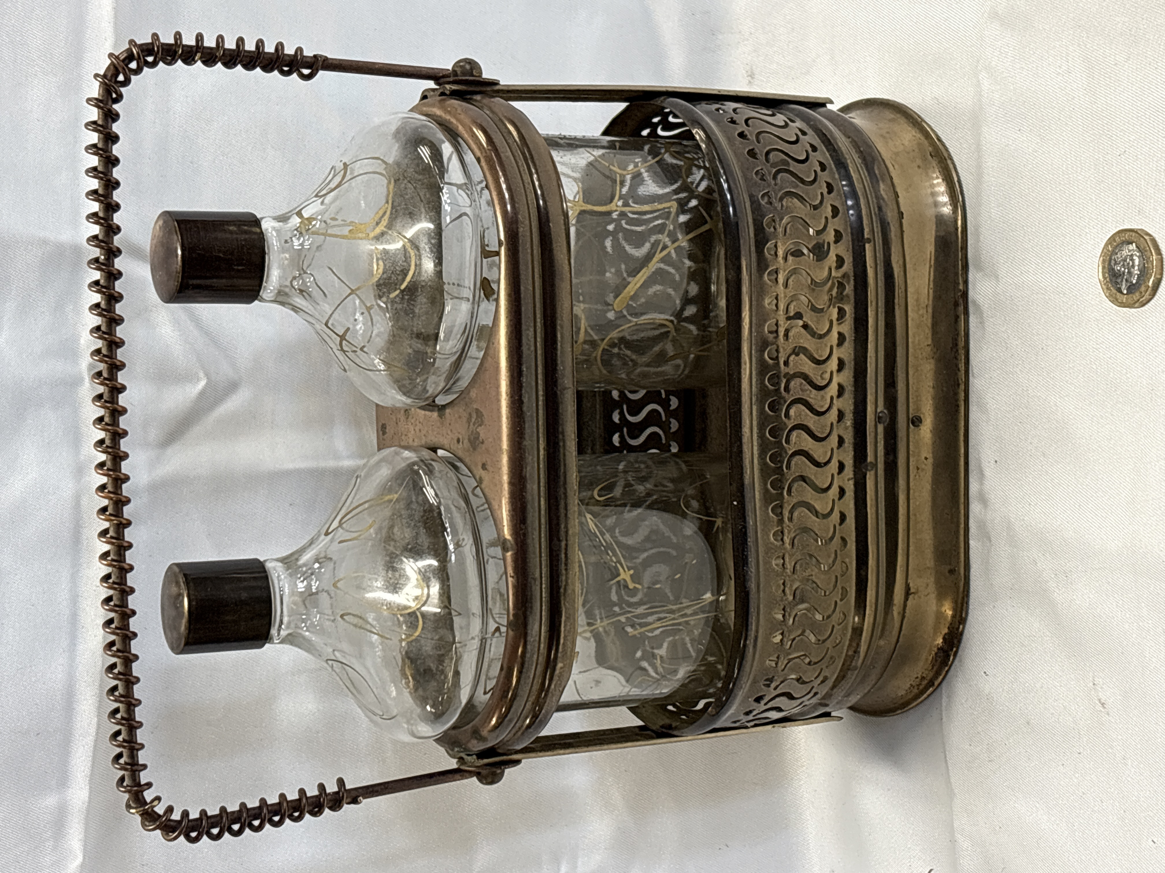 A mid-20th century musical barware set comprising a pair of clear glass decanters. The decanters are decorated with hand-painted gilt scrollwork and are fitted with metal-capped stoppers. They are housed in a silver plated metal frame featuring a pierced gallery and a twisted-wire swing handle. The assembly is mounted on a wooden base which contains a wind-up musical mechanism operated by a metal key. The underside of the wooden base is stamped with the mark FOREIGN and retains a partial paper label reading W DRY I AM, identifying the tune as How Dry I Am. A British one-pound coin is included in the images for scale.
