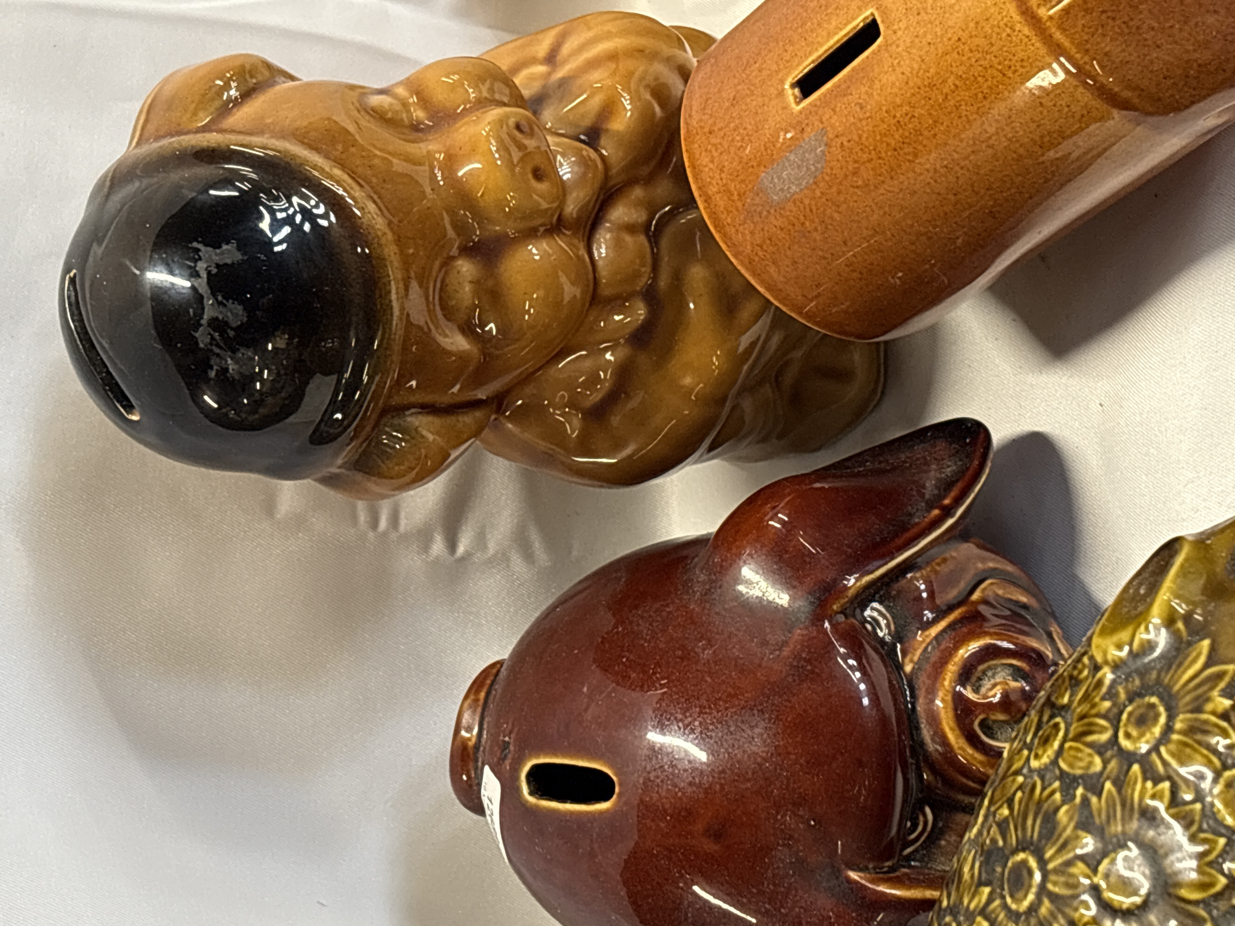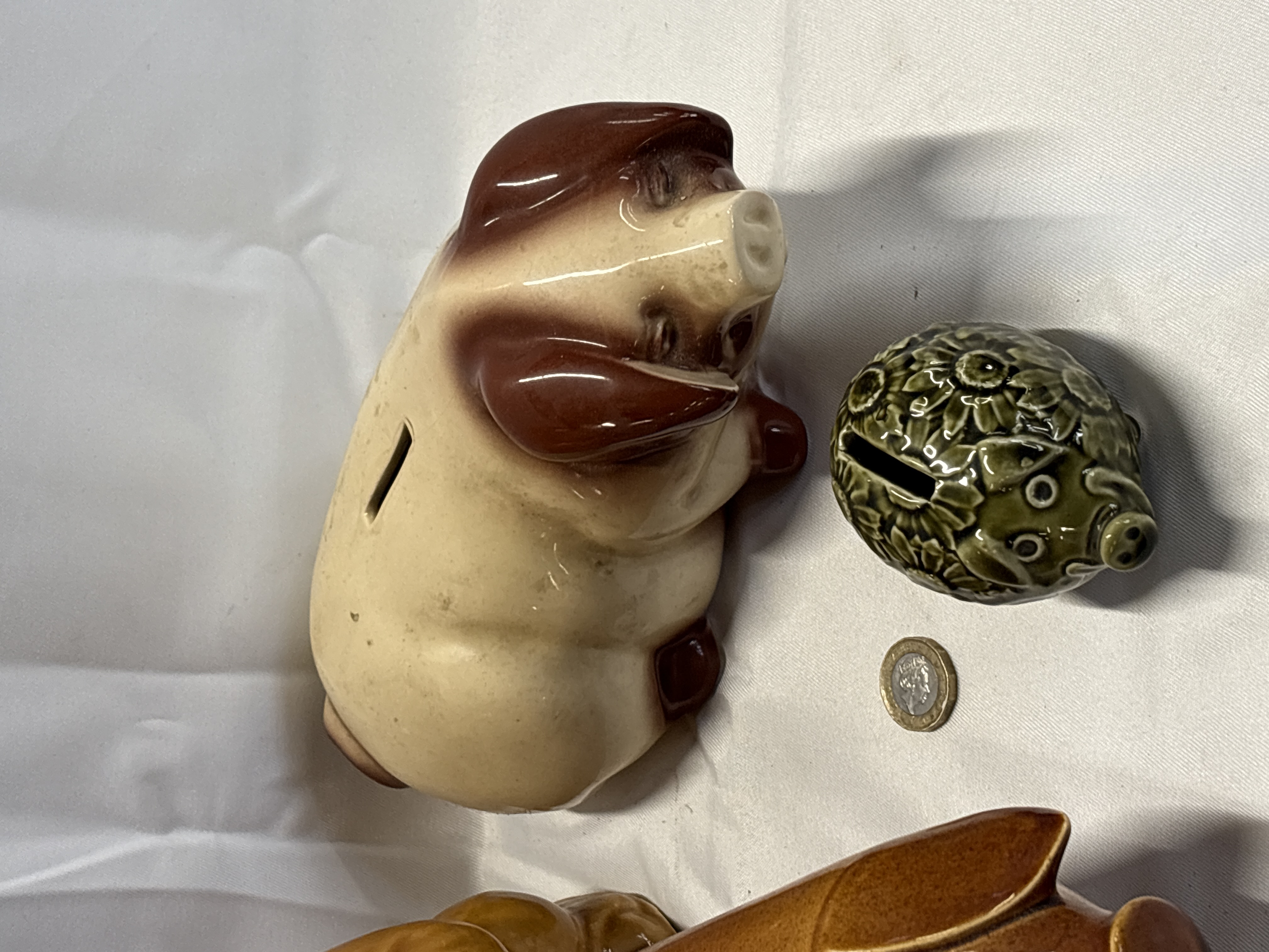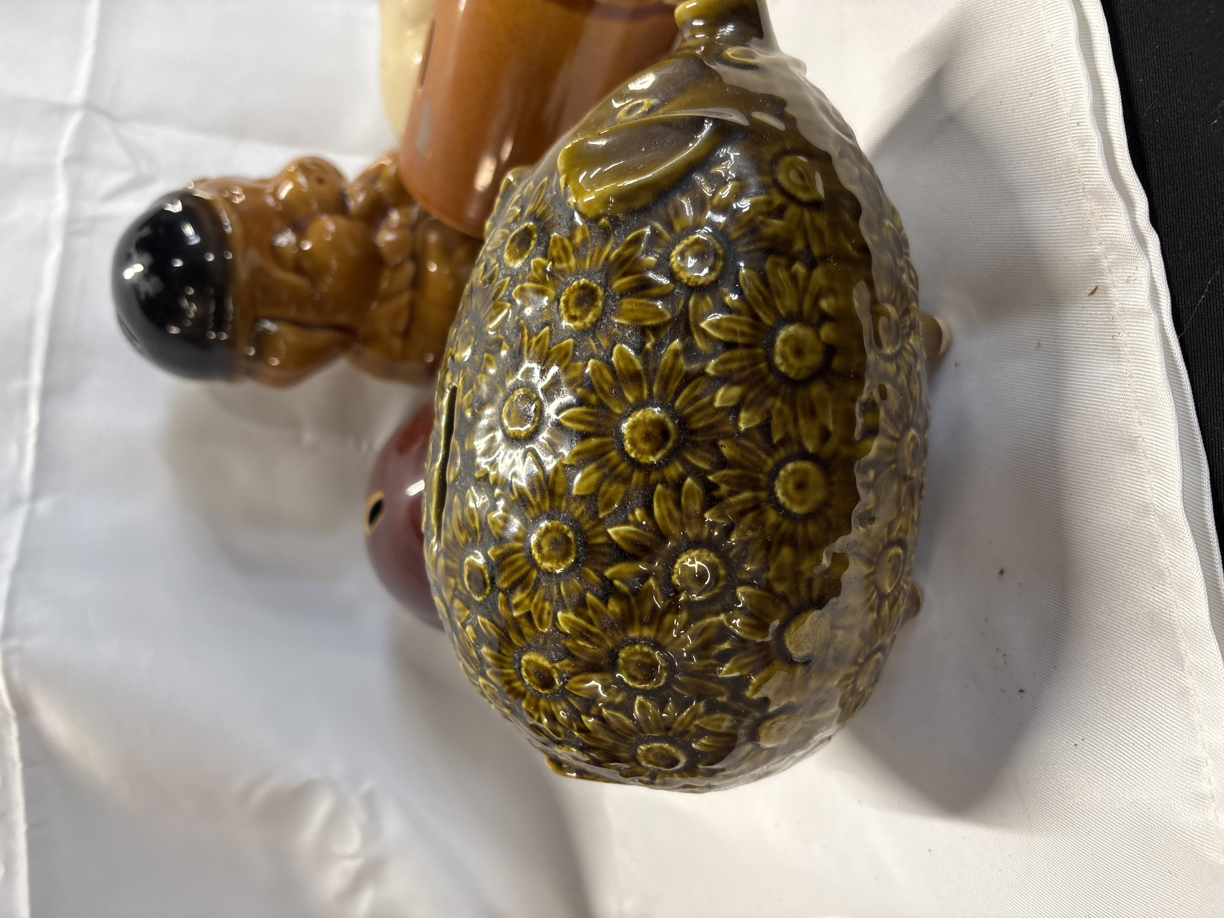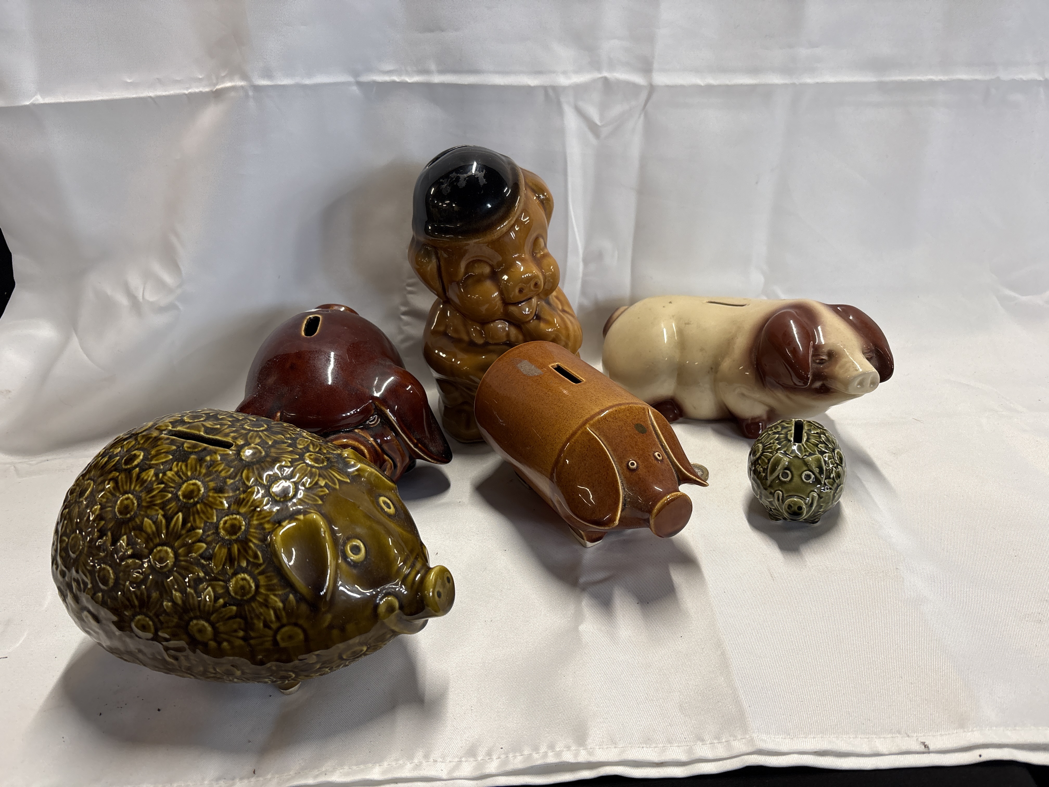This collection consists of six ceramic still banks produced in various styles and glazes. The lot includes two examples featuring an all-over embossed daisy pattern, one in a variegated olive-green and brown glaze and a smaller version in a green glaze, both in the style of Wade or similar Staffordshire potteries. Also included is an anthropomorphic seated figure wearing a black bowler hat with a brown glaze, and a reclining figure finished in a two-tone cream and brown drip glaze. The final two pieces comprise a traditional standing pig with a dark mahogany-brown glaze and a stylized cylindrical form with an orange-tan glaze. Each of these piggy banks is constructed from glazed ceramic and features a single passive coin slot. No maker marks or signatures are visible on the bodies of the items.