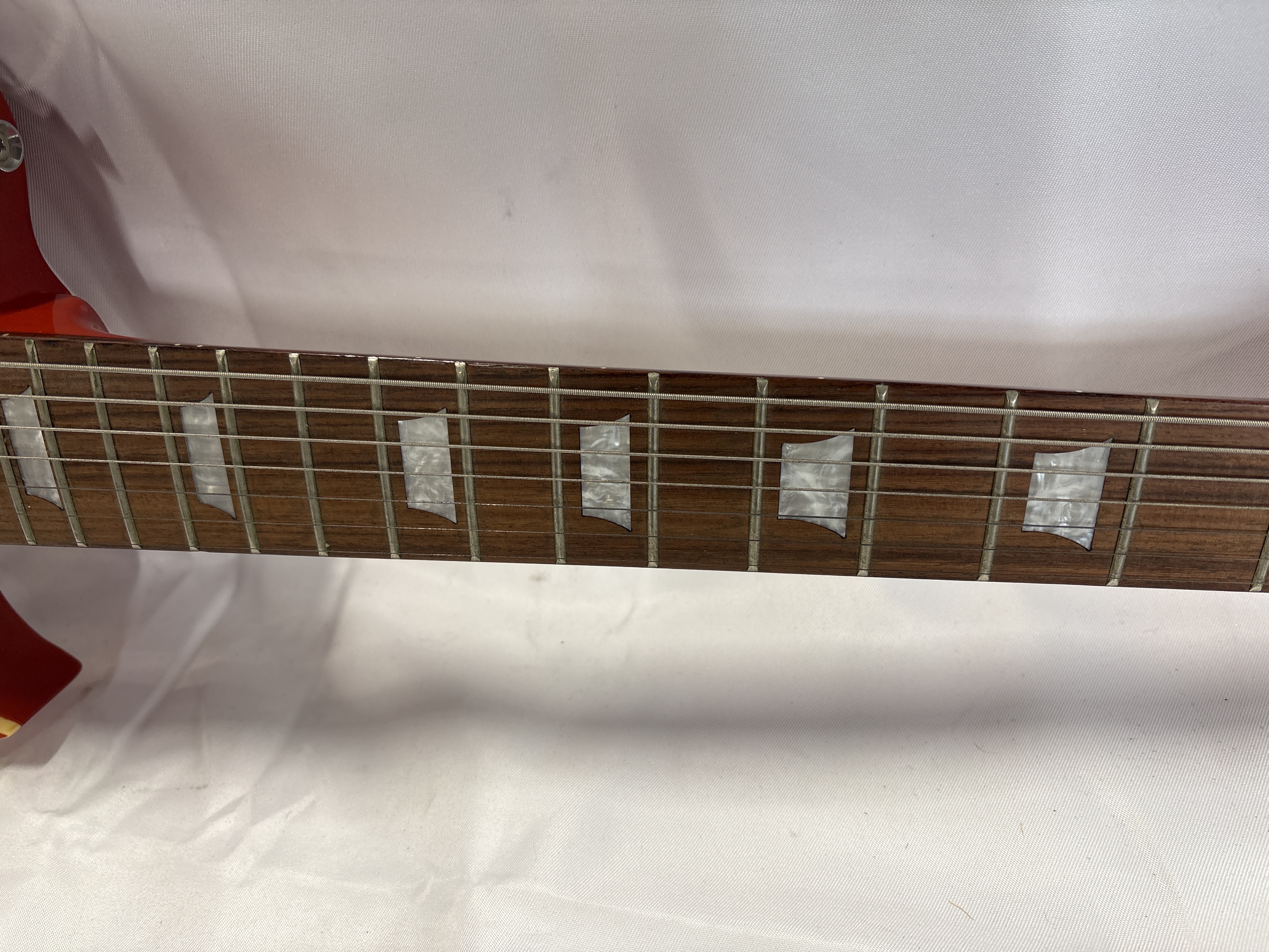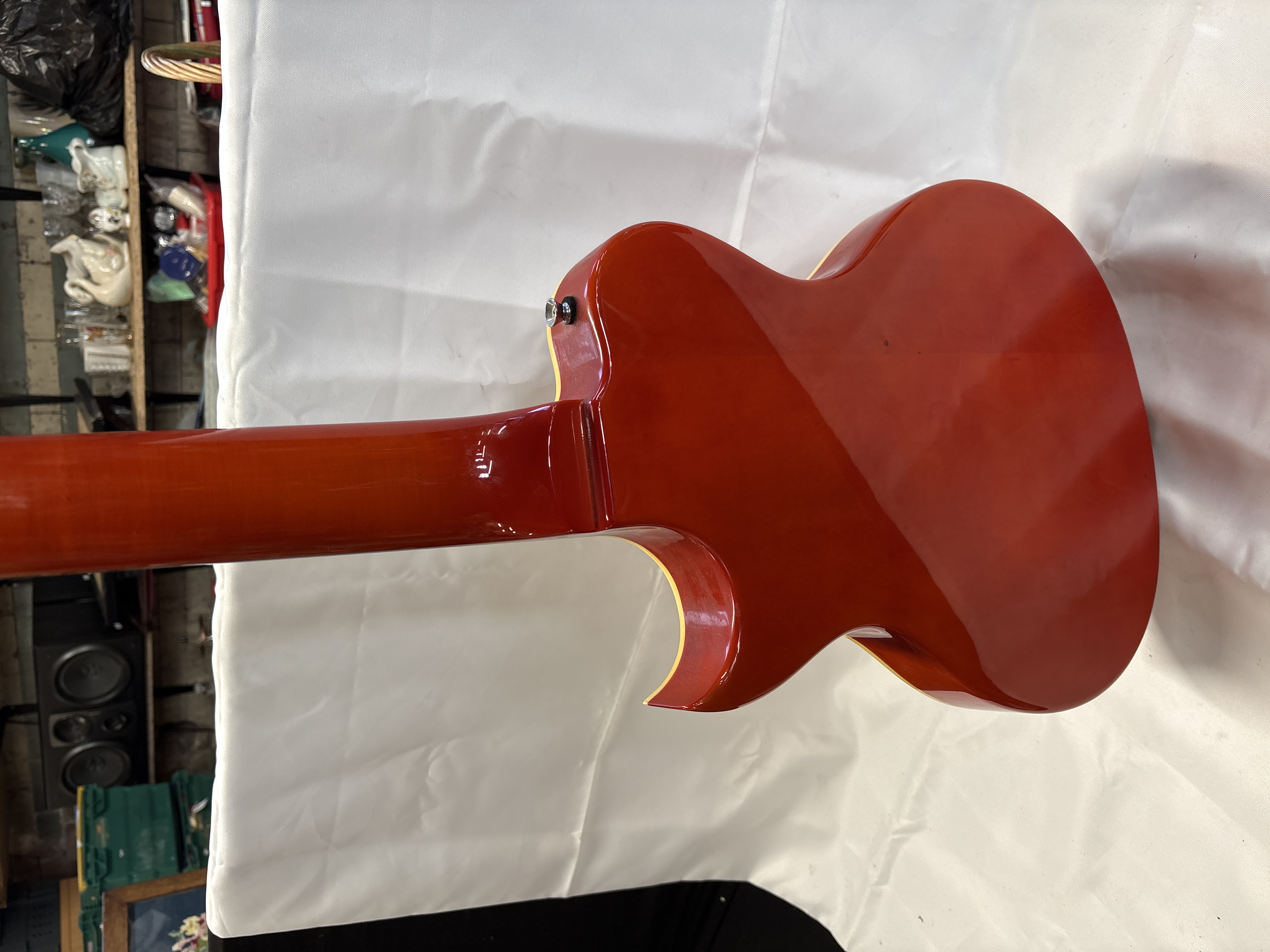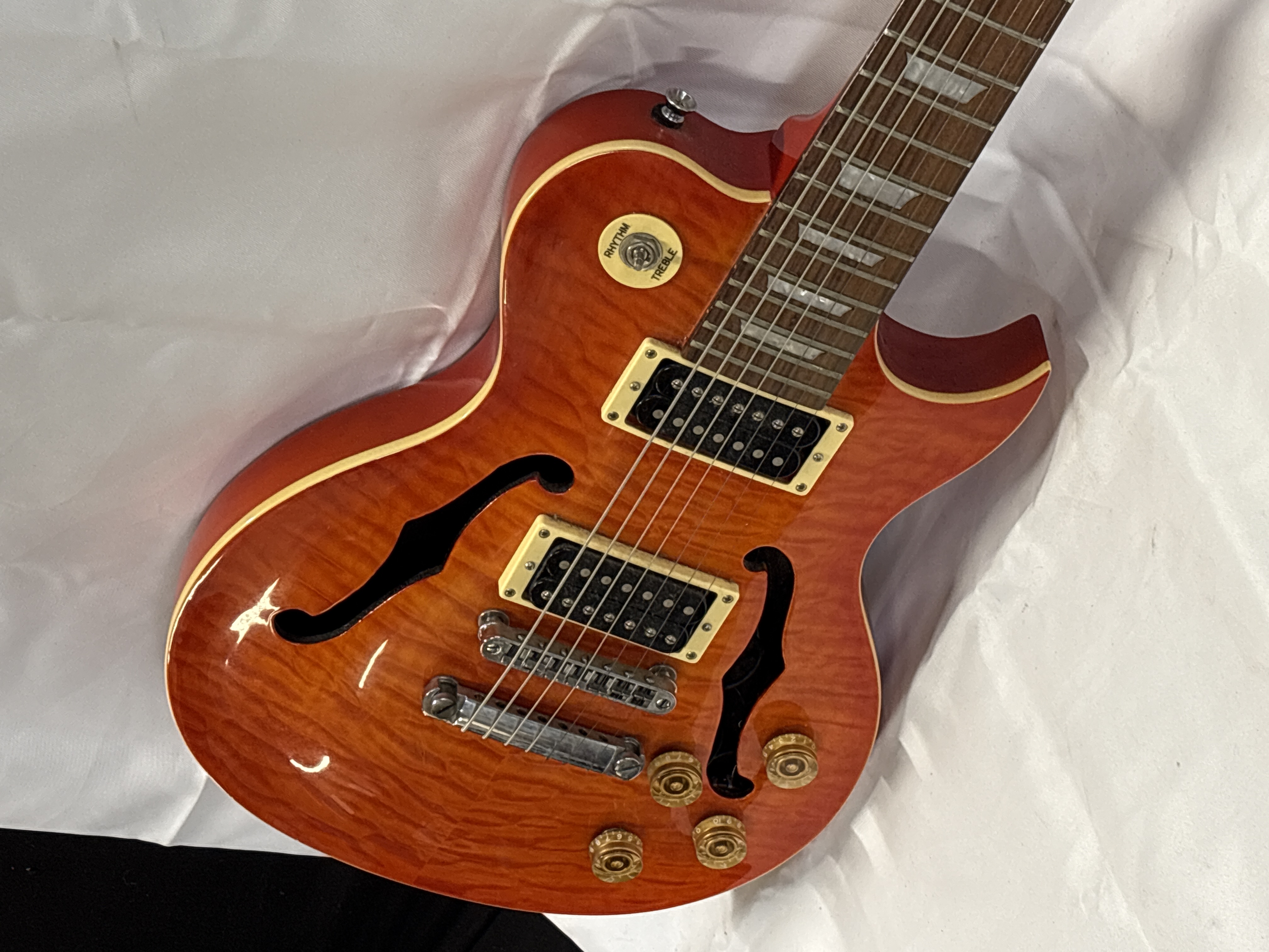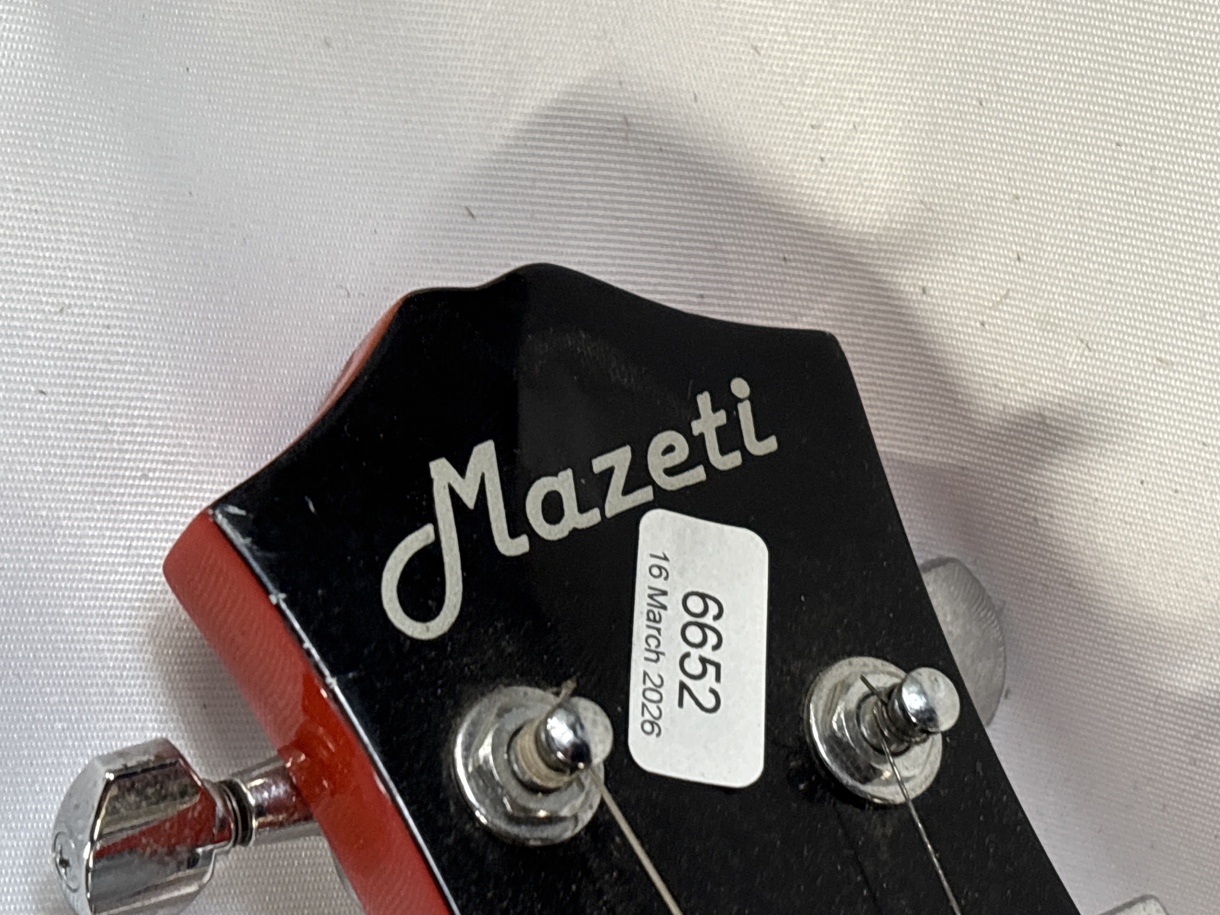 A seven-string semi-hollow body electric guitar by Mazeti. The instrument features a single-cutaway design with dual f-holes and a quilted maple-effect top finished in an orange-to-red sunburst with cream binding. The back and sides are finished in a solid red gloss. The set-neck construction has a matching red gloss finish and is topped with a dark wood fingerboard featuring seven trapezoid-style pearloid inlays. The electronics comprise two humbucker pickups with cream mounting rings, controlled by two volume and two tone knobs with gold-coloured top hat reflectors and a three-way toggle selector switch with a Rhythm/Treble indicator plate. Hardware includes a chrome-finished seven-string tune-o-matic bridge, a stop-bar tailpiece, and Gotoh tuners in a 4+3 configuration on the headstock. The headstock bears the Mazeti maker’s mark. Mazeti was a brand name associated with UK-based musical instrument retailers who imported instruments manufactured in Korea or China.