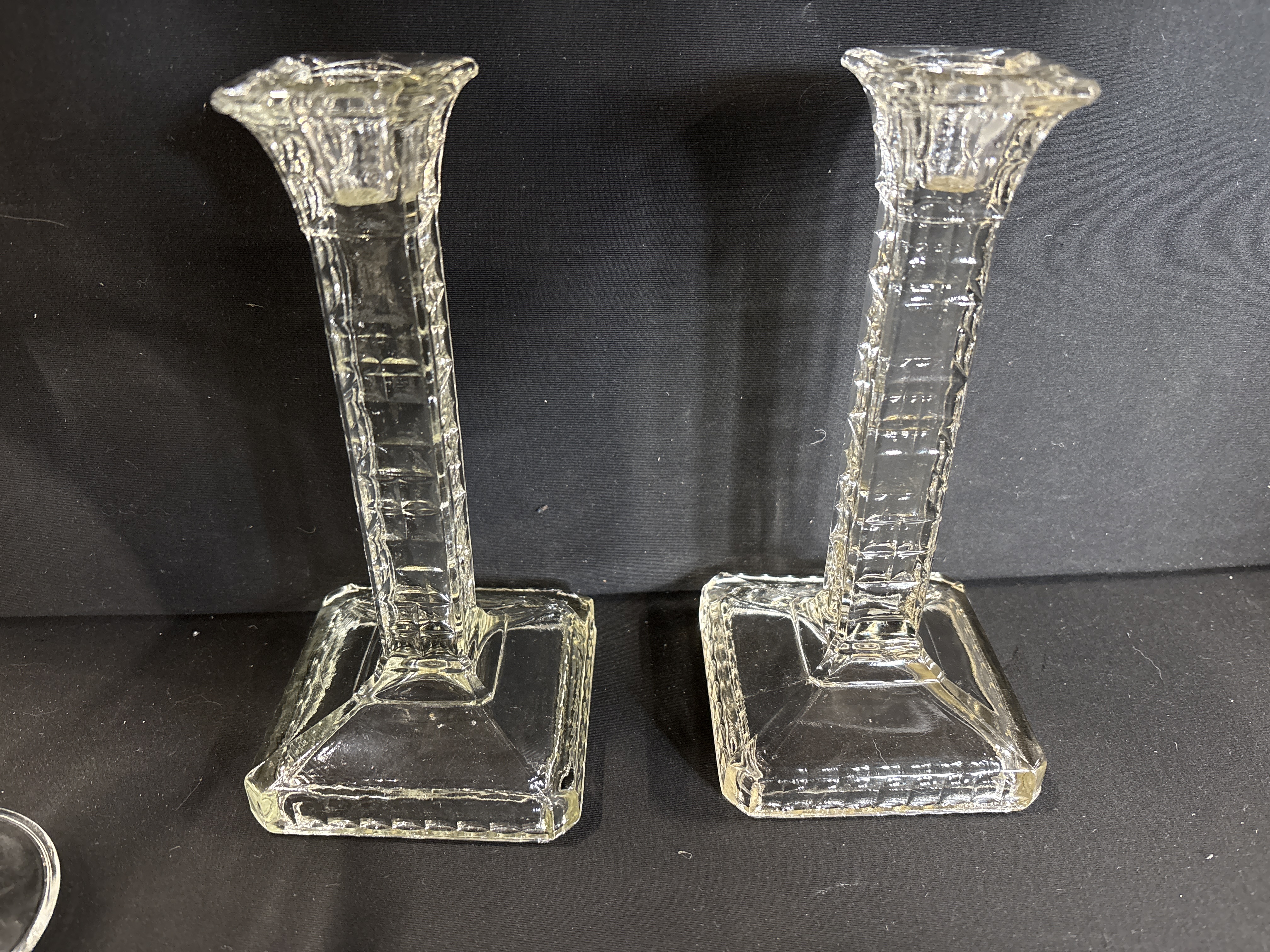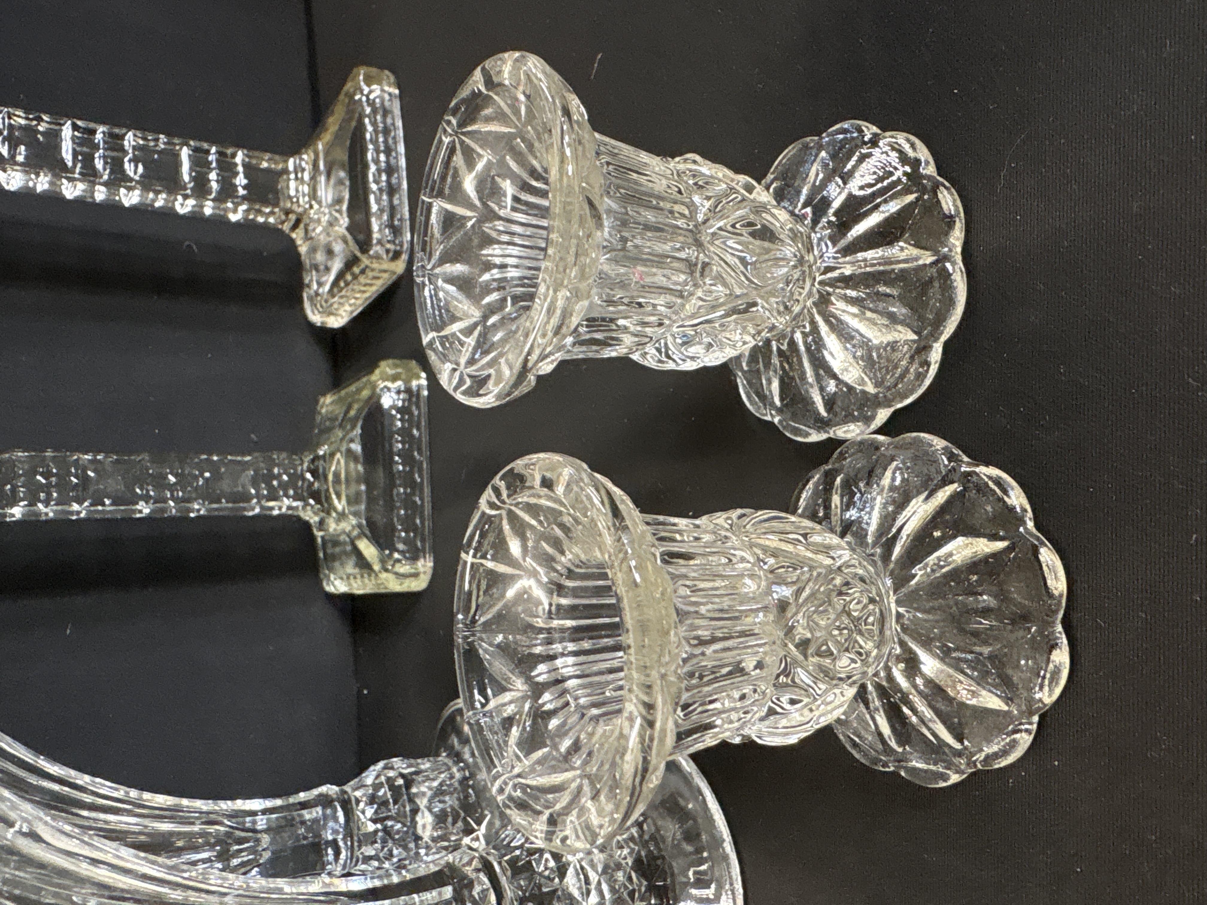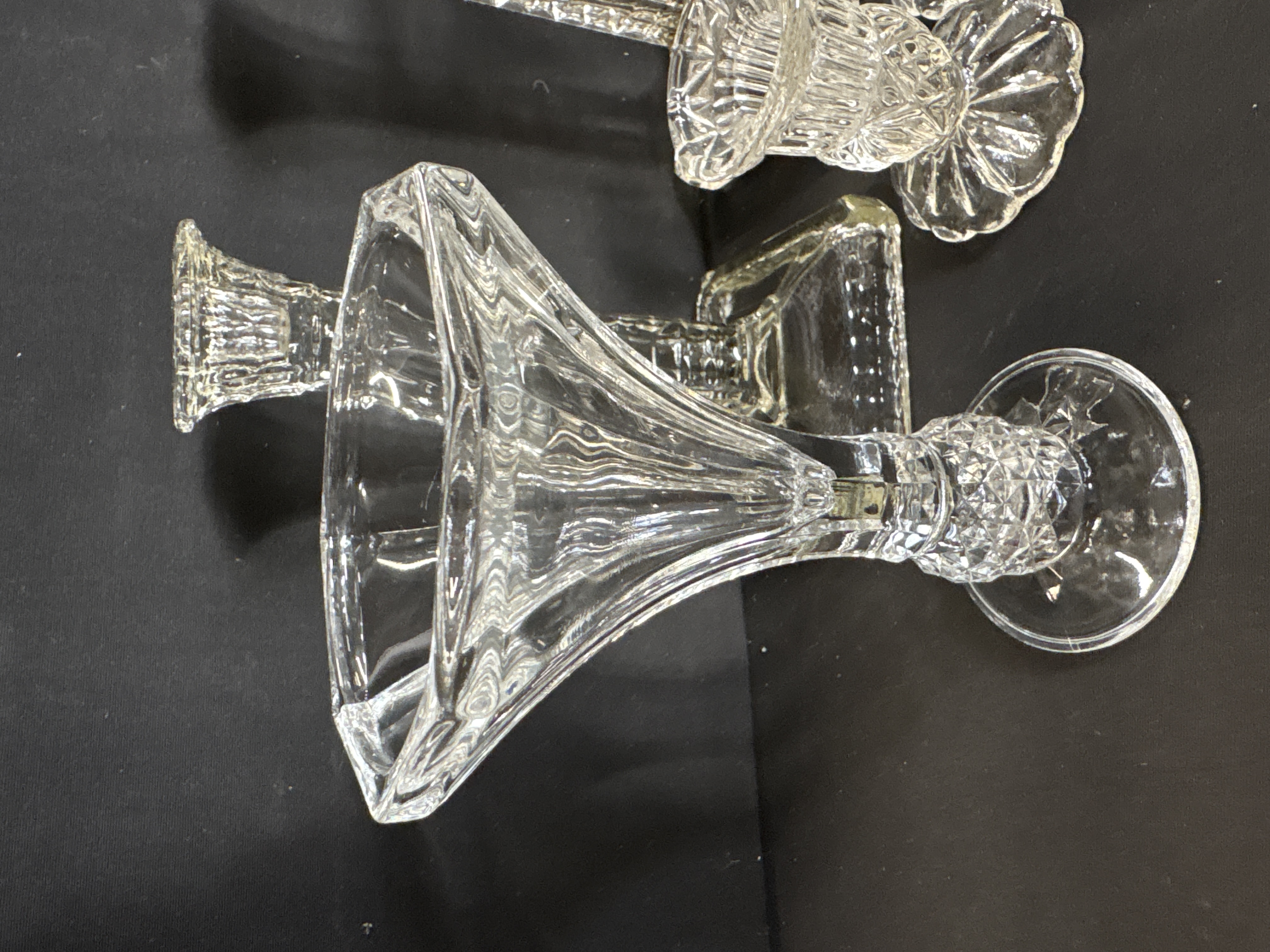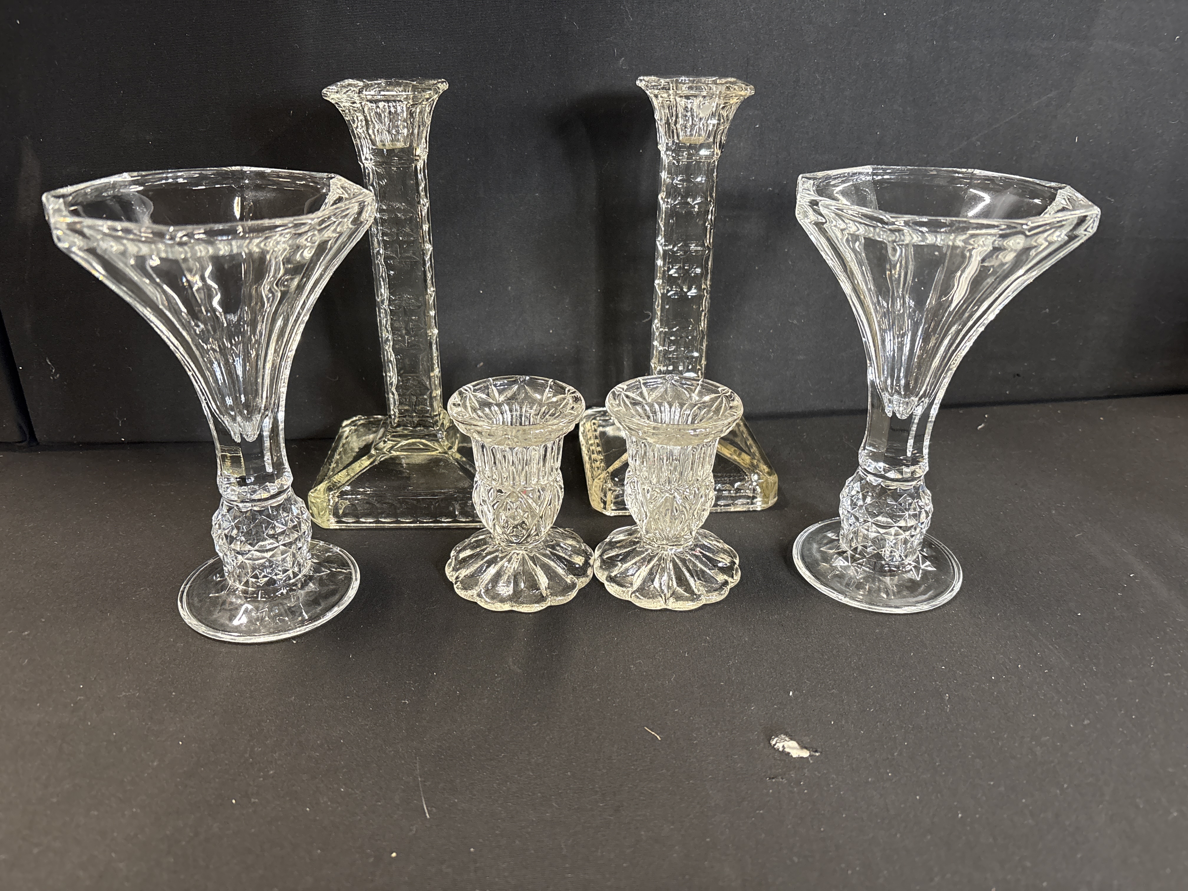 A collection of six cut glass items including a pair of trumpet vases and four candlesticks