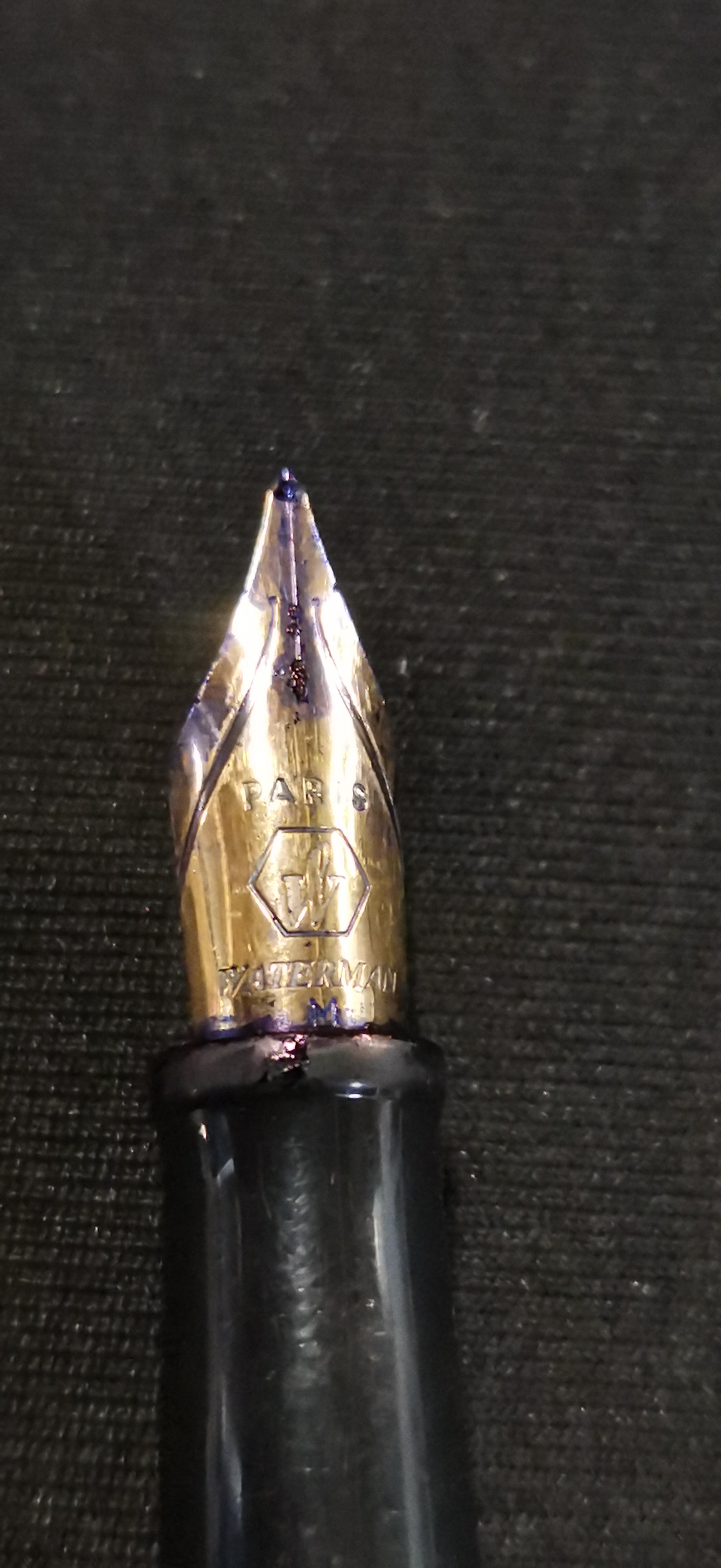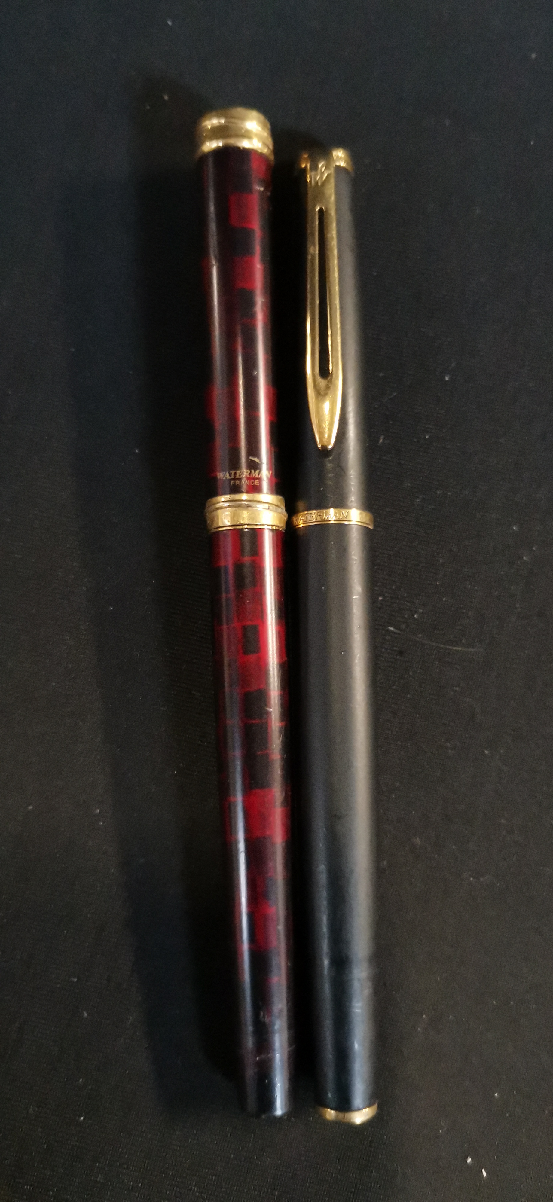 Two Waterman fountain pens, one featuring a red and black checkered finish and the other in matte black, both with gold-toned trim and nibs marked Waterman Paris.