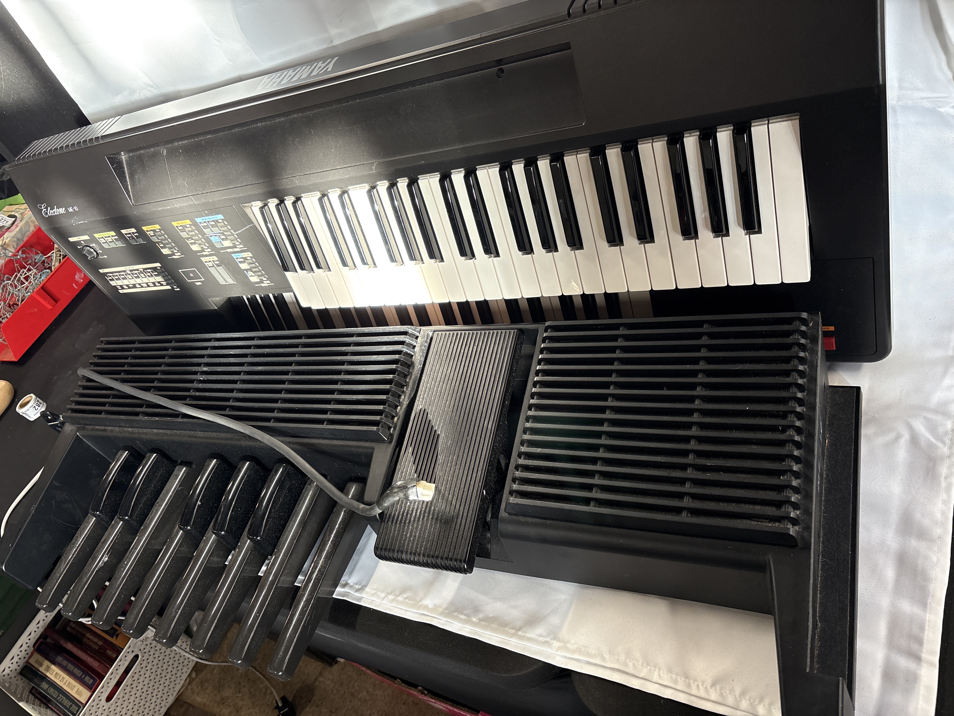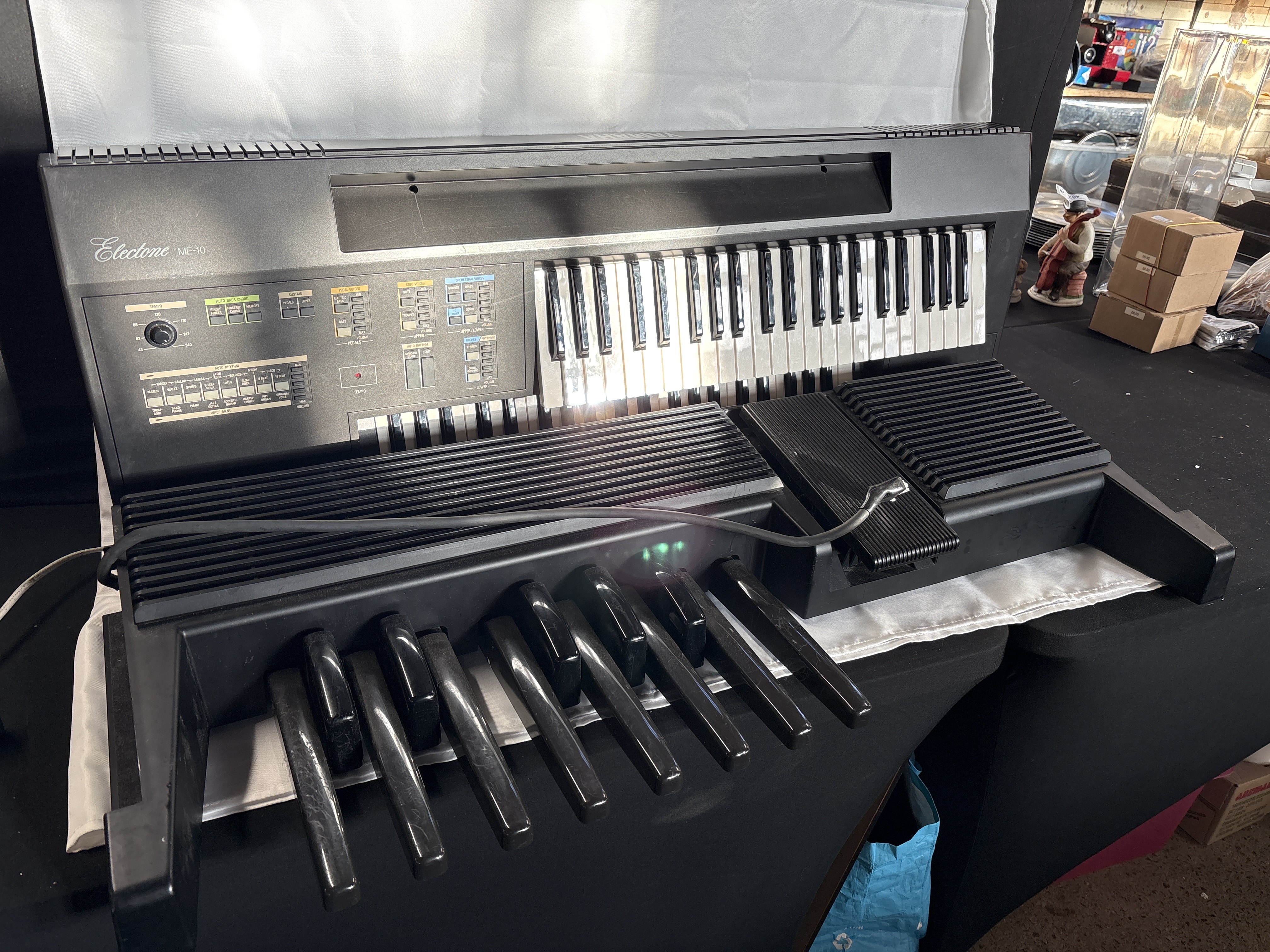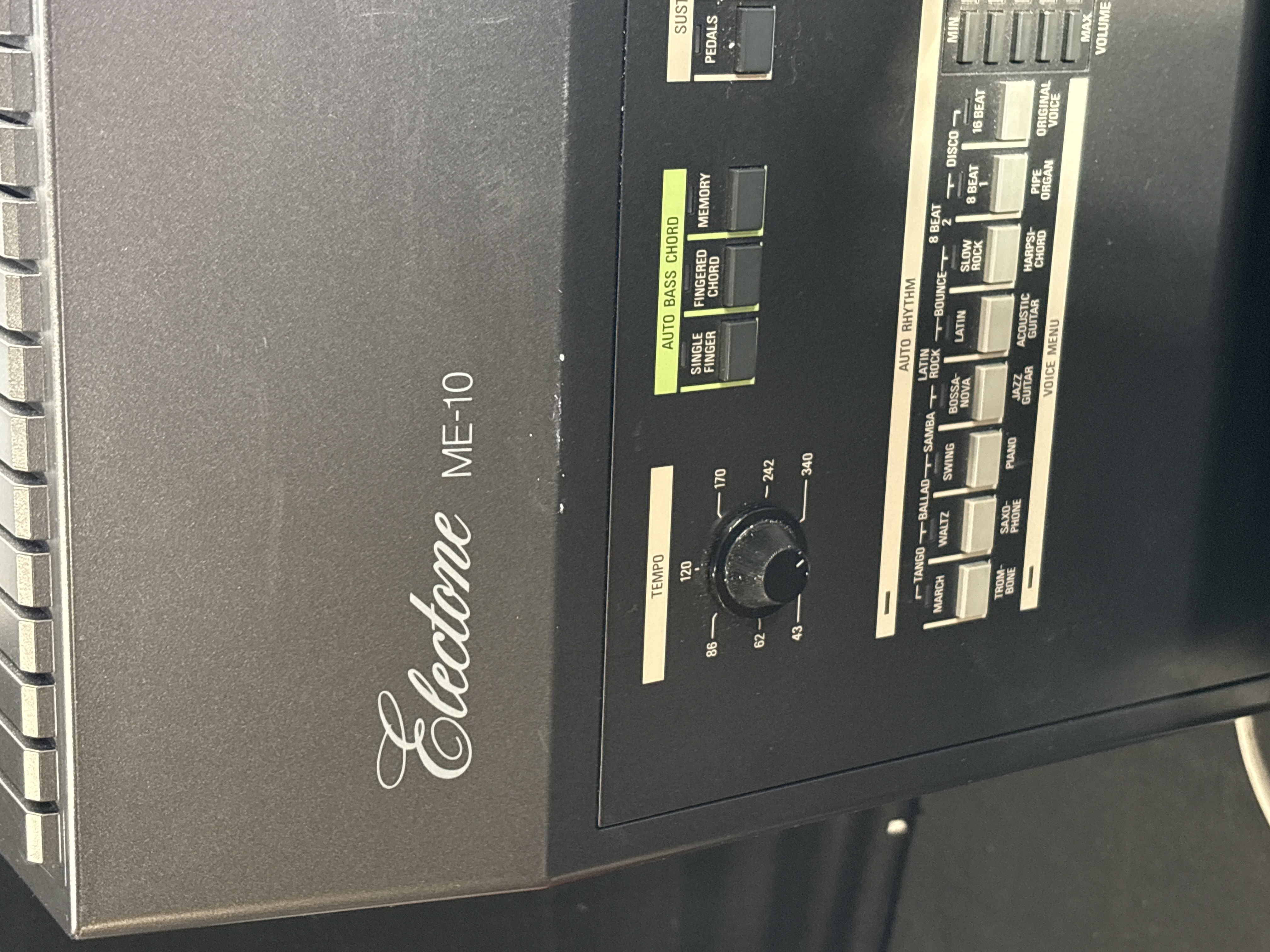 A Yamaha Electone ME-10 electronic organ. The instrument is constructed with a black synthetic casing and features a two-tier keyboard arrangement consisting of upper and lower manuals. The control interface includes a tempo adjustment dial and push-button selectors for various functions. These include an Auto Bass Chord section with single finger, fingered chord, and memory settings, alongside an Auto Rhythm section featuring styles such as Tango, Ballad, Samba, Jazz, Rock, and Disco. A Voice Menu provides instrumental presets including Trombone, Saxophone, Piano, Harpsichord, and Pipe Organ. The lot includes a detachable base unit comprising a single-octave pedalboard and an integrated expression pedal. Markings include Electone ME-10 in script to the front-left and YAMAHA in block capitals to the rear edge. A power cable and an interconnecting cable for the pedal unit are present.