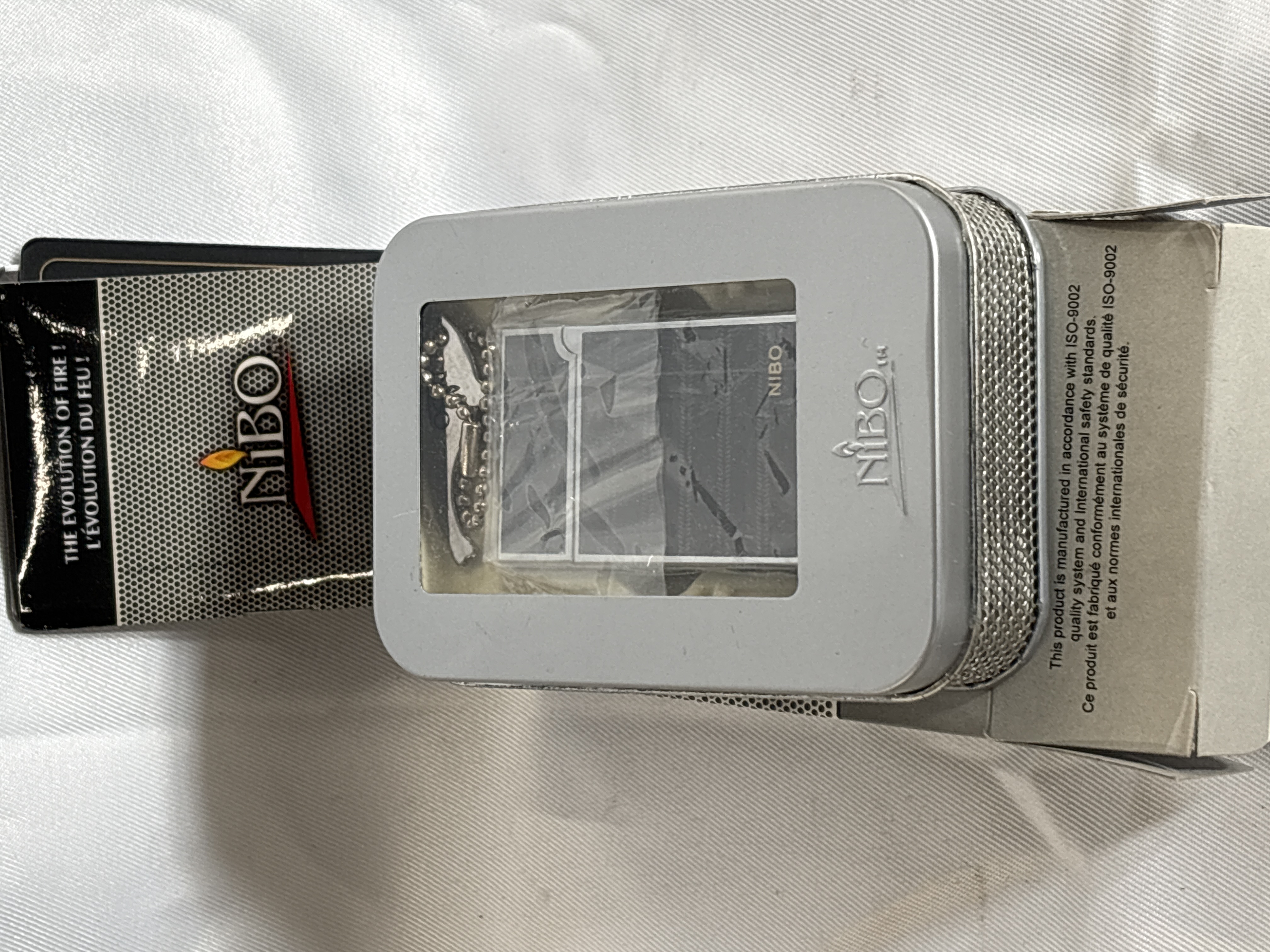 A brand new NIBO brand refillable and rechargeable single flame jet lighter, model 13701, presented in its original metal display tin and outer cardboard sleeve. The lighter features a rectangular gunmetal body with decorative black and grey textured panels, with the NIBO brand name visible on the front panel. The set includes a small metal tag on a ball chain which also bears the NiBO mark. The metal presentation tin features a viewing window and is embossed with the NiBO logo. The outer cardboard sleeve is printed with the brand name and the slogan The Evolution of Fire! / L’Évolution du Feu!. Text on the packaging identifies the item as a Stylish Lighter / Briquet élégant and states it is manufactured in accordance with ISO-9002 quality system and international safety standards.