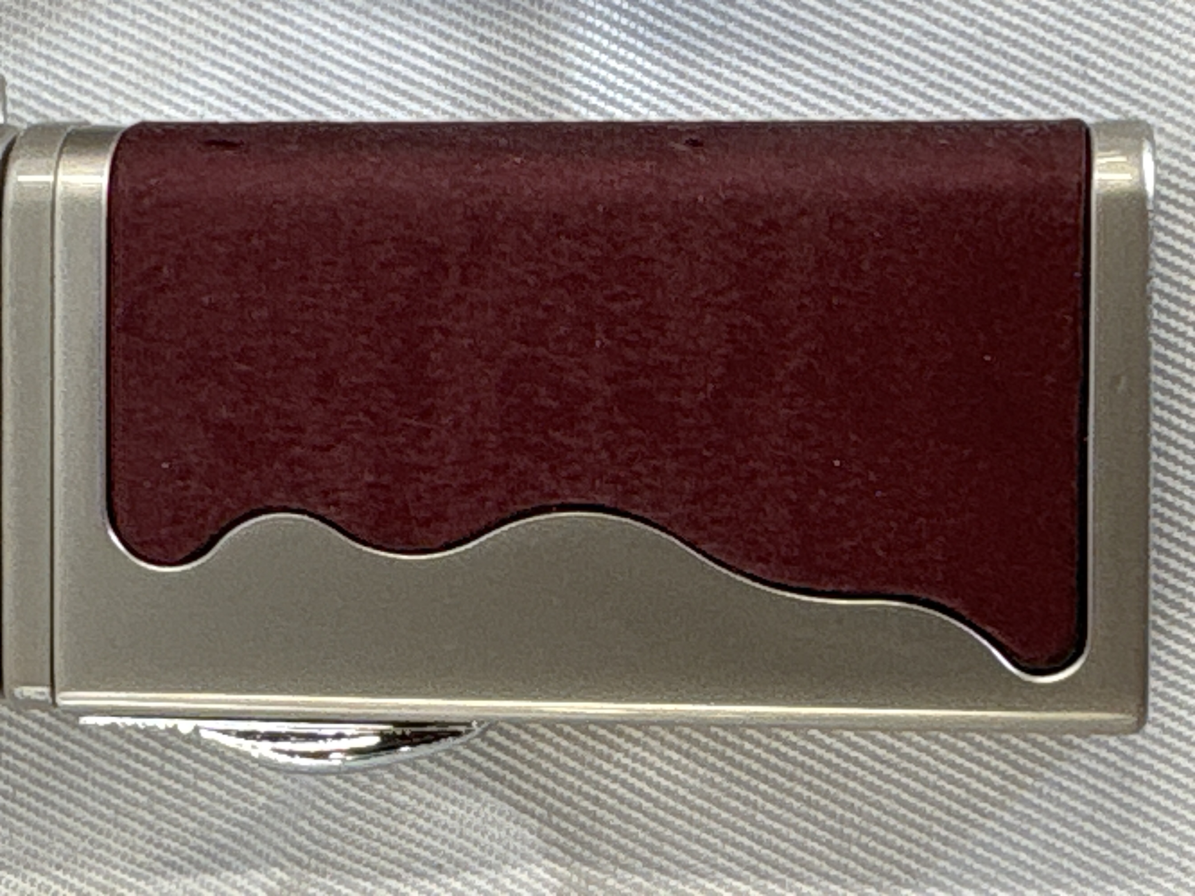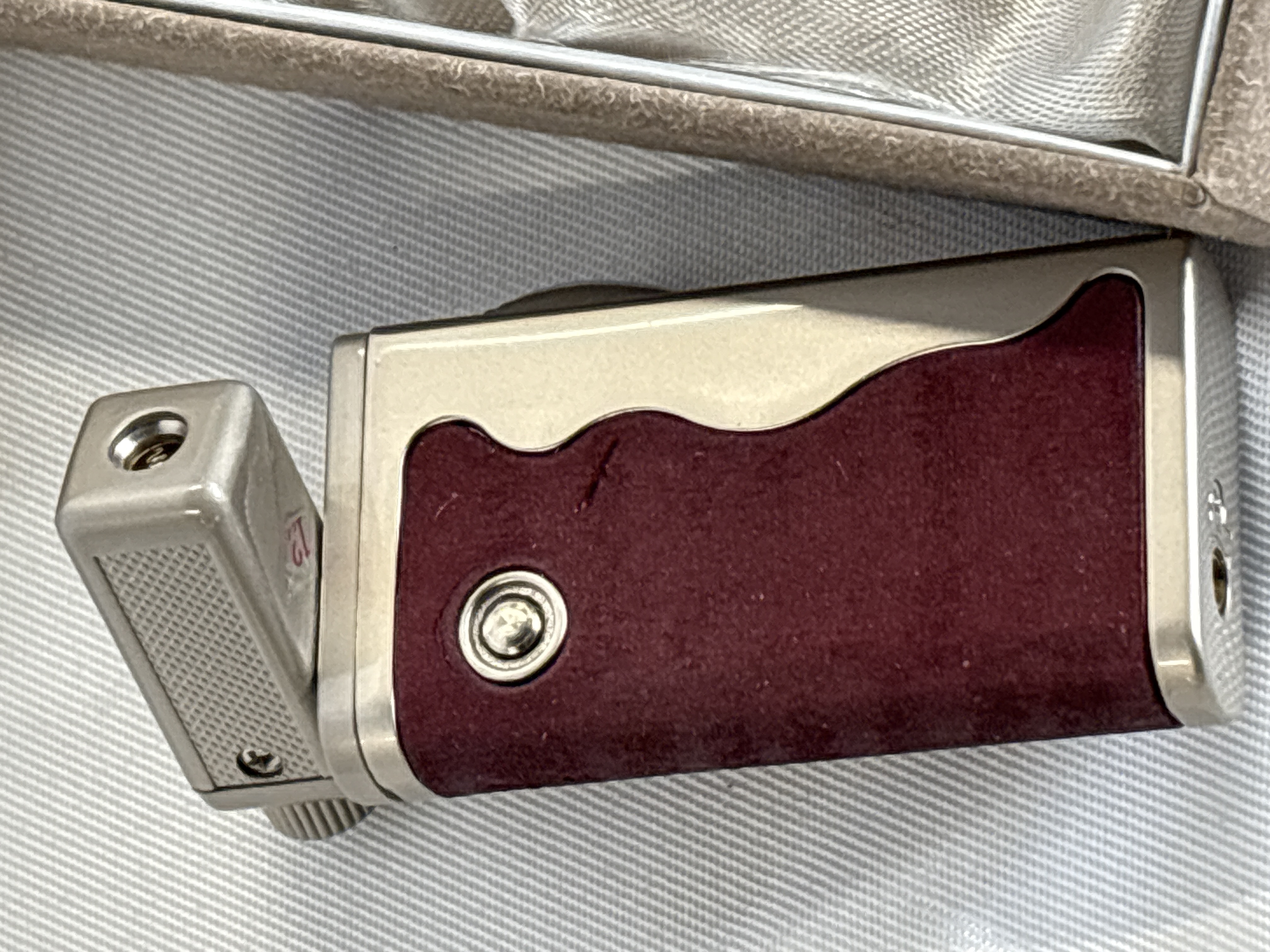 This brand new Rurojet lighter, bearing the Eurojet trademark on the original packaging, is a refillable butane pipe lighter. The unit features a satin-finished silver-tone metal body with burgundy suede-textured inlays on both sides, set within a wave-patterned metal frame. The design incorporates an angled burner head specifically for pipe lighting and includes an adjustable soft flame mechanism. The lighter is presented in its original cardboard retail box, which is lined with a champagne-coloured satin-like fabric.