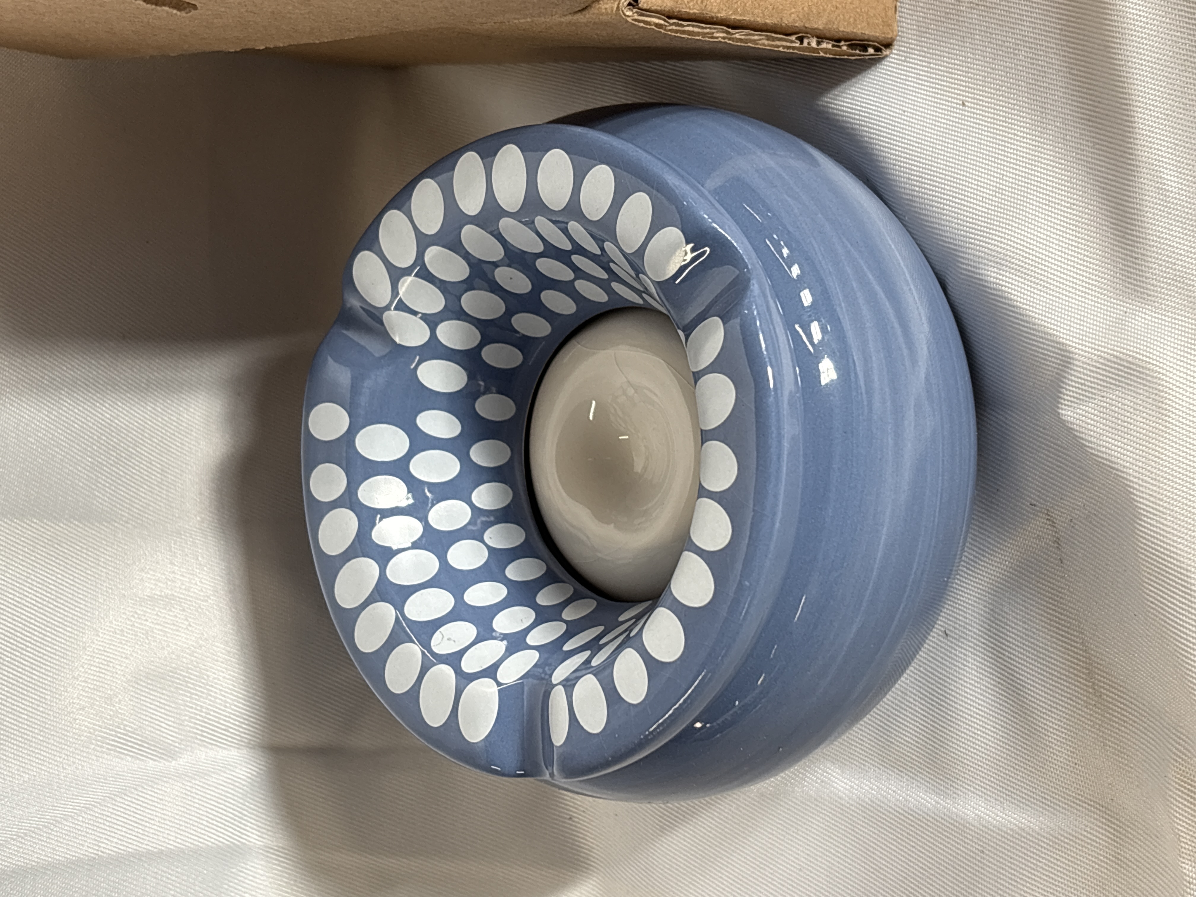 A trio of brand new ceramic ashtrays of contemporary manufacture. The visible example features a bulbous body finished in a periwinkle blue glaze with horizontal banding and a high-gloss finish. The recessed upper surface is decorated with a concentric pattern of hand-painted white oval spots and includes three notches on the rim. The items are accompanied by their original cardboard retail packaging, bearing price labels of £8.50 and inventory stickers. No maker’s marks or signatures are visible on the exterior of the ceramic body.